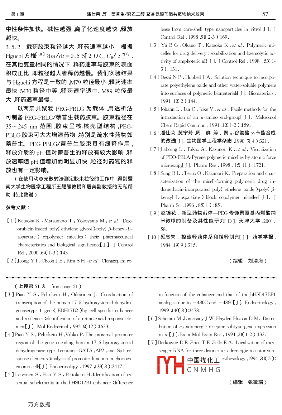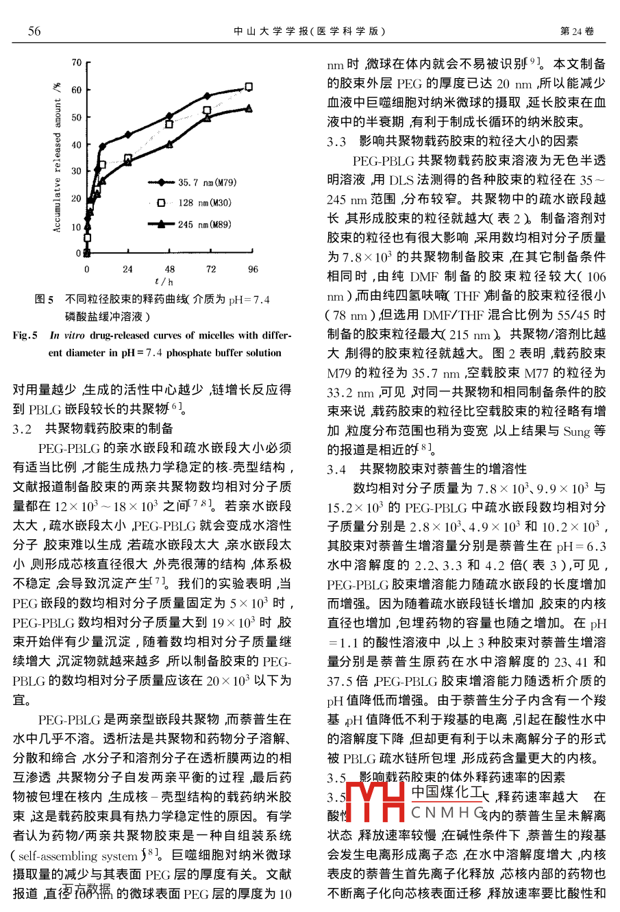 第24卷第1期中山大學(xué)學(xué)報(bào)(醫(yī)學(xué)科學(xué)版)Vol.24 No.12003年 1月JOURNAL SUN YAT SEN UNIVERSITY ( MEDICAL SCIENCES)Jan. 2003萘普生/聚乙二醇-聚谷氨酸芐酯共聚物納米膠束潘仕榮,馮敏(中山大學(xué)附屬第一醫(yī)院心血管研究室,廣東廣州510080)滴要:[目的]研究萘普生( naproxen )聚乙二醇聚谷氨酸芐酯共聚物( PEG- PBLG納米膠束的制備、形態(tài)和體外釋藥規(guī)律。[方法]合成了PEG- PBLG兩親嵌段共聚物;采用透析法制備了萘普生/PEG-PBLG載藥膠束通過(guò)透射電鏡觀察、動(dòng)態(tài)光散射測(cè)定、紫外吸光度測(cè)定等手段分析膠束的微觀形態(tài)、粒徑大小和載藥量、測(cè)定了載藥膠束的體外釋藥速率。[結(jié)果]萘普生/PEG PBLG載藥膠束粒徑在30~ 245 nm范圍膠束呈核殼型結(jié)構(gòu)PEG-PBLG膠束可大大增溶疏水性藥物萘普生/PEG- PBLG膠束具有緩釋作用萘普生的體外釋放速率大小主要由介質(zhì)的pH值決定,也受膠束粒徑的影響。[結(jié)論] PEG- PBLG載藥膠束是一種緩釋性 能良好、有應(yīng)用前景的納米膠束。關(guān)鍵詞:聚乙二醇聚谷氨酸芐酯共聚物;核殼型納米膠束;萘普生;體外釋藥中圖分類(lèi)號(hào):R944.9文獻(xiàn)標(biāo)識(shí)碼:A文章編號(hào): 1000 - 257X( 2003 )1- 0052 -06Naproxen/ Poly( Ethylene Glycol )Poly( Benzyl L -Glutamate ) BlockCopolymer Nano-MicellesPAN Shi-rong , FENG Min( Cardiovascular Rescerch Laboratory , The First Afiliated Hospital SUN Yat-sen University , Guangzhou 510080 , China )Abstract :[Objective ] To study the preparation of Naproxen/ poly( ethylene glycol )-poly( benzylL- glutamate ) copolymer micelles ,their morphology and drug release characteristics in vitro. [ Meth-ods] The poly( ethylene glycol )poly( benzyl glutamate ) amphipathic copolymers were synthesized ,Naproxen/ PEG PBLG copolymer micelles were prepared by dialysis method. Microscopic morphology,diameter and drug- loaded amount of the micelles were examined by means of TEM ,DLS and UV re-spectively , and their in vitro drug release rates were measured. [ Results] The diameters of micelles .were in the range of 35 ~ 245 nm , and the core-shell structure existed in the micelles , PEG- PBLGcopolymer micelles could solubilize hydrophobic drugs. In vitro Naproxen sustained release from mi-celles was observed. [ Conclusion] Drug/PEG-PBLG copolymer micelles display perfect drug -releaseperformance and can be potentially used as a new nano- pharmaceutical carrier.Key words : poly( ethelene glycol )-poly( benzyl glutamate ) copolymers ; core-shell type nano mi-celles ; drug-delivery system ; naproxen ; in vitro sustained drug- release[J SUN Yat-sen Uni( Med Sci),2003 24( 1):52-57 ]由親水嵌段與疏水嵌段組成的兩親型AB嵌這種新型的納米釋藥系統(tǒng)受到了國(guó)內(nèi)外學(xué)者們的段共聚物在水溶液能夠形成球狀膠束其疏水嵌重視1~3。聚乙二醇( PEG )是無(wú)毒和非致免疫的段構(gòu),成膠束的芯而親水嵌段構(gòu)成水合性外殼膠親水性聚合物具有良好的生物相容性,它常被用束直徑在納米級(jí)范圍。疏水嵌段組成的芯可以用作蛋白質(zhì)的修飾以減少抗原性或被用作藥物微球作微藥庫(kù),由于大多數(shù)藥物是疏水性的,它們可以表面中國(guó)煤化工收41。聚a氨基酸是通過(guò)化學(xué)鍵合或物理包埋方式結(jié)合到膠束的芯內(nèi),結(jié)Mh. CNMH G類(lèi)生物材料主鏈上眾收稿日期2002-05 - 08基金項(xiàng)目廣東省科委科研攻關(guān)基金資助項(xiàng)目( 9622020 -01 )作者簡(jiǎn)喬瘤徑楚1944- )男廣東廣州人研究員博士生導(dǎo)師;馮敏(1974- )女現(xiàn)為新加坡南洋理工大學(xué)博士后.第1期潘仕榮等.萘普生/聚乙二醇_聚谷氨酸芐酯共聚物納米膠束多的肽鍵在體內(nèi)蛋白酶作用下極容易斷裂降解生( BI200SM美國(guó)布魯克海文公司)測(cè)定膠束的粒成無(wú)毒的小分子具有良好的生物相容性和生物降徑7。標(biāo)準(zhǔn)曲線(xiàn)的測(cè)定萘普生樣品適量用DMF解性。聚谷氨酸芐酯PBLG )是其中一種在緩釋制溶解制成質(zhì)量濃度為0.040mg/mL的溶液。用劑中使用較多的疏水性氨基酸均聚物。萘普生化Hitatch-2000U型雙光束分光光度計(jì)在240 ~ 400學(xué)名為d-2( 6-甲氧基-2'-萘基)丙酸[ d-2( 6-nm之間掃描331 nm吸收峰靈敏度高,干擾小選methoxy-2'-naphthyl ) propioric acid] ,是芳香丙酸331 nm為檢測(cè)波長(zhǎng)。精密稱(chēng)取萘普生40 mg ,用類(lèi)非甾體消炎鎮(zhèn)痛藥。為改善病人服藥的順應(yīng)性DMF溶解并稀釋到100 mL為貯備液。用移液管和安全性國(guó)內(nèi)外先后開(kāi)發(fā)了萘普生控釋片、液體移取0.5 1.0 2.04.08.0 ,10.0 mL貯備液置于緩釋制劑和腸溶制劑但尚未見(jiàn)有萘普生納米膠束25 mL容量瓶中,用DMF定容至刻度。使用75-2的報(bào)道。納米膠束研究選擇萘普生作模型藥物對(duì)紫外分光光度計(jì)(UV)在331nm處測(cè)定各溶液的其他藥物亦有參考意義。本文合成了聚乙二醇_聚吸光度擬合標(biāo)準(zhǔn)曲線(xiàn)公式為d naproxen )( g/L)谷氨酸芐酯(PEG-PBLG)兩親嵌段共聚物,由此制=0.1402 A -0.000 96( n=6,r=0.999 8%膠備了萘普生( naproxen )共聚物載藥膠束,并研究束的載藥量測(cè)定:定量的載藥膠束干品置入透析了該載藥膠束的微觀形態(tài)和體外釋藥規(guī)律。袋密封袋外加入定量DMF.37C振蕩3H(振蕩器同1.5)用75-2C紫外分光光度計(jì)測(cè)定DMF液1材料與方法在331 nm處吸光度,由上述標(biāo)準(zhǔn)曲線(xiàn)計(jì)算載藥量。1.5萘普生的增溶性試驗(yàn)1.1主要試劑定義投藥