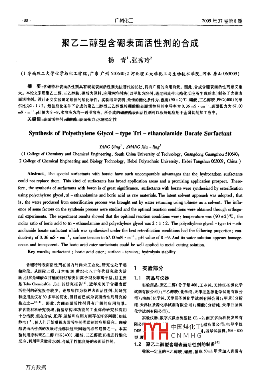 ●88.廣州化工2009年37卷第8期聚乙二醇型含硼表面活性劑的合成楊青',張秀玲”(1華南理工大學(xué)化學(xué)與化工學(xué)院,廣東廣州510640;2河北理工大學(xué)化工與生物技術(shù)學(xué)院,河北唐山063009)摘要:含硼特種 表面活性劑具有碳氨表面活性劑無法替代的長處,具有廣闊的應(yīng)用前景。因此, 合成含硼表面活性劑意義重大。本論文采用聚乙二醇、三乙醇胺、硼酸為原料,應(yīng)用潛溶劑法(以甲苯為溶劑,通過回流帶出酯化反應(yīng)所生成的水)制備了含硼表面活性劑。設(shè)計正交實驗確定最佳的酯化條件。實驗結(jié)果表明,最佳的酯化條件為:溫度(90 *2)C ,硼酸、三乙醉胺、PEG(400)的摩爾比為2:1:2。最佳酯化條件下合成的聚乙二醇型三乙醇酰胺硼酸酯表面活性劑的電導(dǎo)率為0.36 mS . cm-' ,表面張力為67. 00mN . m"' ,pH值為8~9,水溶液為均- -透明溶液。所合成的棚酸酯表面活性劑可以很好地應(yīng)用于金屬切削加工液中。關(guān)鍵詞:表面活性劑;硼酸酯;表面張力;冰解穩(wěn)定性Synthesis of Polyethylene Glycol - type Tri - ethanolamide Borate SurfactantYANG Qing' , ZHANG Xiu - ling2(1 Cllege of Chemisty and Chemical Engineering, South China University of Technology , Guangdong Guanghou 510640;2 College of Chemical Engineering and Biology Technology , Hebei Polytechnic University, Hebei Tangshan 063009, China )Abstract: The special surfactants with borate have such uncomparable advantages that the hydrocarbon surfactantscould not replace them. This kind of surfactants has broad appliation areas and a pronising application prospect. There-fore , the synthesis of surfactants with boron is of great significance. surfactants with borate were synthesized by esterificationusing polyethylene glycol , tni - ethanolamine and boric acid as raw materials. The latent solvent approach was adopted, thatis, the waler produced from esterification process was brought out by water retuming using toluene as a solvent. The influ-ence of some factors on the synthesis process were studied and the optimal reaction conditions were obtained through orthogo-nal experiments. The experiment results showed that the opitimal reaction conditions were: temperature was (90 +2)9C, themolar ratio of boric acid to tni - ethanolamine and polyethylene glycol was2:1 :2. The polyethylene glycol - type ti - eth-anolamide borate surfactant which was synthesized under the best esterification conditions had the following properties: con-ductivity of 0.36 mS●cm -1 , surface tension to 67.00mN●m : ' , pH value of 8 ~9. And its water solution appears homoge-neous and transparent. The boric acid ester surfactants could be well applied to metal cutting solution.Key words: surfactant ; boric acid ester; surface - tension; hydrolysis stability含硼特種表面活性劑在國內(nèi)外尚未工業(yè)化,研究也處于起1實驗部分始階段。從國際上看,日本在20世紀(jì)七八十年代研究較為活躍,但多是硼酸雙甘酯的脂肪酸類陰離子型及非離子型,且主要1.1藥品與儀器是Toho ChemicalCo. ,Lud. 的研究報告,近年來關(guān)于含硼表面實驗藥品:聚乙二醇(分子量400,工業(yè)純,天津巨圣源化學(xué)活性劑的研究報告較少。硼酸酯作為特種表面活性劑,其研究試劑有限公司);三乙醇胺(化學(xué)純,天津巨圣源化學(xué)試劑有限公和應(yīng)用雖僅有30多年的歷史,但目前已成為表面活性劑研究的司);油酸(化學(xué)純,天津巨圣源化學(xué)試劑有限公司);甲苯(分析熱點(diǎn)之-一1一4。因此,含硼表面活性劑具有廣闊的應(yīng)用前景。純,天津巨圣源化學(xué)試劑有限公司);硼酸(分析純,天津巨圣源在含能材料研究領(lǐng)域,新型結(jié)構(gòu)和功能的工業(yè)炸藥研究和應(yīng)用化學(xué)試劑有限公司)。十分活躍,但在合成、貯存運(yùn)輸和應(yīng)用方面存在許多問題(如抗實驗儀器:數(shù)字式微差測壓儀CL -2:南京多助科技發(fā)展有靜電)(51 ,使人們開始重視表面活性劑類助劑的應(yīng)用研究。硼酸中國煤化工器有限公司;電導(dǎo)率儀酯表面活性劑的發(fā)展將是解決這些問題的必然趨勢之一。本實DDS司:四球試驗機(jī),MS - 800驗利用原料聚乙二醇PEC(400)硼酸.三乙醇胺直接進(jìn)行酯化型,廈MYHCNMHG反應(yīng),利用甲苯做帶水劑,合成了性能良好的表面活性劑。1.2聚乙二醇型含硼表 面活性劑的制備f0]稱取一定量的三乙醇胺、硼酸,量取50mL. 甲苯加人到帶有2009年37卷第8期廠州化工●89.磁力攪拌器、分水器和回流冷凝管的三口燒瓶中??販?90土2)C下回流反應(yīng)1h,量取一-定 量聚乙二醇(400)加入三口燒瓶sox中,控溫(90 +2)C下回流反應(yīng)1h。在88 kPa下減壓蒸餾40min除去剩余的甲苯、少量的水及過量的三乙醇胺,停止加熱,趁熱倒出三口燒瓶中的產(chǎn)物。1.3 正交實驗聚乙二醇型三乙醇酰胺硼酸酯酯化條件的選擇:采用正交實驗對各原料的用量.反應(yīng)溫度進(jìn)行研究,以求獲得穩(wěn)定性較好的硼酸酯。正交實驗的因素、水平安排見表1。8590951000市表1 正交實驗因素設(shè)計表團(tuán)1溫度對橐硼酸酯的水解穩(wěn)定性影響因素水平CRH進(jìn)攻RO三乙醇肢用量/g_硼酸用量/g_ PC(400)用量/g_ 反應(yīng)溫度心>ROH+HDH11370/>PH>H-102090早酉結(jié)構(gòu)四面體結(jié)構(gòu)1527110圈2硼酸酯的水解機(jī)理1.4性能測定表面張力:將合成的硼酸酯配成5%的水溶液,用ZP -WB產(chǎn)物I繼續(xù)與水作用,最后生成相應(yīng)的醇和硼酸。本實驗微差測壓儀基于最大泡壓法測定各硼酸酯水溶液的表面張力。考察了三乙醇胺的加