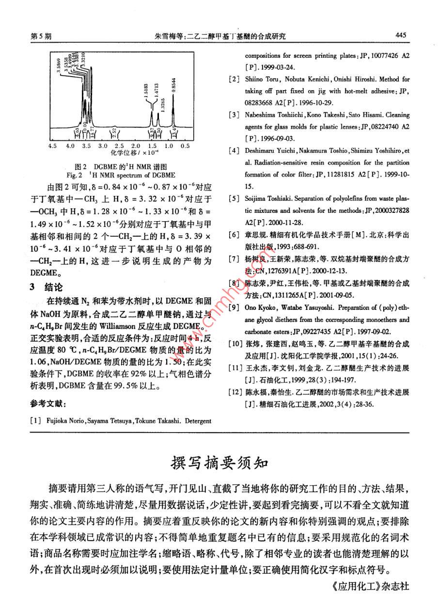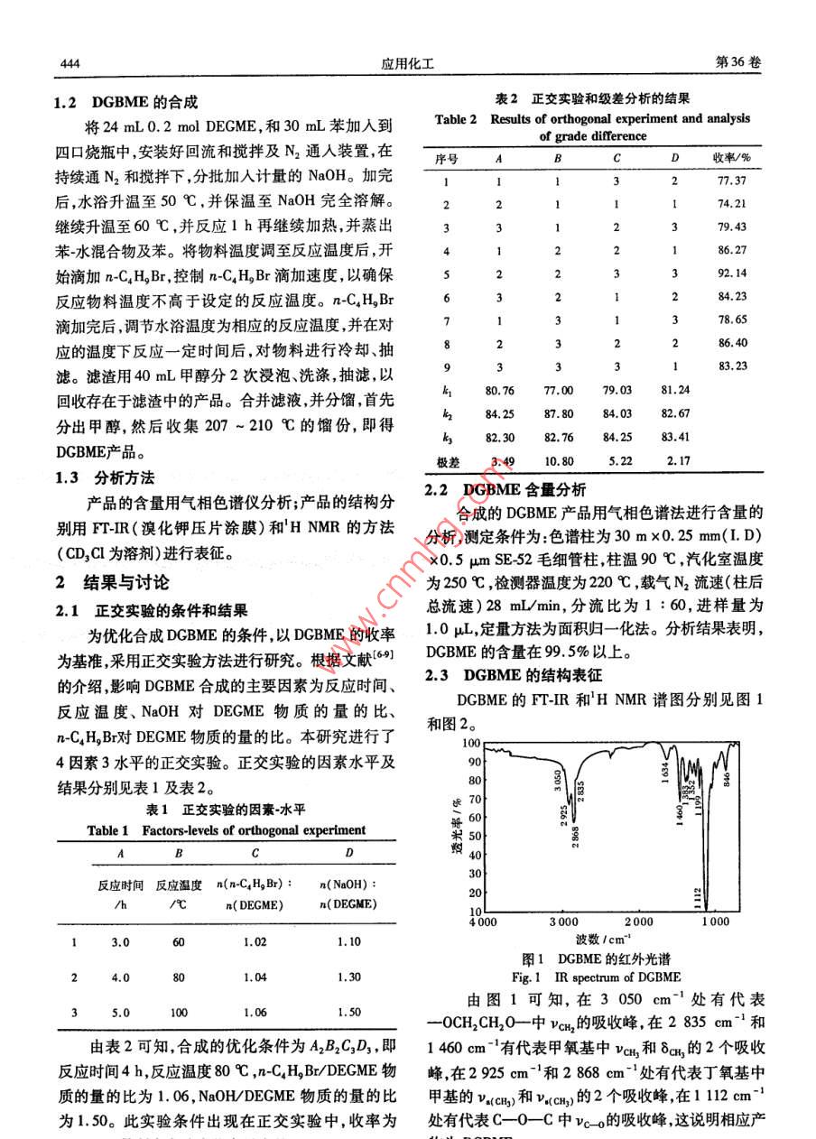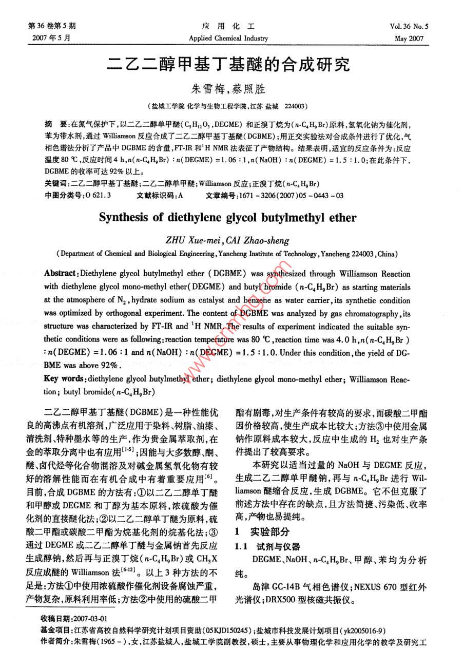 第36卷第5期應(yīng)用化工2007年5月Applied Chemical IndustryMay 2007二乙二醇甲基丁基醚的合成研究朱雪梅,蔡照勝(鹽城工學(xué)院化學(xué)與生物工程學(xué)院,江蘇鹽城224003)摘要:在氮?dú)獗Wo(hù)下,以二乙二醇單甲醚(C3H12O3, DEGME)和正溴丁烷為(nC4H2Br)原料,氫氧化鈉為催化劑,苯為帶水劑,通過 williamson反應(yīng)合成了二乙二醇甲基丁基醚( DGBME);用正交實(shí)驗(yàn)法對(duì)合成條件進(jìn)行了優(yōu)化,氣相色譜法分析了產(chǎn)品中 DGBME的含量,FTIR和HNMR法表征了產(chǎn)物結(jié)構(gòu)。結(jié)果表明,適宜的反應(yīng)條件為:反應(yīng)溫度80℃,反應(yīng)時(shí)間4h,n(nC4HBr):n( DEGME)=1.06:1,n(NaOH):n( DEGME)=1.5:1.0;在此條件下,DGBME的收率可達(dá)92%以上。關(guān)鍵詞:二乙二醇甲基丁基醚;二乙二醇單甲醚; Williamson反應(yīng);正溴丁烷(nC4H4B中圖分類號(hào):0621.3文獻(xiàn)標(biāo)識(shí)碼:A文章編號(hào):1671-3206(2007)05-0443-03Synthesis of diethylene glycol butylmethyl etherZHU Xue-mei, CAI Zhao-shengDepartment of Chemical and Biological Engineering, Yancheng Institute of Technology, Yancheng 224003, China)Abstract: Diethylene glycol butylmethyl ether( DGBME)was synthesized through Williamson Reactionwith diethylene glycol mono-methyl ether( DEGME)and butyl bromide(n-CAHO Br)as starting materialsat the atmosphere of n2, hydrate sodium as catalyst and benzene as water carrier, its synthetic conditionwas optimized by orthogonal experiment. The content of DGBME was analyzed by gas chromatography, itsstructure was characterized by FT-IR and H NMR. The results of experiment indicated the suitable syn-thetic conditions were as following: reaction temperature was 80C, reaction time was 4.0 h, n(n-C, H, Br):n(DEGME)=1. 06: 1 and n( NaOH): n( DEGME)=1.5: 1.0. Under this condition, the yield of DG-BME was above 92%Key words: diethylene glycol butylmethyl ether; diethylene glycol mono-methyl ether; Williamson Reac-tion; butyl bromide(n-C, H, Br)二乙二醇甲基丁基醚( DGBME)是一種性能優(yōu)酯有劇毒,對(duì)生產(chǎn)條件有較高的要求而碳酸二甲酯良的高沸點(diǎn)有機(jī)溶劑廣泛應(yīng)用于染料、樹脂油漆、因價(jià)格較高使生產(chǎn)成本比較大;方法③中使用金屬清洗劑、特種墨水等的生產(chǎn),作為貴金屬萃取劑,在鈉作原料成本較大,反應(yīng)中生成的H2也對(duì)生產(chǎn)條金的萃取分離中也有應(yīng)用13;因能與大多數(shù)醇酮、件提出了較高要求醚、鹵代烴等化合物混溶及對(duì)堿金屬氫氧化物有較本研究以適當(dāng)過量的NaOH與 DEGME反應(yīng)好的溶解性能而在有機(jī)合成中有著重要應(yīng)用。生成二乙二醇單甲醚鈉,再與 n-C4 Hg Br進(jìn)行Wil目前,合成 DGBME的方法有:①以二乙二醇單丁醚 lamson醚縮合反應(yīng)生成 DGBME。它不但克服了和甲醇或 DEGME和丁醇為基本原料濃硫酸為催前述方法中存在的缺點(diǎn)且方法簡(jiǎn)捷、污染低、收率化劑的直接醚化法;②以二乙二醇單丁醚為原料,硫高,產(chǎn)物也易提純。酸二甲酯或碳酸二甲酯為烷基化劑的烷基化法;③1實(shí)驗(yàn)部分通過 DEGME或二乙二醇單丁醚與金屬鈉首先反應(yīng)1.1試劑與儀器生成醇鈉,然后再與正溴丁烷(n-C4HBr)或CH3XDEGME、NaOH、nC4HBr、甲醇、苯均為分析反應(yīng)成醚的 williamson法612。以上3種方法的不純。足是:方法①中使用濃硫酸作催化劑設(shè)備腐蝕嚴(yán)重島津GC14B氣相色譜儀; NEXUS670型紅外產(chǎn)物復(fù)雜,原料利用率低;方法②中使用的硫酸二甲光譜儀;DRX500型核磁共振儀。收稿日期:20070301基金項(xiàng)目:江蘇省高校自然科學(xué)研究計(jì)劃項(xiàng)目資助(05KJD150245);鹽城市科技發(fā)展計(jì)劃項(xiàng)目(yk20050169)作者簡(jiǎn)介:朱雪梅(1965-),女,江蘇鹽城人,鹽城工學(xué)院副教授,碩士,主要從事物理化學(xué)和應(yīng)用化學(xué)的教學(xué)及研究工444應(yīng)用化工第36卷1.2 DGBME的合成表2正交實(shí)驗(yàn)和級(jí)差分析的結(jié)果將24mL0.2 mol DEGME,和30m苯加入到Tb2 Results of orthogonal experiment and analy四口燒瓶中,安裝好回流和攪拌及N2通入裝置,在序號(hào)C收率/%持續(xù)通N2和攪拌下,分批加入計(jì)量的NaOH。加完77.37后,水浴升溫至50℃,并保溫至NaOH完全溶解。繼續(xù)升溫至60℃,并反應(yīng)1h再繼續(xù)加熱,并蒸出苯水混合物及苯。將物料溫度調(diào)至反應(yīng)溫度后,開122始滴加nC4HBr,控制 n-C, HoBr滴加速度,以確保592.14反應(yīng)物料溫度不高于設(shè)定的反應(yīng)溫度。 n-C4H, Br31231滴加完后,調(diào)節(jié)水浴溫度為相應(yīng)的反應(yīng)溫度,并在對(duì)應(yīng)的溫度下反應(yīng)一定時(shí)間后,對(duì)物料進(jìn)行冷卻、抽286.40濾。濾渣用40mL甲醇分2次浸泡洗滌,抽濾,以回收存在于濾渣中的產(chǎn)品。合并濾液,并分餾,首先k180.7677.0079.0381.24分出甲醇,然后收集207~210℃的餾份,即得k284.25878084.0382.67k82.30827684.2583.41DGBME產(chǎn)品。極差3.4913分析方法產(chǎn)品的含量用氣相色譜儀分析;產(chǎn)品的結(jié)構(gòu)分22 DGBME含量分析合成的 DGBME產(chǎn)品用氣相色譜法進(jìn)行含量的別用FR(溴化鉀壓片涂膜)和HN的方法分析,測(cè)定條件為色譜柱為30m×0.25m(LD)(CD3CI為溶劑)進(jìn)行表征。0.5pmSE52毛細(xì)管柱,柱溫90℃,汽化室溫度2結(jié)果與討論為250℃,檢測(cè)器溫度為220℃,載氣N2流速(柱后2.1正交實(shí)驗(yàn)的條件和結(jié)果總流速)28mL/min,分流比為1:60,進(jìn)樣量為為優(yōu)化合成 DGBME的條件,以 DGBME