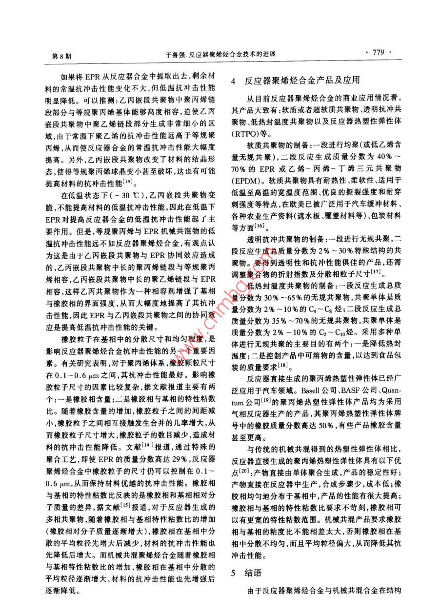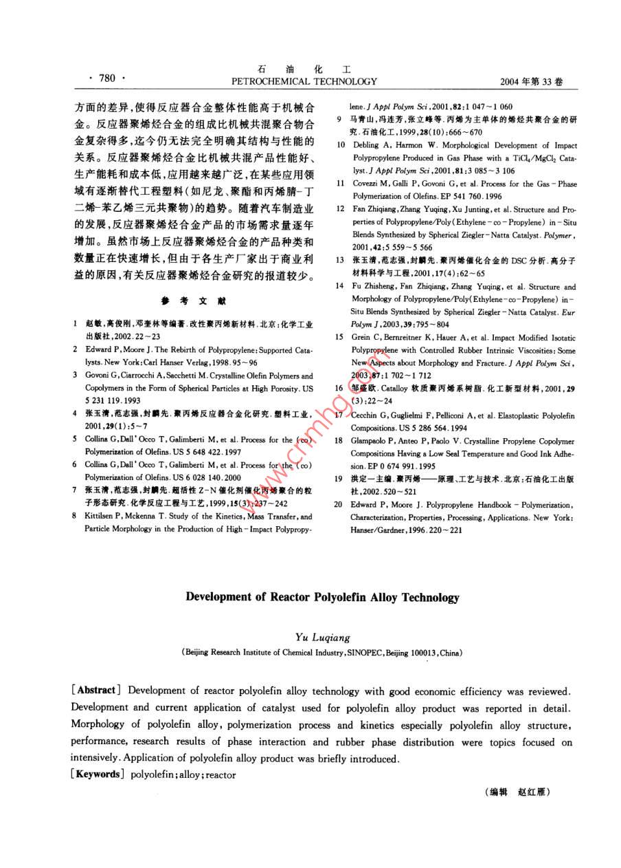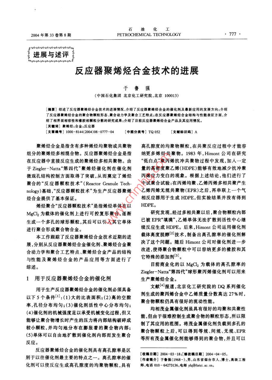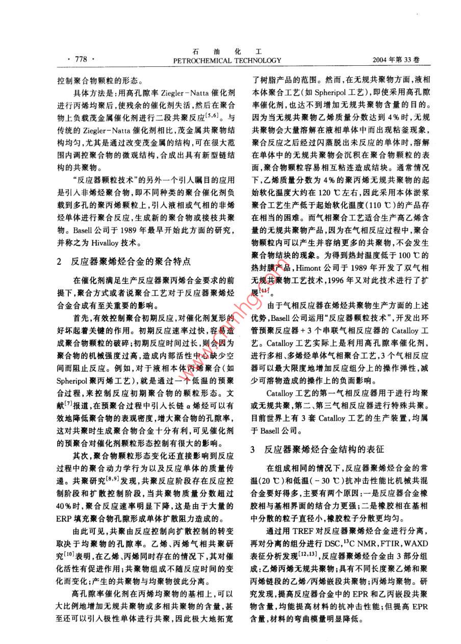 石油化I2004年第33卷第8期PETROCHEMICAL TECHNOLOGY, 777進(jìn)展與述評反應(yīng)器聚烯烴合金技術(shù)的進(jìn)展(中國石化集團(tuán)北京化工研究院,北京100013)[摘要]綜述了反應(yīng)器秦烯烴合金技術(shù)的進(jìn)展情況,介紹了反應(yīng)器聚烯烴合金的催化劑及最新應(yīng)用的發(fā)展方向;介紹了反應(yīng)器聚烯烴合金的聚合物顆粒形態(tài)、聚合動力學(xué)及聚合工藝特點;在反應(yīng)器聚烯烴合金結(jié)構(gòu)與性能表征方面,介紹了相界面相容性和橡膠相顆粒分敝的研究成果;介紹了目前反應(yīng)器聚烯烴合金產(chǎn)晶及其應(yīng)用情況。[關(guān)鍵調(diào)]聚烯烴;合金;反應(yīng)器[文章編號] 1004(000 -777-04[中圈分類號] TQ 052[文獻(xiàn)標(biāo)識碼] A聚烯烴合金是指含有多種烯烴均聚物或共聚物高孔隙度的均聚物顆粒,在共聚反應(yīng)過程中才能容.組分的聚烯烴多相混合物。反應(yīng)器聚烯烴合金是指納更多烯烴共聚物。1983 年, Himont公司在研究在反應(yīng)器中直接反應(yīng)生成的聚烯烴多相共聚物。由“低白點"聚丙烯抗沖共聚物過程中發(fā)現(xiàn),加入- -定于Ziegler-Natta“第四代”聚烯烴催化劑在催化劑量的高密度聚乙烯(HDPE)能夠有效地減少抗沖聚微觀孔結(jié)構(gòu)控制方面取得了突破,從而奠定了烯烴丙烯應(yīng)力變白的現(xiàn)象。根據(jù)上述結(jié)論,他們進(jìn)行了聚合的“反應(yīng)器顆粒技術(shù)" (Reactor Granule Tech-中試聚合試驗:在丙烯均聚乙烯丙烯多相共聚產(chǎn)生nology)基礎(chǔ),"反應(yīng)器顆粒技術(shù)"為生產(chǎn)反應(yīng)器聚烯乙烯丙烯無規(guī)共聚物(EPR)之后,再串聯(lián)上一個氣烴合金提供了基本保證。相反應(yīng)器用于生成HDPE,但實驗結(jié)果并沒有得到.烯烴聚合“反應(yīng)器顆粒技術(shù)”是指烯烴單體在以HDPE。MgCl為載體的催化劑上進(jìn)行可控復(fù)形聚合,逐漸研究發(fā)現(xiàn),經(jīng)過多相共聚以后,聚合物顆粒內(nèi)部生成一個多孔的球形顆粒,其后可以引人其它單體已被EPR“填滿”,乙烯單體無法擴散到活性中心繼進(jìn)行聚合形成聚合物合金。.續(xù)反應(yīng)生成HDPE。后來,Himont公司運用催化劑本工作跟蹤了反應(yīng)器聚烯烴合金技術(shù)近期的進(jìn)載體高度脫醇[21技術(shù),制備出高孔隙率的催化劑解展,分別從反應(yīng)器聚烯烴合金催化劑、聚烯烴合金聚決了這個問題。隨后Himont公司對催化劑進(jìn)一步合動力學(xué)和聚合工藝特點、聚烯烴合金產(chǎn)品的結(jié)構(gòu)改進(jìn),使得聚合物顆粒中可以容納更多的橡膠和其與性能及聚烯烴合金的產(chǎn)品應(yīng)用等方面進(jìn)行了它特殊的添加劑[3]。目前商業(yè)化的以MgCl為載體的高孔隙率的綜述。Ziegler- Natta“第四代”球形聚丙烯催化劑可以用來1用于反應(yīng)器聚烯烴合金的催化劑生產(chǎn)聚烯烴合金。用于生產(chǎn)反應(yīng)器聚烯烴合金的催化劑必須具備文獻(xiàn)[4]報道,北京化工研究院的DQ系列催化以下5個條件1]:(1)大的比表面積;(2)高的空隙劑生成的聚丙烯合金中乙烯質(zhì)量分?jǐn)?shù)高達(dá)27%時,率,孔徑分布均勻;(3)催化劑活性中心分布均勻;聚合物顆粒仍具有很好的流動性能。(4)催化劑的機械強度足以承受機械變化過程,但又均相茂金屬催化劑具有很好的均聚和共聚性能夠讓聚合物增長時產(chǎn)生的壓力將內(nèi)部結(jié)構(gòu)破碎成.能,但由于很難控制生成聚合物的顆粒形態(tài),所以限較小顆粒,并均勻地分布在膨脹著的聚合物內(nèi)部;制了其應(yīng)用的范圍。將茂金屬催化劑負(fù)載到多孔的(5)單體可以自由地擴散到催化劑內(nèi)部而發(fā)生聚合聚合物顆粒上后,可以得到等規(guī)、間規(guī)、無規(guī)、EPR .等所有茂金屬催化劑能夠得到的聚合物,并且可以反應(yīng)。反應(yīng)器聚烯烴合金的催化劑具有高孔隙率是區(qū)別于以往催化劑最主要的特點之一。高孔隙率的催[收稿日期] 2004-03-18;[修改稿日期]2004 -04-05。[作者簡介]于魯強(1968-),男,山東省煙臺市人,博士,高級工程化劑可以使反應(yīng)生成高孔隙度的均聚物顆粒,具有師,電話010- 64273136,電郵ylq@brici. ac. cn。石油化778●PETROCHEMICAL TECHNOLOGY2004年第33卷控制聚合物顆粒的形態(tài)。了樹脂產(chǎn)品的范圍。然而,在無規(guī)共聚物方面,液相.具體方法是:用高孔隙率Ziegler-Natta催化劑本體聚合工藝(如Spheripol工藝),即使采用高孔隙進(jìn)行丙烯均聚后,使殘余的催化劑失活,然后在聚合率催化劑,也達(dá)不到增加無規(guī)共聚物含量的目的。物上負(fù)載茂金屬催化劑進(jìn)行二段共聚反應(yīng)[5,6]。與因為當(dāng)無規(guī)共聚物乙烯質(zhì)量分?jǐn)?shù)達(dá)到4%時,無規(guī).傳統(tǒng)的Ziegler-Natta 催化劑相比,茂金屬共聚物結(jié)共聚物會大量溶解在液相單體中而出現(xiàn)粘釜現(xiàn)象,構(gòu)均勻,尤其是通過改變茂金屬的結(jié)構(gòu),可在很大范聚合反應(yīng)之后經(jīng)過閃蒸脫出未反應(yīng)的單體時,溶解圍內(nèi)調(diào)控聚合物的微觀結(jié)構(gòu),合成出具有新型鏈結(jié)在單體中的無規(guī)共聚物會沉積在聚合物顆粒的表構(gòu)的共聚物。面,聚合物顆粒容易相互粘連造成結(jié)塊。通常情況“反應(yīng)器顆粒技術(shù)"的另外-一個引人矚目的應(yīng)用下,乙烯質(zhì)量分?jǐn)?shù)為4%的聚