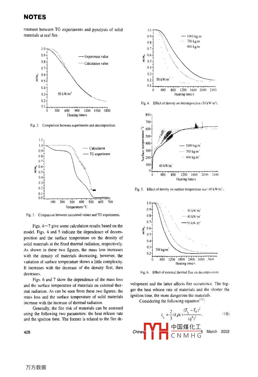 NOTESModeling pyrolysis ofwood is a combination of the external flux u lth the fIluxfrom the lame. The rate of heat release rises 10 a maxi-charring material in firemum rapidly, then a char layer builds up gradally as thepyrolysis front moves inward. Its rate of heat releaseYANG Lizhong, CHEN Xiaojun, ZHOU Xiaodong,11 Aeventually reaches a more or less steady valuc. At the tem-WANG Qing'an & FAN Weichengperature above 300C the char layer begins lto break downState Key Laboratory of Fire Science. University of Science and Tech-rapidly. The char layer shrinks under the same conditionnolog) of China. Hefei 230026. Chinaand pressure gradients are set up within the materials.Correspondence should bhe adressed to Yang L.izhong (e-mail: zxd@Small cracks appear on the surface. and these cracks allowustc.edu.cn)volatiles to escape more easily. The cracks graduallyAbstract A modifled model of pyrolysis for charringwiden as the char layer deepens.materials in fire has been proposed in this note. In tbis modelBecause of its importance and complexity of pyroly-some special factors which sbow the ellet on pyrolysis aresis of charring materials, there is a subsantial volume ofconsidered, i.e. heat loss by convection and radiation causedwork regarding the ignition. pyrolysis. buming. and char-by surface temperature rise and shrinkage of char surfacering behavior of wood and cellulosic materials experi-are considered, Experimental device is designed specially formentally and thereically' ". A thorough review on thisvalidating the reliability of the model. Effects of density ofwork has been described by other researchers' " and it ismaterials and heat radiation on pyrolysis of materials havealso been investigated.not the intent of this work. Here we only present themKeywords: charring materials, pyrolysis, fire, thermal radiation,very briefly.model.Kanury described ignition of solid miaterials underradiation conditins'4. Roberts. Simms. and SuubergCombustion is a complex interplay of chemical reac-studied the effect of kinetics on wood pyrolysish- . Sev-tion. heat, and mass transfer, and combustion of solid ma-eral models for the burning rate of solid maternals, bothterials becomes more complex because of the existingcharring and noncharring, have been developed. Examplessolid phase. Main combustible materials appearing ininclude the studies hy Kung8] Wichman et al!9. andbuilding fire are wood and other cellulosic materials, thusBrehob et al.l0l. These models range lfrom simple treat-study on their combustion characteristics during fire playsments of the ignition and burning process using pure heatan important role. Maybe it is the key to study ignition ofconduction models to the use of complex chemical kinet-solid materials and fire spreading of solid materials.ics for the pyrolysis of a charring materials. However.The pyolysis behavior of solid matenials can be di-each model has is retrictions.vided into two types: noncharring and charing". Non-In this nole, a modified one-dimensional pyrolysischarring materials such as PMMA bum away completely,model. which considers uransient conduction. gas convec-leaving no residue. and can be modeled by the theorytion, endothermic effect of process. nonlinear boundarysimilar to fammable liquids. In contrast, charing materi-condition and shrinkage of the slab. is pruposed. Theals leave relaively significant amounts of residue whenmode! is also compared with the experimenta! data ob-they bum. The pyrolysis of charing materials such astained from our research on white pine.wood is a complex interplay of chemistry, heal, and masstransfer. Charring materials must be modeled in terms ofa1 Theorypyrolysis front penetrating into the materials with an in-The model proposed in the note considers some fac-creasing surface temperature but without a well-definedtors that have a strong influence on pyrolysis of solid ma-steady state. The char layer forms an increasing thermalterials, such as transient heat conduction inside solid ma-resistance between the exposed surface and the pyrolysisterials, the effect of gas convection on heat transfer andfront. resuling in a continuously decreasing rate of heatthermal effect of pyrolysis process. Moreover, thermalrelease after the frst peak.properties of materials are permitted to vary with tem-Considering that a“thick" sample of wood with itsperature.surface is uniformly exposed t0 a constant extemal heat( i ) Assumptions. It is a complex process forflux. So the heal and mass transfer through the sample canwood pyrolysis and combustion. Thus it is very difcult tobe considered one-dimensional. Ignition can Occur at sur-consider all factors affecting the process in numericalface temperature anywhere from 200C up to 400C. Alsimulation. Specific assumptions are needed l0 establishthe instant of ignition. the heat fiux to the surface of themathematical model.|1 Jnssens. M.. Experimental study on pyrolysis of wood. Ph. D. Thesis UIniverity of Gen1. Belgium.1991.Chinese Science Blletin Vol. 47 No. 5 March 2002中國(guó)煤化工425MHCNMHGNOTES小The volatiles do not accumulate within the charwhere n is lhe reaction index. E. thc reacuon itint encrgylayer. but they can be produced and leave the surface ofand A the pre exponential factor.solid Immediately. Actually. most volatiles exit immedi-Based on the above lwo equations. we ohtainalely. others penetrate into the inner of solid;121 Moisture content of solid is neglected. Actually.dp,13)waler mainly affects the mass loss at the early stage ofdrPw- PR7heating and postpones surface temperature risc;The gas mass conservation equaton Is5 given as(3) Chemical reactions between volatile and charlayer as well as that between char and air are ignored,Mg_ a雙(4)(4) Materials properties are assumed to be linear)x dr°with the range of the considered temperature.(ii) Controling equation. The suface and innerwhere Mg is the mass of volatiles.The energy conservation equation is given hytemperature of w
