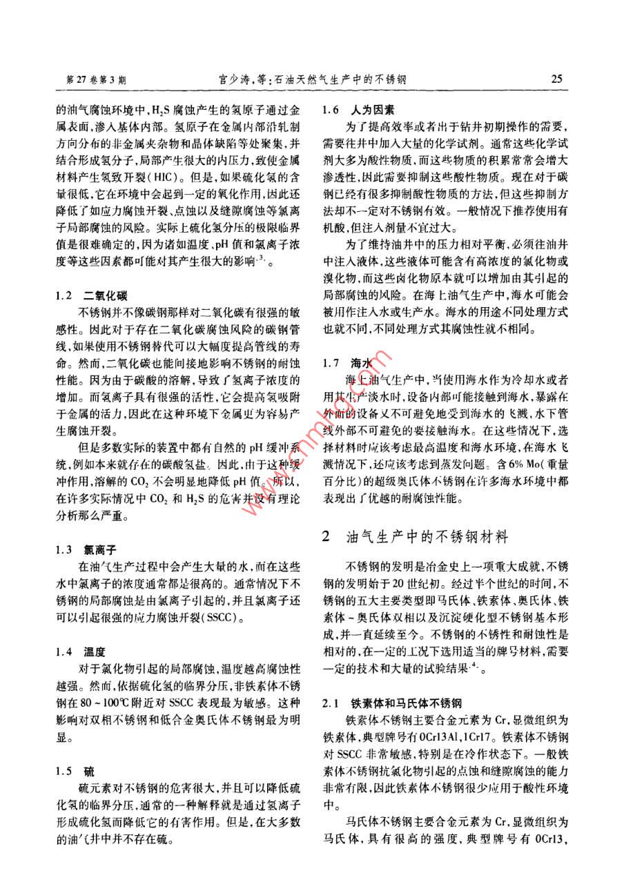 第27卷第3期天然氣與石油Vol 27. No. 32009年6月Natural Gas And OilJun.2009石油天然氣生產(chǎn)中的不銹鋼宮少濤,李為衛(wèi),張奕,王冉,馮耀榮(中國(guó)石油管材研究所石油管力學(xué)與環(huán)境行為重點(diǎn)實(shí)驗(yàn)室陜西西安71005)摘要:隨著石油天然氣工業(yè)的發(fā)展,耐蝕性差的碳鋼和低合金鋼材料已難以滿足生產(chǎn)需要,因此耐蝕性優(yōu)良的不銹鋼材料就成為一個(gè)油氣工業(yè)選材的研究熱點(diǎn)。闡述了油氣生產(chǎn)中硫化氫、二氧化碳、氣離子、溫度、硫、海水及人工操作這些影響腐蝕的因素,介紹了適合于油氣生產(chǎn)中使用的鐵素體不銹鋼、馬氏體不銹鋼、奧氏體不銹鋼及雙相不銹鋼。關(guān)鍵詞:石油;天然氣;腐蝕環(huán)境;不銹鋼文章編號(hào):10065539(2009)03002403文獻(xiàn)標(biāo)識(shí)碼:A鋼的使用越來(lái)越多120前言另外,緩蝕劑或多或少的都對(duì)環(huán)境存在危害,從環(huán)境的角度考慮,也使不銹鋼的使用量逐步增加。油氣生產(chǎn)過(guò)程中,材料往往處于高溫高壓環(huán)境本文對(duì)油氣生產(chǎn)中的腐蝕因素和使用的不銹鋼材料和氣、水、烴、固共存的多相流腐蝕介質(zhì)中,HS,作了介紹。CO2,O2,Cl^和地層水、土壤是最主要的腐蝕介質(zhì)腐蝕是金屬材料主要失效形式之一,石油和天然氣1油氣生產(chǎn)中影響腐蝕的因素開(kāi)發(fā)與加工行業(yè)歷來(lái)是腐蝕比較嚴(yán)重的幾個(gè)行業(yè)之而且?guī)缀跎婕暗礁鞣N腐蝕類型。而未來(lái)的石油石油天然氣本身對(duì)金屬材料并沒(méi)有腐蝕性,而工業(yè)將面臨油井開(kāi)采后期含水量的提高深井超深且在一定程度上,石油對(duì)腐蝕還有抑制作用,當(dāng)油膜井的開(kāi)發(fā)將會(huì)導(dǎo)致溫度/壓力進(jìn)一步提高、強(qiáng)腐蝕環(huán)很厚時(shí)就可以全面的抑制腐蝕但是,當(dāng)油膜很薄并境油井的開(kāi)發(fā)和注CO2驅(qū)采油技術(shù)應(yīng)用會(huì)導(dǎo)致且孤立地存在于腐蝕液中時(shí)這種抑制作用就會(huì)大CO2,H2S和C含量上升等問(wèn)題都將使石油管的大減弱。而真正會(huì)對(duì)金屬材料產(chǎn)生腐蝕風(fēng)險(xiǎn)的是石內(nèi)外腐蝕更趨嚴(yán)重。油天然氣中含有的腐蝕性雜質(zhì)(如硫化氫、氯離子、然而,目前在油氣生產(chǎn)中主要采用的是碳鋼材氧、二氧化碳等等)。料,對(duì)于這些強(qiáng)腐蝕環(huán)境,在服役多年的老井和開(kāi)采腐蝕性更強(qiáng)的油氣井時(shí)常常需要使用大量的緩蝕1.1硫化氫劑。而采用碳鋼+緩蝕劑方案,會(huì)遇到許多不可預(yù)通常,依據(jù)硫化氫含量,油氣工業(yè)生產(chǎn)的液體和見(jiàn)的換管停產(chǎn)作業(yè)等失效風(fēng)險(xiǎn)。清管等運(yùn)行作業(yè)氣體可分為“甜性”和“酸性”兩種環(huán)境。甜性環(huán)境未考慮而且緩蝕劑的加注有效性存在不確定性,有即油氣產(chǎn)品不含硫化氫或其含量很少可忽略不計(jì)。較高風(fēng)險(xiǎn)和安全隱患。所以采用耐蝕性能優(yōu)良的不但甜性環(huán)境也可能含有大量的二氧化碳,會(huì)加速碳銹鋼材料就成為腐蝕防護(hù)的主要方向之一。雖然其鋼的腐蝕酸性環(huán)境即油氣產(chǎn)品中的硫化氫含量很次性投資高但從長(zhǎng)遠(yuǎn)的經(jīng)濟(jì)角度來(lái)看,因?yàn)榫S護(hù)高。成本低、重量減少(因不需要增加腐蝕余量),以及硫化氫對(duì)金屬材料的主要危害,就是在一定的使用壽命更長(zhǎng)的特點(diǎn),采用不銹鋼材料可以為石油條件下使金屬脆化,在拉應(yīng)力的作用下導(dǎo)致材料產(chǎn)工業(yè)帶來(lái)巨大的經(jīng)濟(jì)效益。因此,油氣工業(yè)中不銹生“硫化物應(yīng)力腐蝕開(kāi)裂”(SSC)。另外,在含H2S收稿日期:20090306作者簡(jiǎn)介:宮少濤(1980-),男,陜西西安人,工程師,本科,現(xiàn)主要從事油氣輸送管的材料與焊接研究工作。電話:(029)88726272第27卷第3期宮少濤,等:石油天然氣生產(chǎn)中的不銹鋼的油氣腐蝕環(huán)境中,H2S腐蝕產(chǎn)生的氫原子通過(guò)金1.6人為因素屬表面,滲入基體內(nèi)部。氫原子在金屬內(nèi)部沿軋制為了提高效率或者出于鉆井初期操作的需要方向分布的非金屬夾雜物和品體缺陷等處聚集,并需要往井中加入大量的化學(xué)試劑。通常這些化學(xué)試結(jié)合形成氫分子,局部產(chǎn)生很大的內(nèi)壓力,致使金屬劑大多為酸性物質(zhì),而這些物質(zhì)的積累常常會(huì)增大材料產(chǎn)生氫致開(kāi)裂(HC)。但是,如果硫化氯的含滲透性,因此需要抑制這些酸性物質(zhì)。現(xiàn)在對(duì)于碳量很低它在環(huán)境中會(huì)起到一定的氧化作用,因此還鋼已經(jīng)有很多抑制酸性物質(zhì)的方法,但這些抑制方降低了如應(yīng)力腐蝕開(kāi)裂、點(diǎn)蝕以及縫隙腐蝕等氯離法卻不一定對(duì)不銹鋼有效。一般情況下推薦使用有子局部腐蝕的風(fēng)險(xiǎn)。實(shí)際上硫化氫分壓的極限臨界機(jī)酸,但注入劑量不宜過(guò)大。值是很難確定的,因?yàn)橹T如溫度pH值和氯離子濃為了維持油井中的壓力相對(duì)平衡,必須往油井度等這些因素都可能對(duì)其產(chǎn)生很大的影響。中注入液體,這些液體可能含有高濃度的氯化物或溴化物,而這些鹵化物原本就可以增加由其引起的1.2二氧化碳局部腐蝕的風(fēng)險(xiǎn)。在海上油氣生產(