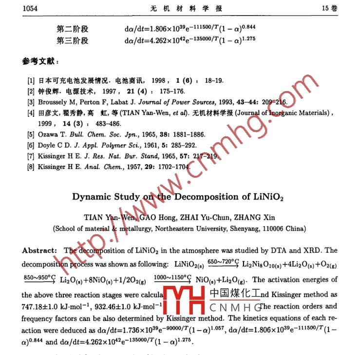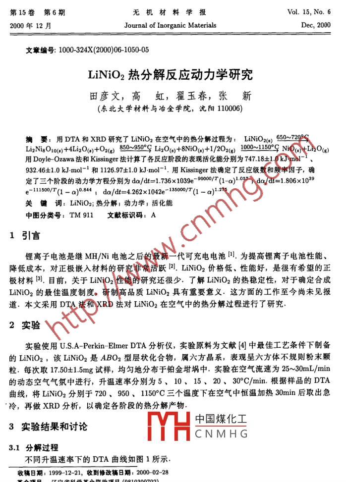 LiNiO2熱分解反應(yīng)動力學(xué)研究
