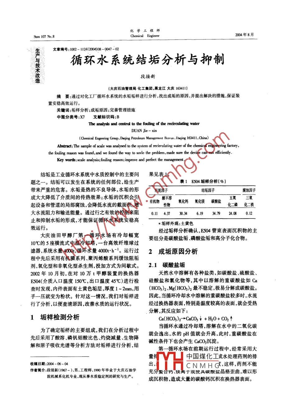 化學(xué)工程師Sum 107 No.8Cheniceal Engineer2004年8月文章編號(hào):1002 - 112002)08 -047 -02與循環(huán)水系統(tǒng)結(jié)垢分析與抑制.段接新造(大慶石油管理局化工集團(tuán),黑龍江大慶163411摘要:通過(guò)對(duì)化工廠循環(huán)水系統(tǒng)的水垢垢樣進(jìn)行分析,找出成垢的原因,并提出解決的措施,保證裝置安穩(wěn)高效運(yùn)行。關(guān)鍵詞:垢樣分析;成垢原因;完善管理措施中圖分類(lèi)號(hào):X7文獻(xiàn)標(biāo)識(shí)碼:BThe analysls and centrol to the fouling of the redrculating waterDUAN Jjie - xin(Chenical Engeering Group, Daqing Petroleum Management Ruru, Daxing 163411,Chin)Abstract: The sarmple of scale was analyed to the sytem of reirculaing waler of the chemial engineering factory,the fouling reason was found, and we found the way to sovle the problem, made sure the device can un eiciently.Key words: scale analysis; fouling reason; improve and perfect the management.結(jié)垢是工業(yè)循環(huán)水系統(tǒng)中水質(zhì)控制中的主要問(wèn)果見(jiàn)表1。題之一。結(jié)垢可以發(fā)生在系統(tǒng)的任何部位,給生產(chǎn)表1 E504 垢樣分析(% )帶來(lái)嚴(yán)重的危害。水垢是熱的不良導(dǎo)體,水垢的形污妮因子結(jié)垢因子腐蝕因子成大大降低了介質(zhì)間的傳熱效果;水垢的沉積會(huì)引有機(jī)物酸不溶氧化鈣 氧化鎂 碳酸鹽五氧三氧起設(shè)備和管道的局部腐蝕,會(huì)降低水流的截面積,增性物化二磷化二鐵大水流阻力和輸送能量。通過(guò)行之有效的控制來(lái)阻0.11 4.3730.346.1934.7924.08 .0.12止和抑制水垢的形成,才能保證循環(huán)水系統(tǒng)安穩(wěn)高*垢樣外觀:土黃色效運(yùn)行。經(jīng)過(guò)垢樣分析確認(rèn),E504管束表面沉積物的主大慶油田甲醇廠第一循環(huán)水場(chǎng)有冷卻幅寬要組分是碳酸鹽垢、磷酸鹽垢和高分子化合物。10心的5座橫流式中溫冷卻塔,一臺(tái)高效纖維球過(guò)濾器,系統(tǒng)水量4000t,循環(huán)水量4000t+h-1。運(yùn)行過(guò)2成垢原因分析程中先后采用有機(jī)膦系列、聚丙烯酸系列緩蝕阻垢劑,氧化型和非氧化型殺生劑,投加方式為間歇式。2.1碳酸鹽垢2002年10月初,在對(duì)10萬(wàn)t甲醇裝置的換熱器天然水中溶解有各種鹽類(lèi),如碳酸鹽硫酸鹽、E504(介質(zhì)人口溫度150C,出口溫度45C)進(jìn)行檢硅酸鹽和氯化物等,其中以溶解的重碳酸鹽如Ca查時(shí)發(fā)現(xiàn),內(nèi)件表面有土黃色垢層,厚度1 ~ 2mm,用(HCO3)2、Mg(HCO3)2最不穩(wěn)定,極易分解成碳酸鹽。手- -壓就變?yōu)榉蹱?。針?duì)這一情況,我們對(duì)垢樣進(jìn)因此,當(dāng)循環(huán)冷卻水中溶解的重碳酸鹽較多時(shí),水流行了分析,以便查清原因,改善水質(zhì)的運(yùn)行狀況。經(jīng)過(guò)換熱器表面,特別是溫度較高的表面,就會(huì)受熱分解,其反應(yīng)如下:1垢樣檢測(cè)分析Ca(HC03)2-→+CaCO3↓+ H20+ CO2↑為了確定垢樣的主要組成,我們?cè)诜治鲞^(guò)程中當(dāng)循環(huán)水通過(guò)冷卻塔,溶解在水中的二氧化碳先后采用了酸溶、磷釩鉬酸比色、灼燒減量、生物降就會(huì)逸出,水的pH值就會(huì)升高,此時(shí),重碳酸鹽在解和原子吸收光譜等分析方法對(duì)垢樣進(jìn)行分析,結(jié)堿性條件下也會(huì)產(chǎn)生CaCO3沉淀。第一循環(huán)水場(chǎng)在前期運(yùn)行過(guò)程中,經(jīng)常采用大量抖中國(guó)煤化工成水處理藥劑的排收稿日期:2004-06-04出,CNMH ,這樣,藥劑不能作者簡(jiǎn)介:段接新(1967 - ),男,工程師,199年畢業(yè)于大慶石油學(xué)充分登合鈣、缺離十或使具候酸鹽晶格歪曲,難以形院機(jī)械系化機(jī)專(zhuān)業(yè),現(xiàn)從事水質(zhì)穩(wěn)定劑的研究與生產(chǎn)。成沉積物,造成大量的碳酸鈣沉積在換熱器表面。48段接新:循環(huán)水系統(tǒng)結(jié)垢分析與抑制2004 年第8期2.2磷酸鹽垢須先搞清所投加的緩蝕阻垢劑和殺生劑的性能,特當(dāng)水中溶有適量的磷酸鹽時(shí),磷酸根將與鈣離別要注意兩種藥劑間的相容性,以避免因藥劑不相子生成溶解度只有0. lmg* L-'的磷酸鈣沉淀,其反容而影響藥劑活性甚至產(chǎn)生高分子化合物及其他物應(yīng)如下:質(zhì)沉積在換熱器表面。2P02- + 3Ca?+ = Ca;(P04)2↓表2控制指標(biāo)指標(biāo)濃縮懸浮物Fe2+C2+甲基橙a-循環(huán)水運(yùn)行前期投加有機(jī)膦系列水穩(wěn)劑,但由pH值名稱(chēng)倍數(shù)/mg-1/mg:L-/mg:L-1 賊度/mg:L!于運(yùn)行中頻繁投加含有活性氯的殺生劑,致使阻垢控制值2.5-3.5 ≤15 8.0-9.2 s0.5 50-20 <500 ≤300_劑水解成正磷酸根,最終導(dǎo)致磷酸鈣在換熱器表面(2)控制有機(jī)膦分解在使用 有機(jī)膦做緩蝕阻析出,形成磷酸鹽垢。垢劑時(shí),盡量不采用含有活性氯的殺生劑,防止因有2.3高分 子化合物經(jīng)過(guò)對(duì)垢樣中酸不溶物的生物降解和灼燒減量機(jī)膦水解造成P0;-富集而生成Ca3(P04)2沉積在分析,判斷不溶物為有機(jī)化合物。我們又對(duì)循環(huán)水換熱器表面。使用的緩蝕阻垢劑與殺生劑在使用濃度下彼此相溶(3)搞好循環(huán)水場(chǎng)的日常運(yùn)行管理按時(shí)進(jìn)行性進(jìn)行實(shí)驗(yàn),實(shí)驗(yàn)中發(fā)現(xiàn)有粘性物質(zhì)吸附在玻璃容水質(zhì)監(jiān)測(cè),及時(shí)提出監(jiān)測(cè)報(bào)告;做好垢樣采集分析,器表面,通過(guò)實(shí)驗(yàn)進(jìn)一步 確定不溶物為高分子化合建立完善的水處理