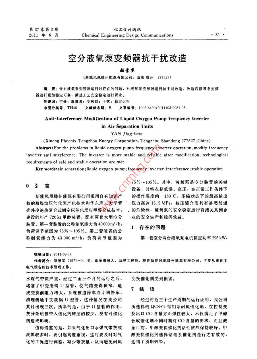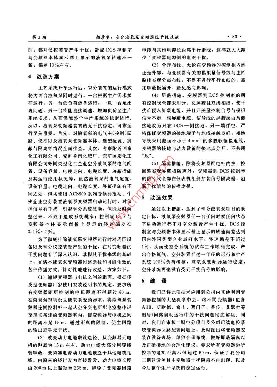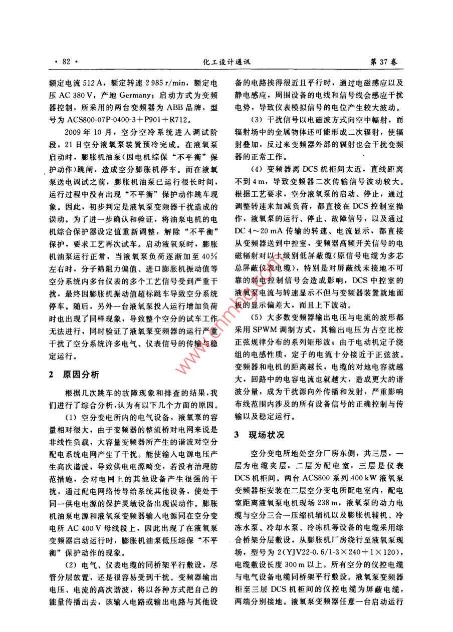 第37卷第3期化工設(shè)計(jì)通訊201年6月 Chemical Engineering Design Communications·81空分液氧泵變頻器抗干擾改造顆景賽(新能鳳凰滕州能源有限公司,山東滕州277527)摘要:針對(duì)液氧泵變頻器運(yùn)行時(shí)存在的問題,對(duì)液氧泵變頻器進(jìn)行抗干擾改造。改造后液氧泵變頻器運(yùn)行更加穩(wěn)定可靠,滿足工藝安全穩(wěn)定運(yùn)行要求關(guān)鍵詞:空分;液氧泵;變頻器;干擾;穩(wěn)定運(yùn)行中圖分類號(hào):TH45文獻(xiàn)標(biāo)志碼:B文章編號(hào):1003-6490(2011)030081-03Anti-Interference Modification of Liquid Oxygen Pump Frequency Inverterin Air Separation UnitsYAN Jing-luan(Xineng Phoenix Tengzhou Energy Corporation, Tengzhou Shandong 277527, China)Abstract: For the problems in liquid oxygen pump frequency inverter operation, modify frequencyinverter anti-interference. The inverter is more stable and reliable after modification, technologicalrequirements of safe and stable operation are metKey words: air separation: liquid oxygen pump frequency inverter; interference; stable operation75%~105%。其中,液氧泵是空分裝置的關(guān)鍵0引言設(shè)備,其特點(diǎn)是低溫、高壓,在正常工作條件下新能鳳凰滕州能源有限公司采用自有知識(shí)產(chǎn)的操作溫度約-183℃,壓縮狀態(tài)下的最高輸出權(quán)的粉煤加壓氣化國產(chǎn)化技術(shù)和華東理工大學(xué)管壓力高達(dá)16.5MPa,被壓縮介質(zhì)具有易燃易爆殼外冷絕熱復(fù)合式固定床催化反應(yīng)甲醇合成技術(shù),,的危險(xiǎn)性,液氧泵的安全穩(wěn)定運(yùn)行直接關(guān)系到企建設(shè)的年產(chǎn)720kt甲醇裝置,配有兩套大型空分業(yè)的安全生產(chǎn)和經(jīng)濟(jì)效益。裝置。第一套裝置的公稱制氧能力為40000m3/h負(fù)荷調(diào)節(jié)范圍為75%~105%。第二套裝置的公1存在的問題稱制氧能力為43000m3/h,負(fù)荷調(diào)節(jié)范圍為第一套空分兩臺(tái)液氧泵電機(jī)額定功率295kW收稿日期:2011-03-14作者簡介:顏景鑾(1971一),男,山東臁州人,助理工程師,現(xiàn)在新能風(fēng)凰滕州能源有限公司,主要從事化工電氣設(shè)備的技術(shù)管理工作水煤氣帶灰嚴(yán)重,經(jīng)過二至三個(gè)月的運(yùn)行之后,變換催化劑受到損害。堵塞了中變廢鍋U型管,使氣路變得狹窄,造成變換前阻力增大,系統(tǒng)被迫停車或計(jì)劃停車,7結(jié)語清理疏通中變廢鍋U型管,這種情況在我公司經(jīng)過將近三個(gè)生產(chǎn)周期的運(yùn)行證明,我公司共計(jì)出現(xiàn)三次。所幸的是,由于U型管的作用,所選擇的QCS04鈷鉬系耐硫催化劑,在控制變灰分雜質(zhì)被帶入催化劑床層的較少,沒有對(duì)催化換出口CO含量方面彈性較大,不僅滿足了甲醇劑造成影響合成催化劑不同時(shí)期對(duì)CO含量的要求,而且截值得借鑒的是,如果氣化出口水煤氣帶灰或至目前,甲醇變換催化劑活性依然保持較好。甲炭黑較多時(shí),要引起高度重視,這時(shí)要及時(shí)對(duì)氣醇變換催化劑選擇鈷鉬系催化劑是行之有效的,化的工況進(jìn)行調(diào)整,減少帶灰量,從而避免耐硫達(dá)到了預(yù)期效果。化工設(shè)計(jì)通訊37卷額定電流512A,額定轉(zhuǎn)速2985r/min,額定電備的電路挨得很近且平行時(shí),通過電磁感應(yīng)以及壓AC380V,產(chǎn)地 Germany;啟動(dòng)方式為變頻靜電感應(yīng),周圍設(shè)備的電線和信號(hào)線會(huì)感應(yīng)干擾器控制,所采用的兩臺(tái)變頻器為ABB品牌,型電勢,導(dǎo)致儀表模擬信號(hào)的電位產(chǎn)生較大波動(dòng)。號(hào)為ACS800-07P0400-3+P901+R712(3)干擾信號(hào)以電磁波方式向空中幅射,而2009年10月,空分空冷系統(tǒng)進(jìn)入調(diào)試階輻射場中的金屬物體還可能形成二次輻射,使輻段,21日空分液氧泵裝置預(yù)冷完成。在液氧泵射疊加,反過來變頻器外部的輻射也會(huì)干擾變頻啟動(dòng)時(shí),膨脹機(jī)油泵(因電機(jī)綜?!安黄胶狻北F鞯恼9ぷ?。護(hù)動(dòng)作)跳閘,造成空分膨脹機(jī)停車。而在液氧(4)變頻器離DCS機(jī)柜間太近,直線距離泵送電調(diào)試之前,膨脹機(jī)油泵已運(yùn)行很長時(shí)間,不到4m,導(dǎo)致變頻器二次傳輸信號(hào)波動(dòng)較大。運(yùn)行過程中沒有出現(xiàn)“不平衡”保護(hù)動(dòng)作跳車現(xiàn)根據(jù)工藝要求,空分液氧泵的啟動(dòng)、停止,通過象。因此,初步判定是液氧泵變頻器干擾造成的調(diào)整轉(zhuǎn)速來加減負(fù)荷,都直接在DCS控制室操誤動(dòng)。為了進(jìn)一步確認(rèn)和驗(yàn)證,將油泵電機(jī)的電作,液氧泵的運(yùn)行、停止、故障信號(hào),以及通過機(jī)綜合保護(hù)器設(shè)定值重新調(diào)整,解除“不平衡”DC4~20mA傳輸?shù)霓D(zhuǎn)速、電流顯示,都直接保護(hù),要求工藝再次試車。啟動(dòng)液氧泵時(shí),膨脹從變頻器送到中控室,變頻器高頻開關(guān)信號(hào)的電機(jī)油泵運(yùn)行正常,當(dāng)液氧泵負(fù)荷逐漸加至40%磁輻射對(duì)以上級(jí)別低屏蔽纜(原信號(hào)電纜為多芯左右時(shí),分子篩阻力偏值、進(jìn)口膨脹機(jī)振動(dòng)值等總屏蔽儀表電纜),特別是對(duì)屏蔽線未接地不可空分系統(tǒng)內(nèi)多臺(tái)儀表的多個(gè)工藝信號(hào)受到嚴(yán)重干靠的弱電控制信號(hào)會(huì)造成影響,DCS中控室的擾,最終因膨脹機(jī)振動(dòng)值超標(biāo)跳車導(dǎo)致空分系統(tǒng)液氧泵電流與轉(zhuǎn)速