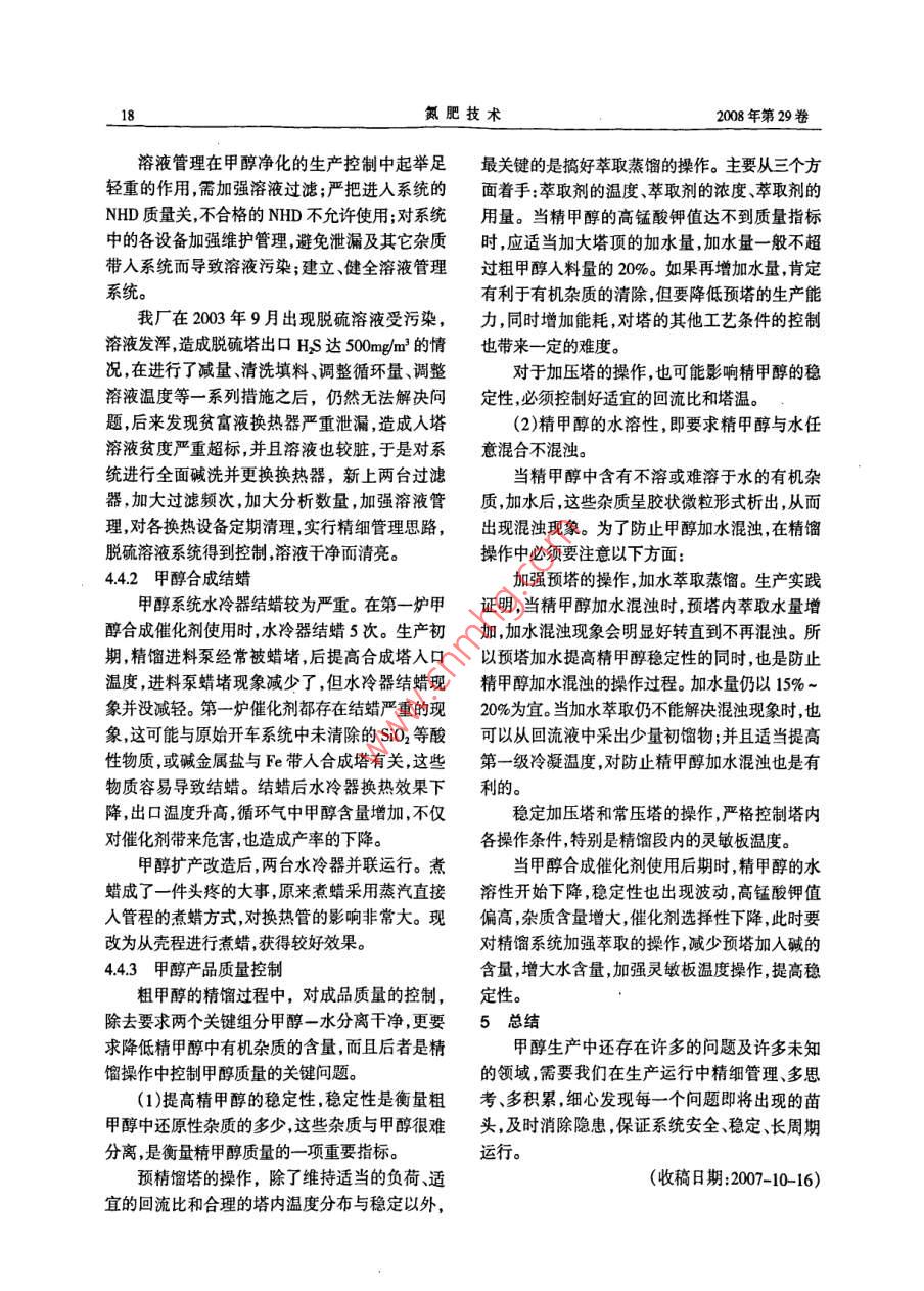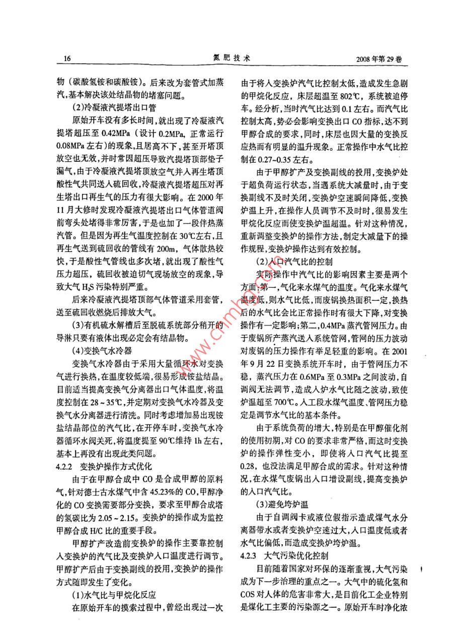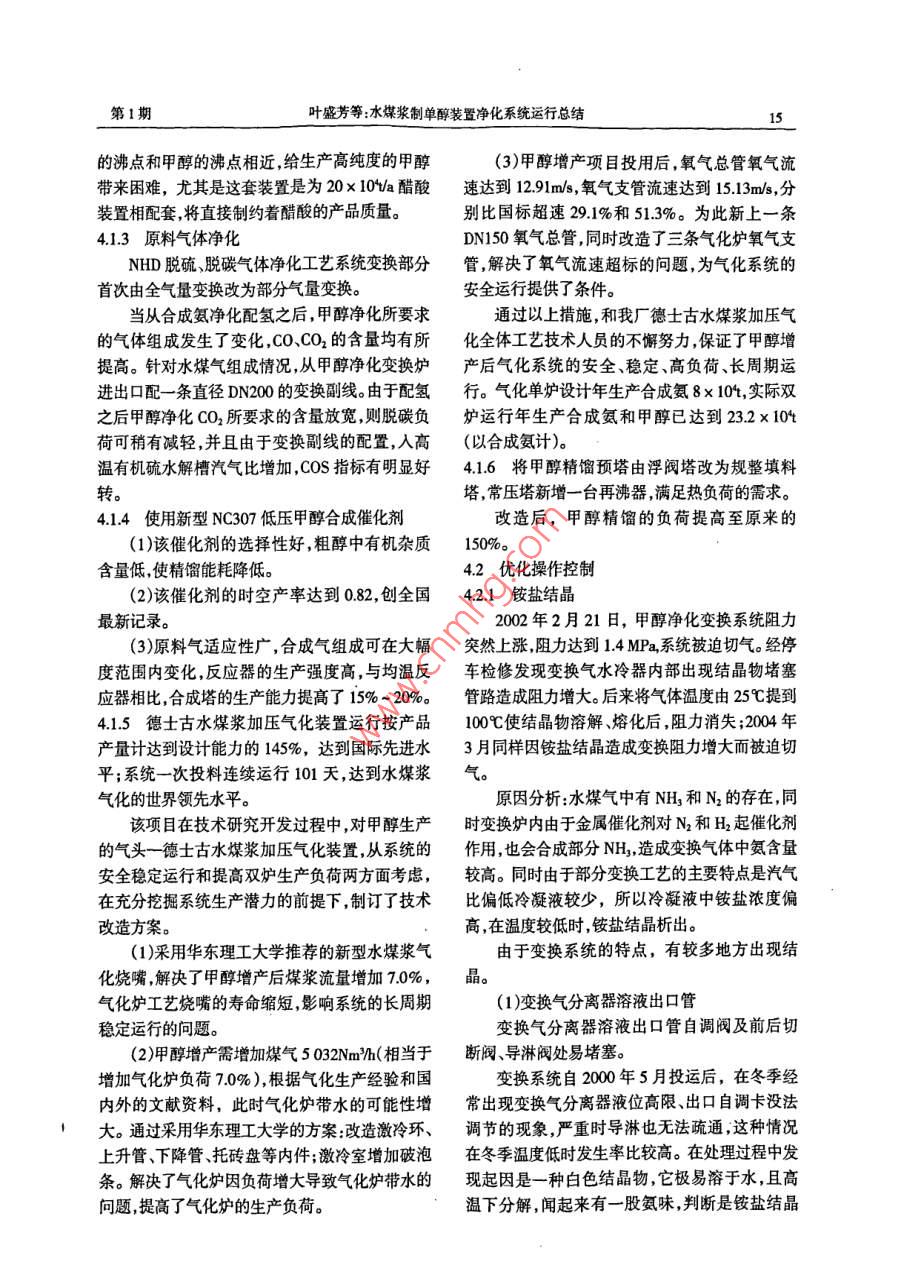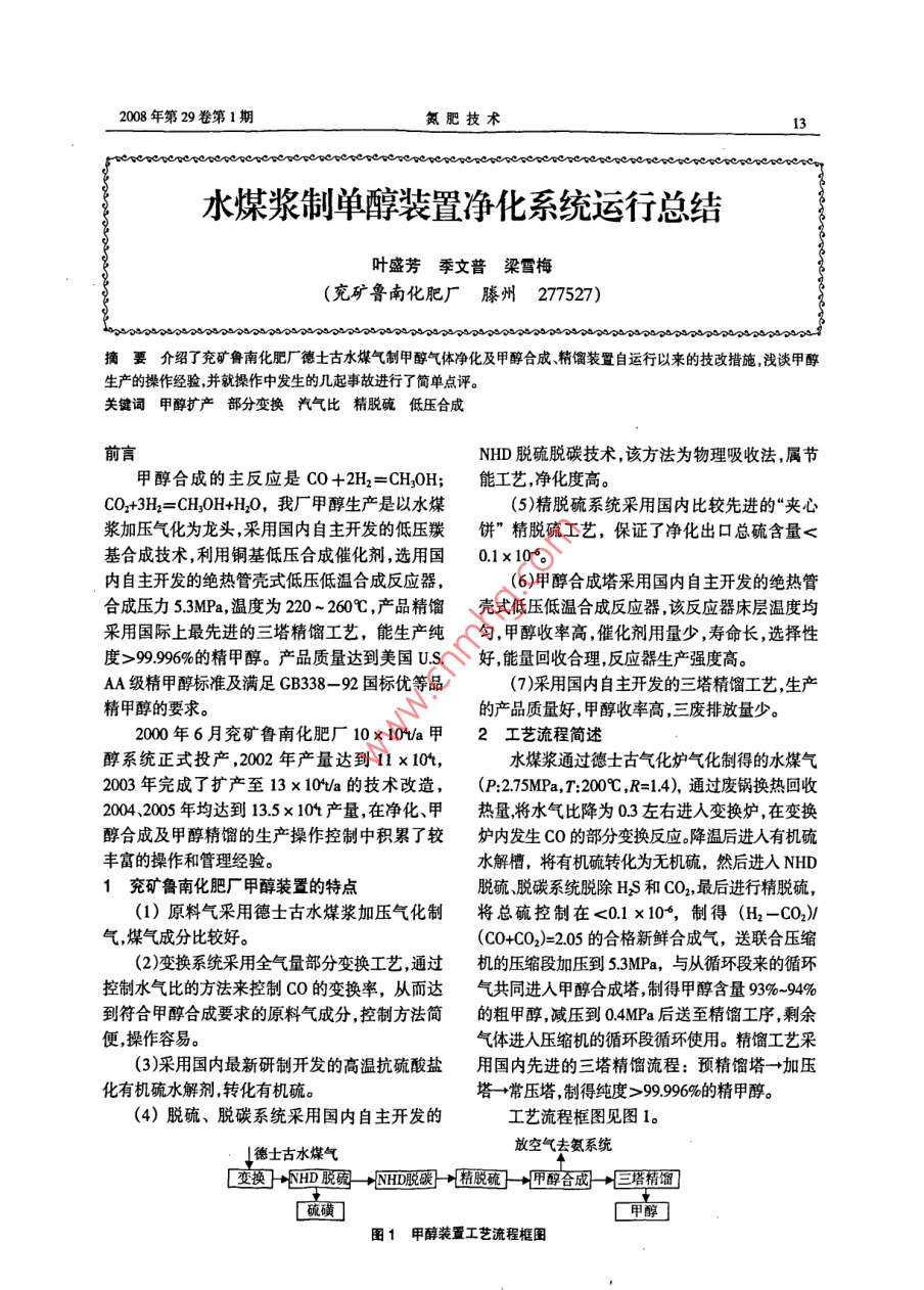2008年第29卷第1期氮肥技術(shù)wesesesesccweseseweeeseseweveesesescseseteeeteseseee水煤漿制單醇裝置凈化系統(tǒng)運行總結(jié)葉盛芳季文普梁雪梅(兗礦魯南化肥廠滕州277527)oscsoaovsosssososssosososso4..Sos5MsMM摘要介紹了充礦魯南化肥廠德土古水煤氣制甲醇?xì)怏w凈化及甲醇合成、精餾裝置自運行以來的技改措施淺談甲醇生產(chǎn)的操作經(jīng)驗,并就操作中發(fā)生的幾起事故進(jìn)行了簡單點評關(guān)鍵詞甲醇擴(kuò)產(chǎn)部分變換汽氣比精脫硫低壓合成前言NHD脫硫脫碳技術(shù),該方法為物理吸收法,屬節(jié)甲醇合成的主反應(yīng)是CO+2H2=CHoH;能工藝凈化度高。CO2+3H2=CHOH+HO,我廠甲醇生產(chǎn)是以水煤(5)精脫硫系統(tǒng)采用國內(nèi)比較先進(jìn)的“夾心漿加壓氣化為龍頭,釆用國內(nèi)自主開發(fā)的低壓羰餅”精脫硫工藝,保證了凈化出口總硫含量<基合成技術(shù),利用銅基低壓合成催化劑,選用國01×106內(nèi)自主開發(fā)的絕熱管殼式低壓低溫合成反應(yīng)器,(6)甲醇合成塔采用國內(nèi)自主開發(fā)的絕熱管合成壓力53MPa,溫度為220~260℃,產(chǎn)品精餾殼式低壓低溫合成反應(yīng)器該反應(yīng)器床層溫度均采用國際上最先進(jìn)的三塔精餾工藝,能生產(chǎn)純勻,甲醇收率高催化劑用量少,壽命長,選擇性度>99996%的精甲醇。產(chǎn)品質(zhì)量達(dá)到美國US.好能量回收合理,反應(yīng)器生產(chǎn)強(qiáng)度高AA級精甲醇標(biāo)準(zhǔn)及滿足GB338-92國標(biāo)優(yōu)等品(7)采用國內(nèi)自主開發(fā)的三塔精餾工藝,生產(chǎn)精甲醇的要求。的產(chǎn)品質(zhì)量好,甲醇收率高,三廢排放量少。2000年6月兗礦魯南化肥廠10×10%a甲2工藝流程簡述醇系統(tǒng)正式投產(chǎn),2002年產(chǎn)量達(dá)到11x10t水煤漿通過德士古氣化爐氣化制得的水煤氣2003年完成了擴(kuò)產(chǎn)至13×10%a的技術(shù)改造,(P:275MPa,T:200℃,R=14),通過廢鍋換熱回收20042005年均達(dá)到135×10產(chǎn)量,在凈化、甲熱量將水氣比降為03左右進(jìn)入變換爐,在變換醇合成及甲醇精餾的生產(chǎn)操作控制中積累了較爐內(nèi)發(fā)生CO的部分變換反應(yīng)。降溫后進(jìn)入有機(jī)硫豐富的操作和管理經(jīng)驗。水解槽,將有機(jī)硫轉(zhuǎn)化為無機(jī)硫,然后進(jìn)入NHD1兗礦魯南化肥廠甲醇裝置的特點脫硫、脫碳系統(tǒng)脫除HS和CO2,最后進(jìn)行精脫硫,)原料氣采用德士古水煤漿加壓氣化制將總硫控制在<01×106,制得(H2-CO2氣,煤氣成分比較好(CO+CO2)=205的合格新鮮合成氣,送聯(lián)合壓縮(2)變換系統(tǒng)采用全氣量部分變換工藝通過機(jī)的壓縮段加壓到53MPa,與從循環(huán)段來的循環(huán)控制水氣比的方法來控制CO的變換率,從而達(dá)氣共同進(jìn)入甲醇合成塔制得甲醇含量93%-94%到符合甲醇合成要求的原料氣成分,控制方法簡的粗甲醇減壓到0MPa后送至精餾工序,剩余便操作容易。氣體進(jìn)人壓縮機(jī)的循環(huán)段循環(huán)使用。精餾工藝采(3)采用國內(nèi)最新研制開發(fā)的高溫抗硫酸鹽用國內(nèi)先進(jìn)的三塔精餾流程:預(yù)精餾塔→加壓化有機(jī)硫水解劑轉(zhuǎn)化有機(jī)硫。塔→常壓塔制得純度>9996%的精甲醇(4)脫硫、脫碳系統(tǒng)采用國內(nèi)自主開發(fā)的工藝流程框圖見圖1德士古水煤氣放空氣去氨系統(tǒng)[變換出脫礬→NH脫歌宀脫硫}醇合成匚塔精餾硫磺圖1甲醇裝置工藝流程框圖氮肥技術(shù)008年第29卷3甲醇生產(chǎn)裝置監(jiān)控的重點(H2-CO2)/(CO+CO2)=2.05-21,送往甲醇合成(1)入甲醇合成塔氣體成分系統(tǒng)。氫碳比的調(diào)節(jié)通過調(diào)節(jié)合成氨凈化送來的甲醇合成反應(yīng)要求(H2-CO2)(CO+CO2)脫碳?xì)鈿饬縼韺崿F(xiàn),CO量采用甲醇凈化變換系=205~21,所以在甲醇凈化工序必須嚴(yán)格控制統(tǒng)加設(shè)副線的方法調(diào)節(jié)控制。入甲醇合成工段新鮮氣成分,通過變換系統(tǒng)的調(diào)41增設(shè)配H2管線節(jié)控制來監(jiān)控CO指標(biāo),通過脫碳塔的操作控制調(diào)外部合成氣為甲醇系統(tǒng)使用,實現(xiàn)甲醇、CO2在(3±05)%。合成氨生產(chǎn)系統(tǒng)的柔性調(diào)節(jié)。(2)甲醇凈化氣硫含量通過從合成氨凈化脫碳后引一配氫管線到兗礦魯南化肥廠甲醇合成催化劑采用甲醇凈化的精脫槽入口,用合成氨生產(chǎn)系統(tǒng)的部NC307型的銅基低壓合成催化劑,對硫非常敏分氣源供甲醇生產(chǎn)用氣,配氫氣量可根據(jù)甲醇感,要求入塔新鮮氣中總硫含量<0.1¥×106在凈尿素兩種產(chǎn)品的市場行情進(jìn)行調(diào)節(jié),實現(xiàn)了生產(chǎn)化系統(tǒng)的操作中,對氣體中硫含量的控制是一個系統(tǒng)的柔性調(diào)節(jié)確保企業(yè)總體效益最大化。關(guān)鍵,由于水煤漿制合成氣HS含量高達(dá)由于甲醇凈化脫碳?xì)釩O2、CO較高,分別是12gNm,要將其脫至0.x10需要經(jīng)過一系列氨凈化脫碳?xì)獾?8和40倍因此配氫過程要嚴(yán)的脫硫單元操作,目前我廠正常生產(chǎn)情況下總硫防氣體倒流,否則將造成合成氨凈化甲烷化爐超基本控制在005mg/m3溫甚至燒壞,為此采取以下安全防范措施。(3)甲醇產(chǎn)品質(zhì)量(1)在配氫管線上安裝雙道閥快速切斷氣甲醇產(chǎn)品質(zhì)量主要對其水溶性、水含量酸動球閥流量自調(diào)閥,以及現(xiàn)場手動閘閥,兩凈化度、沸程、密度等11個指標(biāo)進(jìn)行監(jiān)控。