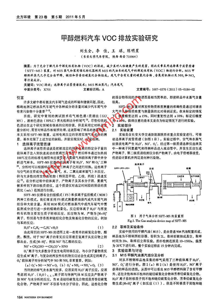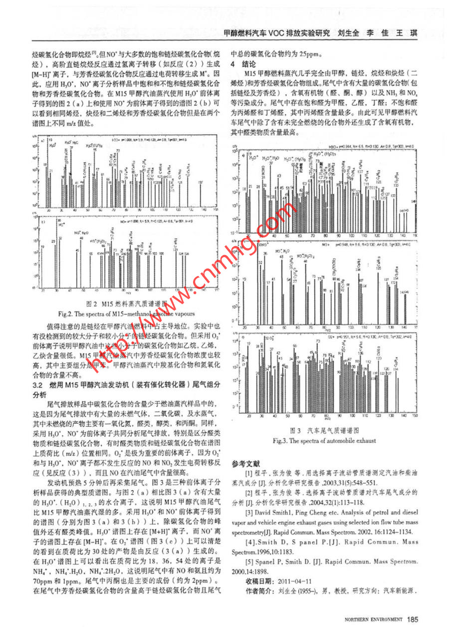 北方環(huán)境第23卷 第5期2011年5月甲醇燃料汽車VOC排放實驗研究劉生全,李佳,王琪,陳明星(長安大學(xué)汽車學(xué)院,陜西西安710064)摘要:為了充分了解汽車中揮發(fā)性有機(jī)物(VOC)的排放,減少其對人體健康產(chǎn)生的危害,因此文章采用選擇離子流管質(zhì)譜(SITT-MS)裝置,對M15蕎氣和裝有催化轉(zhuǎn)化器燃用M15的汽油車的尾氣中的揮發(fā)性有機(jī)(VOC)物進(jìn)行分析。M15甲醇燃料蒸汽幾乎完全由甲醇,鏈烴和芳香烴碳?xì)浠衔锝M成。尾氣中含有大量的碳?xì)浠衔?含氧有機(jī)物以及NH,和NO,等污染咸分。關(guān)鍵詞: Voc排放;選擇離子流管質(zhì)譜技術(shù); M15燃油蒸汽;汽車尾氣中圖分類號: X701文獻(xiàn)標(biāo)識碼: A文章編號: 1007-0370 (2011) 05- -0184-02引言的混合物得到的產(chǎn)物譜圖是相當(dāng)簡單的,即使樣品中水蒸氣含量許多文獻(xiàn)中都有提及汽車尾氣造成的環(huán)境和健康問題。因此,很高。精確地測定燃油及汽車尾氣中各種成分的含量對堿少汽車尾氣中SIFT-MS裝置對揮發(fā)性物質(zhì)濃度測量的準(zhǔn)確性是通過對清潔有害污染物十分重要1-20。大氣中幾種物質(zhì)濃度與測量值的比對得到證實。在未標(biāo)定的情況目前,研究中常用的測試技術(shù)有氣相色譜1質(zhì)譜法(CC下, 測量精度達(dá)到+15%,同時重復(fù)性達(dá)到+ 10%;標(biāo)定后精度MS),液柑色譜法( HPLC)熒光檢測法分析尾氣叫。盡管傳統(tǒng)的為+ 10%。值得注意的是本文是在為標(biāo)定情況下進(jìn)行的實驗。色譜法在這個研究領(lǐng)域有很高的應(yīng)用價值,但是采用它對樣品定2實驗部分量分析時,需要對樣品作濃縮預(yù)處理,這就影響了樣品的測量精度。2.1 實驗裝置本文采用SIFT-MS裝置,運(yùn)用電離反應(yīng)的原理實現(xiàn)氣體成份的測實驗是在長安大學(xué)交通新能源陜西省重點實驗室進(jìn)行,可移量,基本克服了上述方法的缺陷,并能實現(xiàn)實時、定量檢測。動選擇離子流管質(zhì)譜(如圖1示)。實驗過程中,空氣和水蒸氣1選擇離 子流管質(zhì)譜經(jīng)微波電離產(chǎn)生H,0", NO*,O2', 經(jīng)過第-級質(zhì)譜選擇儀選擇其選擇離子流管質(zhì)譜就是把被選定的用來電離的特定分子量的中一種離子同氨載 氣和待測樣品進(jìn)人流動管中,并發(fā)生反應(yīng)生成前體離子注人到快速流動的氦載氣流管中。然后樣本通過加熱到產(chǎn)物離子,第二級質(zhì)譜檢測儀分析產(chǎn)物離子,由電子倍增器接受,100C左右的標(biāo)準(zhǔn)毛細(xì)管和連接管進(jìn)入氮載氣和前體離子群中并分傳送給計算機(jī)并判定是何種污染物。析進(jìn)氣樣本。SIFT-MS 儀器的前體離子有H,0*', NO和O2'三種選擇離子4,分析時可以根據(jù)樣品特性在三種離子之間進(jìn)行切換。這些離子H30+.N0+,02+反座檢酬與空氣的主要成分(氮氣,氧氣,水,二氧化碳和氬氣)不反應(yīng),但與大多數(shù)的揮發(fā)性有機(jī)物(特別是甲烷,乙烷,丙烷)迅速反C規(guī)國電子節(jié)增師 I應(yīng)因。在分析過程中前體離子,產(chǎn)物離子及其水分子團(tuán),氦載氣被采樣到下游四極質(zhì)譜儀,這個質(zhì)譜儀對選定時間段的預(yù)設(shè)的質(zhì)荷比(m/z)范圍進(jìn)行掃描。SIFT-MS儀器有全掃描模式( FS)和多離子監(jiān)控模式( MIM )兩種工作模式。我們常采用FS模式測量燃油蒸汽或汽車尾氣的國11↓真空熏組份和大致含量。采用MIM模式對燃油蒸汽中或汽車尾氣中需監(jiān)測成分進(jìn)行進(jìn)一一步的精確的 量化。反應(yīng)前體離子H,0* 與揮發(fā)性有機(jī)物主要發(fā)生質(zhì)子轉(zhuǎn)移反應(yīng),反應(yīng)物為M,產(chǎn)物為[M+H]'圖1用于氣體分析 SIFT-MS的裝置圖離子,特別是與芳香族和鏈烴化合物及羧基化合物的反應(yīng)。例如Fig.1. The Gas analysis derice map of SIFT-MS與苯的反應(yīng):H,0* + CH。-→CH,* +H20(1)2.2 取樣及實驗條件由此得到的SIFT-MS的譜圖上有一些簡單的碳?xì)浠衔?,醛實驗中使用的甲醇汽? MI5),是由普通90#汽油配置而成,類,酮類。對于NO*離子的常見反應(yīng)原理是氫離子從反應(yīng)物上轉(zhuǎn)樣品池為不銹鋼圓柱容器,容積為2L.取樣前被抽成真空,取樣移出去,生成[M-H]",例如NO*與乙醛的反應(yīng):時間為20s,取樣后立即實驗。質(zhì)樸檢測范圍是10-150Da,溫度NO' +CH,CHO→CH,CO'+ HNO(2)為20C下進(jìn)行的,整個實驗過程在15分鐘內(nèi)完成。0;離子與鈦多數(shù)分子發(fā)生電荷轉(zhuǎn)移反應(yīng),與小分子量物質(zhì)反3 實驗結(jié)果 與討論應(yīng)生成M"離子,與復(fù)雜的揮發(fā)性有機(jī)物反應(yīng)還會生成其它的離子。3.1 M15 甲醇汽油蒸汽組分及分析0;前體離子對分析尾氣中NO和NH,非常重要,例如:對從不銹鋼樣品池采集的樣氣采用了三種前體離子H,0",(a)O*+NO→N0*+O2 (b) O2* +NH,→NH;*+02 (3)NO*, O2' 進(jìn)行分析。圖2(a)和2(b)是使用H0*, NO*離子當(dāng)待測的樣氣含水蒸氣較多,應(yīng)該采用H,0*離子反應(yīng)。應(yīng)該獲得的樣 品的譜圖。從圖中可以看出M15甲醇燃料除了含有甲醇考慮到H,0° . (H20)12,離子團(tuán)與待測氣體M反應(yīng)及產(chǎn)物離子外,還包含飽和和不飽和的鏈烴碳?xì)浠衔锖头枷銦N碳?xì)浠衔?。如MH*與水分析的反應(yīng)。當(dāng)M是鏈烴碳?xì)浠衔锘蚴欠枷銦N碳?xì)銱,0*離子易轉(zhuǎn)移質(zhì)子到不飽和鏈烴碳?xì)浠衔?,芳香烴碳?xì)浠匣衔?,產(c