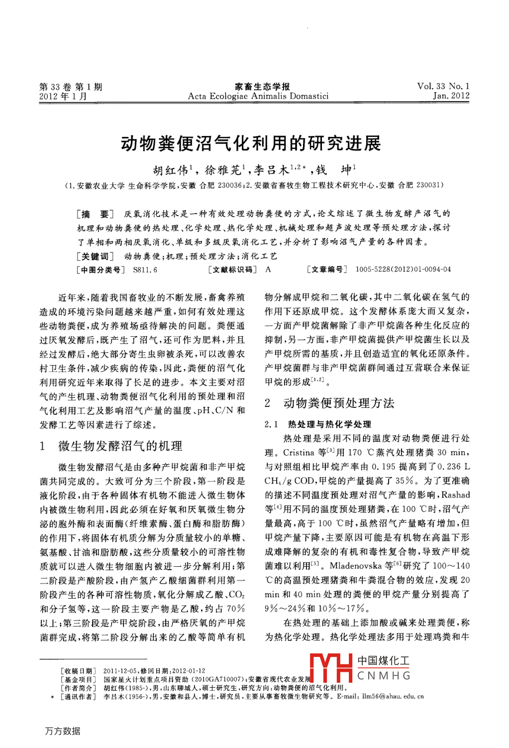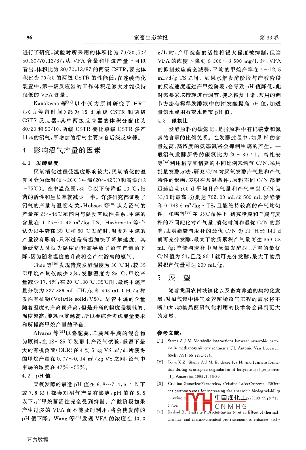 第33卷第1期家畜生態(tài)學(xué)報Vol 33 No. 12012年1月Acta Ecologiae Animalis DomasticiJan.2012動物糞便沼氣化利用的研究進展胡紅偉,徐雅芫1,李呂木12‘,錢坤1(1.安徽農(nóng)業(yè)大學(xué)生命科學(xué)學(xué)院,安徽合肥230036;2.安徽省畜牧生物工程技術(shù)研究中心,安徽合肥230031)[摘要]厭氧消化技術(shù)是一種有效處理動物糞便的方式,論文綜述了微生物發(fā)酵產(chǎn)沼氣的機理和動物糞便的熱處理、化學(xué)處理、熱化學(xué)處理、機械處理和超聲波處理等預(yù)處理方法,探討了單相和兩相厭氧消化、單級和多級厭氧消化工藝,并分析了影響沼氣產(chǎn)量的各種因素。關(guān)鍵詞]動物糞便;機理;預(yù)處理方法;消化工藝[中圖分類號]S811.6[文獻標(biāo)識碼]A文章編號]1005-5228(2012)01-0094-04近年來,隨著我國畜牧業(yè)的不斷發(fā)展,畜禽養(yǎng)殖物分解成甲烷和二氧化碳,其中二氧化碳在氫氣的造成的環(huán)境污染問題越來越嚴重,如何有效處理這作用下還原成甲烷。這個發(fā)酵體系龐大而又復(fù)雜,些動物糞便,成為養(yǎng)殖場亟待解決的問題。糞便通方面產(chǎn)甲烷菌解除了非產(chǎn)甲烷菌各種生化反應(yīng)的過厭氧發(fā)酵后,既產(chǎn)生了沼氣,還可作為肥料,并且抑制,另一方面,非產(chǎn)甲烷菌提供產(chǎn)甲烷菌生長以及經(jīng)過發(fā)酵后,絕大部分寄生蟲卵被殺死,可以改善農(nóng)產(chǎn)甲烷所需的基質(zhì),并且創(chuàng)造適宜的氧化還原條件村衛(wèi)生條件,減少疾病的傳染,因此,糞便的沼氣化產(chǎn)甲烷菌群與非產(chǎn)甲烷菌群間通過互營聯(lián)合來保證利用研究近年來取得了長足的進步。本文主要對沼甲烷的形成。氣的產(chǎn)生機理、動物糞便沼氣化利用的預(yù)處理和沼氣化利用工藝及影響沼氣產(chǎn)量的溫度、H、CN和2動物糞便預(yù)處理方法發(fā)酵工藝等因素進行了綜述2.1熱處理與熱化學(xué)處理1微生物發(fā)酵沼氣的機理熱處理是采用不同的溫度對動物糞便進行處理。 Cristina等3用170℃蒸汽處理豬糞30min,微生物發(fā)酵沼氣是由多種產(chǎn)甲烷菌和非產(chǎn)甲烷與對照組相比甲烷產(chǎn)率由0.195提高到了0.236L菌共同完成的。大致可分為三個階段,第一階段是CH4/gCOD,甲烷的產(chǎn)量提高了35%。為了更準確液化階段,由于各種固體有機物不能進入微生物體的描述不同溫度預(yù)處理對沼氣產(chǎn)量的影響, Rashad內(nèi)被微生物利用,因此必須在好氧和厭氧微生物分等用不同的溫度預(yù)處理豬糞,在100℃時,沼氣產(chǎn)泌的胞外酶和表面酶(纖維素酶、蛋白酶和脂肪酶)量最高,高于100℃時,雖然沼氣產(chǎn)量略有增加,但的作用下,將固體有機質(zhì)分解為分質(zhì)量較小的單糖、甲烷產(chǎn)量下降,主要原因可能是有機物在高溫下形氨基酸、甘油和脂肪酸,這些分質(zhì)量較小的可溶性物成難降解的復(fù)雜的有機和毒性復(fù)合物,導(dǎo)致產(chǎn)甲烷質(zhì)就可以進入微生物細胞內(nèi)被進一步分解利用;第菌難以利用。 Mladenovska等61研究了100~140二階段是產(chǎn)酸階段,由產(chǎn)氫產(chǎn)乙酸細菌群利用第一C的高溫預(yù)處理豬糞和牛糞混合物的效應(yīng),發(fā)現(xiàn)20階段產(chǎn)生的各種可溶性物質(zhì),氧化分解成乙酸、CO2mn和40min處理的糞便的甲烷產(chǎn)量分別提高了和分子氫等,這一階段主要產(chǎn)物是乙酸,約占70%9%~24%和10%~17%。以上;第三階段是產(chǎn)甲烷階段,由嚴格厭氧的產(chǎn)甲烷在熱處理的基礎(chǔ)上添加酸或堿來處理糞便,稱菌群完成,將第二階段分解出來的乙酸等簡單有機為熱化學(xué)處理。熱化學(xué)處理法多用于處理雞糞和牛H中國煤化工[收稿日期]2011-1205,修回日期:201201-12基金項目]國家星火計劃重點項目資助(2010GA710007);安徽省現(xiàn)代農(nóng)業(yè)發(fā)CNMHG[作者簡介]胡紅偉(1985-),男,山東聊城人,碩士研究生,研究方向:動物糞便的沼氣化利用*[通訊作者]李呂木(1956-),男,安徽和縣人,博士,研究員,主要從事畜牧微生物研究等。E-mail:llm6@ahau.edu.cn第1期胡紅偉,等:動物糞便沼氣化利用的研究進展糞,試劑主要有NaOH、H2SO4和NH4OH等。異,在單相厭氧裝置中不能發(fā)揮兩大菌群的作用,而Salve等η分別研究了熱處理和熱化學(xué)處理的方法將產(chǎn)酸與產(chǎn)甲烷分離的兩相工藝,使得兩種菌群在對豬糞產(chǎn)沼氣的影響,試驗證實,溫度越高,產(chǎn)甲烷兩個不同的裝置中,各自在最適的環(huán)境下生長,能顯能力越強,在190℃時產(chǎn)甲烷量最高(149mL/g著提高活性COD)。 Bougrier等8的研究用熱處理法處理污泥Maritza等4采用兩相厭氧消工藝對城市固體時也在190℃獲得最高的甲烷產(chǎn)量,這顯然與廢物和牛糞進行了混合消化,在固體相(產(chǎn)酸相)中,Rashad等研究結(jié)果不同,原因尚待進一步驗證。利用產(chǎn)酸菌將牛糞與固體廢物酸化產(chǎn)生VFA,然后2.2化學(xué)處理泵入由UAF(升流式厭氧生物濾床)反應(yīng)器組成的對動物糞便進行化學(xué)處理,主要利用加酸和加產(chǎn)甲烷相中,最終所得的沼氣中甲烷含量在72.3%堿來處理。用硫酸預(yù)處理牛糞是一個很有效的方~73.1%,而單相工藝甲烷的含量在40%~60%。式,硫酸可以使纖維素類物質(zhì)很容易的釋放單糖在進行兩相發(fā)酵時,首先要進行相的分離,方法些學(xué)者指出,向糞便里添加PAM(聚丙烯酰胺)能目前主要有化學(