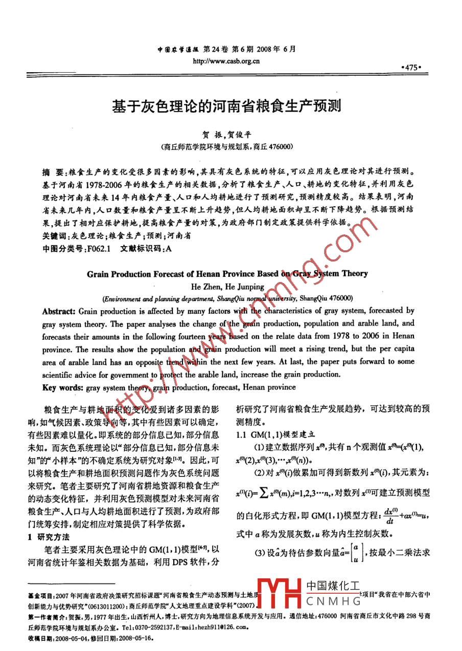 中國農(nóng)學(xué)通報第24卷第6期2008年6月htp://ww.casb.org.cn基于灰色理論的河南省糧食生產(chǎn)預(yù)測賀振,賀俊平(商丘師范學(xué)院環(huán)境與規(guī)劃系,商丘476000)摘要:糧食生產(chǎn)的變化受很多因素的影響,其具有灰色系統(tǒng)的特征,可以應(yīng)用灰色理論對其進行預(yù)測。基于河南省1978-2006 年的糧食生產(chǎn)的相關(guān)數(shù)據(jù),分析了糧食生產(chǎn)、人口、耕地的變化特征,并利用灰色理論對河南省未來14年內(nèi)糧食產(chǎn)量、人口和人均耕地進行了預(yù)測研究,預(yù)測精度較高。結(jié)果表明,河南省未來幾年內(nèi),人口數(shù)量和糧食產(chǎn)量呈不斷上升趨勢,但人均耕地面積卻呈不斷下降趨勢。根據(jù)預(yù)測結(jié)果,提出了相對應(yīng)保護耕地,提高糧食產(chǎn)量的對策,為政府部門制定政策提供科學(xué)依據(jù)。關(guān)鍵詞:灰色理論;糧食生產(chǎn);預(yù)測;河南省中圖分類號:F062.1文獻標(biāo)識碼:AGrain Production Forecast of Henan Province Based on Gray System TheoryHe Zhen, He Junping(Enwironment and panning department, ShangQiu normal uiersiy, ShangQiu 476000Abstract: Grain production is affected by many factors with the characteristics of gray system, forecasted bygray system theory. The paper analyses the change of the grain production, population and arable land, andforecasts their amounts in the fllowing fouteen years based on the relate data from 1978 to 2006 in Henanprovince. The results show the population and grain production will meet a rising trend, but the per capitaarea of arable land has an opposite trend within the next few years. At last, the paper puts forward to somescientifie advice for govermment to protect the arable land, increase the grain production.Key words: gray eystem theory, grain production, forecast, Henan province糧食生產(chǎn)與耕地面積的變化愛到諸多因素的影析研究了河南省糧食生產(chǎn)發(fā)展趨勢,可達到較高的預(yù)響,如氣候因素、政策導(dǎo)向等,其中有些因素可以確定,測精度。有些因素難以量化。即系統(tǒng)的部分信息已知,部分信息1.1 GM(1,1)模型建立未知。而灰色系統(tǒng)理論以“部分信息已知,部分信息未(1)建立數(shù)據(jù)序列如,共有n個觀測值x=(x%(1),知”的“小樣本”的不確定系統(tǒng)為研究對象叫。因此,可x02(),3(),.,.(x)).以將糧食生產(chǎn)和耕地面積預(yù)測問題作為灰色系統(tǒng)問題(2)對xO()做累加可得到新數(shù)列x(i),其元素為:來研究。筆者主要研究了河南省耕地資源和糧食生產(chǎn)x()= M=mMm,12,3..-n,對數(shù)列呵建立預(yù)測模型的動態(tài)變化特征,并利用灰色預(yù)測模型對未來河南省糧食生產(chǎn)、人口與人均耕地面積進行了預(yù)測,為政府部的白化形式方程,即GM(1, 1)模型方程: d." +ax:=u,門統(tǒng)籌安排,制定相應(yīng)對策提供了科學(xué)依據(jù)?!眃t1研究方法式中a稱為發(fā)展灰數(shù),u稱為內(nèi)生控制灰數(shù)。筆者主要采用灰色理論中的GM(1, 1)模型45,以(3)設(shè)a為待估參數(shù)向量a=“,按最小二乘法求河南省統(tǒng)計年鑒相關(guān)數(shù)據(jù)為基礎(chǔ),利用DPS軟件,分lu」基金項目:2007年河南省政府決策研究招標(biāo)課趣“河南省糧食生產(chǎn)動態(tài)預(yù)測與土地質(zhì)中國煤化工項目“我省在中部六省中創(chuàng)新能力與優(yōu)勢研究0613011200);商丘師范學(xué)院人文地理重點建設(shè)學(xué)科"(2007):MYHCNMHG第一作者簡介:賀振,男, 1977年出生,山西忻州人,博士,研究方向為地理信息系統(tǒng)開發(fā)與應(yīng)用。通信地址:46000河南省商丘市文化中路298號商丘師范學(xué)院環(huán)境與規(guī)劃系辦公室. Tel:0370 -2592137,E mail:hezh9110126. com.收稿日期: 2008-05-04,修回日期:2008-05-16..Chinese Agricultural Science Bulletin Vol.24 No. 6 2008 Junehttp://www.casb.org.cn●476*解,得a=(B'B)"BY,式中:(4)對GM(1, 1)模型方程求解,得到其對應(yīng)的時間響應(yīng)函數(shù),即為CM(1, 1)預(yù)測模型的解: .一(x"2)+x:"(3)) 10(+1)=( *(1)-告}e*+些B=|立(*"(2)+:() 11.2模型精度檢驗指標(biāo)為了評定預(yù)測模型的精度,應(yīng)進行后驗差C及小- (*(2)+>x"(3) 1誤差概率P的檢驗。外推性好的預(yù)測,要求C值小,表明預(yù)測誤差離散程度小,且P值必須大,即預(yù)測誤差小的概率大,預(yù)測精度高。由概率統(tǒng)計方法將預(yù)測精度檢表1預(yù)測精度等級對照表預(yù)測精度等級好合格勉強不合格>0. 95>0.85>0.70≤0.?70《0.35<0. 45<0.50≥0.65驗分成4個等級,(見表1)。hm?,年均遞減0.29%。第2階段主要表現(xiàn)為耕地面積2河南省糧食生產(chǎn)與耕地資源動態(tài)變化特征增加階段(1997-2002 年)。這一階段耕地面積增加2.1耕地資源動態(tài)變化特征489.4千hm?,年均增長率為1.41%。第3階段主要表河南省自1978年以來,耕地面積總體呈現(xiàn)階段性現(xiàn)為耕地面積減少階段(2002-2004 年)。這一時間耕變化(見圖1).第1階段主要表現(xiàn)為耕地面積減少階地面積減少85.3千hm2,年均遞減0.59%。第4階段主段(1978- -1997 年)。這一時期耕地面積凈減383.9千要表現(xiàn)為耕地面積增長階段(2004-2006年)。 這一階11000一-人口+耕地面積-+人均耕地面積0.110.110000.0.099000.........0.08 380000.07的只富70000 m0.05¥60000.0450000.03時間圖1河南省1978 2006年耕地面積、人口、人均耕地面積變化段耕地面積增加24.9千hm?,年均增長0.17%。1.48%。第2階段主要表現(xiàn)為人均耕地面積增長階段2.2人均耕地動態(tài)