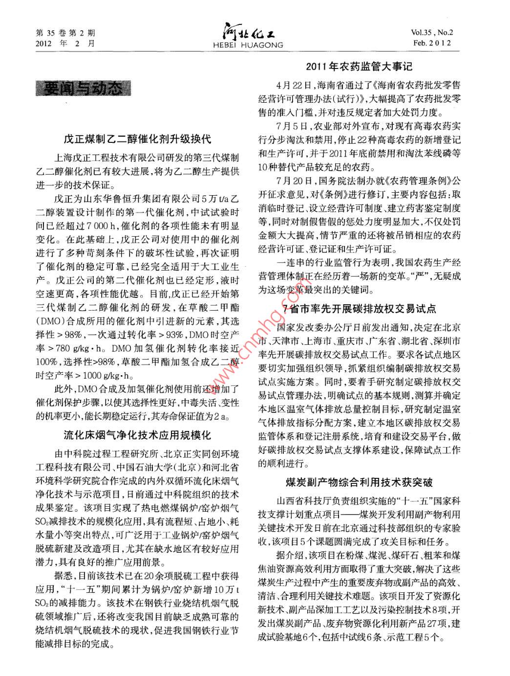 第35卷第2期的化王Vol, 35. No. 22012年2月HEBEI HUAGONGFeb.20122011年農(nóng)藥監(jiān)管大事記要有動態(tài)4月22日,海南省通過了《海南省農(nóng)藥批發(fā)零售經(jīng)營許可管理辦法(試行)》,大幅提高了農(nóng)藥批發(fā)零售的準(zhǔn)入門檻,并對違反規(guī)定者加大處罰力度。7月5日,農(nóng)業(yè)部對外宣布,對現(xiàn)有高毒農(nóng)藥實戊正煤制乙二醇催化劑升級換代行分步淘汰和禁用,停止22種高毒農(nóng)藥的新增登記上海戊正工程技術(shù)有限公司研發(fā)的第三代煤制和生產(chǎn)許可,并于2011年底前禁用和淘汰苯線磷等乙二醇催化劑已有較大進(jìn)展將為乙二醇生產(chǎn)提供10種替代產(chǎn)品較充足的農(nóng)藥進(jìn)一步的技術(shù)保證。7月20日,國務(wù)院法制辦就《農(nóng)藥管理條例》公戊正為山東華魯恒升集團(tuán)有限公司5萬ta乙開征求意見,對《條例》進(jìn)行修訂,主要內(nèi)容包括:取二醇裝置設(shè)計制作的第一代催化劑,中試試驗時消臨時登記、設(shè)立經(jīng)營許可制度建立藥害鑒定制度間已經(jīng)超過700,催化劑的各項性能未有明顯等,同時對制假售假的懲處力度明顯加大,不僅處罰變化。在此基礎(chǔ)上,戊正公司對使用中的催化劑金額大大提高情節(jié)嚴(yán)重的還將被吊銷相應(yīng)的農(nóng)藥進(jìn)行了多種苛刻條件下的破壞性試驗,再次證明經(jīng)營許可證、登記證和生產(chǎn)許可證。了催化劑的穩(wěn)定可靠,已經(jīng)完全適用于大工業(yè)生連串的行業(yè)監(jiān)管行為表明,我國農(nóng)藥生產(chǎn)經(jīng)產(chǎn)。戊正公司的第二代催化劑也已經(jīng)定形,液時營管理體制正在經(jīng)歷著一場新的變革。嚴(yán)”,無疑成空速更高,各項性能優(yōu)越。目前,戊正已經(jīng)開始第為這場變革最突出的關(guān)鍵詞三代煤制乙二醇催化劑的研發(fā),在草酸二甲酯7省市率先開展碳排放權(quán)交易試點(DMO)合成所用的催化劑中引進(jìn)新的元素,其選擇性>98%,一次通過轉(zhuǎn)化率>93%,DMO時空產(chǎn)國家發(fā)改委辦公廳日前發(fā)出通知,決定在北京市、天津市、上海市、重慶市、廣東省、湖北省、深圳市率>780g/kg·h。DMO加氫催化劑轉(zhuǎn)化率接近率先開展碳排放權(quán)交易試點工作。要求各試點地區(qū)100%,選擇性>98%,草酸二甲酯加氫合成乙二醇時空產(chǎn)率>1000g/kgh要切實加強組織領(lǐng)導(dǎo),抓緊組織編制碳排放權(quán)交易此外,DMO合成及加氫催化劑使用前還增加了試點實施方案。同時,要著手研究制定碳排放權(quán)交催化劑保護(hù)步驟,以使其選擇性更好,中毒失活變性易試點管理辦法,明確試點的基本規(guī)則,測算并確定本地區(qū)溫室氣體排放總量控制目標(biāo),研究制定溫室的機(jī)率更小,能長期穩(wěn)定運行,其壽命保證值為2a。氣體排放指標(biāo)分配方案,建立本地區(qū)碳排放權(quán)交易流化床煙氣凈化技術(shù)應(yīng)用規(guī)?;O(jiān)管體系和登記注冊系統(tǒng),培育和建設(shè)交易平臺,做由中科院過程工程研究所、北京正實同創(chuàng)環(huán)境好碳排放權(quán)交易試點支撐體系建設(shè),保障試點工作工程科技有限公司中國石油大學(xué)(北京)和河北省的順利進(jìn)行。環(huán)境科學(xué)研究院合作完成的內(nèi)外雙循環(huán)流化床煙氣煤炭副產(chǎn)物綜合利用技術(shù)獲突破凈化技術(shù)與示范項目,日前通過中科院組織的技術(shù)山西省科技廳負(fù)責(zé)組織實施的“十一五”國家科成果鑒定。該項目實現(xiàn)了熱電燃煤鍋爐爐煙氣技支撐計劃重點項目—煤炭開發(fā)利用副產(chǎn)物利用SO2減排技術(shù)的規(guī)?;瘧?yīng)用,具有流程短、占地小耗水量小等突出特點,可廣泛用于工業(yè)鍋爐窯爐煙氣關(guān)鍵技術(shù)開發(fā)日前在北京通過科技部組織的專家驗脫硫新建及改造項目,尤其在缺水地區(qū)有較好應(yīng)用收,該項目5個課題圓滿完成了攻關(guān)目標(biāo)和任務(wù)。潛力,具有良好的推廣應(yīng)用前景。據(jù)介紹,該項目在粉煤、煤泥、煤矸石、粗苯和煤據(jù)悉,目前該技術(shù)已在20余項脫硫工程中獲得焦油資源高效利用方面取得了重大突破解決了這些應(yīng)用,“十一五”期間累計為鍋爐爐新增10萬煤炭生產(chǎn)過程中產(chǎn)生的重要廢棄物或副產(chǎn)品的高效SO的減排能力。該技術(shù)在鋼鐵行業(yè)燒結(jié)機(jī)煙氣脫清潔、合理利用關(guān)鍵技術(shù)難題。該項目開發(fā)了資源化硫領(lǐng)域推廣后,還將改變我國目前缺乏成熟可靠的新技術(shù)、副產(chǎn)品深加工工藝以及污染控制技術(shù)8項,開燒結(jié)機(jī)煙氣脫硫技術(shù)的現(xiàn)狀,促進(jìn)我國鋼鐵行業(yè)節(jié)發(fā)出煤炭副產(chǎn)品、廢棄物資源化利用新產(chǎn)品27項,建能減排目標(biāo)的完成。成試驗基地6個包括中試線6條、示范工程5個