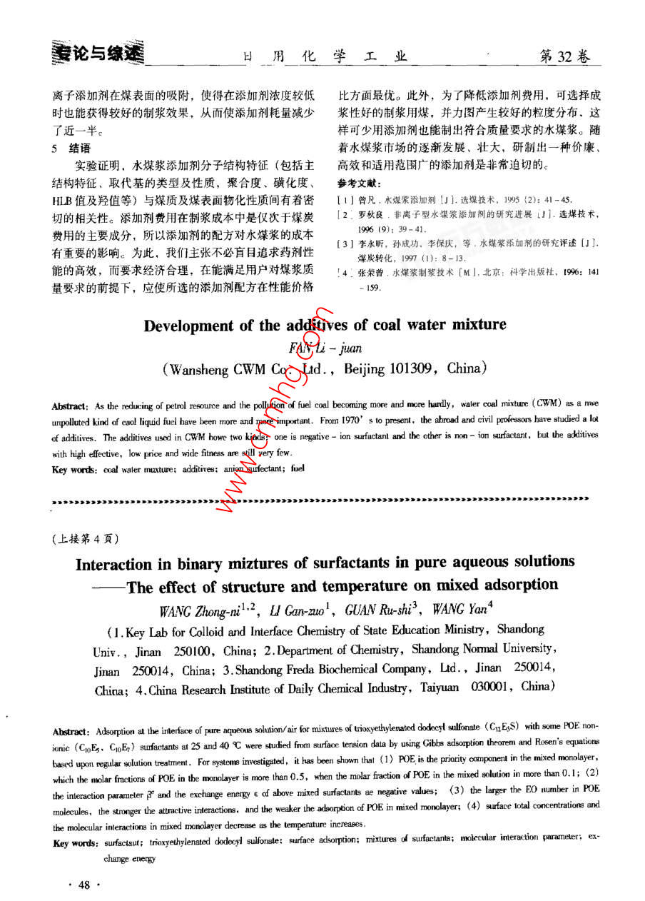 第32卷第1日用化學(xué)工業(yè)China Surfactant Detergent Cosmetics水煤漿添加劑的研究進(jìn)展范麗娟(北京萬盛木煤漿有限責(zé)任公司,北京101309)摘要:隨著世界原油資源的日漸減少及燃煤污染的日趨嚴(yán)重,水煤漿作為一種新型的環(huán)保型煤基流體燃料日益受到人們的重視。從70年代至今,國(guó)內(nèi)外學(xué)者研究過多種添加劑,目前制漿用添加劑主要分為陰離子表面活性劑和非離子表面活性劑兩大類,但高效,價(jià)廉、適用性廣的添加劑為數(shù)并不多關(guān)鍵詞:水煤漿;添加劑;陰離子表面活性劑;非離子表面活性劑;燃料中圖分類號(hào):TQ423.2文獻(xiàn)標(biāo)識(shí)碼:A文章編號(hào):1001-1803(2002)01-006-03水煤漿( Coal Water mixture,簡(jiǎn)稱CWM)是一種國(guó)際價(jià)格比為1:2:3:4,我國(guó)非離子型添加劑的價(jià)格新型的煤基流體燃料,是由大約70%的煤、30%的比這個(gè)比例還高。所以制漿添加劑多選擇陰離子表面水和少量(通常約占煤量的0.5%~1.0%左右)的活性劑。分散劑的作用發(fā)生在煤水界面,因此它的效化學(xué)添加劑制備而成的固液分散體系,屬熱力學(xué)不穩(wěn)能與煤炭性質(zhì)特別是煤炭的表面性質(zhì)及水的性質(zhì)都有定體系。具有實(shí)用要求的高質(zhì)量水煤漿應(yīng)具備高濃密切的關(guān)系。所以制漿用化學(xué)添加劑配方不可能是度、低黏度、良好的流動(dòng)性及穩(wěn)定性,為達(dá)此目的,成不變的。合理的添加劑配方必須根據(jù)制漿用煤的性在煤水混合物中加入適量的化學(xué)添加劑是非常重要質(zhì)和用戶對(duì)水煤漿產(chǎn)品質(zhì)量的需求,經(jīng)過實(shí)驗(yàn)研究后的方可確定。從70年代至今,國(guó)內(nèi)外學(xué)者研究過多種制漿時(shí)所用添加劑,按其功能不同,有分散劑、添加劑,目前制漿用添加劑主要分為陰離子表面活性穩(wěn)定劑及其他一些輔助化學(xué)藥劑,如消泡劑、pH調(diào)劑和非離子表面活性劑兩大類,但高效、價(jià)廉、適用節(jié)劑、防霉劑、表面改性劑及促進(jìn)劑等多種。在這些性廣的添加劑為數(shù)并不多??偟臍w納起來,到目前國(guó)添加劑中,不可缺少的是分散劑與穩(wěn)定劑。受水煤漿內(nèi)外研制及篩選的水煤漿添加劑分為以下幾種類型市場(chǎng)的影響,國(guó)內(nèi)水煤漿添加劑的研究、發(fā)展比較緩1.1陰離子型的水煤漿分散劑1慢。目前,水煤漿添加劑主要以萘系列、腐殖酸系(1)聚烯烴系列如:馬來酸與各類環(huán)戊二烯的列、木質(zhì)素系列、丙烯酸系列以及相關(guān)復(fù)合型添加劑聚合物鈉鹽,聚環(huán)烯磺酸鹽,聚二烯磺酸鹽,聚苯乙為主,其中應(yīng)用比較廣泛的為萘系列水煤漿添加劑;烯磺酸鹽,異丁烯和順丁烯二酸酐聚合物鈉鹽等。此對(duì)于蔡系列添加劑的研究、應(yīng)用已達(dá)到較高水平;其種分散劑的用量一般為煤重的0.5%左右,其中聚苯成本相對(duì)國(guó)外同類產(chǎn)品較低。雖然我國(guó)已對(duì)水煤漿添乙烯磺酸鹽(PS),比萘磺酸鹽甲醛縮合物更優(yōu)越。加劑進(jìn)行了較多的研究,但仍存在所適用煤種范圍對(duì)低灰CWM同時(shí)具有良好的減黏以及穩(wěn)定作用。前窄、成本較高等問題。者隨相對(duì)分子質(zhì)量增加而減弱,后者則反之。因此1分散劑通過控制相對(duì)分子質(zhì)量可以同時(shí)兼顧C(jī)WM的流變性分散劑的作用在于提高煤粒表面的親水性,增加和穩(wěn)定性,甚至可以免去穩(wěn)定劑的加入。這是高聚物煤粒表面的動(dòng)電位,使煤粒在水中能更好的潤(rùn)濕并均分散劑的主要優(yōu)點(diǎn)之勻的分散于水中,防止煤粒間相互聚集,從而提高煤2)聚丙烯酸酯系列如:丙烯酸與苯乙烯聚合漿濃度,降低煤漿黏度,增加煤漿流動(dòng)性。水煤漿分物鈉鹽、丙烯酸與丙烯酰胺共聚物鈉鹽和聚丙烯磺酸散劑都是一些表面活性劑,溶于水后,按離解與不離鹽等。解可分為離子型與非離子型兩大類。按價(jià)格,陰離子(3)木質(zhì)素磺酸鹽此類分散劑主要來自造紙廢型最便宜,它與非離子、陽離子及兩性表面活性劑的液再加工,其最大優(yōu)點(diǎn)是原料豐富,易于加工,價(jià)格收稿日期:200-10-16;修回日期:2001-01-19作者簡(jiǎn)介:范娟(1972-),女,北京,199年攻讀北京化工大學(xué)碩士學(xué)位,聯(lián)系電話:(0o)61291452第1期范麗娟:水煤漿添加劑的研究進(jìn)展專論與練遽便宜,而且漿的穩(wěn)定性好。一般用量為干煤的1%~(2)高分子有機(jī)化合物大多數(shù)是有機(jī)多糖類高2%。缺點(diǎn)是雜質(zhì)含量大,因此,除易制漿的煤種分子聚合物,如:Guar膠、 Xanthan膠、黃膠、阿拉外,通常都不能單獨(dú)應(yīng)用。伯膠、半乳糖醛酸、羥乙基纖維素、聚丙烯酰胺絮凝(4)腐殖酸鹽及磺化腐殖酸鹽系列大量實(shí)驗(yàn)證劑、羧甲基纖維素(CMC),以及一些微細(xì)膠體粒子明、越年輕的原料煤,其產(chǎn)物的降黏效果越好。這是(如有機(jī)膨潤(rùn)土)等。高聚物的特點(diǎn)是線性長(zhǎng)度長(zhǎng)因?yàn)樵侥贻p的原料煤,含活性基團(tuán)豐富。-COOH、而且每個(gè)分子都有許多極性基團(tuán),通過氫鍵或其他鍵H、-0-等,有利于進(jìn)行化學(xué)反應(yīng),同時(shí)年輕煤合作用(如共價(jià)鍵),在煤粒間架橋,形成結(jié)構(gòu)。結(jié)基本結(jié)構(gòu)單元相對(duì)分子質(zhì)量小,有利于起分散減黏作構(g
