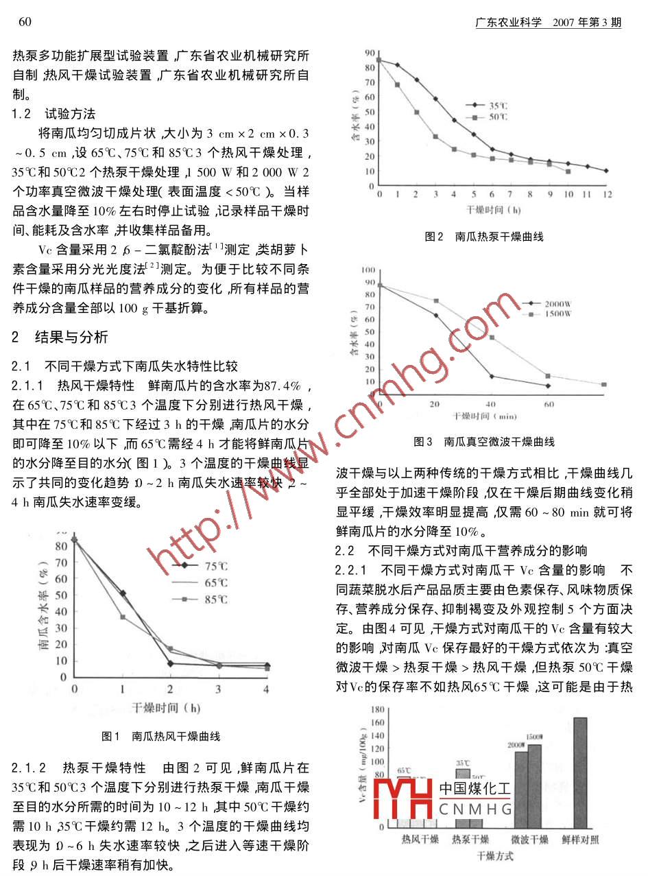 廣東農(nóng)業(yè)科學(xué)2007年第3期南瓜的干制工藝研究鄒宇曉,徐玉娟,廖森泰,張雁,唐道邦,劉銀成(1.廣東省農(nóng)科院蠶業(yè)與農(nóng)產(chǎn)品加工研究所/廣東省農(nóng)產(chǎn)品加工公共實驗室,廣東廣州5106102.華南農(nóng)業(yè)大學(xué)食品學(xué)院,廣東廣州510642)摘要利用熱風(fēng)干燥、熱泵干燥和真空微波干燥3種干燥方式對南瓜的干制工藝進(jìn)行了研究缐合考查干燥效率.干燥特性及南瓜干的Vc和類胡蘿卜素等代表性營養(yǎng)成分的含量結(jié)果表明真空微波干燥技術(shù)干制效率高產(chǎn)品外觀質(zhì)量好而且能最大限度地保持南瓜中的Vc和類胡蘿卜素含量關(guān)鍵詞南瓜;熱風(fēng)干燥;熱泵干燥;真空微波干燥中圖分類號S642.1;TS255.36文獻(xiàn)標(biāo)識碼:文章編號1004-874X(200703-0059-02南瓜( Cucurbit moschata duch.)為葫蘆科南瓜屬南瓜具有很高的深加工開發(fā)價值。目前國內(nèi)較常見的的一年生蔓性草本植物又名金瓜、飯瓜等。南瓜營養(yǎng)干燥方式有熱風(fēng)干燥、熱泵干燥、真空微波干燥、價值很高除含有瓜氨酸、精氨酸等多種游離氨基酸及真空冷凍干燥和遠(yuǎn)紅外干燥。本文選用熱風(fēng)干燥、熱類胡蘿卜素、Vb、Ⅴe、Ve、脂眆、葡萄糖、戊聚糖、甘露泵干燥和真空微波干燥技術(shù)對南瓜進(jìn)行干燥處理通醇、鐵、鎂、鈣、磷、鋅、銅、硅、硒外還含有大量南瓜籽過對干燥后南瓜干中V和類胡蘿卜素兩種代表性營堿、生物堿、葫蘆巴堿和果膠等生理活性物質(zhì)這些物養(yǎng)成分的比較選擇南瓜的最佳干燥方式以期為其下質(zhì)能催化分解致癌物質(zhì)亞硝銨加快腎結(jié)石、膀朧結(jié)石游加工產(chǎn)品的開發(fā)奠定基礎(chǔ)。的溶解幫助消除人體內(nèi)多余的膽固醇可預(yù)防并治療1材料與方法動脈硬化增強肝、腎功能的再生能力有保肝強腎之1.1試驗材料功效。因此南瓜具有防治糖尿病、癌癥、高血壓、動脈新鮮南瓜市售??箟难釣閺V州化學(xué)試劑廠產(chǎn)粥硬化、肥胖癥、胃潰瘍等多種疾病的功效。品26-二氯靛酚吲哚酚鈉鹽為 Sigma公司產(chǎn)品草收稿日期2006-12-20酸、氯仿和甲醇等試劑均為分析純。FA/IA型電子天基金項目東省農(nóng)業(yè)攻關(guān)重大專項2003A2030501)平止上海精密科學(xué)儀器有限公司產(chǎn)品V-1700紫外作者簡介鄒宇曉1973-)女預(yù)碩士副研究員E-mal:分光光度計,島津儀器(蘇州)有限公司產(chǎn)品;真空微yuxiaozou@126.com波干燥試驗裝置南京三樂微波技術(shù)發(fā)展有限公司產(chǎn)品;ewww當(dāng)條件所限本試驗未在此方面作進(jìn)一步研究而在室溫高效的目的最佳乳糖濃度還有待進(jìn)一步研究。相同的條件下不同批次的材料所提取的乳糖酶的活參考文獻(xiàn)力也表現(xiàn)出較大的差異。根據(jù)試驗中觀察到的現(xiàn)象,[1王敏檀建新張偉簿乳糖酶的應(yīng)用及發(fā)展現(xiàn)狀J食作者認(rèn)為乳糖酶的活力可能與種子的生命活動有關(guān)品與發(fā)酵工業(yè)芽長出前給予種子水分后其體內(nèi)進(jìn)行旺盛的生長代[2]湯鳳霞葛志軍喬長晟低乳糖乳制品的生產(chǎn)研究和應(yīng)謝需要將乳糖轉(zhuǎn)變成半乳糖和葡萄糖所以乳糖酶活瓶J]寧夏農(nóng)學(xué)院學(xué)報20002(4)79-82力在種子萌芽初期較高芽長岀后由于消耗了大量乳?[3]張紅艷劉成更趙文娟等.乳糖酶的酶學(xué)特性及其研究糖酶活力也隨著下降因此芽越短乳糖酶活力越進(jìn)J]食品研究與開發(fā)20042X6)34-36.高芽越長酶活力越低。[4]王莜蘭王白楊蔡友良.固定化酶連續(xù)生產(chǎn)半乳糖寡糖3.3由于乳糖酶是一種誘導(dǎo)酶在紅豆、綠豆萌發(fā)過V凵中國煤化工00X87-90程中加入一定濃度的乳糖溶液可以促進(jìn)乳糖酶的轉(zhuǎn)[5]韓CNMH④-半乳糖苷酶固定化及飪質(zhì)餅乳丁」日科字字掖2001A3(1)59-61化提高酶活力。雖然添加乳糖后可提高酶活力但比[6] Bradford M. A rapid and sensitive method for the quantita活力會降低成本增加而且添加了乳糖的紅豆、綠豆tion of microgram quantities of protein utilizing the principle在培養(yǎng)過程中較易發(fā)霉因此應(yīng)該慎重使用。本次試of protein-dye binding J ] Analytical Biochemistry 1976驗采用的乳糖溶液的濃度為0.1mol/L為了達(dá)到經(jīng)濟(jì)(72)248-25廣東農(nóng)業(yè)科學(xué)2007年第3期熱泵多功能擴(kuò)展型試驗裝置廣東省農(nóng)業(yè)機械研究所自制熱風(fēng)干燥試驗裝置廣東省農(nóng)業(yè)機械研究所自70制1.2試驗方法35℃將南瓜均勻切成片狀大小為3cm×2cm×0.30.5cm,設(shè)65℃、75℃和85℃3個熱風(fēng)干燥處理,35℃和50℃2個熱泵干燥處理,500W和2000W2個功率真空微波干燥處理(表面溫度<50℃)當(dāng)樣0123456789101112品含水量降至10%左右時停止試驗,記錄樣品干燥時干燥時問(b)間、能耗及含水率并收集樣品備用。圖2南瓜熱泵干燥曲線c含量采用26-二氯靛酚法1測定類胡蘿卜素含量采用分光光度法2測定。為便于比較不同條100件干燥的南瓜樣品的營養(yǎng)成分的變化所有樣品的營養(yǎng)成分含量全部以100g干基折算。200011500W這602結(jié)果與分析2.1不同干燥方式下南瓜失水特性比較202.1.1熱風(fēng)干燥特性鮮南瓜片的含水率為87.4%,在65℃、75℃和85℃3個溫度下分別進(jìn)行熱風(fēng)干燥,其中在75℃和85℃下經(jīng)過3h的干燥南瓜片的水分干燥時間(m即可降