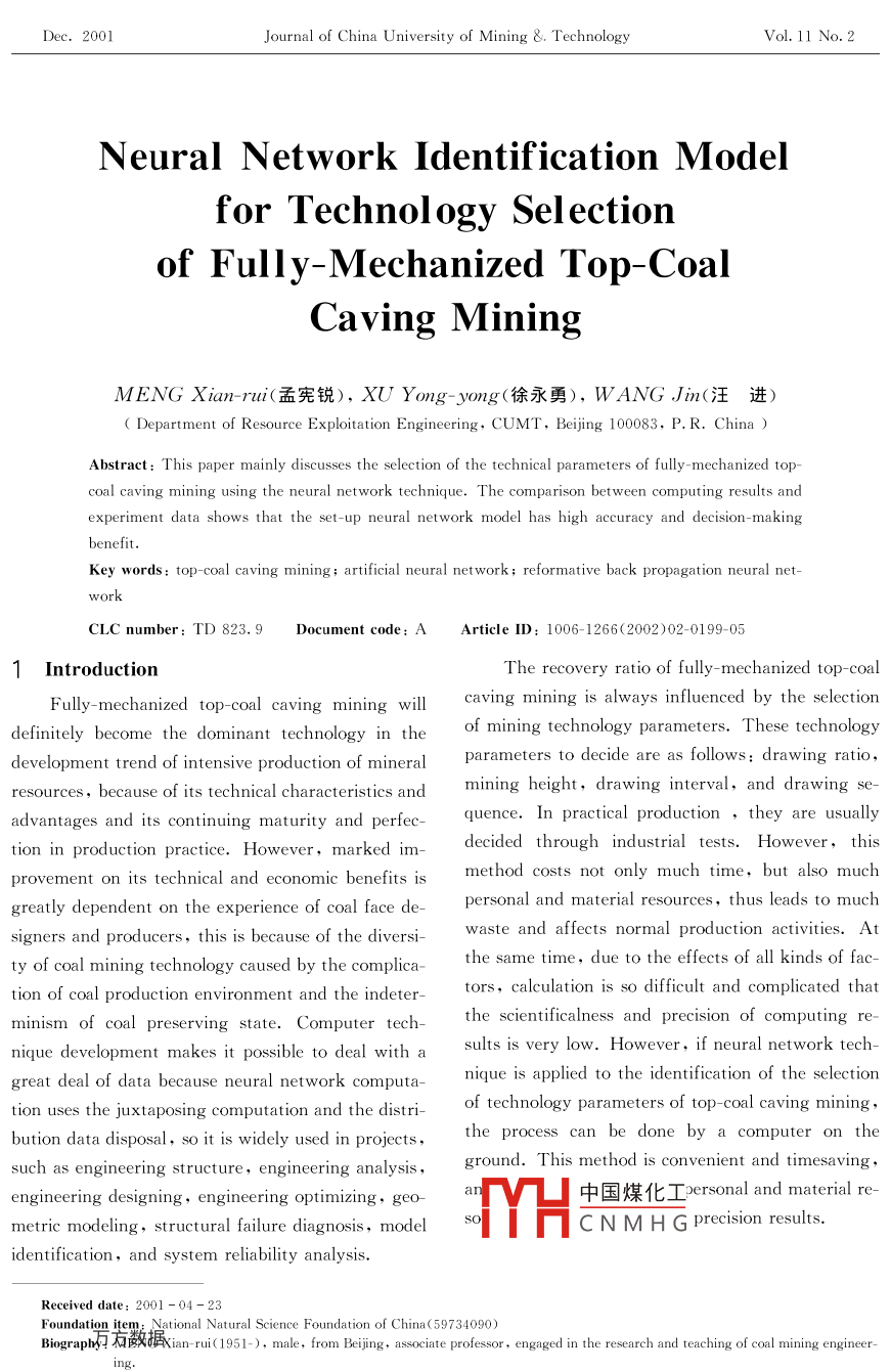 Dec.2001Journal of China University of Mining & TechnologVol 11 No. 2Neural network dentification modelfor Technology Selectionof Fully-Mechanized Top-CoalCaving miningMENG Xian-rui(孟憲銳), XU Yong-ymug(徐永勇), WANG Jin(汪進(jìn))Department of Resource Exploitation Engineering, CUMT, Beijing 100083, P.R. ChinaAbstract: This paper mainly discusses the selection of the technical parameters of fully-mechanized top-coal caving mining using the neural network technique. The comparison between computing results andexperiment data shows that the set-up neural network model has high accuracy and decision-makingKey words top-coal caving mining; artificial neural network; reformative back propagation neural net-CLC number: TD 823. 9 Document code:a Article ID: 1006-1266(2002)02-0199-051 IntroductionThe recovery ratio of fully-mechanized top-coalFully-mechanized top-coal caving mining will caving mining is always influenced by the selectiondefinitely become the dominant technology in theof mining technology parameters. These technologydevelopment trend of intensive production of mineralrs to decide are as follows drawinresources, because of its technical characteristics and mining height, drawing interval, and drawing se-advantages and its continuing maturity and perfecIntion in production practice. However, marked im- decided through industrial tests. However, thisprovement on its technical and economic benefits ismethod costs not only much time, but also muchgreatly dependent on the experience of coal face depersonal and material resources, thus leads to muchsigners and producers, this is because of the diversiwaste and affects normal production activities. Atty of coal mining technology caused by the complicathe same time. due to the effects of all kinds of faction of coal production environment and the indetertors,calculation is so difficult and complicated thatminism of coal preserving state. Computer techthe scientificalness and precision of computing re-nique development makes it possible to deal with a sults is very low. However, if neural network techgreat deal of data because neural network computa- nique is applied to the identification of the selectiontion uses the juxtaposing computation and the distri- of technology parameters of top-coal caving miningbution data disposal, so it is widely used in projectscan be done by a computer on thesuch as engineering structure, engineering analysis, ground. This method is convenient and timesavingengineering designing, engineering optimizing, geo-metric modeling, structural failure diagnosis, modelTYH魏dentification, and system reliability analysis.Received date: 2001-04-23ational Natural Science Foundation of China(59734090)an-rui(1951-), male, from Beijing, associate professor, engaged in the research and teaching of coal mining engineer-Journal of China University of mining & TechnologyVol. 11 No. 22 Construction and Implementation of Im- 2.1 Deciding of input and output vectorsproved Neural Network IdentificationThe nature factors affecting the technology andThe BP network, proposed by D E Rumelhart and Jthe recovery ratio are as follows average coal thickL Mcclelland et al in 1986, is a typical multi-playeress M, and top coal hardness factor F, parting andnetwork. Its topological structure is shownfracture efficient P, mining depth H, roof lithologyFiand thickness factor Q, inclination angle 6, and topIgcoal drawing height S. From technological requirements, the technology parameters are as followsdrawing sequence U, mining and drawing ratio Vdrawing interval W. Therefore, the input vectorsLatent hAveTfor a coal seam are: average thickness X,, miningdepth X2, top coal hardness factor X3, parting andfracture efficient X,, roof lithology and depth factorX,, inclination angle X, and the output vectorsig. 1 Typical triple-layer topologicalare: drawing sequence Y, mining and drawing rastructure of a BP networktio Y2, and drawing interval yIt consists of an input layer, a latent layer and 2.2 Numerical study stylebookan output layer. The fully-connected type is adoptSince study stylebooks are conceptual depic-ed between layers, and connections do not exist betions,only when a numerical mode is converted,atween the same layer unit. The character of the BP neural network can identify and deal with it. for annetwork isS function, its output values are only between 0 and1) The weight values between every layer con- 1. For parting and fracture efficient, roof lithologynections can be adjusted through studying.and thickness, drawing sequence, mining and2)Its dealing units, except for the input unit, drawing ratio, and drawing interval, they are dealtare with a nonlinear input-output relationshipwith respectively as Table3)Input and outputthe network can1) Parting and fracture. If the thickness ofge in series, in which output values are randparting is respectively more than 0. 5 m, betweennumbers between 0 and0.2 and 0.5 m, and less than 0.2 m, and fractures4)When an input mode is given, it transmits develop, the parting under the three conditions isfrom an input unit to a latent unit. From the latent regarded as classes 1, 2 and 3. And the correspondunit which has been deposed to an output unit layer ing weight values of 0-1/3. 1/3-2/3, and 2/3an output mode is produced after bI are given respectively for the three conditions.deposed by the output unit. If an error between th2)Roof lithology. For roof of grades I,Ioutput response and the expected output mode exⅢ,andⅣ, the values3/4~4/4,2/4~3/4,1/4sts and the requirement is unsatisfied. And the er2/4, and 0/4-1/4 are given respectivelyshifted, transmitted along3) Drawing sequence. There are four mainconnection access layer by layer, which rectifies the drawing sequences: multipleluence drawingconnection weight values between layers. For a giv- multiple interval drawing, single sequence drawingen group of practice modes, every mode is triedand forward propagation and back propagation are 3