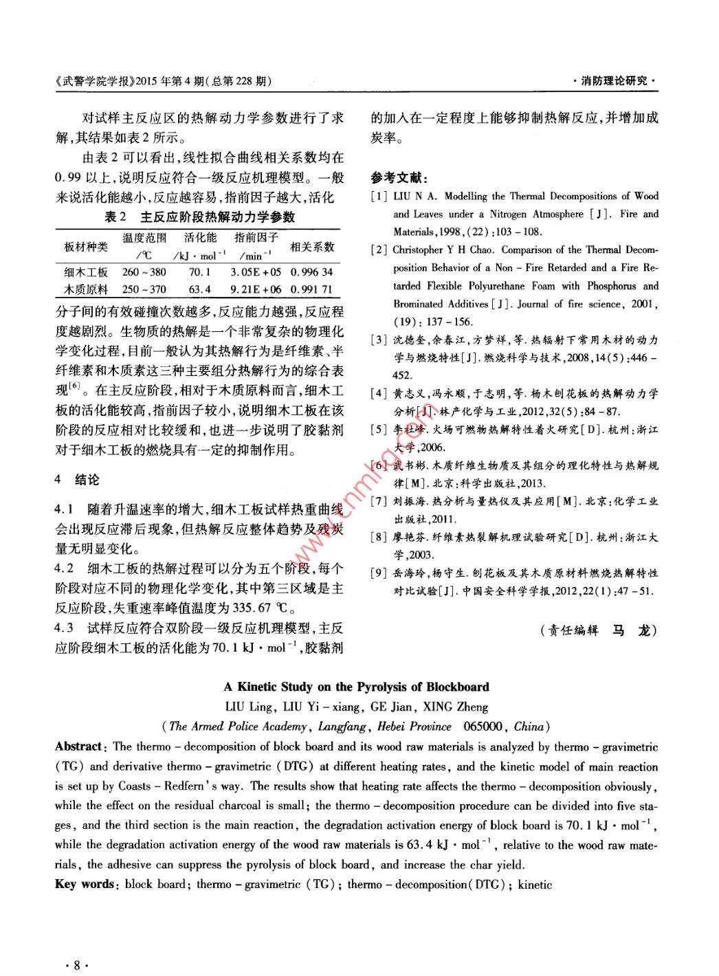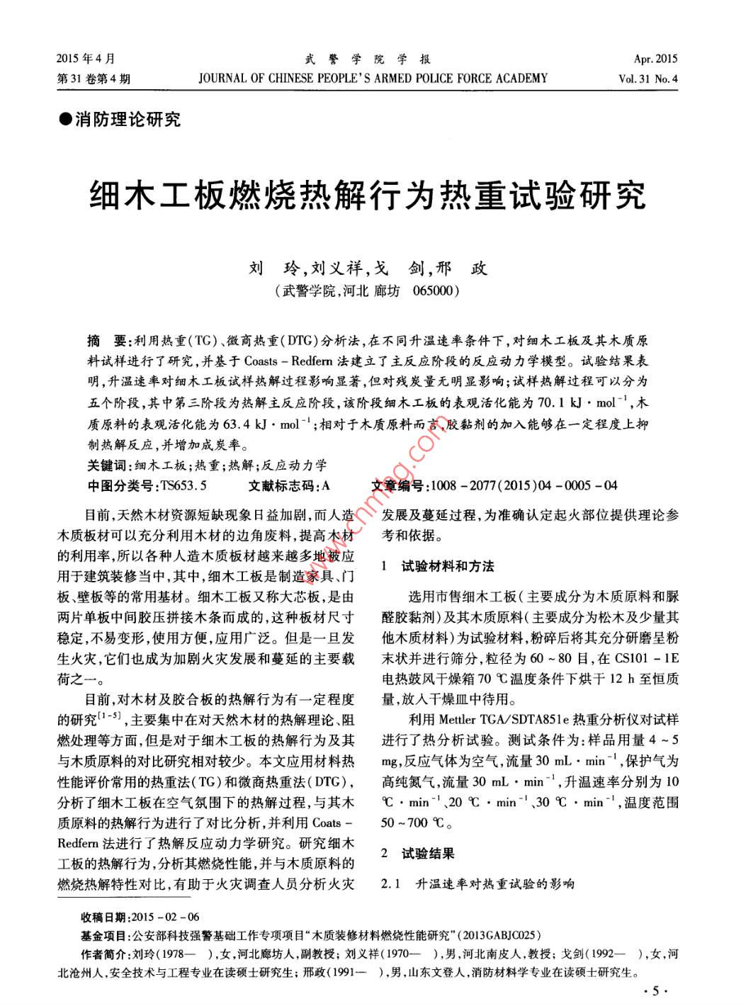 2015年4月武警學(xué)院學(xué)報Apr. 2015第31卷第4期.JOURNAL OF CHINESE PEOPLE' S ARMED POLICE FORCE ACADEMYVol.31 No.4●消防理論研究細木工板燃燒熱解行為熱重試驗研究劉玲,劉義祥,戈劍,邢政(武警學(xué)院,河北廊坊065000)摘要:利用熱重(TG)、徽商熱重(DTG)分析法, 在不同升溫速率條件下, 對細木工板及其木質(zhì)原料試樣進行了研究,并基于Coasts - Redferm法建立了主反應(yīng)階段的反應(yīng)動力學(xué)模型。試驗結(jié)果表明,升溫速率對細木工板試樣熱解過程影響顯著,但對殘?zhí)苛繜o明顯影響;試樣熱解過程可以分為五個階段,其中第三階段為熱解主反應(yīng)階段,該階段細木工板的表觀活化能為70.1 kJ●mol- ,木質(zhì)原料的表觀活化能為63.4 kJ . mol -1 ;相對于木質(zhì)原料而言,膠黏劑的加入能夠在一定程度上抑制熱解反應(yīng),并增加成炭率。關(guān)鍵詞:細木工板;熱重;熱解;反應(yīng)動力學(xué)中圖分類號:TS653.5文獻標志碼:A文章編號:1008 -2077(2015)04 -0005 -04目前,天然木材資源短缺現(xiàn)象日益加劇,而人造發(fā)展及蔓延過程,為準確認定起火部位提供理論參木質(zhì)板材可以充分利用木材的邊角廢料,提高木材考和依據(jù)。的利用率,所以各種人造木質(zhì)板材越來越多地被應(yīng)1試驗材料和方法用于建筑裝修當中,其中,細木工板是制造家具、門板壁板等的常用基材。細木工板又稱大芯板,是由選用市售細木工板(主要成分為木質(zhì)原料和脲兩片單板中間膠壓拼接木條而成的,這種板材尺寸醛膠黏劑)及其木質(zhì)原料(主要成分為松木及少量其穩(wěn)定,不易變形,使用方便,應(yīng)用廣泛。但是一旦發(fā)他木質(zhì)材料)為試驗材料,粉碎后將其充分研磨呈粉生火災(zāi),它們也成為加劇火災(zāi)發(fā)展和蔓延的主要載末狀并進行篩分,粒徑為60~80目,在CS101 - 1E荷之一。電熱鼓風干燥箱70 C溫度條件下烘干12 h至恒質(zhì)目前,對木材及膠合板的熱解行為有一定程度量,放入干燥皿中待用。的研究[1-51 ,主要集中在對天然木材的熱解理論、阻利用Mettler TGA/SDTA851e熱重分析儀對試樣燃處理等方面,但是對于細木工板的熱解行為及其進行了熱分析試驗。測試條件為:樣品用量4~5與木質(zhì)原料的對比研究相對較少。本文應(yīng)用材料熱mg,反應(yīng)氣體為空氣,流量30 mL. min -1 ,保護氣為性能評價常用的熱重法( TG )和微商熱重法(DTG),高純氮氣,流量30mL●min-1,升溫速率分別為10分析了細木工板在空氣氛圍下的熱解過程,與其木C●min-1、20C●min-!、30C●min-',溫度范圍質(zhì)原料的熱解行為進行了對比分析,并利用Coats- 50 ~700 C。Redferm 法進行了熱解反應(yīng)動力學(xué)研究。研究細木2試驗結(jié)果工板的熱解行為,分析其燃燒性能,并與木質(zhì)原料的燃燒熱解特性對比,有助于火災(zāi)調(diào)查人員分析火災(zāi)2.1升溫速率對熱重試驗的影響收稿日期:2015-02 -06基金項目:公安部科技強警基礎(chǔ)工作專項項目“木質(zhì)裝修材料燃燒性能研究" (2013GABJC025)作者簡介:劉玲(1978- ),女 ,河北廊坊人,副教授;劉義祥(1970-- ),男 河北南皮人,教授;戈劍(1992- ),女,河北滄州人,安全技術(shù)與工程專業(yè)在讀碩士研究生;邢政(1991- ),男 ,山東文登人,消防材料學(xué)專業(yè)在讀碩士研究生。《武警學(xué)院學(xué)報》2015年第4期(總第228期)●消防理論研究,熱分析測量結(jié)果會因試驗條件的不同而有所差始分解溫度、反應(yīng)區(qū)間外,-一般還需考慮殘?zhí)苛窟@一異,其中升溫速率是影響熱分析曲線的主要因素[(6]。因素,由試驗結(jié)果可見,不同升溫速率條件下,雖然在實際火場條件下,升溫速率也是影響可燃物熱解試樣反應(yīng)終止溫度不同,但三組試樣殘?zhí)苛繜o明顯過程的主要參數(shù)之一,本文在升溫速率分別為 10 C變化?!駇in~'、20 C●min-'、30 C●min-' 的條件下,分2.2細木工板熱 解過程分析析了細木工板試樣的TG曲線和DTG曲線,分別如在10C●min-'升溫速率,空氣氛圍條件下,細圖1、圖2所示。木工板試樣的熱解曲線如圖3所示。一10C/min-.0000一 20C/min- + - 30C/min-0002一TGB0--。DTG|004-0.00帳4一0.00820t 0010100 200300400500600700。" 100200300400500600700溫度(C)圖1不同升溫速率下的 TG曲線圖3細木工板試樣熱解曲線隨著試樣受熱溫度升高,細木工板熱解經(jīng)歷了: 10t/min--20C/min幾個不同階段,主要可以分為五個區(qū)域:第-區(qū)域是從50C開始到T1的部分,在該區(qū)域TG曲線出現(xiàn)小0.002-幅度下滑,DTG曲線出現(xiàn)第-一個小峰,質(zhì)量損失約為1%,這主要是由于試樣開始失去自由水而造成的;000第二區(qū)域指T1到T2的范圍,在此過程中TG曲線幾0006乎成一平臺,有微量失重,這個階段是細木工板中的0008纖維素發(fā)生解聚及“玻璃化轉(zhuǎn)變”現(xiàn)象的-一個緩慢過0010程8];第三區(qū)域是從T2到T3階段,該區(qū)域處于較低。100200300400500 600 700溫度段,為試樣熱解過程的主要階段,TG曲線下降迅速,DTG曲線出現(xiàn)最大峰,在335 C左右失重速率圖2不同升溫速率下的DTG曲線達到最大值,主要是纖維素、半纖維素以及各種添加通過曲線分析可知,在10 C . min-'、20 C●物質(zhì)的熱分解;T3到T4階段為第四區(qū)域,位于380min-'、30 C●min~升溫速率條件下,試樣反應(yīng)外推C到533C溫度范圍內(nèi),處于較高溫度段,該反應(yīng)溫起始分解溫度逐漸增大,分別為288 C、297 C、299度區(qū)間較寬,試樣熱解速率明顯減