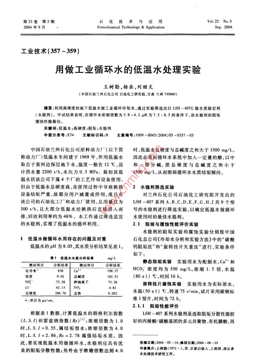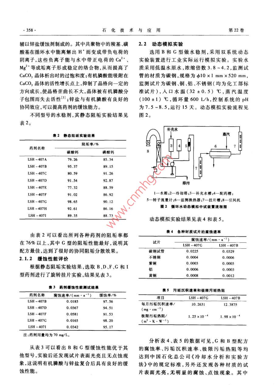 第22卷第5期石化技術與應用Vol 22 No 52004年9月Petrochemical Technology Applicationep.2004工業(yè)技術(357~359)用做工業(yè)循環(huán)水的低溫水處理實驗王樹勖,楊岳,劉繼文(中國石油蘭州石化公司石油化工研究院,甘肅蘭州730060)摘要:利用高硬度的地下低溫水做工業(yè)循環(huán)冷卻水,通過實驗篩選出以ISH-407G做水質穩(wěn)定劑(水穩(wěn)劑)。中試結果表明,在循環(huán)水濃縮倍數(shù)為3.8-4.2,pH為7.5~8.5的條件下,該水穩(wěn)劑的阻垢緩蝕性能最佳。關鍵詞:低溫水;高硬度;阻垢;水穩(wěn)劑中圖分類號:X74文獻標識碼:B文章編號:1009-0045(2004)05-0357-03中國石油蘭州石化公司原料動力廠(以下簡時,低溫水總硬度與總堿度之和大于1500mg/L,稱動力廠)低溫水車間建于1969年,所用低溫水因此必須向循環(huán)水系統(tǒng)中加入一定量的酸,以中取自于黃河邊深層地下水,溫度一般在12℃,設和一部分堿,使總硬度與總堿度之和小于計供水量2200t/h,水壓力0.5MPa。最初其低1500mg/L,從而削弱循環(huán)水水質結垢傾向。溫水供該公司下屬4個廠的工藝冷卻設備使用,但由于低溫水總硬度高,在使用過程中導致?lián)Q熱2水穩(wěn)劑篩選實驗設備結垢嚴重,故部分用戶減量或停用,現(xiàn)只有對蘭州石化公司石油化工研究院開發(fā)出的該公司的石油化工廠和動力廠使用,總用量僅為LSH-407系列A、B、C、D、E、F、G、H、I共9個型300U/h,且大部分低溫水經換熱后直接排入雨號的水穩(wěn)劑進行篩選實驗,以確定低溫水做循環(huán)排,回收利用率約為48%。本工作通過篩選適宜水使用時的最佳水穩(wěn)劑的水穩(wěn)劑,實現(xiàn)了低溫水的循環(huán)利用2.1阻垢與緩蝕性能評價實驗水穩(wěn)劑的阻垢實驗和腐蝕實驗分別按中國1低溫水做循環(huán)水用存在的問題及對策石化總公司《冷卻水分析和實驗方法》中的“碳酸低溫水的pH為805,其水質分析結果見表1。鈣阻垢法”和“旋轉掛片失重法”進行,實驗條件如下:1低溫水水質分析結果測試項目分析結果測試項日分析結果靜態(tài)阻垢實驗實驗用水為配制水,Ca2+和電導率198.37CO3濃度均為550mg/L,濃縮1.5倍,水溫總堿度82.51(80±1)℃,時間10h。鉀鈉離子旋轉掛片腐蝕實驗實驗用水為實際原水,4.8l總硬度296.76水溫(50±1)℃,轉速75r/min,試片采用碳鋼標:單位為μs/cm準I型片,時間為72h2.1.1阻垢性能評價根據(jù)表1數(shù)據(jù),計算低溫水的朗格利爾指數(shù)LSH-407系列水穩(wěn)劑是選取阻垢分散性能較(L.S.D)和雷茲納指數(shù)(Rs):濃縮倍數(shù)為1.0好的丙烯酸/磺酸基團的多元共聚物、有機膦酸,再時,L.S.=0.55,屬結垢型水;濃縮倍數(shù)為4.0時,L.S.l=2.86,Rs=2.78屬強結垢水質。因此,要實現(xiàn)低溫水用做循環(huán)水,水穩(wěn)劑應具有優(yōu)收稿日期:2004-05-14;修回日期:2004-06-01良的阻垢分散性能;另外由于濃縮倍數(shù)達到4.0作者簡介;王樹勖(1971-),男,甘肅白銀人,工程師,現(xiàn)從事水處理技術研究工作35石化技術與應用第22卷輔以鋅鹽緩蝕劑制成的。其中共聚物中的羧基、磺2.2動態(tài)模擬實驗酸基在循環(huán)水中能離解出H’而變成帶負電荷的選用B和G型做水穩(wěn)劑,采用雙系統(tǒng)動態(tài)陰離子,這些負離子能與水中帶正電荷的Ca2、實驗裝置進行工業(yè)實際運行模擬實驗。實驗水Mg2等成垢離子形成穩(wěn)定的絡合物,從而提高了質采用低溫水原水,濃縮倍數(shù)38-4.2,監(jiān)測試CaCO3晶體析出時的過飽和度;有機膦酸能吸附在管的材質為碳鋼,規(guī)格為φ10×1mmx520mm,CaCO3晶體的活性增長點上,抑制了晶格向一定的監(jiān)測試片為碳鋼、銅、鋁、不銹鋼(均為化工部標方向成長,使晶格歪曲長不大,晶體被有機膦酸分準試片),入口水溫(32±0.5)℃,蒸汽溫度子包圍而失去活性;鋅鹽與有機膦酸有良好的(100±1)℃,循環(huán)量600Lh,控制系統(tǒng)的pH協(xié)同效應,可以提高藥劑的緩蝕能力為7.5~8.5,運行15天。動態(tài)模擬實驗流程見不同型號的水穩(wěn)劑,其靜態(tài)阻垢實驗結果見圖2補充水衰2靜態(tài)阻垢實驗結果阻垢率/%藥劑名稱碳酸鈣磷酸鈣LSH -407ALSH-407BL SH-407C80.59ISH -407D91.0286.921一水箱;2一冷卻塔;3一補充水槽;4-配藥槽;LSH-407G98.6590.125一轉子流量計;6—監(jiān)測換熱器;7—掛片槽;8—引風機92.6l圖2循環(huán)水動態(tài)模擬中試裝置流程圖動態(tài)模擬實驗結果見表4和表5。由表2可以看出所列各種藥劑的阻垢率都表4各種材質試片的腐蝕速率在76%以上,其中G型的阻垢性能最好,說明其蝕速率/(mm·a-1)LSH -407GLSH-407B配方最佳,達到了很好的協(xié)同阻垢分散效果。碳鋼試管0.03292.12緩蝕性能評價不銹鋼0.0006根據(jù)靜態(tài)阻垢實驗結果,選取B、D、F、G和I紫銅0.00050.00060.0003型藥劑進行了旋轉掛片實驗,結果見表30.0008豪3藥劑級蝕性能測試結果表5污垢沉積速率和極限污垢熱阻藥劑名稱腐速率/(mm")緩蝕率/%項目5H-407GLSH-407BSH-407B0.0185每月污垢沉積速率/10.263112.3875LSH-407D(mg.cm)LSH-407F91.53極限污垢熱阻1,25×10-41.98×10-4LSH-407G0.0165(m2·K·W-1)ISH-40710.0342注:藥劑用量均為70mg/L分析表4、表5的數(shù)據(jù)可見,G和B型配方從表3可以看出B和G型緩蝕性能優(yōu)于其的腐蝕率、污垢沉積速率、極限污垢熱阻等均他型號,實驗后還發(fā)現(xiàn)試片表面光亮且無點蝕現(xiàn)達到中國石化總公司《冷卻水分析和實驗方象這說明有機牌酸與鋅鹽復合后具有良好的緩法》中的規(guī)定標準,另外還發(f