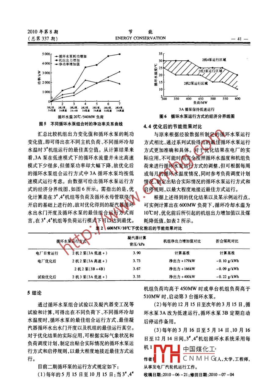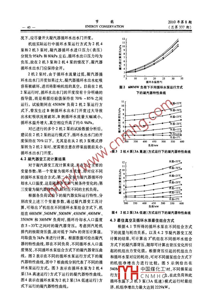 能2010年第8期.-38-ENERGY CONSERVATION(總第337期)600MW機(jī)組循環(huán)水系統(tǒng)優(yōu)化試驗(yàn)分析張強(qiáng)(國(guó)信揚(yáng)州發(fā)電有限責(zé)任公司,江蘇揚(yáng)州225000)摘要:國(guó)信揚(yáng)州發(fā)電有限責(zé)任公司二期3' .4"機(jī)組循環(huán)水母管采用聯(lián)絡(luò)方式運(yùn)行,相對(duì)于循環(huán)水母管獨(dú)立運(yùn)行,節(jié)能運(yùn)行的空間較大,目前循環(huán)水泵3A進(jìn)行了電機(jī)雙速改造,通過(guò)循環(huán)水泵組合試驗(yàn),依據(jù)凝汽器變工況計(jì)算的結(jié)果以及循環(huán)水泵耗功和機(jī)組微增出力之間的關(guān)系,對(duì)機(jī)組的循環(huán)水泵經(jīng)濟(jì)調(diào)度和節(jié)能潛力進(jìn)行了分析。關(guān)鍵詞:循環(huán)水泵;優(yōu)化;運(yùn)行方式;節(jié)能中圖分類號(hào):TM62文獻(xiàn)標(biāo)識(shí)碼:B 文章編號(hào) :1004 - 7948(2010)08 -0038 -04式為2臺(tái)機(jī)組配4臺(tái)同型號(hào)循環(huán)水泵,循環(huán)水泵葉1機(jī)組概況片均不可調(diào),目前3A循泵改造為可雙速運(yùn)行。2江蘇國(guó)信揚(yáng)州發(fā)電有限責(zé)任公司3"、4"機(jī)組為臺(tái)機(jī)組的循環(huán)水母管之間設(shè)有電動(dòng)聯(lián)絡(luò)門,通常處600MW超臨界汽輪發(fā)電機(jī)組,分別于2006年11于開(kāi)啟狀態(tài)。月和2007年1月建成投產(chǎn)并投人商業(yè)運(yùn)行。汽輪2試驗(yàn)?zāi)康臋C(jī)配套凝汽器為雙殼體、單流程、雙背壓、表面式凝汽器,總冷卻面積為38000m2,在循環(huán)冷卻水溫為通過(guò)循環(huán)水泵組合試驗(yàn)獲取循環(huán)水流量與耗20亡情況下的機(jī)組背壓為4. 9kPa。循環(huán)水系統(tǒng)為功的關(guān)系,通過(guò)主機(jī)和凝汽器的試驗(yàn)獲取凝汽器特開(kāi)式循環(huán),冷卻水源為長(zhǎng)江水。循環(huán)水泵的配套方性數(shù)據(jù)。對(duì)凝汽器進(jìn)行各種變工況計(jì)算,并由機(jī)組引人其他的陶瓷原料,通過(guò)對(duì)陶瓷制品成分的調(diào)(3)內(nèi)墻釉面磚的燒結(jié)溫度范圍: >30C;整,來(lái)達(dá)到提高產(chǎn)品性能的目的。(4)內(nèi)墻釉面磚的吸水率: <20%。另外,還要控制好燒成溫度,防止出現(xiàn)生燒和3結(jié)語(yǔ).過(guò)燒現(xiàn)象??傊?控制好以上工藝要點(diǎn),才能夠保證最終隨著陶瓷墻地磚產(chǎn)量的增加,其生產(chǎn)過(guò)程中產(chǎn)生產(chǎn)出所需要的合格產(chǎn)品。生的廢料越來(lái)越多。根據(jù)不完全統(tǒng)計(jì),整個(gè)佛山各在整個(gè)實(shí)施方案的設(shè)計(jì)過(guò)程中,尤其在各種添種陶瓷廢料的年產(chǎn)量已經(jīng)超過(guò)400萬(wàn)t,按此估算加劑的選擇上,還要遵循一條重要原則:用拋光廢遼寧法庫(kù)地區(qū)年陶瓷廢料產(chǎn)量也應(yīng)超過(guò)百萬(wàn)噸以料通過(guò)配方設(shè)計(jì)制作內(nèi)墻釉面磚的總成本要不高上。如此大量的陶瓷廢料,如果不加以利用,任其于傳統(tǒng)方法的成本,只有這樣,項(xiàng)目才更有意義。積累下去,將會(huì)對(duì)環(huán)境造成災(zāi)難性的破壞。本項(xiàng)目該項(xiàng)目的預(yù)期目標(biāo)就是利用拋光磚的拋光廢一 經(jīng)研制成功將會(huì)在很大程度上解決制約墻地磚料制作內(nèi)墻釉面磚,徹底解決拋光廢料的環(huán)境污染生產(chǎn)的這一技術(shù)難題,并且每年也能節(jié)約數(shù)百萬(wàn)噸問(wèn)題,而且對(duì)陶瓷廢料的利用,就是對(duì)陶瓷原料資的陶瓷原料,它是陶瓷墻地磚生產(chǎn)的一場(chǎng)技術(shù)革源的節(jié)省。命,定能推動(dòng)我國(guó)建筑陶瓷產(chǎn)業(yè)的發(fā)展,實(shí)現(xiàn)經(jīng)濟(jì)該項(xiàng)目將考核的主要技術(shù)指標(biāo)如下:中國(guó)煤化工(1)拋光廢料在內(nèi)墻釉面磚配料中的比例:作者.MYHC N M H G溪人,大學(xué),高級(jí)工50% ~ 80%;程師,從事輕工產(chǎn)品質(zhì)量檢測(cè)和業(yè)務(wù)管理工作。(2)內(nèi)墻釉面磚的燒成溫度:1050 ~ 1100C;收稿日期:2010-07-152010年第8期節(jié)能(總第337期)ENERGY CONSERVATION9-的微增出力曲線來(lái)共同確定在不同冷卻水溫和不表1循環(huán)水泵組合運(yùn)行方式劃分同負(fù)荷情況下的循環(huán)水泵最佳運(yùn)行方式,以使機(jī)組分類序號(hào)循環(huán)水泵種類工況循環(huán)水泵運(yùn)行分類運(yùn)行在最經(jīng)濟(jì)的狀態(tài)下。.運(yùn)行方式編號(hào)2機(jī)4泵4P-013A高速+3B +4A +4B3試驗(yàn)原理及計(jì)算方法4P-023A低速+3B +4A+4B3.1計(jì)算理論2機(jī)3泵3P-01 3A 高速+3B +4A或4B(1)經(jīng)過(guò)試驗(yàn)得出在不同循環(huán)水泵組合方式3P-023A低速+3B +4A或4B下,凝汽器所獲得的循環(huán)冷卻水流量及對(duì)應(yīng)循環(huán)水2機(jī)2泵2P-01 3A 高速+4A或4B泵的耗功情況:2P-02 3B +4A或4B2P -033A低速+4A或4BNp=f(Q)注:3A.3B指3*機(jī)循環(huán)水泵。式中:Np- -循環(huán)水泵耗功,kW;Q一凝汽器循環(huán)水流量,Vh。4循環(huán)水系統(tǒng)優(yōu)化試驗(yàn)結(jié)果及分析(2)通過(guò)凝汽器變工況計(jì)算可推出機(jī)組在不同循環(huán)冷卻水溫度,不同負(fù)荷時(shí)的凝汽器背壓與循循環(huán)水系統(tǒng)優(yōu)化試驗(yàn)的最終目的是獲得機(jī)組在不同負(fù)荷、不同循環(huán)水入口溫度下的機(jī)組最佳真環(huán)水流量的關(guān)系:空,對(duì)應(yīng)這一真空值,循環(hu
