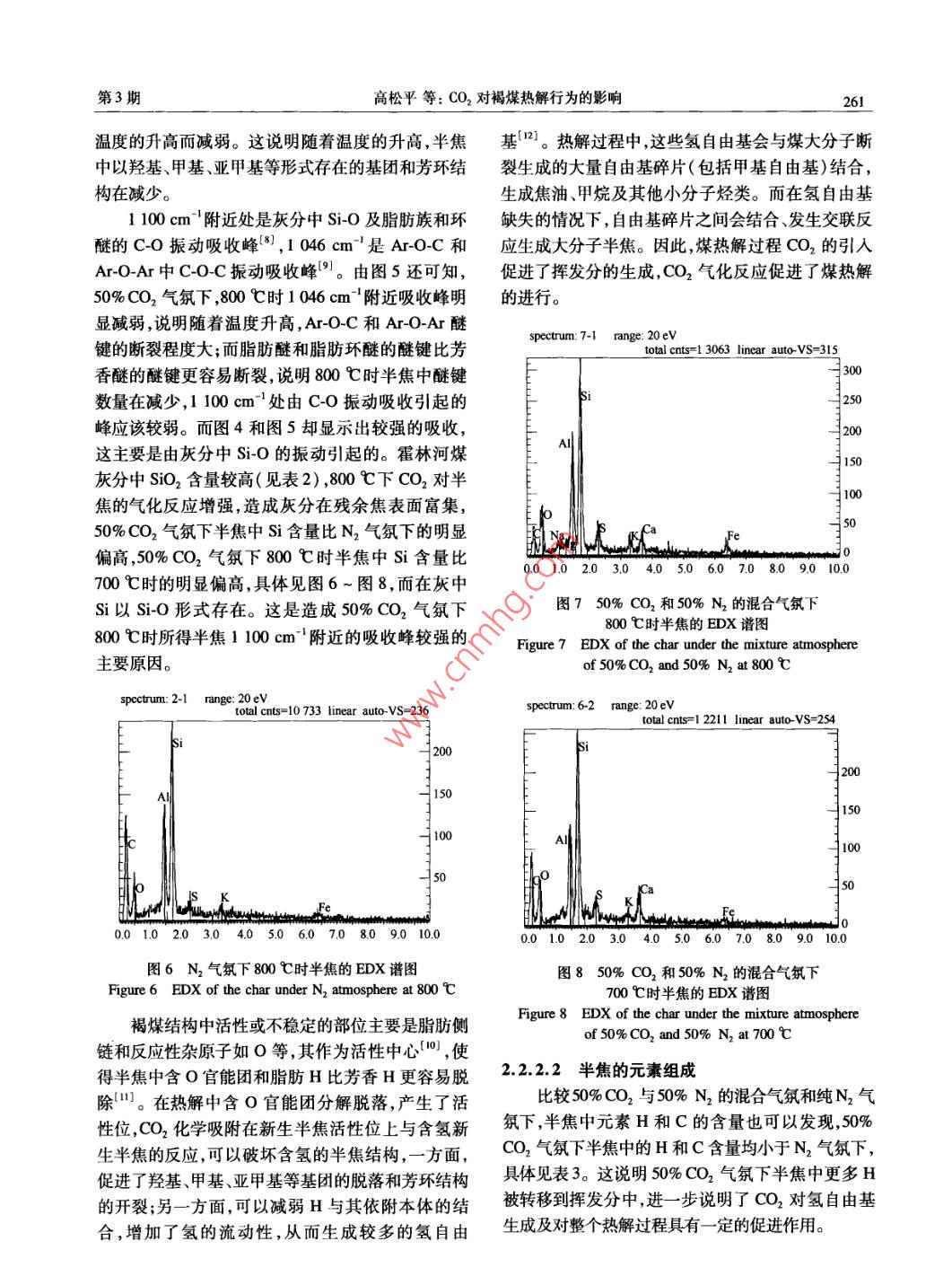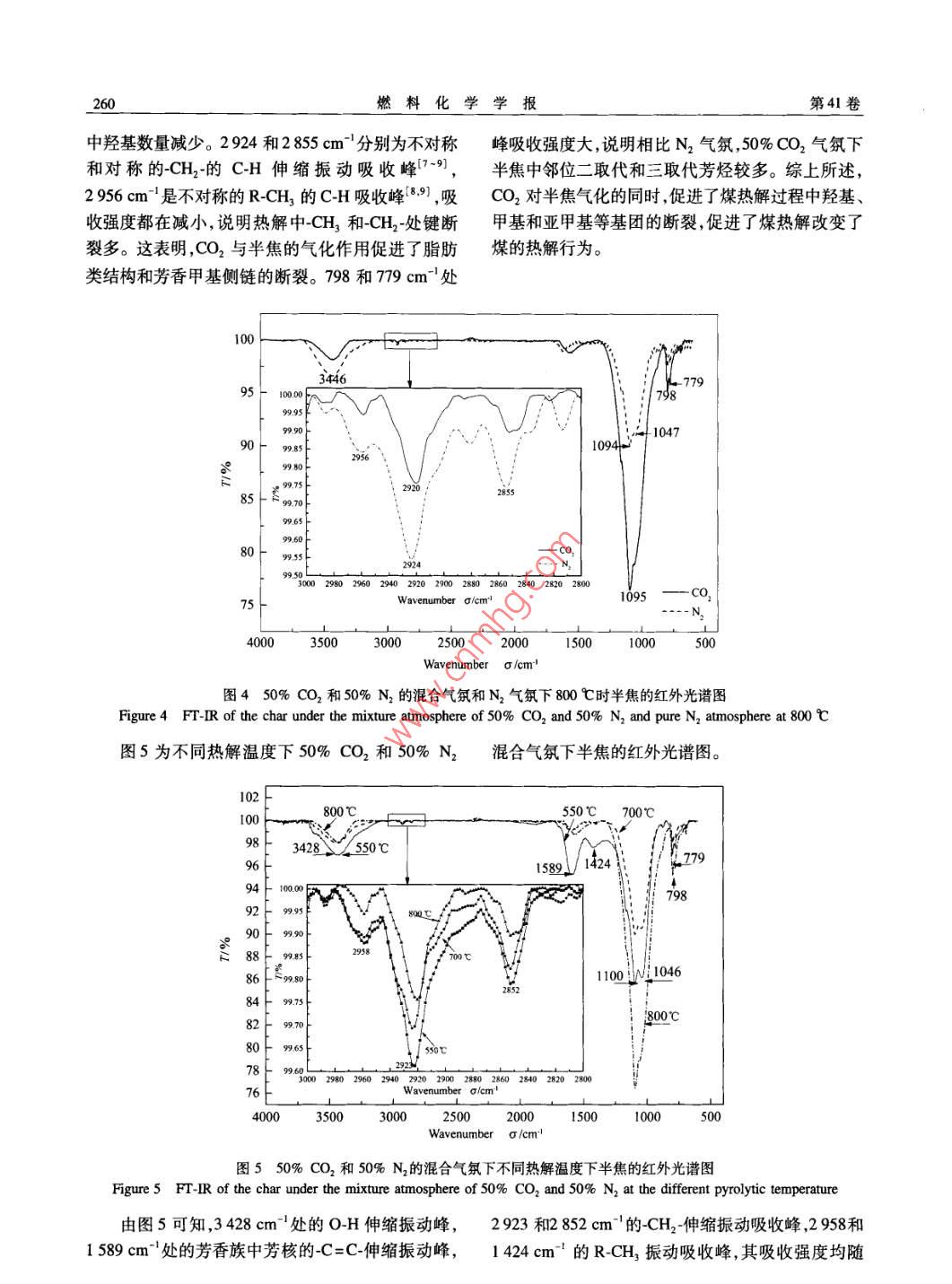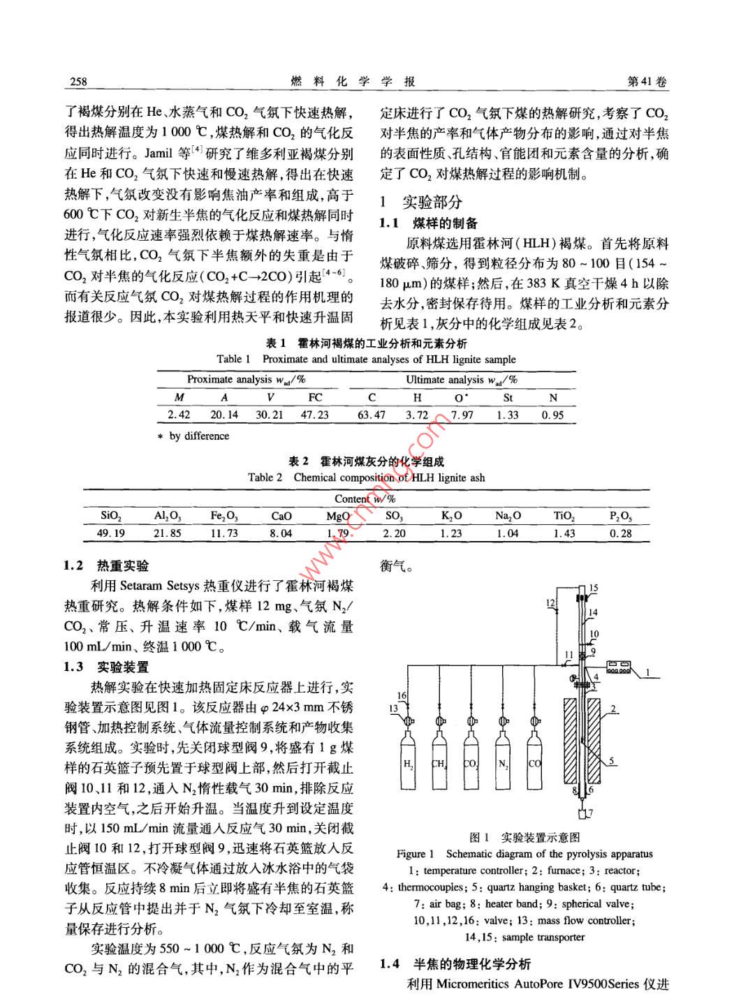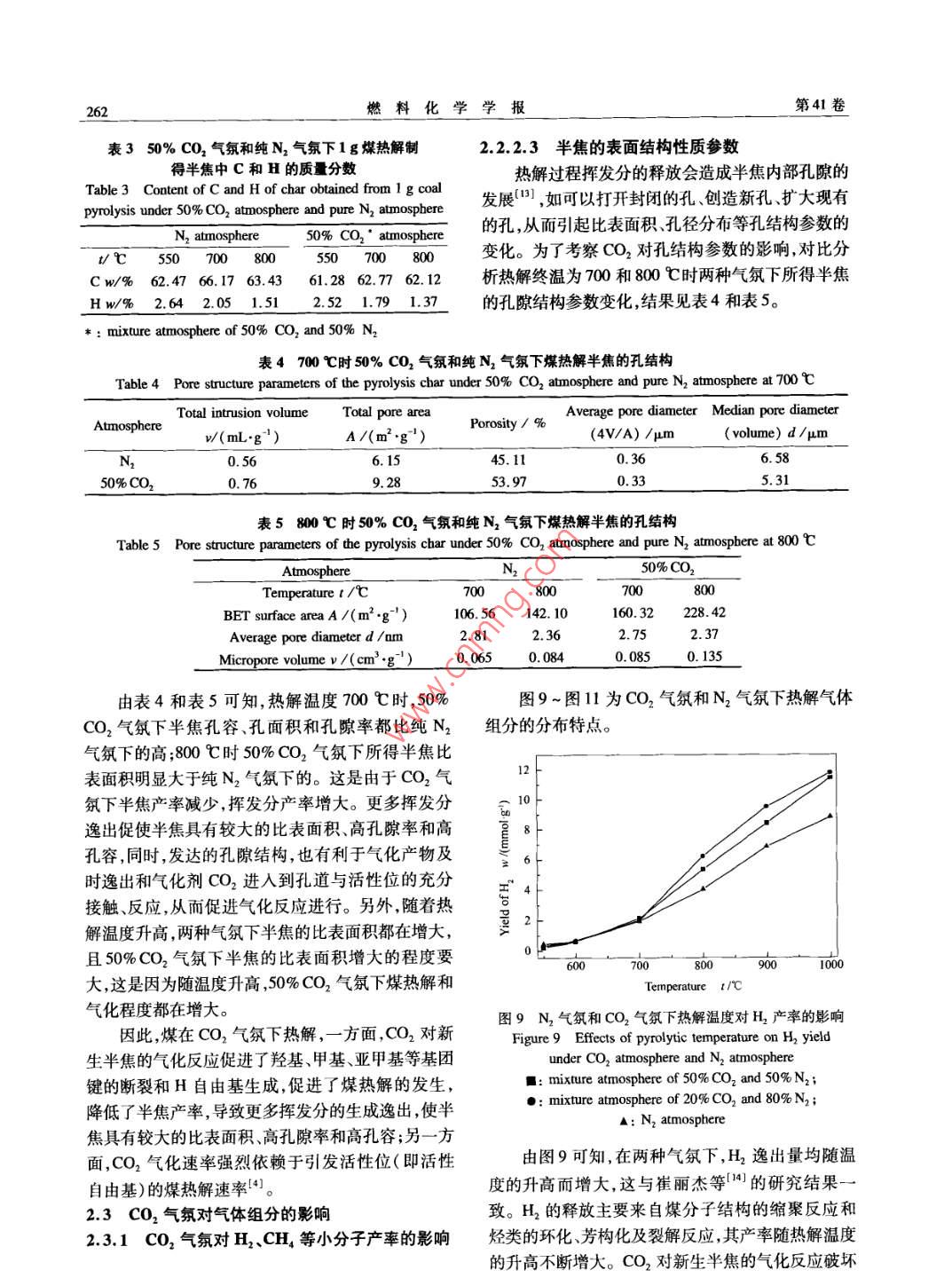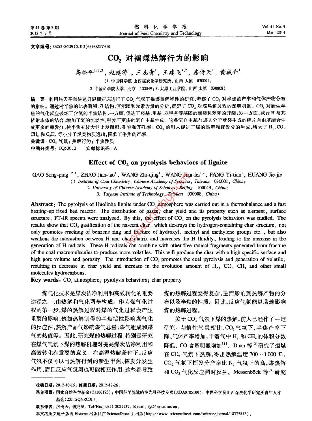 第41卷第3期燃料化學(xué)學(xué)報Vol, 41 No. 32013年3月Jourmal of Fuel Chemistry and TechnologyMar.2013文章編號:0253-2409(2013)030257-08cO2對褐煤熱解行為的影響高松平123,趙建濤,王志青,王建飛12,房倚天,黃戒介1(1.中國科學(xué)院山西煤炭化學(xué)研究所,山西太原030001;2中國科學(xué)院大學(xué),北京100049;3.太原工業(yè)學(xué)院,山西太原030008)摘要:利用熱天平和快速升溫固定床進(jìn)行了CO2氣氛下褐煤熱解特性的研究,考察了CO2對半焦的產(chǎn)率和氣體產(chǎn)物分布的影響。通過對半焦的比表面積、孔結(jié)構(gòu)、官能團(tuán)和元素含量的分析,確定了CO2對煤熱解過程的影響機(jī)制。CO2對新生半焦的氣化反應(yīng)破壞了含氫的半焦結(jié)構(gòu),一方面促進(jìn)了羥基、甲基、亞甲基等基團(tuán)的斷裂和苯環(huán)的開裂;另一方面減弱H與其依附本體的結(jié)合,增加了氫的流動性,引發(fā)了更多的氫自由基生成。這些氫自由基與煤大分子斷裂生成的碎片自由基結(jié)合生成更多的揮發(fā)分,使半焦有較大的比表面積孔容和開孔率。CO2的引入促進(jìn)了煤的熱解和揮發(fā)分的生成,增大了H2、COCH4和CH等小分子烴類物質(zhì)逸出降低了半焦的產(chǎn)率關(guān)鍵詞:CO2氣氛;熱解行為;半焦性質(zhì)中圖分類號:TQ530.2文獻(xiàn)標(biāo)識碼:AEffect of co, on pyrolysis behaviors of ligniteGAO Song-ping23, ZHAO Jian-tao, WANG Zhi-qing, WANG Jian-fei, FANG Yi-tian', HUANG Jie-jie2. University of Chinese Academy of Sciences, Beijing 100049, Chile, China;1. Institute of Coal Chemistry, Chinese Academy of Sciences, Taiyuan 030001, China3. Taiyuan institute of Technology, Taiyuan 030008, China)Abstract: The pyrolysis of Huolinhe lignite under CO2 atmosphere was carried out in a thermobalance and a fastheating-up fixed bed reactor. The distribution of gases, char yield and its property such as element, surfacestructure, FT-IR spectra were analyzed. By this, the effect of CO2 on the pyrolysis behaviors was studied. Theresults show that CO, gasification of the nascent char, which destroys the hydrogen-containing char structure, notonly promotes cracking of benzene ring and fracture of hydroxyl, methyl and methylene groups etc., but alsoweakens the interaction between H and char matrix and increases the H fluidity, leading to the increase in thegeneration of H radicals. These H radicals can combine with other free radical fragments generated from fractureof the coal macromolecules to produce more volatiles. This will produce the char with a high specific surface andhigh pore volume and porosity. The introduction of CO 2 promotes the coal pyrolysis and generation of volatileresulting in decrease in char yield and increase in the evolution amount of H,, CO, CH4 and other smallmolecules hydrocarbonsKey words: CO, atmosphere; pyrolysis behaviors; char property煤氣化技術(shù)是煤炭潔凈利用和高效轉(zhuǎn)化的重要煤的熱解過程變得復(fù)雜,進(jìn)而影響到熱解產(chǎn)物的分途徑之一,由熱解和氣化兩步構(gòu)成。作為煤氣化過布以及半焦的性質(zhì)。因此,反應(yīng)氣氛能顯著地影響程的第一步,煤的熱解過程對煤的氣化過程會產(chǎn)生煤的熱解過程。重要的影響,例如熱解制得的半焦活性影響煤氣化關(guān)于CO2氣氛下煤的熱解,前人已經(jīng)作了一定的反應(yīng)性,熱解產(chǎn)品氣影響煤氣總量煤氣組成和煤研究。與惰性氣氛相比,CO2氣氛下,半焦產(chǎn)率下氣的熱值等。因此,研究煤的熱解過程,特別是研究降氣體產(chǎn)率增加,干餾氣中H2和CH4的體積分?jǐn)?shù)在煤氣氣氛下煤的熱解機(jī)理對提高煤炭潔凈利用和降低,CO含量明顯增加。Duan等φ2研究了煙煤高效轉(zhuǎn)化有重要的意義。在高溫?zé)峤鈼l件下,反應(yīng)在CO2氣氛下熱解,得出熱解溫度700-1000℃氣氛不僅可以與熱解得到的新生半焦揮發(fā)分發(fā)生CO2氣氛下?lián)]發(fā)分產(chǎn)率比N2氣氛下的高,煤熱解作用,而且反應(yīng)氣氛間也可能相互作用,這些都導(dǎo)致和CO2氣化反應(yīng)同時反生。 Messenbock等3研究收稿日期:2012-10-15;修回日期:2012-1226基金項目:國家自然科學(xué)基金(21106173);中國科學(xué)院戰(zhàn)略性先導(dǎo)科技專項(XDA0705100);中國科學(xué)院山西煤炭化學(xué)研究所青年人才基金(201QNR01)。聯(lián)系作者:房倚天,研究員,Tel/Fax:0351-2021137,E-mail:fyt@sxic.ac.cn。本文的英文電子版由Elsevier出版社在ScienceDirec上出版(hp://www.sciencedirect.com/ScIence/jourmal/18725813)。燃料化學(xué)學(xué)報第41卷了褐煤分別在He、水蒸氣和CO2氣氛下快速熱解,定床進(jìn)行了CO2氣氛下煤的熱解研究,考察了CO得出熱解溫度為1000℃,煤熱解和CO2的氣化反對半焦的產(chǎn)率和氣體產(chǎn)物分布的影響,通過對半焦應(yīng)同時進(jìn)行。 Jamil等4研究了維多利亞褐煤分別的表面性質(zhì)、孔結(jié)構(gòu)、官能團(tuán)和元素含量的分析,確在He和CO2氣氛下快速和慢速熱解,得出在快速定了CO2對煤熱解過程的影響機(jī)制熱解下,氣氛改變沒有影響焦油產(chǎn)率和組成,高于1實驗部分600℃下CO2對新生半焦的氣化反應(yīng)和煤熱解同時1.1媒樣的制備進(jìn)行,氣化反應(yīng)速率強烈依賴于煤熱解速率。與惰原料煤選用霍林河(HLH)褐煤。首先將原料性氣氛相比,CO2氣氛下半焦額外的失重是由于煤破碎篩分,得到粒徑分布為80~100目(154CO2對半焦的氣化反應(yīng)(CO2+C→2CO)引起46。180μm)的煤樣;然后,在383K真空干燥4h以除而有關(guān)反應(yīng)氣氛CO2對煤熱解過程的作用機(jī)