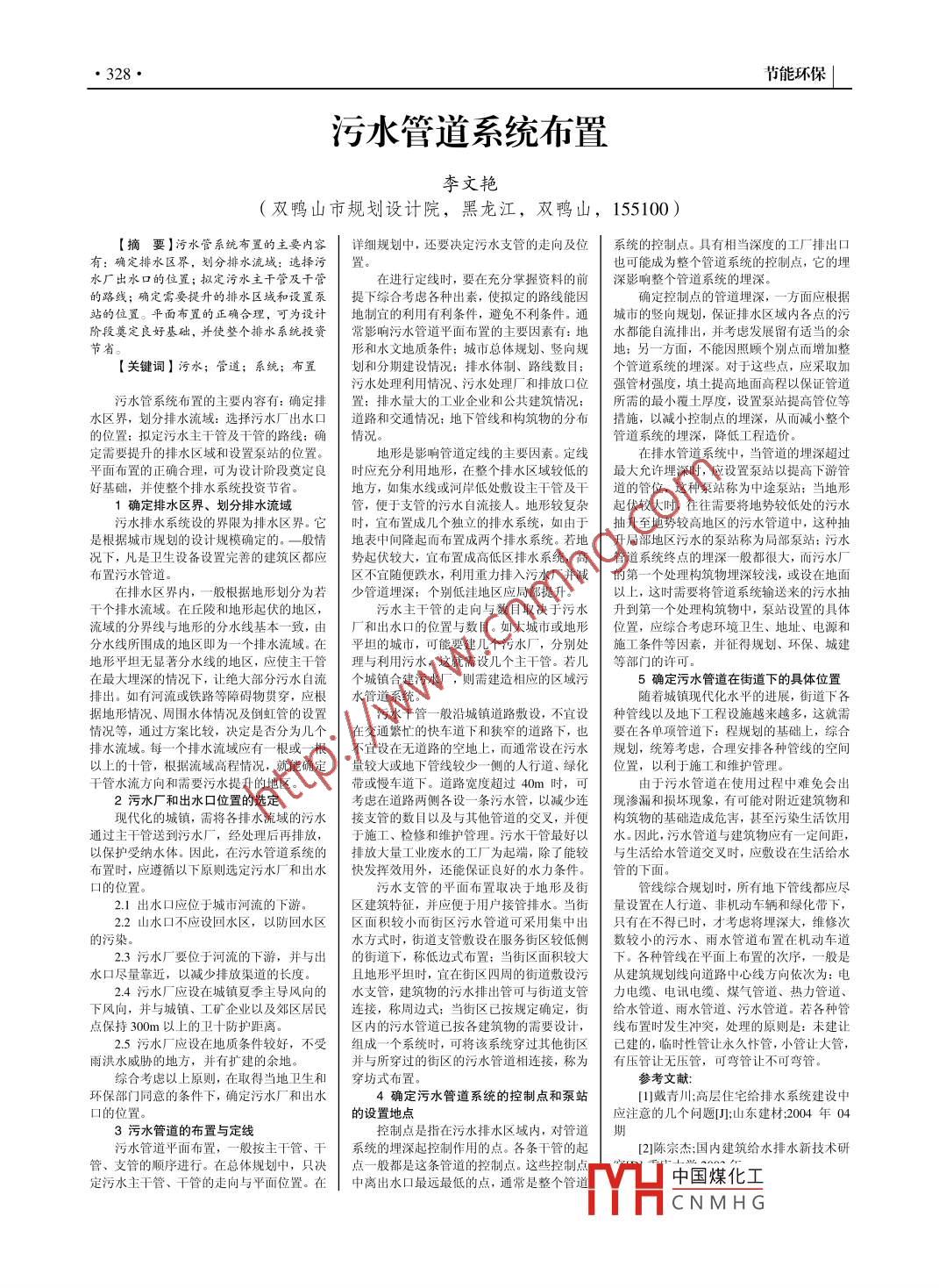 ●328●節(jié)能環(huán)保污水管道系統(tǒng)布置李文艷(雙鴨山市規(guī)劃設(shè)計(jì)院,黑龍江,雙鴨山,155100 )[摘要]污水管系統(tǒng)布置的主要內(nèi)容詳細(xì)規(guī)劃中,還要決定污水支管的走向及位系統(tǒng)的控制點(diǎn)。具有相當(dāng)深度的工廠排出口有:確定排水區(qū)界,劃分排水流域:選擇污置。也可能成為整個(gè)管道系統(tǒng)的控制點(diǎn),它的埋水廠出水口的位置;擬定污水主干管及干管在進(jìn)行定線時(shí),要在充分掌握資料的前深影響整個(gè)管道系統(tǒng)的埋深。的路線;確定需要提升的排水區(qū)域和設(shè)置泵提下綜合考慮各種出索,使擬定的路線能因確定控制點(diǎn)的管道埋深,一方面應(yīng)根據(jù)站的位置。平面布置的正確合理,可為設(shè)計(jì)地制宜的利用有利條件,避免不利條件。通城市的豎向規(guī)劃,保證排水區(qū)域內(nèi)各點(diǎn)的污階段奠定良好基礎(chǔ),并使整個(gè)排水系統(tǒng)投資常影響污水管道平面布置的主要因素有:地水都能自流排出,并考慮發(fā)展留有適當(dāng)?shù)挠嘈魏退牡刭|(zhì)條件:城市總體規(guī)劃、豎向規(guī)地;另一方面,不能因照顧個(gè)別點(diǎn)而增加整[關(guān)鍵詞]污水;管道;系統(tǒng);布置劃和分期建設(shè)情況;排水體制、路線數(shù)目:個(gè)管道系統(tǒng)的埋深。對(duì)于這些點(diǎn),應(yīng)采取加污水處理利用情況、污水處理廠和排放口位強(qiáng)管 材強(qiáng)度,填土提高地面高程以保證管道污水管系統(tǒng)布置的主要內(nèi)容有:確定排置:排水量大的工業(yè)企業(yè)和公共建筑情況:所需的最小覆土厚度,設(shè)置泵站提高管位等水區(qū)界,劃分排水流域:選擇污水廠出水口道路和交通情況:地下管線和構(gòu)筑物的分布措施,以減小控制點(diǎn)的埋深,從而減小整個(gè)的位置:擬定污水主干管及干管的路線;確|情況。管道系統(tǒng)的埋深,降低工程造價(jià)。定需要提升的排水區(qū)域和設(shè)置泵站的位置。地形 是影響管道定線的主要因素。定線在排水管道 系統(tǒng)中,當(dāng)管道的埋深超過平面布置的正確合理,可為設(shè)計(jì)階段奠定良時(shí)應(yīng)充分利用地形,在整個(gè)排水區(qū)域較低的最大允許埋深時(shí),應(yīng)設(shè)置泵站以提高下游管好基礎(chǔ),并使整個(gè)排水系統(tǒng)投資節(jié)省。地方,如集水線或河岸低處敷設(shè)主干管及干道的管位,這種泵站稱為中途泵站:當(dāng)?shù)匦?確定排水區(qū)界、劃分排水流域管,便于支管的污水自流接人。地形較復(fù)雜|起伏較 大時(shí),往往需要將地勢(shì)較低處的污水污水排水系統(tǒng)設(shè)的界限為排水區(qū)界。它時(shí),宜布置成幾個(gè)獨(dú)立的排水系統(tǒng),如由于抽升至地勢(shì)較高地區(qū)的污水管道中,這種抽是根據(jù)城市規(guī)劃的設(shè)計(jì)規(guī)模確定的。-般情地表中間隆起而布置成兩個(gè)排水系統(tǒng)。若地升局部地區(qū)污水的泵站稱為局部泵站;污水況下,凡是衛(wèi)生設(shè)備設(shè)置完善的建筑區(qū)都應(yīng)勢(shì)起伏較大,宜布置成高低區(qū)排水系統(tǒng),高管道系統(tǒng)終點(diǎn)的埋深一般都很大, 而污水廠布置污水管道。區(qū)不宜隨便跌水,利用重力排入污水廠并減的第一個(gè)處理構(gòu)筑物埋深較淺,或設(shè)在地面在排水區(qū)界內(nèi), 一般根據(jù)地形劃分為若少管道埋深;個(gè)別低洼地區(qū)應(yīng)局部提升。以上,這時(shí)需要將管道系統(tǒng)輸送來的污水抽干個(gè)排水流域。在丘陵和地形起伏的地區(qū),污水主干管的走向與數(shù)目取決于污水升到第一個(gè)處理構(gòu)筑物中,泵站設(shè)置的具體流域的分界線與地形的分水線基本一致,由|廠 和出水口的位置與數(shù)目。如大城市或地形位置,應(yīng)綜合考慮環(huán)境衛(wèi)生、地址、電源和分水線所圍成的地區(qū)即為-一個(gè)排水流域。在平坦的城市,可能要建幾個(gè)污水廠,分別處施工條件等因素,并征得規(guī)劃、環(huán)保、城建地形平坦無顯著分水線的地區(qū),應(yīng)使主干管理與利用污水,這就需設(shè)幾個(gè)主干管。若幾等部門的許可。在最大埋深的情況下,讓絕大部分污水自流個(gè)城鎮(zhèn)合建污水廠,則需建造相應(yīng)的區(qū)域污5確定污水管道在街道下的具體位置排出。如有河流或鐵路等障礙物貫穿,應(yīng)根水管道系統(tǒng)。隨著城鎮(zhèn)現(xiàn)代化水平的進(jìn)展,街道下各據(jù)地形情況、周圍水體情況及倒虹管的設(shè)置污水干管一般沿城鎮(zhèn)道路敷設(shè),不宜設(shè)種管線以及地下工程設(shè)施越來越多,這就需情況等,通過方案比較,決定是否分為幾個(gè)在交通繁忙的快車道下和狹窄的道路下,也要 在各單項(xiàng)管道下:程規(guī)劃的基礎(chǔ)上,綜合排水流域。每一- 個(gè)排水流域應(yīng)有- -根或- -根不宜設(shè)在無道路的空地上,而通常設(shè)在污水規(guī)劃,統(tǒng)籌考慮,合理安排各種管線的空間以上的十管,根據(jù)流域高程情況,就能確定量較大或地下管線較少-側(cè)的人行道、 綠化位置,以利于施工和維護(hù)管理。干管水流方向和需要污水提升的地區(qū)。帶或慢車道下。道路寬度超過40m時(shí),可由于污水管道在使用過程中難免會(huì)出2污水廠和出水口位置的選定