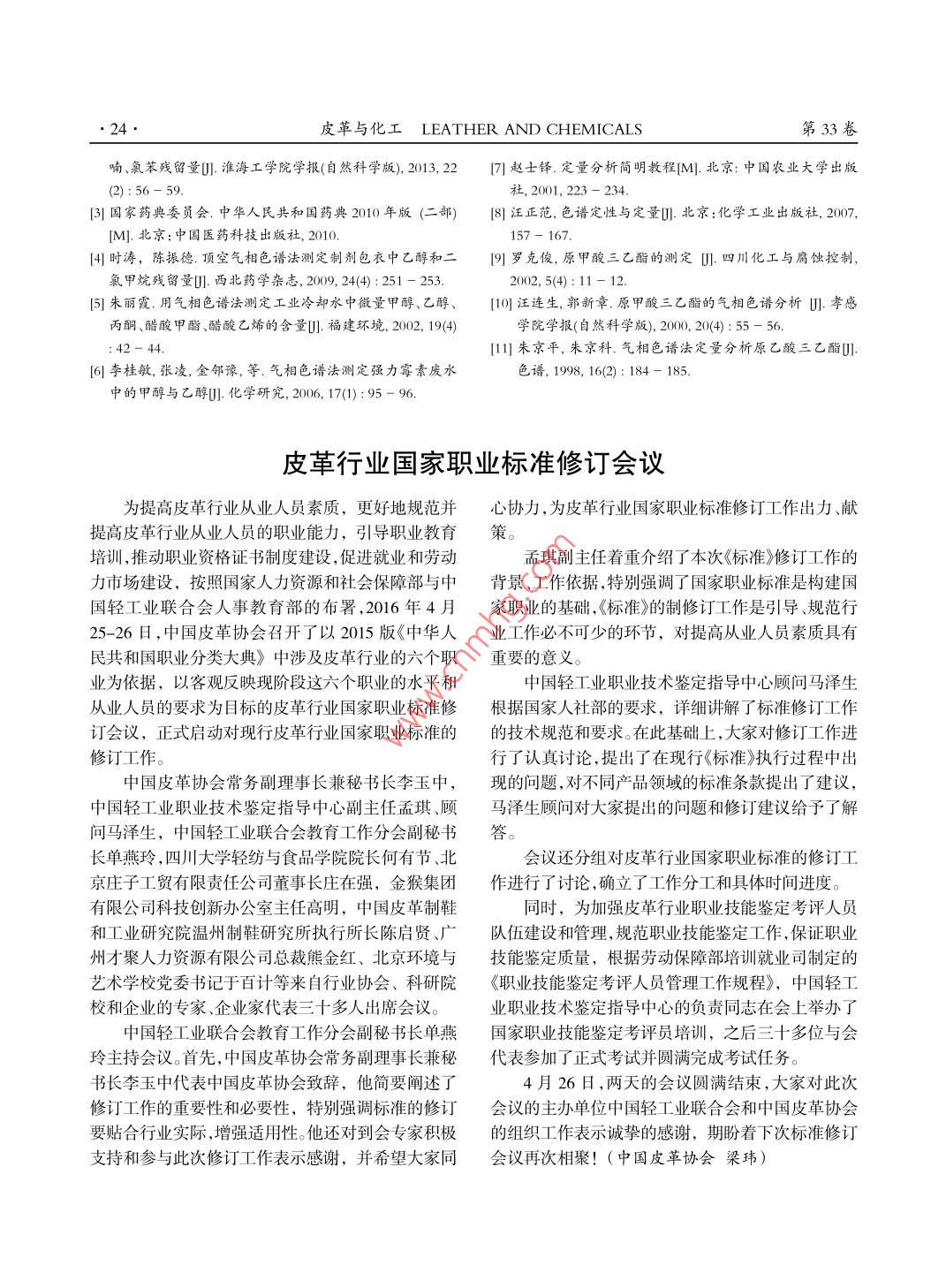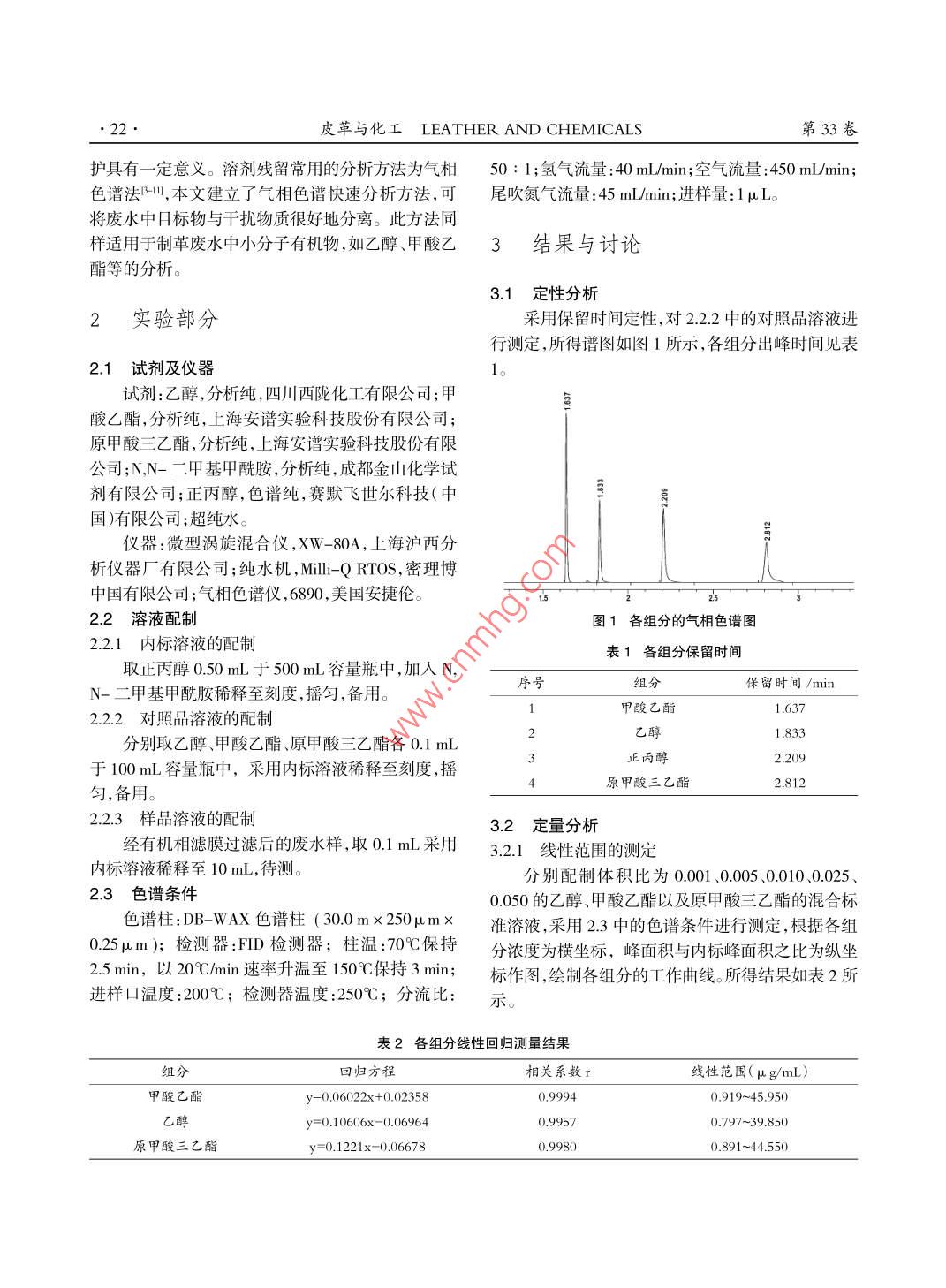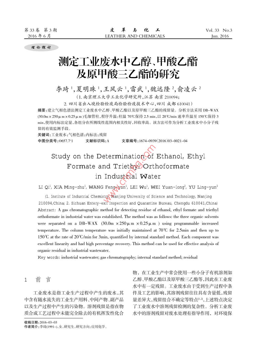 第33卷第3期皮革與化工Vol 3.3 No. 32016年6月LEATHER AND CHEMICALSJum.2016理論摞討測定工業(yè)廢水中乙醇、甲酸乙酯及原甲酸三乙酯的研究李琦',夏明珠',王風(fēng)云1,雷武1,魏遠(yuǎn)隆,俞凌云2(1.南京理工大學(xué)工業(yè)化學(xué)研究所,江蘇南京210094;2.四川省出入境檢驗檢疫局檢驗檢疫技術(shù)中心,四川成都610041)摘要:建立氣相色譜法測定工業(yè)廢水中乙醇、甲酸乙酯以及原甲酸三乙酯的殘留量。分析方法采用DB-WAX(300m×250m×0.25μm)毛細(xì)管柱,程序升溫:柱溫70℃保持25min,以20℃/min速率升溫至150℃保持3min,使用內(nèi)標(biāo)法定量,各組分在所測線性范圍內(nèi)相關(guān)性好,回收率高。該方法可作為分析工業(yè)廢水中小分子殘留的有效監(jiān)測手段。關(guān)鍵詞:工業(yè)廢水;氣相色譜;內(nèi)標(biāo)法;殘留中圖分類號:065771文獻(xiàn)標(biāo)識碼:A文章編號:1674-0939(2016)03-0021-04Study on the Determination of Ethanol, EthylFormate and triethyl Orthoformatein Industrial waterLI Qi, XIA Ming-zhu, WANG Feng-yun, LEI Wu, WEI Yuan-long, YU Ling-yun2(1. Institute of Industrial Chemistry, Nanjing University of Science and Technology, Nanjing210094, China; 2. Sichuan Entery-exit Inspection and Quarantine Bureau, Chengdu 610041, China)Abstract: A gas chromatographic method for detecting residue of ethanol, ethyl formate and triethylorthoformate in industrial water was established. The method was as follows the three organic solventswere separated on a DB-WAX (300m x 250 u m x0. 25 u m using programmable increasedtemperature. The column temperature was initially maintained at 70C for 2.5min and then up to150C at the rate of 20C/min for 3min, quantified by internal standard method. Each component waexcellent linearity and had high percentage recovery. This method can be used for effective analysis oforganic residual in industrial wastewaterKey words: industrial wastewater; gas chromatography; internal standard method; residual物,在工業(yè)生產(chǎn)中常會使用一些小分子有機(jī)溶劑如前言乙醇、甲酸乙酯以及原甲酸三乙酯等,因此在工業(yè)廢水中有一定殘留。工業(yè)廢水由于受到生產(chǎn)過程中條工業(yè)廢水是指工業(yè)生產(chǎn)過程中產(chǎn)生的廢水,其件及工藝的影響,其溶劑殘留往往具有含量低,殘留中含有隨水流失的工業(yè)生產(chǎn)用料、中間產(chǎn)物、副產(chǎn)品量差異大,殘留組合不確定等特點,上述特點決定以及生產(chǎn)過程中產(chǎn)生的污染物。溶劑殘留是指在物了工業(yè)廢水中溶劑殘留檢測的復(fù)雜性。分析工業(yè)廢質(zhì)合成工藝過程中未能完全除去的有機(jī)揮發(fā)性化合水中的溶劑殘留對廢水處理有指導(dǎo)作用,對環(huán)境保收稿日期:2016-03-03作者簡介:李琦(1991-),女,研究生,研究方向:應(yīng)用化學(xué)皮革與化工 LEATHER AND CHEMICALS第33卷護(hù)具有一定意義。溶劑殘留常用的分析方法為氣相50:1;氫氣流量:40mL/min;空氣流量:450mL/min色譜法,本文建立了氣相色譜快速分析方法,可尾吹氮氣流量:45mmin;進(jìn)樣量:1μL將廢水中目標(biāo)物與干擾物質(zhì)很好地分離。此方法同樣適用于制革廢水中小分子有機(jī)物,如乙醇、甲酸乙3結(jié)果與討論酯等的分析。3.1定性分析2實驗部分采用保留時間定性,對2.2.2中的對照品溶液進(jìn)行測定,所得譜圖如圖1所示,各組分出峰時間見表21試劑及儀器試劑:乙醇,分析純,四川西隴化工有限公司;甲酸乙酯,分析純,上海安譜實驗科技股份有限公司;原甲酸三乙酯,分析純,上海安譜實驗科技股份有限公司;NN-二甲基甲酰胺,分析純,成都金山化學(xué)試劑有限公司;正丙醇,色譜純,賽默飛世爾科技(中國)有限公司;超純水。儀器:微型渦旋混合儀,XW-80A,上海滬西分析儀器廠有限公司;純水機(jī),Mli- O RTOS,密理博中國有限公司;氣相色譜儀,6890,美國安捷倫。2.2溶液配制圖1各組分的氣相色譜圖22.1內(nèi)標(biāo)溶液的配制表1各組分保留時間取正丙醇0.50mL于500mL容量瓶中,加入NN-二甲基甲酰胺稀釋至刻度,搖勻,備用序號組分保留時間/min甲酸乙酯22.2對照品溶液的配制1.637乙醇1833分別取乙醇、甲酸乙酯、原甲酸三乙酯各0.1mL于100mL容量瓶中,采用內(nèi)標(biāo)溶液稀釋至刻度,搖1234正丙醇勻,備用原甲酸三乙酯2.8122.23樣品溶液的配制32定量分析經(jīng)有機(jī)相濾膜過濾后的廢水樣,取01mL采用3.21線性范圍的測定內(nèi)標(biāo)溶液稀釋至10mL,待測。分別配制體積比為0001、00050010、0.02523色譜條件0050的乙醇、甲酸乙酯以及原甲酸三乙酯的混合標(biāo)色譜柱:DB-WAX色譜柱(30.0m×250pmx準(zhǔn)溶液,采用2.3中的色譜條件進(jìn)行測定,根據(jù)各組025μm);檢測器F1D檢測器;柱溫:70℃保持分濃度為橫坐標(biāo),峰面積與內(nèi)標(biāo)峰面積之比為縱坐2mi,以20℃mim速率升溫至150℃保持3min;標(biāo)作圖,繪制各組分的工作曲線所得結(jié)果如表2所進(jìn)樣口溫度:200℃;檢測器溫度:250℃;分流比:示。表2各組分線性回歸測量結(jié)果組分歸方程相關(guān)系數(shù)r線性范圍(μg/mL)甲酸乙酯0.99940.919~45950乙醇原甲酸三乙酯y=0.1221x-0.66780.99800.891~44.550第3期李琦,等:測定工業(yè)廢水中乙醇、甲酸乙酯及原甲酸三乙酯的硏究233.2.2精密度的測定表4樣品分析結(jié)果取體積比為0.010的混標(biāo)溶液,在上述2.3色譜樣品甲酸乙酯原甲酸三乙酯條件下,連續(xù)六次進(jìn)樣,得出各組分峰面積以及與內(nèi)(ug/mL) (Hg/mL) (ug/mL)標(biāo)的峰面積之比,計算RSD結(jié)果