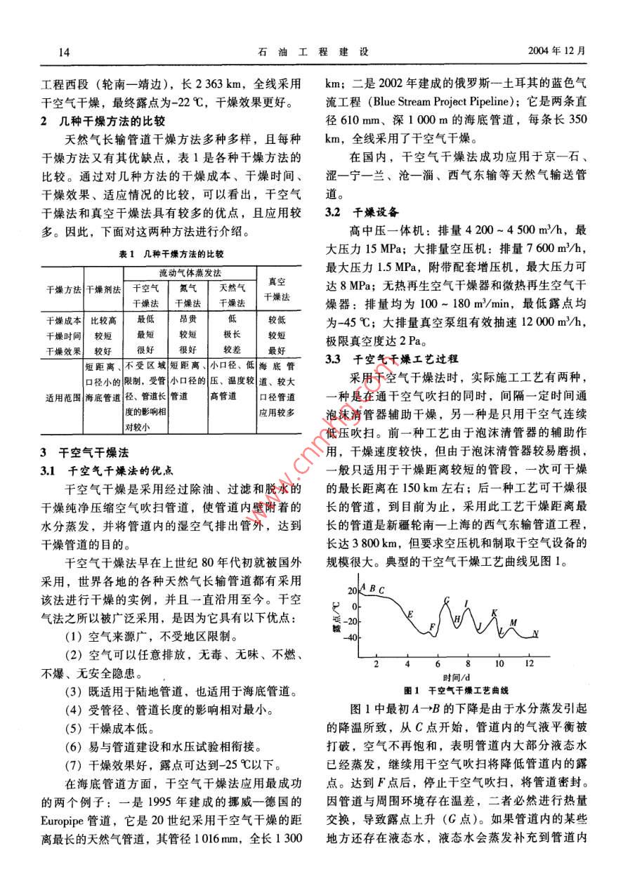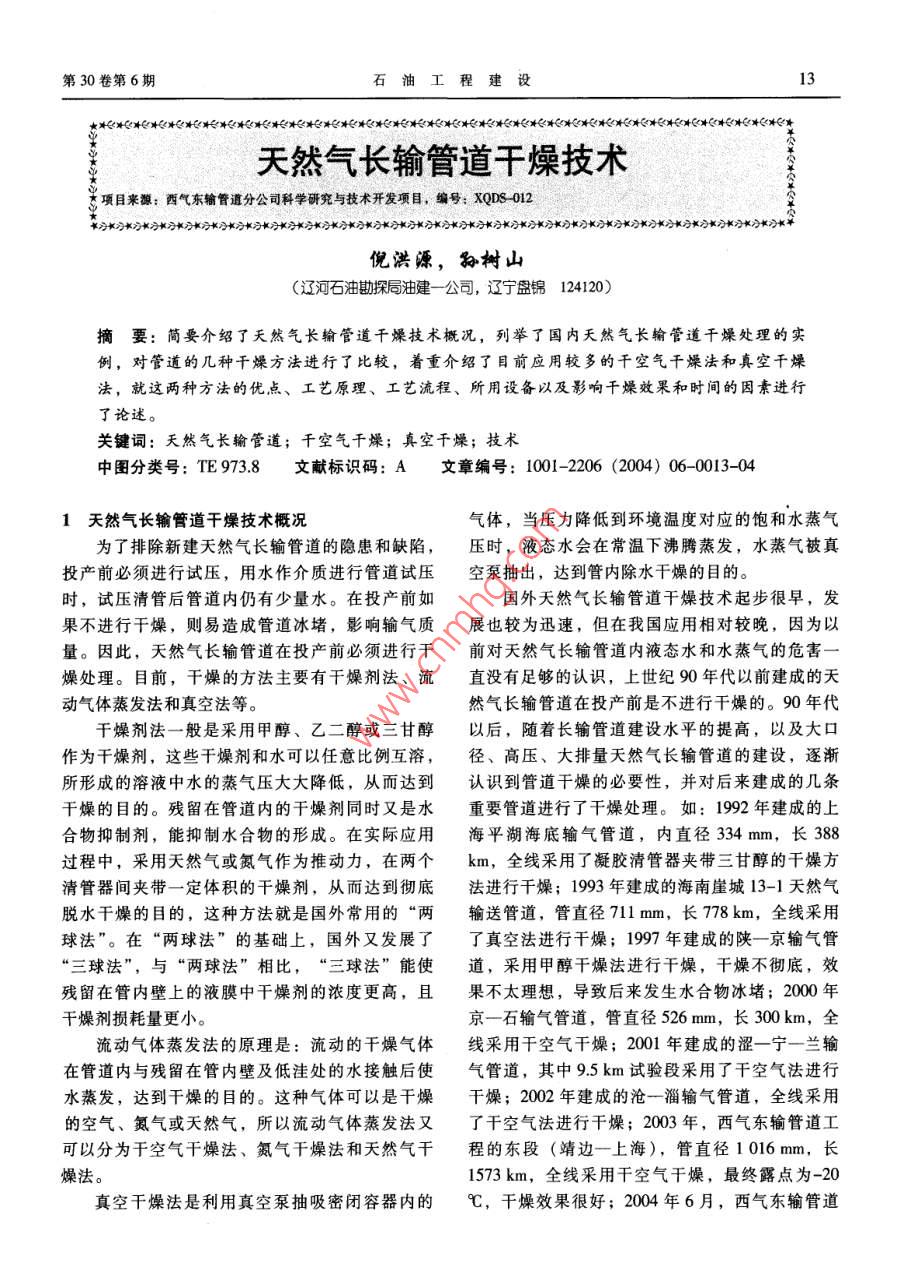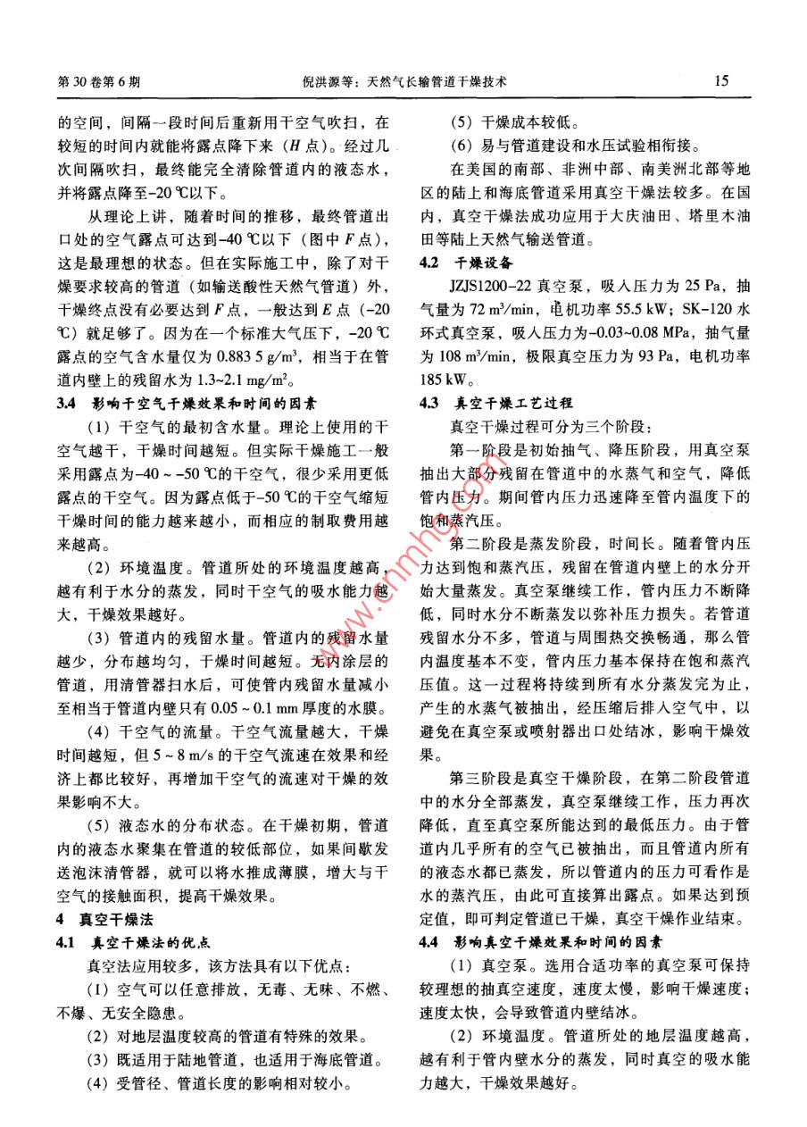 第30卷第6期石油工程建設(shè)★沖(()(*料*料**)《))白)*)料((日(料天然氣長輸管道干燥技術(shù)項(xiàng)目來源:西氣東輸管道分公司科學(xué)研究與技術(shù)開發(fā)項(xiàng)目,編號;XQDs012米小米小米小米示小*決**示*凈*示**小米小*示米習(xí)示米小示米*小*習(xí)*小*分**習(xí)*小**分*小*公*分*)*小*習(xí)**分*分*分倪洪源,孫樹山(遼河石油勘探同油建一公司,遼寧盤錦124120)摘要:簡要介紹了天然氣長輸管道干燥技術(shù)概況,列舉了國內(nèi)夭然氣長輪管道干燥處理的實(shí)例,對管道的幾種干燥方法進(jìn)行了比較,著重介紹了目前應(yīng)用較多的干空氣干燥法和真空干燥法,就這兩種方法的優(yōu)點(diǎn)、工藝原理、工藝流程、所用設(shè)備以及影響干燥效果和時(shí)間的因素進(jìn)行了論述。關(guān)鍵詞:天然氣長輸管道;干空氣干燥;真空干燥;技術(shù)中圖分類號:TE973.8文獻(xiàn)標(biāo)識碼:A文章編號:1001-2206(2004)06-0013-04天然氣長輸管道干燥技術(shù)概況氣體,當(dāng)壓力降低到環(huán)境溫度對應(yīng)的飽和水蒸氣為了排除新建天然氣長輸管道的隱患和缺陷,壓時(shí),液態(tài)水會在常溫下沸騰蒸發(fā),水蒸氣被真投產(chǎn)前必須進(jìn)行試壓,用水作介質(zhì)進(jìn)行管道試壓空泵抽出,達(dá)到管內(nèi)除水干燥的目的。時(shí),試壓清管后管道內(nèi)仍有少量水。在投產(chǎn)前如國外天然氣長輸管道干燥技術(shù)起步很早,發(fā)果不進(jìn)行干燥,則易造成管道冰堵,影響輸氣質(zhì)展也較為迅速,但在我國應(yīng)用相對較晚,因?yàn)橐粤?。因?天然氣長輸管道在投產(chǎn)前必須進(jìn)行干前對天然氣長輸管道內(nèi)液態(tài)水和水蒸氣的危害燥處理。目前,干燥的方法主要有干燥劑法、流直沒有足夠的認(rèn)識,上世紀(jì)90年代以前建成的天動氣體蒸發(fā)法和真空法等。然氣長輸管道在投產(chǎn)前是不進(jìn)行干燥的。90年代干燥劑法一般是采用甲醇、乙二醇或三甘醇以后,隨著長輸管道建設(shè)水平的提高,以及大口作為干燥劑,這些干燥劑和水可以任意比例互溶,徑、高壓、大排量天然氣長輸管道的建設(shè),逐漸所形成的溶液中水的蒸氣壓大大降低,從而達(dá)到認(rèn)識到管道干燥的必要性,并對后來建成的幾條干燥的目的。殘留在管道內(nèi)的干燥劑同時(shí)又是水重要管道進(jìn)行了干燥處理。如:1992年建成的上合物抑制劑,能抑制水合物的形成。在實(shí)際應(yīng)用海平湖海底輸氣管道,內(nèi)直徑334mm,長388過程中,采用天然氣或氮?dú)庾鳛橥苿恿?在兩個(gè)km,全線采用了凝膠清管器夾帶三甘醇的干燥方清管器間夾帶一定體積的干燥劑,從而達(dá)到徹底法進(jìn)行干燥;1993年建成的海南崖城13-1天然氣脫水干燥的目的,這種方法就是國外常用的“兩輸送管道,管直徑711mm,長778km,全線采用球法”。在“兩球法”的基礎(chǔ)上,國外又發(fā)展了了真空法進(jìn)行干燥;1997年建成的陜一京輸氣管“三球法”,與“兩球法”相比,“三球法”能使道,采用甲醇干燥法進(jìn)行干燥,干燥不徹底,效殘留在管內(nèi)壁上的液膜中干燥劑的濃度更高,且果不太理想,導(dǎo)致后來發(fā)生水合物冰堵;2000年干燥劑損耗量更小。京一石輸氣管道,管直徑526mm,長300km,全流動氣體蒸發(fā)法的原理是:流動的干燥氣體線釆用干空氣干燥;2001年建成的澀一寧一蘭輸在管道內(nèi)與殘留在管內(nèi)壁及低洼處的水接觸后使氣管道,其中9.5km試驗(yàn)段采用了干空氣法進(jìn)行水蒸發(fā),達(dá)到干燥的目的。這種氣體可以是干燥干燥;2002年建成的滄一淄輸氣管道,全線采用的空氣、氮?dú)饣蛱烊粴?所以流動氣體蒸發(fā)法又了干空氣法進(jìn)行干燥;203年,西氣東輸管道工可以分為干空氣干燥法、氮?dú)飧稍锓ê吞烊粴飧沙痰臇|段(靖邊一上海),管直徑1016mm,長燥法。1573km,全線采用干空氣干燥,最終露點(diǎn)為-20真空干燥法是利用真空泵抽吸密閉容器內(nèi)的℃,干燥效果很好;2004年6月,西氣東輸管道石油工程建設(shè)2004年12月工程西段(輪南一靖邊),長2363km,全線采用km;二是2002年建成的俄羅斯一土耳其的藍(lán)色氣干空氣干燥,最終露點(diǎn)為-22℃,干燥效果更好。流工程( Blue Stream Project Pipeline);它是兩條直2幾種干燥方法的比較徑610mm、深1000m的海底管道,每條長350天然氣長輸管道干燥方法多種多樣,且每種km,全線采用了干空氣干燥。干燥方法又有其優(yōu)缺點(diǎn),表1是各種干燥方法的在國內(nèi),干空氣干燥法成功應(yīng)用于京一石、比較。通過對幾種方法的干燥成本、干燥時(shí)間、澀一寧一蘭、滄一淄、西氣東輸?shù)忍烊粴廨斔凸芨稍镄Ч?、適應(yīng)情況的比較,可以看出,干空氣道。干燥法和真空干燥法具有較多的優(yōu)點(diǎn),且應(yīng)用較32千燥設(shè)備多。因此,下面對這兩種方法進(jìn)行介紹。高中壓一體機(jī):排量4200~4500m3/h,最表1幾種干燥方法的比較大壓力15MPa;大排量空壓機(jī):排量7600m3/h,流動氣體蒸發(fā)法最大壓力15MPa,附帶配套增壓機(jī),最大壓力可干燥方法干燥劑法干空氣氮?dú)馓烊粴庹婵者_(dá)8MPa;無熱再生空氣干燥器和微熱再生空氣干干燥法干燥法|干燥法干燥法燥器:排量均為100-180m3/min,最低露點(diǎn)均干燥成本比較高最低昂貴較低為-45℃;大排量真空泵組有效抽速12000m3/h,較短最短較短極長較短極限真空度