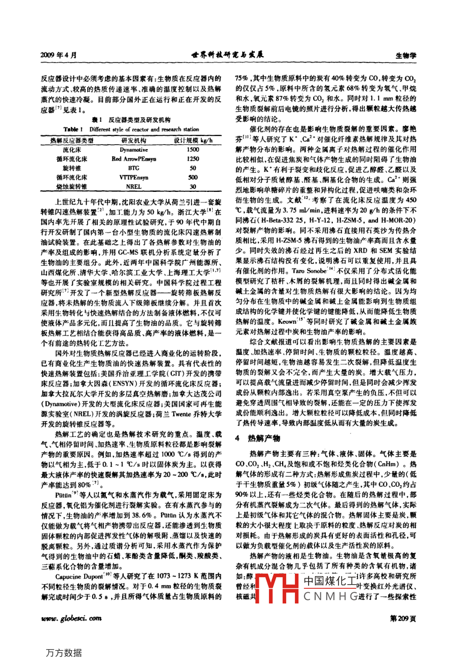 第31卷第2期世界科技研完與發(fā)晨Vol 31No. 22009年4月208-210頁WORLD SCI-TECH R&DApr.2009pp.20-210纖維素類生物質熱解研究進展王通洲高虹(沈陽理工大學環(huán)境與化學工程學院沈陽理工大學新型能源技術開發(fā)中心沈陽0163)要:從熱解的機理、工藝、反應器等方面綜述了國內外對纖雄煮是生物質熱解研究的現狀,討論了生物度熱解產物的組成及其理化特性,重點介紹了熱解制備生物油技術。生物油既可以作為燃料油直接燃燒又可以進一步通過加氫或者裂解制備其它精細化學品,還可以從中提取有用的化學原材料。因此纖維素類生物質熱解制取生物油技術被看作是最有發(fā)展前景的生物覆利用技術。關健詞:纖維素類生物質;熱解;生物油中圖分類號:Q65文獻標識碼:AResearch Progress in Cellulosic Biomass PyrolysisWANG Tongzhou GAO Hoog(School d Environmental and Chemical Engineering, Research& Center Development of New EnerwTechnology, Shenyang Ligong University, Shenyang 110168)Abstrac: This paper introduced the research progress of cellulosic biomass pyrolysis from the mechanism, the progess in the word and thereactor of biomass pyhe compositionand chemical characteristic o the pyrolysis product are discussed here. This paper alsofocused on pyrolysis techology which used to produce bio-oil. The bio-oil is not only used as fuel oil but also can be used to produce otherchemical productions by hydrogenation or cracking. So the cellulosic biomass pyrolysis technology is the one that has the most developingprospect.Key words: cellulos1引言解:半纖維素在25~350℃分解纖維素在325-375℃分解木質素在250~500℃進行分解2。通過熱重分析表明,生物質是地球上廣泛存在的可再生資源之一。纖維素生物質在熱解的初始階段(100℃左右)有輕微失重這和通類生物質是植物通過光合作用將空氣中的二氧化碳和水轉過工業(yè)分析所得生物質的水分含量能夠吻合。 Babu bv等化成的有機質。由于其具有產量巨大可再生性能進行碳人認為生物質熱解經過五步完成:第一步,來自加熱源的熱循環(huán)、可液化獲得液體燃料、可熱解獲得多種高附加值的化量預熱反應器內部生物質;第二步溫度繼續(xù)升高,生物質中學產品和生物油等優(yōu)點而成為國內外研究人員的研究熱的揮發(fā)成份釋放焦油形成;第三步熱量在熱的揮發(fā)成份和冷卻器之間進行傳導,沒有裂解的生物質隨揮發(fā)成份流出;纖維素類生物質主要指植物的秸稈如樹木農作物秸第四步揮發(fā)成份冷凝形成生物油沒有來得及冷凝的部分稈、草類以及工農業(yè)產品的廢料甘蔗渣橄欖渣等其主要成隨不可冷凝氣體排出;第五步,由于交互式的自催化作用生分是纖維素、半纖維素、木質素。目前對于纖維素類生物質物油在反應器內發(fā)生二次裂解。浙江大學王樹榮”等通過的處理方法主要有生物轉換法物理轉換法、熱化學轉換法,在線紅外分析認為裂解初期產物主要為酸類醇類酮類醛其中熱化學轉換包括直接燃燒、氣化熱解。直接燃燒僅能類酯類、水分和小分子氣體等隨后大分子物質又二次降解獲得生物質總能量的10-20%,采用新型設計的省柴灶能提為一氧化碳為主的氣體產物。Ana2等人認為纖維素在裂高到40-45%2,目前主要在農村被使用以及用于直燃發(fā)解初期先經過脫水作用形成脫水纖維素脫水纖維素進一步電。氣化可以獲得甲烷、一氧化碳、氫氣以及小分子氣態(tài)烴,分解產生大多數的炭和一些揮發(fā)物。但在相對稍高溫度下既可以直接燃燒提供熱量又可以做為原料合成甲醇等燃料。脫水纖維素解聚會產生左旋葡萄糖焦油的反應和其競爭熱解是在隔絕或少量供給氧氣的條件下,加熱生物質分解獲閃速熱解由于采用高升溫速率高反應溫度短的停留時間炭、液體油、氣體的過程。熱解產物炭可以做為生產活性使纖維素完全轉化為生物油和裂解氣慢速裂解則由于較長炭的原材料;液體生物油含有多種化工行業(yè)所必須的原材料的停留時間使得左旋葡萄糖主要轉化為炭26。以及高附加值的產品并改性后直接用于透平機;氣體可以合目前國內外對生物質熱解機理的研究都側重于采用熱成甲醇等燃料。通過熱解可以將低能量密度的生物質轉分析或者熱分析紅外聯用技術在線分析不同溫度下裂解產化為高能量密度的氣液固產品,便于儲存運輸。此外采用物但沒有深入研究纖維素、半纖維素、木質素的結構并從理纖維素類生物質做為熱解原料不僅不與民爭地與地爭糧,論上判斷化學鍵的斷裂情況從而為裂解產物提供理論上的還能利用農作物剩余物,因此熱解技術被看作是最有前景的分析生物質利用技術。中國煤化工CNMHG2熱解機理研究進展熱解反應器的研究是熱解技術的重點之一。熱解反應纖維素類生物質的三種成分通常被假設獨立地進行分器的類型和傳熱傳質方式直接影響熱解產物的分布。熱解第208頁100w. globes. com2009年4月世界研完與發(fā)晨生物學反應器設計中必須考慮的基本因素有:生物質在反應器內的75%,其中生物質原料中的炭有40%轉變?yōu)镃O,轉變?yōu)镃O2流動方式較高的熱質傳遞速率準確的溫度控制以及熱解的僅僅占5%,原料中所含的氫元素68%轉變?yōu)闅錃饧淄檎羝目焖倮淠?。目前部分國外正在運行和正在開發(fā)的反和水氧元素87%轉變?yōu)镃O2和水。同時對1.1mm粒徑的應器”見表1。生物質裂解前后電鏡的照片進行分析,得出顆粒越大傳熱越衰1反應器類型及研發(f