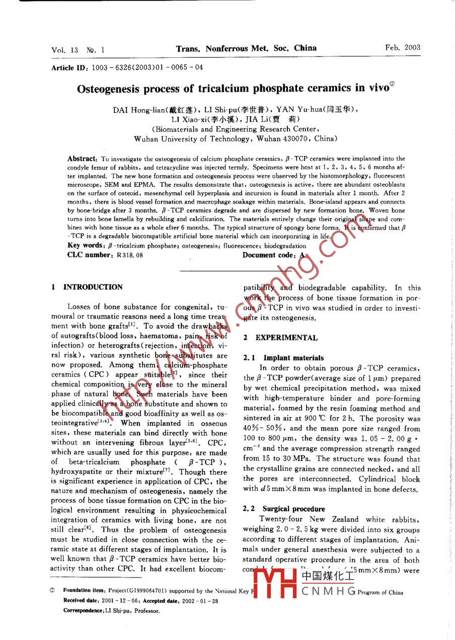 Vol. 13 No. 1Trans. Nonferrous Met. Soc. ChinaFeb. 2003Article ID: 1003 - 6326<2003>01 - 0065 - 04Osteogenesis process of tricalcium phosphate ceramics in vivoDAI Hong-lian(戴紅蓮), LI Shi pu(李世普), YAN Yu-hua(閆玉華),LI Xiao-xi(李小溪), JIA Li(賈莉)(Biomaterials and Engineering Research Center,W uhan University of Technology, w uhan 430070,China)Abstract: To investigate the osteogenesis o[ calcium phosphate ceramics, β -TCP ceramics were implented into thecondyle femur of rabbits, and tetracycline was injected termly. Specimens were host at 1, 2, 3, 4, 5, 6 months af-ter implanted. The new bone formation and osteogenesis process were observed by the histomorphology, fluorescentmicroscope, SEM and EPMA. The results demonstrate that, osteogenesis is active, there are abundant osteoblastson the surface of osteoid, mesenchymal cell hyperplasia and incursion is found in materials after 1 month. After 2months, there is blood vessel formation and macrophage soakage within materials. Bone island appears and connectsby bone-bridge after 3 months. β - TCP ceramics degrade and are dispersed by new formation bone. Woven boneturns into bone lamella by rebuilding and calcification. The materials entirely change theit original shape and com-bines with bone tissue as a whole after 6 months. The typical structure of spongy bone forms. It is confirmed that β-TCP is a degradable biocompatible artificial boneimaterial which can incorporating in life.Key words: β - tricalcium phosphate; osteogenesis; fluorescence; biodegradationCLC number: R318. 08Document code: A1 INTRODUCTIONpatibility and biodegradable capability. In thiswork the process of bone tissue formation in por-Losses of bone substance for congenital, tuous β -TCP in vivo was studied in order to investi-moural or traumatic reasons need a long time treat-gate its osteogenesis.ment with bone graftsl. To avoid the drawbacksof autografts(blood loss, haematoma, pain, risk of2 EXPERIMENTALinfection) or heterografts ( rejection, infection, viral risk), various synthetic bone substitutes are2.1 Implant materialsnow proposed. Among them, calcium-phosphateIn order to obtain porous β - TCP ceramics,ceramics ( CPC) appear suitable ,since theirthe β -TCP powder(average size of 1 μm) preparedchemical composition is very close to the mineralby wet chemical precipitation method, was mixedphase of natural bone. Such materials have beenwith high-temperature binder and pore-formingapplied clinically as a bone substitute and shown tomaterial, foamed by the resin foaming method andbe biocompatible and good bioaffinity as well as os-sintered in air at 900C for 2h. The porosity wasteointegrativeld.4. When implanted in osseous40%- 50%,and the mean pore size ranged fromsites, these materials can bind directly with bonewithout an intervening fibrous layerf's6]. CPC,100 to 800 μm, the density was 1. 05 -2.00g●which are usually used for this purpose, are madecm~d and the average compression strength rangedbeta-tricalcium phosphate ( β- TCP ),from 15 to 30 MPa. The structure was found thathydroxyapatite or their mixture!1]. Though therethe erystalline grains are connected necked, and allis significant experience in application of CPC, thethe pores are interconnected. Cylindrical blocknature and mechanism of osteogenesis, namely thewith d 5 mmX 8 mm was implanted in bone defects.process of bone tissue formation on CPC in the bio-logical environment resulting in physicochemical2.2 Surgical procedureintegration of ceramics with living bone, are notTwenty-four New Zealand white rabbits, .still clear[0. Thus the problem of osteogenesisweighing 2.0- 2. 5 kg were divided into six groupsmust be studied in close connection with the ce-according to different stages of implantation. Ani-ramic state at different stages of implantation. It is mals under general anesthesia were subjected to awell known that日-TCP ceramics have better bio-standard operative procedure in the area of bothactivity than other CPC. It had excellent biocom-中國煤化工5mmX8mm) were .a Foundation iten: Pee1990470) sppred by the Vational Key FTYHCNMHGProgramofChineReelved date: 2001 - 12 - 06; Accepted dale; 2002- 01 -28Correspodence;Ll Shi-pu, Professor.Trans. Nonferrous Met. Soc. ChinaFeb. 2003created with a dental drill perpendicular to the longpeared in the center of masses(Fig. 1). Osteoidsaxis of the femoral shaft. Following press fit of theand thickened trabeculae of bone almost completelyceramic blocks were inserted into the defects. Eachflled the outside of ceramie pores after two .animal was implanted with two cylinders. In eachmonths. More deep pores were flled by wovengroup, one rabbit was not be implanted acted as abone and partially mineralized matrix. There wascontrol. One rabbit from each experiment group .blood vessel formation and macrophage soakageand control group were injected twice with 15%within materials, and the osteoid turned into la-tetracycline(30 mg" kg ) liquor before sacrificed.mella bone through calcification. After threeAfter1,2,3,4,5or6months,aswellasthemonths, thickened trabeculae and dense plates ofcontrol group, the implants and the surroundinglamellar bone were deterred in all pores of the ce-tissue were excised and placed into 10% bufferedramic block. The bone ingrowth patterns resem-formalin solution or 2. 5% buffered glutaraldehydebled Haversian canal structures instead of wovensolution.bone structures by rebuilding. Bone-island ap-peared and connected by bone -bridge. A great deal2.3 Histologic studyof medullary tissue has grown into the lacunae ofFor un-decalcified sections, six fixed speeci-the materials after four months. After six months,mens from each group were dehydrated in an etha-the residual materials are surrounded by bony tis-nol scries, and then embedded in methylmethacry-sue(Fig. 2). Prior to and during bone formation,late. Three specimens were cut into 5 μm sectionsthe number of osteoclast-like multinucleated giantin thicknes