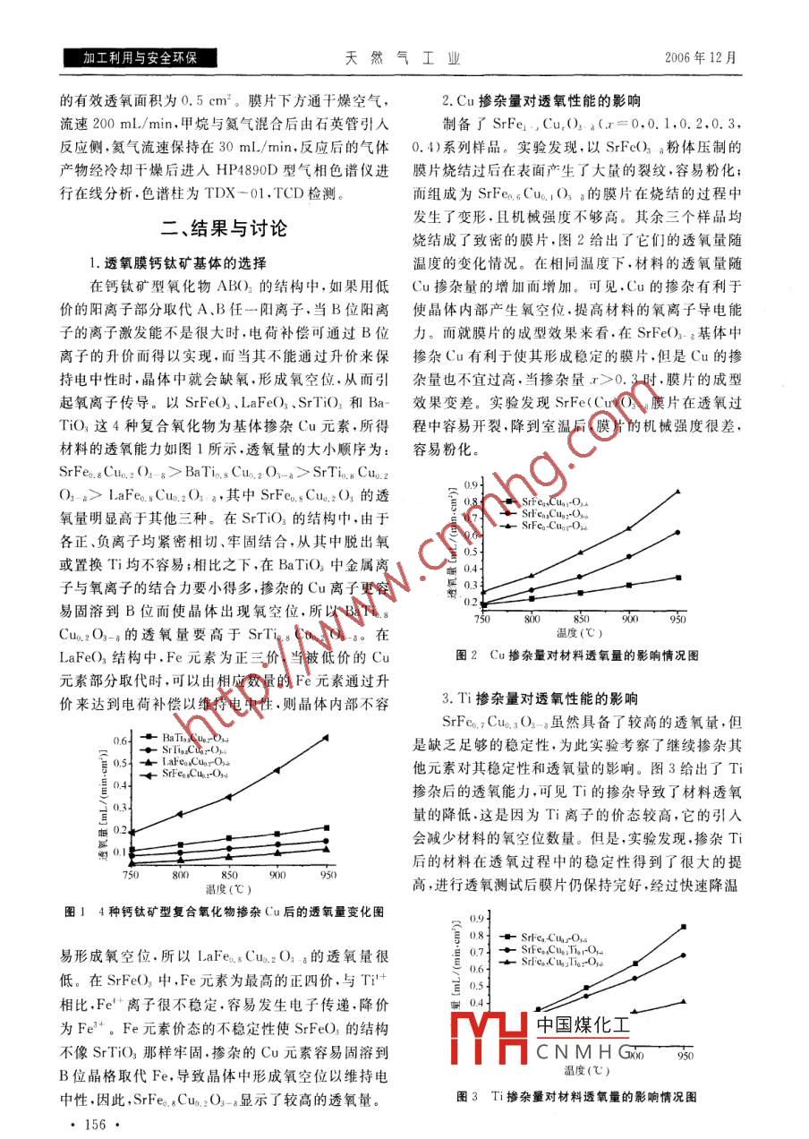 第26卷第12期天然氣工業(yè)加工利用與安全環(huán)保高溫氧滲透膜反應(yīng)器中的甲烷部分氧化制合成氣張恒1董新法1林維明(1.華南理工大學化工與能源學院2.廣州大學化學化工學院)張恒等.高溫氧滲透膜反應(yīng)器中的甲烷部分氧化制合成氣.天然氣工業(yè),2006,26(12):155-15摘要采用固相反應(yīng)法合成了Cu摻雜的高溫氧滲透膜材料,并用于甲烷部分氧化制合成氣反應(yīng)過程。探討了鈣鈦礦苤體氣化物、離子摻雜以及膜片燒結(jié)溫度等對材料透氧性能的影響,并考察了膜催化反應(yīng)器內(nèi)的甲烷部分氧化反應(yīng)情況。結(jié)果表明,在4種復合氧化物基體中摻雜Cu得到的透氧量的大小願序為:SrFe(Cu)O->BaTi(Cu)O3-a>SrTi(Cu)O3-8>LaFe(Cu)O3-。SrFe(Cu)O3-8系列材料顯示了很高的透氧能力,透氧量隨Cu含量的增加而增大,繼續(xù)摻雜Ti可以提高穩(wěn)定性,但是透氧量會隨Ti含量的增加而降低。Cu和T對 SrFeo2-8基體共摻雜能夠制得具有高透氧量和穩(wěn)定性的透氧膜。在SrFe. s Cuo, Tio.O2-a膜催化反應(yīng)器內(nèi),850℃時,甲烷轉(zhuǎn)化率達到85%以上,一氧化碳選擇性在90%以上,膜片透氧量達到5mL/(min·cm2)主題詞膜分離鈣鈦礦反應(yīng)器甲烷部分氧化合成氣轉(zhuǎn)化率選擇性銅鈦目前,天然氣的化工利用主要是通過間接轉(zhuǎn)化,即純的SrCO3、BaCO3、La2O3、Fe2O3、CuO、TiO2,按照先由天然氣轉(zhuǎn)化成合成氣,再由合成氣生產(chǎn)下游產(chǎn)品?;瘜W計量比準確稱取所需組分,混合均勻后加入乙甲烷部分氧化制合成氣工藝以其能耗低、反應(yīng)速度快、醇,研磨后在900℃下預燒5h,再次研磨后于1100條件溫和等優(yōu)點得到了人們的廣泛關(guān)注2。近年來,℃下反應(yīng)5h,升降溫速率為2℃/min。甲烷部分氧有許多研究將高溫氧滲透膜應(yīng)用到甲烷部分氧化反應(yīng)化反應(yīng)采用NiCe/yAl2O3催化劑,其制備方法見過程中,使得制氧過程與催化部分氧化過程耦合在一參考文獻。個反應(yīng)器中完成,它利用透氧膜的選擇滲透性為反應(yīng)提2.膜片的制備供純氧,省去了空分設(shè)備,可以顯著地減少能耗,降低操研磨所得粉體,取小于200目的粉體,添加作成本。此工藝過程的核心部件高溫氧滲透膜是一類PVA造粒后采用不銹鋼模具成型,在200MPa下壓同時具有氧離子導電性能與電子導電性能的陶瓷材料,成直徑為20mm、厚度為2mm左右的原片。將原在高溫下,當膜兩側(cè)存在氧濃度梯度時,晶體中的氧離片在1200℃燒結(jié)5h,升降溫速率為2℃/min,最后子由高氧壓區(qū)向低氧壓區(qū)傳導同時電子朝相反的方向得厚度1.5mm左右、直徑17~19mm的致密膜片傳導。目前, Sr-Fe-Co0系列高溫氧滲透膜材料得到了3.透氧性能測試最為廣泛的關(guān)注,如 SaFeco.50,Ba0 s Sro,s co3Fe2采用穩(wěn)態(tài)法測試樣品的透氧量。膜片與石英管O3_a③等在甲烷部分氧化反應(yīng)條件下顯示了較高的透之間通過金圈密封。膜片的一端通干燥空氣,流速氧能力。有研究表明,在鈣鈦礦結(jié)構(gòu)中摻雜Cu可以200mL/min,另一端通高純氦氣,流速35mL/min產(chǎn)生大量的氧空位,提高材料的透氧能力。另外,以Cu尾氣經(jīng)六通閥進入HP4890D型氣相色譜儀進行氧元素替代Co元素還可降低原料成本。為此,筆者開發(fā)含量分析,在進入色譜檢測以前通入很小流量的了一系列Cu摻雜的高溫氧滲透膜材料,并組裝了膜反CH4作為內(nèi)標定量,TCD檢測,色譜柱為5A分子應(yīng)器,考察了氧滲透膜反應(yīng)器內(nèi)的甲烷部分氧化反應(yīng)。篩,進行可能的氮氧分離。、實驗部分4.膜反應(yīng)器中的甲烷部分氧化透氧膜粉體采用固相反應(yīng)法合成,原料為分所子膜反應(yīng)實驗時,先將厚度為15m的膜1.透氧膜粉體及催化劑的制備HH中國煤化工度為850℃時,將CNMHG膜的上表面,膜片本研究為廣東省自然科學基金項目(編號:030514)和廣東省科技計劃項目(編號:2004B33401006)研究成果。作者簡介:張恒,1979年生,博士研究生。地址:(510640)廣東省廣州市。電話:(020)88371667E-mails:tmne@126.com加工利用與安全環(huán)保天然氣工業(yè)2006年12月的有效透氧面積為0.5cm2。膜片下方通干燥空氣,2.Cu摻雜量對透氧性能的影響流速200mL/min,甲烷與氦氣混合后由石英管引入制備了SrFe1,Cu,O)2a(x=0,0.1,0.2,0.3反應(yīng)側(cè),氦氣流速保持在30mL/min,反應(yīng)后的氣體0.4)系列樣品。實驗發(fā)現(xiàn),以 SrFc)3a粉體壓制的產(chǎn)物經(jīng)冷卻干燥后進入HP4890D型氣相色譜儀進膜片燒結(jié)過后在表面產(chǎn)生了大量的裂紋,容易粉化行在線分析,色譜柱為TDX-01,TCD檢測。而組成為SrFe.6Cu.,O4a的膜片在燒結(jié)的過程中二、結(jié)果與討論發(fā)生了變形,且機械強度不夠高。其余三個樣品均燒結(jié)成了致密的膜片,圖2給出了它們的透氧量隨1.透氧膜鈣鈦礦基體的選擇溫度的變化情況。在相同溫度下,材料的透氧量隨在鈣鈦礦型氧化物ABO3的結(jié)構(gòu)中,如果用低Cu摻雜量的增加而增加??梢?Cu的摻雜有利于價的陽離子部分取代A、B任一陽離子,當B位陽離使晶體內(nèi)部產(chǎn)生氧空位,提高材料的氧離子導電能子的離子激發(fā)能不是很大時,電荷補償可通過B位力。而就膜片的成型效果來看,在 SrFc)-a基體中離子的升價而得以實現(xiàn),而當其不能通過升價來保摻雜Cu有利于使其形成穩(wěn)定的膜片,但是Cu的摻持電中性時,晶體中就會缺氧,形成氧空位,從而引雜量也不宜