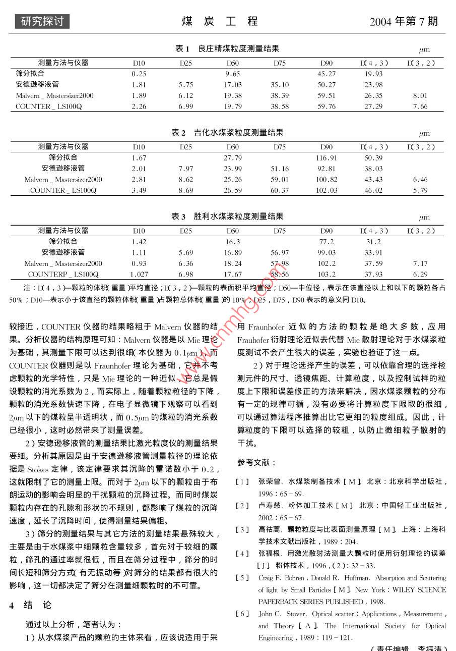 究探討煤炭工程2004年第7期水煤漿粒度測試技術(shù)的比較研究王仁哲,張榮曾,徐志強(qiáng),黃鎮(zhèn)中國礦業(yè)大學(xué)化學(xué)與環(huán)境工程學(xué)院,北京100083)摘要:粒度級配技術(shù)是水煤漿制漿技術(shù)的關(guān)鍵,快速準(zhǔn)確地測量水煤漿中煤粒旳粒度分布是實現(xiàn)這一技術(shù)的基礎(chǔ);目前最為流行的測量方法是激光粒度儀,其理論依據(jù)主要有 Fraunbofer衍射理論和Mie散射理論;論文通過試驗比較,系統(tǒng)研究了各種常用測量方法的特點。關(guān)鍵詞:水煤漿,粒度測試,Mie散射, Fraunhofer衍射中圖分類號:TQ536.9文獻(xiàn)標(biāo)識碼:A文章編號:1671-09592004)7-005403Experiment and Analysis of Sizing Particles in Coal-Water Slurry FuelWANG Ren-zhe, ZHANG Rong- zeng, XU Zhi-qiang, HUANG ZhenSchool of Chemical and Environmental Engineering, CUMT, Beijing 100083, China)Abstract: The sizes graduation is one of key technology of making the coal-water slurry fuel whichbasis is that the size distribution of particles are measured in coal- water slurry fuel quickly andaccurately At present the popular measurement is the laser size instrument, which theoreticalfoundation are classified the fraunhofer diffraction theory and the mie scattering theory This paperpresents some common measurement methods and laboratorial results to various samples, illustratesthat the Fraunhofer theory could approximately substitute the Mie theory applied to sizing the particlesin coal- water slurry fuelKeywords: coal -water slurry fuel i sizes measurement the Mie scattering the Fraunhoferraction水煤漿的粒度分布特點煤基工業(yè)燃料1水煤漿的粒度級配是制備水煤漿的關(guān)鍵技術(shù)之一;粒中國是一個以煤為主要能源的國家,煤炭資源十分豐度分布中各粒級的配比稱″級配″,只有級配合理,大小顆富,煤炭是我囯的主要能源;由于直接燃煤污染嚴(yán)重,開粒才能相互充填,減少空隙率,提高固體容積濃廚即堆積發(fā)制備和利用水煤漿一直是近年來煤炭加工、合理利用煤率),才能少用水,制出流動性好的高濃度水煤漿(如圖1炭資源的一項主攻方向。水煤漿是一種由35%左右的水,所示)因此,測定現(xiàn)場水煤漿粒度分布是間接監(jiān)控水煤5%左右的煤以及1%~2%的添加劑混合制備而成的流體漿質(zhì)量的一個重要手段。只有大顆粒充填了小顆粒充填了更小顆粒圖1水煤漿粒度級配充填示意圖收稿日期:2004-01-082004年第7期煤炭工程研究探討射被測粒子場,通過光學(xué)傅立葉透鏡變換聚焦,利用環(huán)形2水煤漿粒度測試技術(shù)現(xiàn)狀光電探測器陣列,在多個空間立體角范圍內(nèi)采集其散射光在實踐中,測量水煤漿粒度分布的方法有很多,其中能信號,再經(jīng)過反演計算后求得被測顆粒的粒徑大小和分包括篩分法、沉降法、激光法、小空通過法等等2。目前布范圍在水煤漿制漿廠中應(yīng)用最多的技術(shù)是激光法,激光粒度儀以其快速、準(zhǔn)確、測量范圍廣、無接觸、不對被測顆粒形beam expand成破壞和易于實現(xiàn)在線檢測而被廣泛地應(yīng)用在目前的粒度測量領(lǐng)域LASE2.1篩分法的特點和局限性篩分法就是將粉末樣品通過一系列不同篩孔的標(biāo)準(zhǔn)篩分離成若干個粒級。分別稱重,求得以重量百分?jǐn)?shù)表示的diffracted rny粒度分布。圖2激光粒度儀原理示意圖篩分分析方法簡單,可以直接得到粒度分布的直方圖,但操作時噪聲大,衛(wèi)生條件不好,用樣量大;而且由于使早期的產(chǎn)品一般根據(jù) Fraunhofer衍射原理,但由于它用的篩數(shù)有限,其結(jié)果精度不高,尤其不適宜對細(xì)顆粒測是散射理論對大顆粒的近似,這種儀器的測量范圍受到量,甚至不可能。目前,篩分法僅限于測量大顆粒的粒度定的限制。但其原理簡單、計算數(shù)據(jù)量小、測量速度快的分布。特點仍然使其有較為廣泛的應(yīng)用,特別是應(yīng)用在要求在線2.2沉降法的特點和局限性測量的場合。至于其測量精度,由于粒度測量本身的特點沉降法就是當(dāng)顆粒在重力場中沉降時,利用 Stokes沉(測不準(zhǔn)”無真值"η4]),在其原理認(rèn)可的測量范圍內(nèi),不降速度公式,測量顆粒群在流體介質(zhì)中,特別是在液體中可說之不”精確"。而且,儀器的測量精度除與其原理依據(jù)沉降速度的變化,求岀粒度分布,從而得到累積粒度分布。的正確性與否有關(guān)以外,還與數(shù)據(jù)分析方法、計算方法、粒度分布測量的各種方法中,以沉降法這一大類應(yīng)用實驗條件的滿足等許多條件有關(guān),其中,計算理論的選擇最廣,主要有移液管、沉降天平、光透重力沉降儀、光透和可實現(xiàn)性以及可能帶來的誤差最為復(fù)雜,而往往不是選離心沉降儀、X射線沉降儀。其中,移液法裝置簡單價廉,擇一個理論依據(jù)這么簡單的事情。而且其測量重量累積分?jǐn)?shù)是直接的除篩分法外其他常用方法都是間接的),若仔細(xì)操作結(jié)果相當(dāng)精確,精度在1%左3幾種測量方法的試驗比較右。1980年發(fā)表的歐洲經(jīng)濟(jì)共同體對于粒度分布各種測量3.1試驗裝置方法比較的國際研究中,就是將 Andreason移液管作為比1)篩分法:選擇帶有800Mesh細(xì)篩孔的套篩,采用較的標(biāo)準(zhǔn)3超聲濕篩的方法;實驗結(jié)果進(jìn)行擬合優(yōu)化。本方法在測量過程中伴隨著顆粒的分級過程,即大顆沉降法:利用安德遜移液管沉降分析儀,進(jìn)行粒先沉降,小顆粒后沉