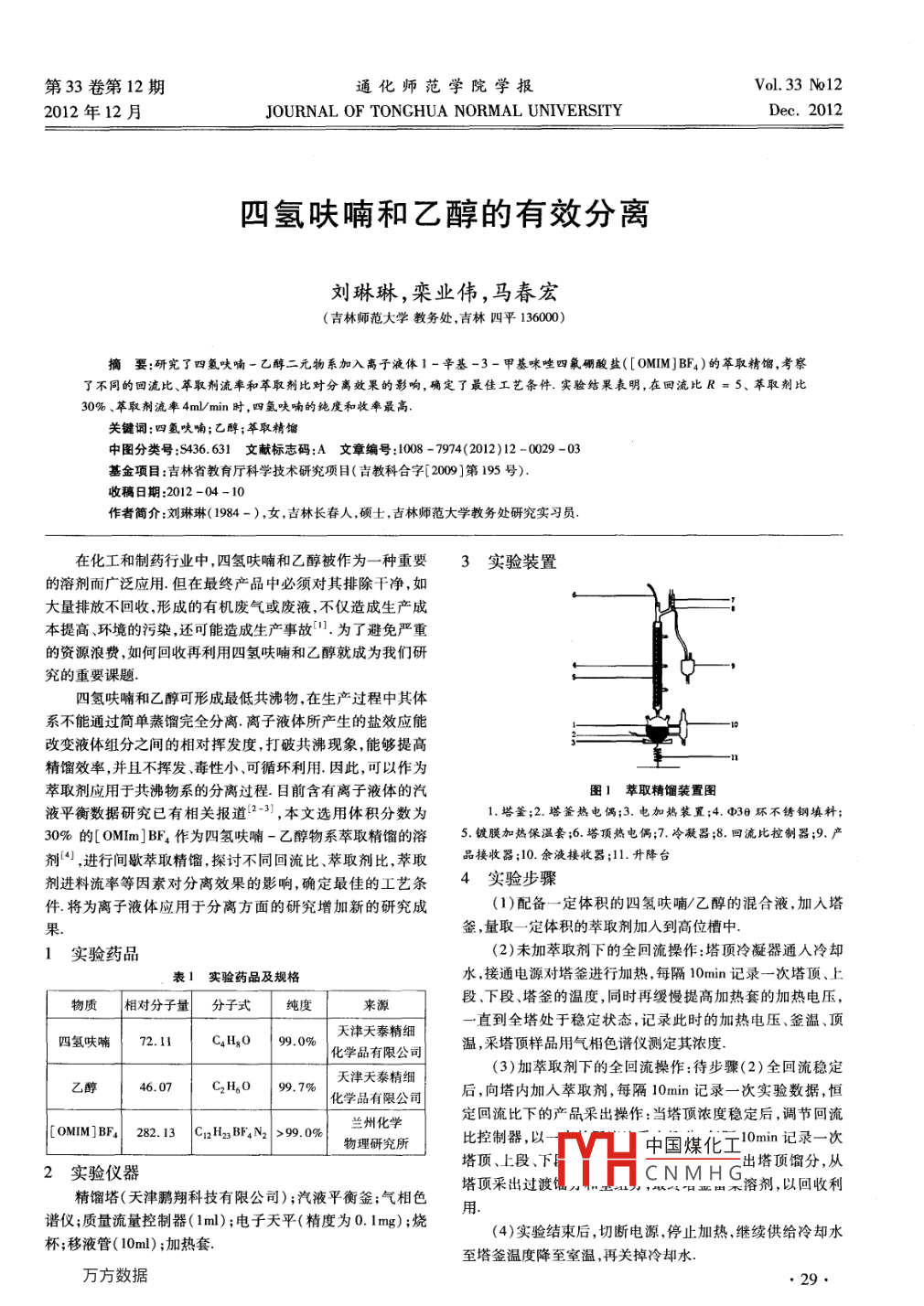 第33卷第12期通化師范學(xué)院學(xué)報(bào)Vol 33 No 122012年12月JOURNAL OF TONGHUA NORMAL UNTVERSITYDec.2012四氫呋喃和乙醇的有效分離劉琳琳,欒業(yè)偉,馬春宏(吉林師范大學(xué)教務(wù)處,吉林四平136000摘要:研究了四氫呋喃-乙醇二元物系加入離子液體1-辛基-3-甲基咪唑四氟硼酸鹽([ OMIM]BF4)的萃取精餾,考察了不同的回流比、萃取劑流率和萃取劑比對(duì)分離效果的影響,確定了最佳工藝條件.實(shí)驗(yàn)結(jié)果表明,在回流比R=5、萃取劑比30%、萃取劑流率4ml/min時(shí),四氬呋喃的純度和收率最高關(guān)鍵詞:四呋喃;乙醇;萃取精餾中圖分類號(hào):S436.631文獻(xiàn)標(biāo)志碼:A文章編號(hào):1008-7974(2012)12-0029-03基金項(xiàng)目:吉林省教育廳科學(xué)技術(shù)研究項(xiàng)目(吉教科合字[2009第195號(hào))收稿日期:2012-04-10作者簡(jiǎn)介:劉琳琳(1984-),女,吉林長(zhǎng)春人,碩士,古林師范大學(xué)教務(wù)處研究實(shí)習(xí)員在化工和制藥行業(yè)中,四氫呋喃和乙醇被作為一種重要3實(shí)驗(yàn)裝置的溶劑而廣泛應(yīng)用.但在最終產(chǎn)品中必須對(duì)其排除干凈,如大量排放不回收,形成的有機(jī)廢氣或廢液,不僅造成生產(chǎn)成本提高、環(huán)境的污染,還可能造成生產(chǎn)事故.為了避免嚴(yán)重的資源浪費(fèi),如何回收再利用四氫呋喃和乙醇就成為我們研究的重要課題四氫呋喃和乙醇可形成最低共沸物,在生產(chǎn)過程中其體系不能通過簡(jiǎn)單蒸餾完全分離.離子液體所產(chǎn)生的鹽效應(yīng)能改變液體組分之間的相對(duì)揮發(fā)度,打破共沸現(xiàn)象,能夠提高精餾效率,并且不揮發(fā)、毒性小、可循環(huán)利用.因此,可以作為萃取劑應(yīng)用于共沸物系的分離過程.目前含有離子液體的汽圖1萃取精餾裝置圖液平衡數(shù)據(jù)研究已有相關(guān)報(bào)道2-3),本文選用體積分?jǐn)?shù)為塔釜;2.塔釜熱電偶;3.電加熱裝置;4.Φ3θ環(huán)不銹鋼填料30%的[OMm]BF4作為四氫呋喃-乙醇物系萃取精餾的溶膜加熱保溫套;6,塔頂熱電偶;7冷器;8.回流比控制器;9.產(chǎn)劑“,進(jìn)行間歇萃取精餾探討不同回流比、萃取劑比,萃取品接收器;10.余液接收器;11.升降臺(tái)劑進(jìn)料流率等因素對(duì)分離效果的影響,確定最佳的工藝條實(shí)驗(yàn)步驟件將為離子液體應(yīng)用于分離方面的研究增加新的研究成(1)配備一定體積的四氫呋喃/乙醇的混合液,加入塔果釜,量取一定體積的萃取劑加入到高位槽中1實(shí)驗(yàn)藥品(2)未加萃取劑下的全回流操作:塔頂冷凝器通入冷卻表1實(shí)驗(yàn)藥品及規(guī)格水,接通電源對(duì)塔釜進(jìn)行加熱,每隔10min記錄一次塔頂、上物質(zhì)相對(duì)分子量分子式純度段、下段、塔釜的溫度,同時(shí)再緩慢提高加熱套的加熱電壓一直到全塔處于穩(wěn)定狀態(tài),記錄此時(shí)的加熱電壓、釜溫、頂四氫呋喃72.11C1O90%天津天泰精細(xì)化學(xué)品有限公司溫,采塔頂樣品用氣相色譜儀測(cè)定其濃度(3)加萃取劑下的全回流操作:待步驟(2)全回流穩(wěn)定乙醇C2H2O99.7%天津天泰精細(xì)化學(xué)品有限公司后,向塔內(nèi)加入萃取劑,每隔10min記錄一次實(shí)驗(yàn)數(shù)據(jù),恒[OMM]BF42832.13Cn2H2BF4N2|>990%/,三州化學(xué)定回流比下的產(chǎn)品采出操作:當(dāng)塔頂濃度穩(wěn)定后,調(diào)節(jié)回流物理研究所比控制器中國(guó)煤化工0mn記錄一次2實(shí)驗(yàn)儀器塔頂、上段、下出塔頂餾分,從塔頂采出過渡信CNMH精餾塔(天津鵬翔科技有限公司);汽液平衡釜;氣相色口出不溶劑,以回收利譜儀;質(zhì)量流量控制器(lml);電子天平(精度為0.1mg);燒用(4)實(shí)驗(yàn)結(jié)束后,切斷電源,停止加熱,繼續(xù)供給冷卻水杯;移液管(10ml);加熱套至塔釜溫度降至室溫,再關(guān)掉冷卻水295實(shí)驗(yàn)結(jié)果82,55.1回流比對(duì)分離效果、塔頂餾分純度和收率的影響8281,5四氫呋嘲濃(1)常規(guī)間歇精餾過程中塔頂、上段、下段和塔釜溫度隨8180.596.5時(shí)間的變化.變化如圖2所示海輛蜂78.5圖4回流比對(duì)塔頂餾出物濃度和收率的影響5.2萃取劑比對(duì)分離效果的影響參照上述分析方法,保持回流比R=5,分別探討萃取圖2間歇精餾塔溫度隨蓍時(shí)間的變化由圖2可以看出,塔頂、塔上段、塔下段和塔釜溫度,都劑比為10%、20%、30%時(shí),常規(guī)間歇精餾過程中塔頂、上段隨精餾時(shí)間的增加而增加,塔釜溫度最高,上段和下段溫度下段和塔釜溫度隨時(shí)間的變化,以及塔頂產(chǎn)品組成隨塔頂溫次之,塔頂溫度最低當(dāng)R=4時(shí),四氫呋喃的主要流出時(shí)間度和精餾時(shí)間的變化,計(jì)算四氫呋喃和乙醇的回收率表4產(chǎn)品回收率計(jì)算表為50~150min,塔頂溫度在62.1~75.9℃內(nèi),塔頂溫度63.4℃,精餾時(shí)間在100min,塔頂流出的四氫呋喃的濃度最不同萃取劑比總量四氫呋喇采出回收率%133.54高可達(dá)到94.89%;當(dāng)R=5時(shí),當(dāng)精餾時(shí)間達(dá)到50min后塔內(nèi)處于全回流的穩(wěn)定狀態(tài),此時(shí)塔頂溫度保持在58.5135.0l80.3663.7℃范圍內(nèi),此狀態(tài)一直持續(xù)到140min左右結(jié)束,塔頂溫2001386825度63.1℃,精餾時(shí)間在90min,塔頂流出的四氫呋喃的濃度最高可達(dá)到98.54%;當(dāng)R=7時(shí),精餾開始的第40分鐘到第97590分鐘內(nèi),塔頂溫度穩(wěn)定于61.9~66.2℃之間,此時(shí)四氫呋喃大量的