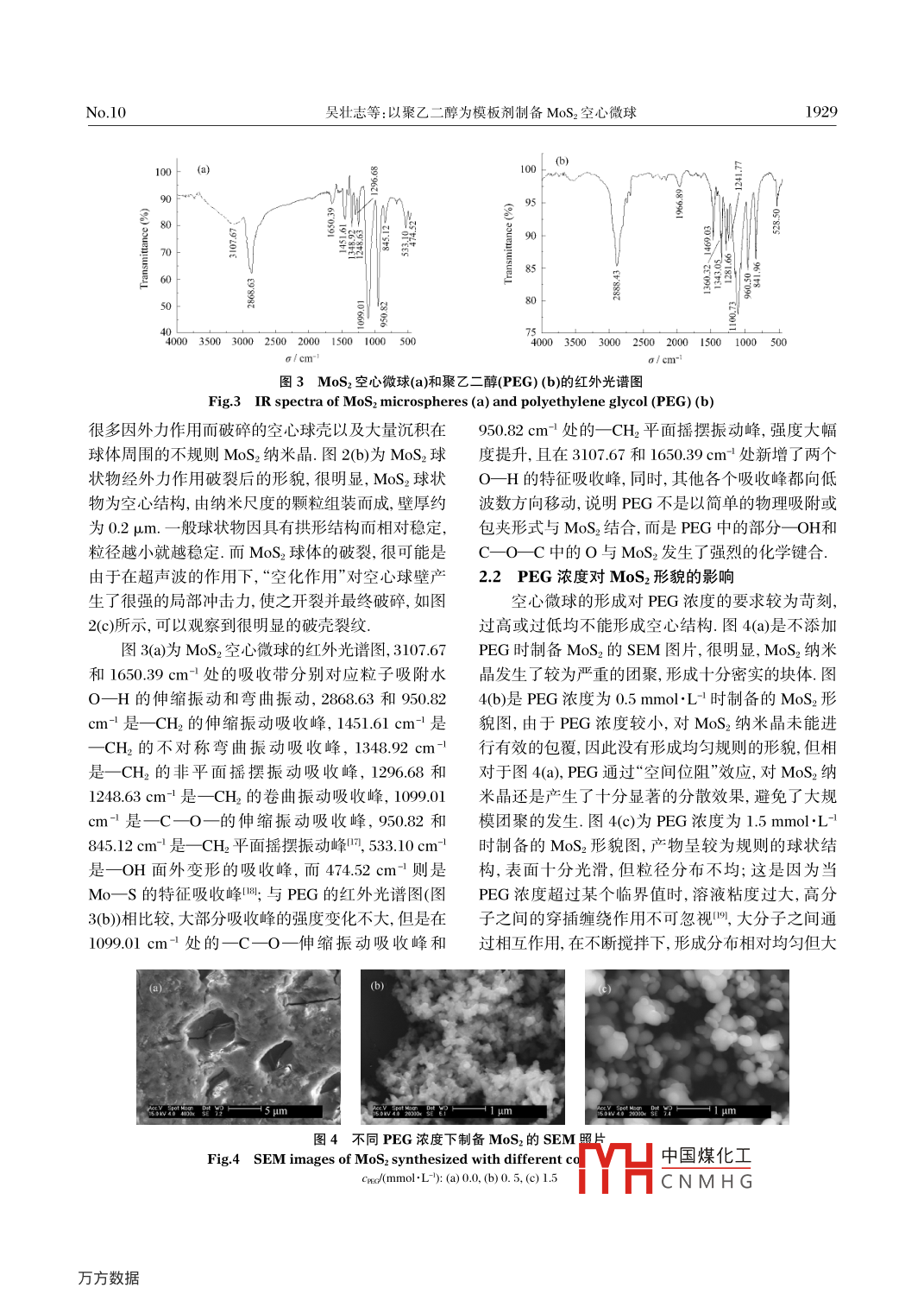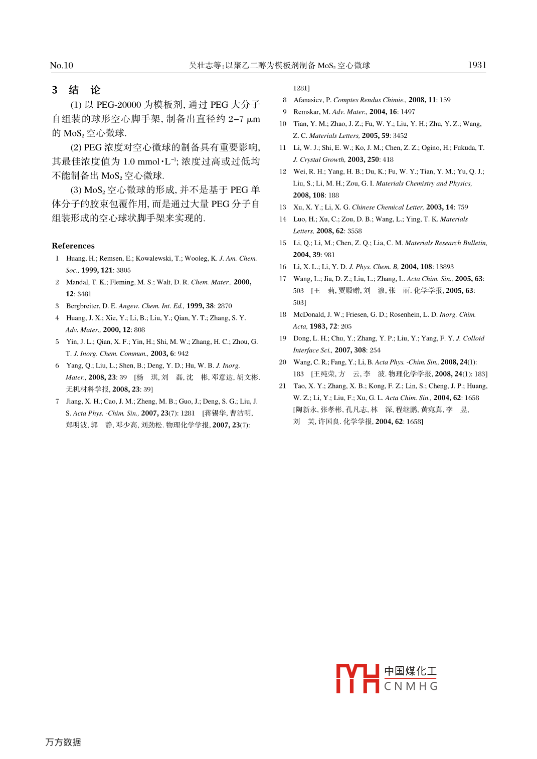 物理化學(xué)學(xué)報(bào)(Wuli Huaxue Xuebao)OctoberActa Phys. -Chim. Sin, 2008, 24(10): 1927-19311927www.whxb.pku.edu.cn以聚乙二醇為模板劑制備MoS2空心微球吳壯志王德志徐兵(中南大學(xué)材料科學(xué)與工程學(xué)院,長(zhǎng)沙410083)摘要:以聚乙二醇(PEG)為模 板劑,采用軟模板法制備出MoS2空心微球,并采用x射線衍射儀(XRD)、紅外光譜儀(IR)和掃描電子顯微鏡(SEM)對(duì)產(chǎn)物進(jìn)行表征.結(jié)果表明,所制備的MoS,為粒徑約2- -7 μm的空心微球,但結(jié)晶程度較差,需通過(guò)退火工藝進(jìn)行改善;聚乙二醇與MoS2發(fā)生了較為強(qiáng)烈的有機(jī)無(wú)機(jī)雜化作用,其濃度和分子量對(duì)產(chǎn)物形貌調(diào)控均有重要影響.同時(shí),結(jié)合紅外光譜分析,對(duì)MoS2空心微球的形成機(jī)理進(jìn)行了初步的探討.關(guān)鍵詞: MoS; 軟模板法; 空心微球, 聚乙二醇中圖分類(lèi)號(hào): 0648; O614Preparation of Hollow MoS2 Microspheres by Addition ofPEG as TemplateWU Zhuang-ZhiWANG De-Zhi*XU Bing(School of Materials Science and Engineering, Central South University, Changsha 410083, P. R. China)Abstract: Hollow MoS2 microspheres were synthesized via soft template method with polyethylene glycol (PEG) astemplate. The as-prepared samples were characterized with X-ray diffraction (XRD), infrared spectrometer (IR), andscanning electron microscopy (SEM). The results indicated that the as -prepared MoS2 was hollow microspheres withdiameter of 2-7 pμm and had poor crsallinity, which could be improved by calcination. There was strong organic-inorganic hybridization between polyethylene glycol and MoS. Furthermore, both the concentration and molecularweight of polyethylene glycol had great ffcts on morphological control of the product. Based on the IR analysis ofproduct, the formation mechanism of hollow MoS2 microspheres was discussed preliminarily.Key Words: MoS2; Soft template method; Hollow microsphere; Polyethylene glycol無(wú)機(jī)空心微球由于其特有的幾何結(jié)構(gòu)和物理.作為加氫脫硫載體催化劑的活性成分啊,具有高化學(xué)性能,近年來(lái)在科學(xué)研究領(lǐng)域備受關(guān)注.這類(lèi)比表面積的MoS2成為材料化學(xué)領(lǐng)域的研究熱點(diǎn).材料具有很大的內(nèi)部空間和壁厚為納米尺度的殼為了獲得更多的催化活性中心,人們采用多種方法層,這種特殊結(jié)構(gòu)使其在化學(xué)、生物材料科學(xué)和光制備出各種特殊形貌的MoS2,如納米管四、納米棒0、電領(lǐng)域均有重要的應(yīng)用,如控制釋放膠囊(藥物、顏納米線叫納米花狀結(jié)構(gòu)四等,以期獲得較高的比表料、化妝品、油墨)、催化劑及催化劑載體、分離材面積,構(gòu)筑更多的載體催化中心,從而提高催化性料、聲學(xué)隔音材料以及電子學(xué)元件等1-8.目前制備空能.空心結(jié)構(gòu)擁有較高的比表面積,是十分理想的催心微球的主要方法是模板法,已成功制備出CdSHI、化劑載體,但是目前有關(guān)制備MoS2空心微球結(jié)構(gòu)ZrO51. .ZnO .CaCO,."等多種空心微球結(jié)構(gòu).的報(bào)道較少,僅有Xu等叫采用水熱法以金屬Fe粉Received: May 29, 2008; Revised: July 15, 2008; Published on Web: September 3, 2008.中國(guó)煤化工°Corresponding author. Email: dzwang @ mil.csu.edu cn; Tel: +86731-8877221.湖南省科技計(jì)劃(2007GK3097)及中南大學(xué)學(xué)位論文創(chuàng)新基金(1343- 7308)資助項(xiàng)目MHCNMH GC Editorial office of Acta Physico-Chimica Sinica.1928Acta Phys. -Chim. Sin, 2008Vol.24 .作為還原劑制備出MoS2納米空心球,但并未就其[002形成機(jī)理展開(kāi)討論;而Luo等凹在水熱條件下通過(guò)1060添加離子液體(ILs)作為模板劑制備出小粒徑大壁厚103的MoS2空心微球,并認(rèn)為其空心結(jié)構(gòu)是通過(guò)反應(yīng)50011400產(chǎn)物對(duì)ILs囊泡的吸附沉積包覆來(lái)實(shí)現(xiàn)的.相比較而言,大粒徑小璧厚的空心結(jié)構(gòu)單位質(zhì)量所獲得的20比表面積較高,比小粒徑大壁厚的空心結(jié)構(gòu)具有更大的應(yīng)用價(jià)值.)30405060.."7080本文介紹一-種通過(guò)模板劑聚乙二醇的形貌調(diào)控作用來(lái)制備大粒徑小壁厚MoS2空心微球的新方法,圖1 MoS2空心微球的 XRD圖并提出了一種新的形成機(jī)理.Fig.1 XRD patterns of hollow MoS2 microspheres(a) without calcination; (b) annealed at 600 C for 0.5 h in Aratmosphere1實(shí)驗(yàn)部分1.1試劑與儀器間,待顏色不再發(fā)生變化,即得到最終產(chǎn)物.用去離二鉬酸銨(NH)2Mo2O, 金堆城鉬業(yè)有限公司)、子水洗滌產(chǎn)物并超聲震蕩分散,離心分離后,用無(wú)水硫化鈉(NaS2.9H,O,上海統(tǒng)亞化工發(fā)展有限公司)、乙醇洗滌多次,再進(jìn)行高速離心分離后于空氣中自濃鹽酸(株洲市化學(xué)工業(yè)研究所)、聚乙二醇(PEG-然干燥.20000,成都科龍化工試劑廠)、無(wú)水乙醇(天津市恒興化學(xué)試劑制造有限公司)、鹽酸羥胺(NH2OH. HCI,2結(jié)果與討論湖南匯虹試劑有限公司)等均為分析純,實(shí)驗(yàn)用水為2.1 MoS2空心微球的表征去離子水.圖1為MoS2空心微球的XRD圖.低溫液相.用理學(xué)D/max-2500型X射線衍射儀(日本理學(xué)法制備的MoS2因?qū)訝罱Y(jié)構(gòu)內(nèi)的稀疏堆垛和高度無(wú)電機(jī)株式會(huì)社)檢測(cè)樣品的物相結(jié)構(gòu),用Avatav360序,難以形成良好的晶態(tài)結(jié)構(gòu),呈無(wú)定型態(tài)呵,峰的型紅外分析儀(美國(guó)Nicolet公司)表征樣品的表面寬化較為明顯,僅有一個(gè)相對(duì)較弱