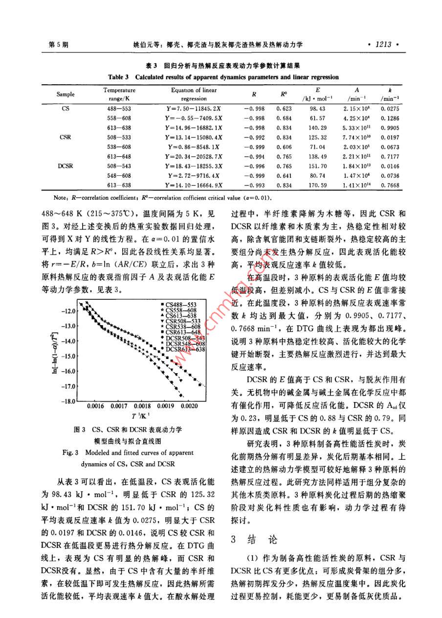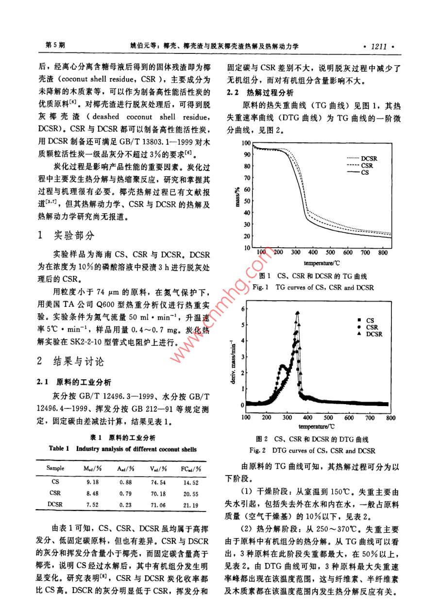 第58卷第5期化工Vol 58 No 52007年5月JournalChemical Industry and Engineering (China)研究簡報(bào)椰殼、椰殼渣與脫灰椰殼渣熱解及熱解動(dòng)力學(xué)姚伯元,竇智峰,黃廣民,劉仁成(海南大學(xué)海南省精細(xì)化工重點(diǎn)實(shí)驗(yàn)室,海南???70228)關(guān)鍵詞:椰殼;椰殼渣;脫灰椰殼渣;熱解;動(dòng)力學(xué)中圖分類號:TQ013文獻(xiàn)標(biāo)識(shí)碼:A文章編號:0438-1157(207)05-1210-0Pyrolysis and pyrolysis kinetics of coconut shell, coconut shell residueand de-ashed coconut shell residueYAO Boyuan, DOU Zhifeng, HUANG Guangmin, LIU Rencheng( Hainan Provincial Key laboraof Fine Chemicals, Hainan University, Haikou 570228, Hainan, China)Abstract: The pyrolysis of coconut shell, coconut shell residue and de-ashed coconut shell residue wasstudied with the thermogravimetric technique, and the pyrolysis kinetics models were established. It wasfound that for coconut shell residue and de-ashed coconut shell residue, pyrolysis mainly occurred between280-370C, and there was only a single peak in their DtG curves. but in the case of raw coconut shell,two stages of 230--300C and 300-350C, were involved in the pyrolysis process, which resulted in twopeaks in the DTG curve. Apparent activation energies for the pyrolysis of these three materials wereestimated, and the difference of apparent activation energies in the low temperature range was more evidentthan in the high temperature range and the highest reaction rate appeared in the high temperaturestage. When used for making activated carbon, coconut shell residue and de-ashed coconut shell residuehave more advantages than coconut shell. The pyrolysis temperature is in a narrow range. The pyrolysisprocess is easy to control and is noted for energy saving.Key words: coconut shell: coconut shell residue de-ashed coconut shell residue; pyrolysis; kinetics引言固定碳的貢獻(xiàn)較小。木質(zhì)素具有苯丙烷型、非結(jié)晶性三維高分子網(wǎng)狀結(jié)構(gòu),熱分解溫度相對較高,通海南具有豐富的椰殼資源,2004年椰殼總產(chǎn)過熱縮聚反應(yīng)形成炭骨架。因此,在以椰殼制備活量約2.42億個(gè),大多數(shù)用作制備椰殼活性炭原性炭時(shí),實(shí)際上是利用原料中的木質(zhì)素。研究表料口3。椰殼( coconut shel,Cs)組分包括纖維明+,椰殼經(jīng)酸水解處理后,其中的半纖維素等素、半纖維素和木質(zhì)素等。在熱解過程中,纖維素水解為聚糖(包括木聚糖、葡聚糖、果葡聚糖等)和半纖維素?zé)岱€(wěn)定性差,在較低熱解溫度下發(fā)生熱寡糖以及葡萄糖、木糖等單糖,經(jīng)分離提純后可得分解反應(yīng),形成的小分子以揮發(fā)分的形式析出,對到具有重要經(jīng)濟(jì)價(jià)值的單糖和寡糖。椰殼酸水解2006-09—18收到初藕,2006-12-11收到修改橫Recelved date: 2006-09-18.聯(lián)系人及第一作者:姚伯元(1955-),男,教授Corresponding author: Prof, YAO Boyuan. E-mail: yby G基金項(xiàng)目:科技部重大基礎(chǔ)研究前期研究專項(xiàng) haine. edu.cn(2003cCA03600)1??谑兄攸c(diǎn)科技項(xiàng)目(20021225)第5期姚伯元等:椰殼、椰殼渣與脫灰椰殼渣熱解及熱解動(dòng)力學(xué)1211·后,經(jīng)離心分離含糖母液后得到的固體殘?jiān)礊橐潭ㄌ寂cCSR差別不大,說明脫灰過程中減少了殼渣( coconut shell residue,CsR),主要成分為無機(jī)組分,而對有機(jī)組分含量影響不大。未降解的木質(zhì)素等,可以作為制備高性能活性炭的2.2熱解過程分析優(yōu)質(zhì)原料。對椰殼渣進(jìn)行脫灰處理后,可得到脫原料的熱失重曲線(TG曲線)見圖1,其熱灰椰殼渣( deashed coconut shell residue,失重速率曲線(DTG曲線)為TG曲線的一階微DCR)。CSR與DCSR都可以制備高性能活性炭,分曲線,見圖2用DCSR制備還可滿足GB/T138031199對木質(zhì)顆?;钚蕴恳患壠坊曳植怀^3%的要求。炭化過程是影響產(chǎn)品性能的重要因素。炭化過程中主要發(fā)生熱分解與熱縮聚反應(yīng),研究和掌握其過程與機(jī)理很有必要。椰殼熱解過程已有文獻(xiàn)報(bào)09000道3,但其熱解動(dòng)力學(xué)、CSR與DCSR的熱解及熱解動(dòng)力學(xué)研究尚無報(bào)道1實(shí)驗(yàn)部分實(shí)驗(yàn)樣品為海南CS、CSR與DCSR。DCSR為在濃度為10%的磷酸溶液中浸漬3h進(jìn)行脫灰處理后的CSR。圖1CS、CSR和DCSR的TG曲線用粒度小于74pm的原料,在氮?dú)獗Wo(hù)下Fig. 1 TG curves of CS, CSR and DCSR用美國TA公司Q600型熱重分析儀進(jìn)行熱重實(shí)驗(yàn)。實(shí)驗(yàn)條件為氮?dú)饬髁?0ml·min-,升溫速率5℃·min-1,樣品用量0.4~0.7mg。炭化熱CSR解實(shí)驗(yàn)在SK2-2-10型管式電阻爐上進(jìn)行。2結(jié)果與討論2.1原料的工業(yè)分析灰分按GB/T12496.3-199水分按GB/T12496.4-1999、揮發(fā)分按GB212-91等規(guī)定測定,固定碳由差減法計(jì)算,結(jié)果見表1。100200300400500600700800表1原料的工業(yè)分析2cs、CSR和DCSR的DTG曲線Table 1 Industry analysis of different coconut shellsFig 2 DtG curves of CS, CSR and DCSRM,d/% A/% V/% FCod/%由原料的TG曲線可知,其熱解過程可分為以9.180.8874.5414.52下階段。0.7970.1820.55(1)干燥階段:從室溫到150℃。失重主要由CSR7520.2371.0621.19失水引起,包括失去外在水和內(nèi)在水,一般占原料質(zhì)量(空氣干燥基)的10%以下,見表2。由表1可知,CS、CSR、DCSR雖均屬于高揮(2)熱分解階段:從250~370℃。失重主要發(fā)分、低固定碳原料,但也有差異。CSR與DSCR由于原料中有機(jī)組分的熱分解。從TG曲線可以看的灰分和揮發(fā)分含量小于椰殼,而固定碳含量高于出,3種原料在此階段失重都最
