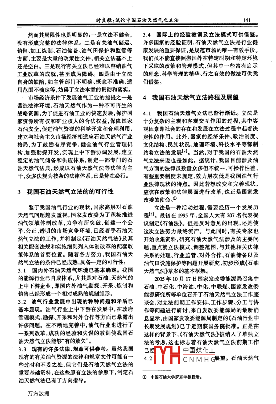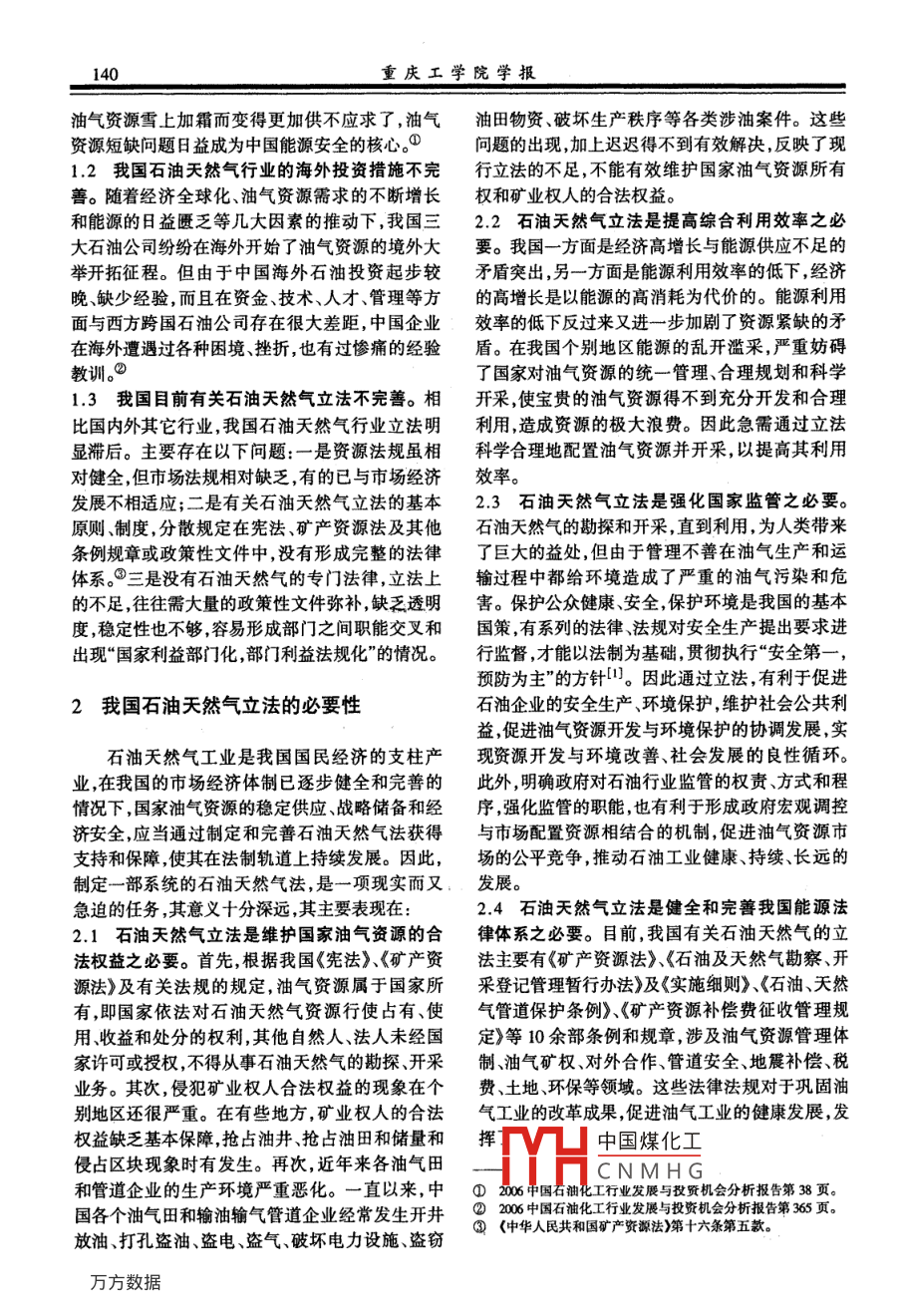 第21卷第2期重慶工學(xué)院學(xué)報2007年2月Vol 21 No. 2Journal of Chongging Institute of TechnologyFeb.2007【法學(xué)天地】試論中國石油天然氣之立法時良敏(四川大學(xué)法學(xué)院,成都61004摘要:由于石油天然氣資源的日益緊張,近期內(nèi)石油天然氣立法成為國家立法活動的重點和熱點。石油天然氣作為對全球的經(jīng)濟政治外交、安全起著巨大影響作用的戰(zhàn)略物資影響著當(dāng)今世界的局勢。目前中國在油氣行業(yè)規(guī)制方面存在許多缺陷,在對進口油氣資源依賴程度日益加深的中國,這無疑會對油氣資源的穩(wěn)定供應(yīng)、戰(zhàn)備儲備和經(jīng)濟安全上造成嚴(yán)重的威脅,而在此基礎(chǔ)之上,制定《石油天然氣法》將具有非常重大的現(xiàn)實意義關(guān)鍵詞:立法;石油;天然氣;法律體系中圖分類號:DF1文獻標(biāo)識碼:A文章編號:1671-0924(2007102-0139-柳除除On the legislation of oil and Natural GasSHI Liang-min(Law School, Sichuan University, Chengdu 610064,ChinaAbstract: The legislation of oil and natural gas are a focus lately in China as oil and gas resources are becoming insufficient. As the most important strategic material, oil and gas are exerting huge influence on theglobal economy, politics, diplomatism and security. There are many flaws in the present regulation condeming oil and natural gas in China. As China depends heavily on imported oil and gas these days, theseflaws will constitute a great threat to a secure supply, strategic storage and economic security of oil and natTherefore, the legislation of "Law of Oil and Natural Gas has great practical significanceKey words: legislation; oil; natural gas; legal system隨著世界石油天然氣行業(yè)的動蕩不安,作為高漲,石油天然氣立法漸行漸近,本文中筆者從我我國較為緊缺的能源,油氣生產(chǎn)與消耗越發(fā)不協(xié)國油氣行業(yè)的現(xiàn)狀、存在的問題、立法的必要性和調(diào)但迄今為止,還未成就油氣專項立法。由于能可行性及其展望幾個方面加以闡述。源消費的快速增長,油氣資源的對外依賴度不斷加大我國油氣工業(yè)的發(fā)展面臨著嚴(yán)峻的挑戰(zhàn)。1我國石油天然氣行業(yè)的現(xiàn)狀及存在的問題對石油天然氣加以立法,加強國家對油氣行業(yè)的監(jiān)管,為油氣工業(yè)的發(fā)展創(chuàng)造良好的環(huán)境正是應(yīng)1.1我國油氣資源短缺。我國一次性能源的基對這種挑戰(zhàn)的戰(zhàn)略性舉措。一直以來,石油天然本特點是“富煤、貧油、少氣”,而且為了生存與發(fā)氣立法只處于“只聽雷聲響不見雨點下”的局面,展,我中國煤化工采地下的各種油最近各界對于要求石油天然氣立法的呼聲越發(fā)氣資CNMHG候,無序開采讓收稿日期:2006-11-08作者簡介:時良敏(1981-),男,江西彭澤人,碩士研究生,主要從事法律研究。重慶工學(xué)院學(xué)報油氣資源雪上加霜而變得更加供不應(yīng)求了,油氣油田物資、破壞生產(chǎn)秩序等各類涉油案件。這些資源短缺問題日益成為中國能源安全的核心問題的出現(xiàn),加上遲遲得不到有效解決,反映了現(xiàn)1.2我國石油天然氣行業(yè)的海外投資措施不完行立法的不足,不能有效維護國家油氣資源所有善。隨著經(jīng)濟全球化、油氣資源需求的不斷增長權(quán)和礦業(yè)權(quán)人的合法權(quán)益。和能源的日益匱乏等幾大因素的推動下,我國三2.2石油天然氣立法是提高綜合利用效率之必大石油公司紛紛在海外開始了油氣資源的境外大要。我國一方面是經(jīng)濟高增長與能源供應(yīng)不足的舉開拓征程。但由于中國海外石油投資起步較矛盾突出,另一方面是能源利用效率的低下,經(jīng)濟晚、缺少經(jīng)驗,而且在資金、技術(shù)、人才管理等方的高增長是以能源的高消耗為代價的。能源利用面與西方跨國石油公司存在很大差距,中國企業(yè)效率的低下反過來又進一步加劇了資源緊缺的矛在海外遭遇過各種困境、挫折,也有過慘痛的經(jīng)驗盾。在我國個別地區(qū)能源的亂開濫采,嚴(yán)重妨礙教訓(xùn)⊙了國家對油氣資源的統(tǒng)一管理、合理規(guī)劃和科學(xué)13我國目前有關(guān)石油天然氣立法不完善。相開采,使寶貴的油氣資源得不到充分開發(fā)和合理比國內(nèi)外其它行業(yè),我國石油天然氣行業(yè)立法明利用造成資源的極大浪費。因此急需通過立法顯滯后。主要存在以下問題:一是資源法規(guī)雖相科學(xué)合理地配置油氣資源并開采,以提高其利用對健全,但市場法規(guī)相對缺乏,有的已與市場經(jīng)濟效率。發(fā)展不相適應(yīng);二是有關(guān)石油天然氣立法的基本2.3石油天然氣立法是強化國家監(jiān)管之必要。原則制度,分散規(guī)定在憲法礦產(chǎn)資源法及其他石油天然氣的勘探和開采,直到利用,為人類帶來條例規(guī)章或政策性文件中,沒有形成完整的法律了巨大的益處,但由于管理不善在油氣生產(chǎn)和運體系。③三是沒有石油天然氣的專門法律,立法上輸過程中都給環(huán)境造成了嚴(yán)重的油氣污染和危的不足,往往需大量的政策性文件彌補,缺乏透明害。保護公眾健康、安全,保護環(huán)境是我國的基本度,穩(wěn)定性也不夠容易形成部門之間職能交叉和國策,有系列的法律法規(guī)對安全生產(chǎn)提出要求進出現(xiàn)“國家利益部門化,部門利益法規(guī)化”的情況。行監(jiān)督,才能以法制為基礎(chǔ),貫徹執(