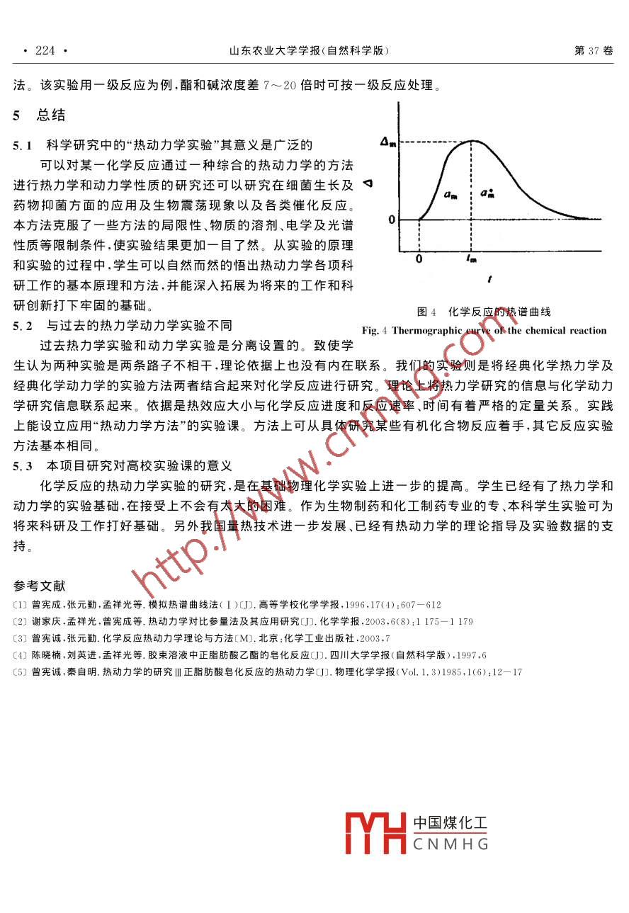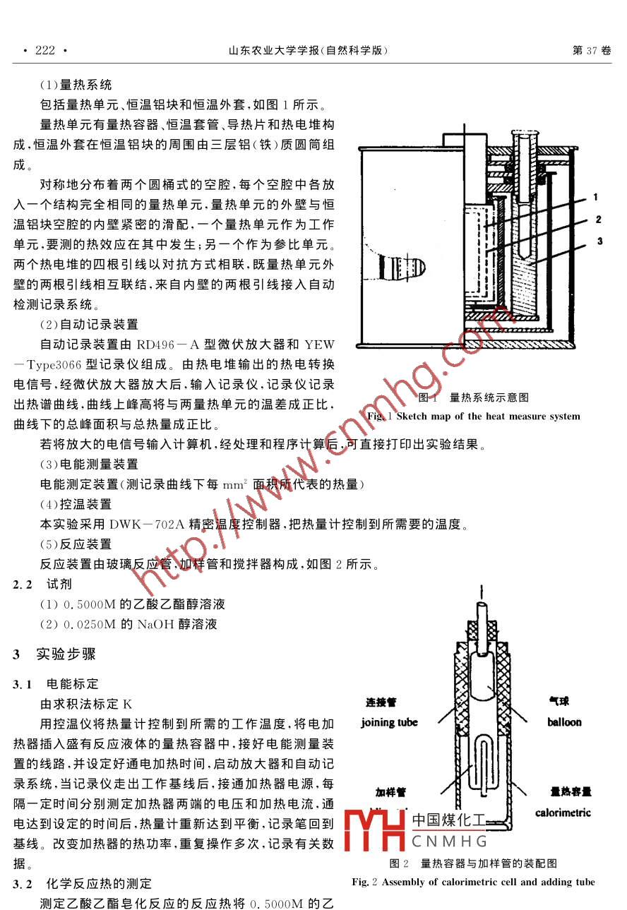 山東農(nóng)業(yè)大學學報(自然科學版),2006,37(2):220~224Journal of Shandong Agricultural University (Natural Science)化學反應熱動力學實驗研究康戈莉,于乃臣,吳翠榮,耿殿國,張淑新(淄博職業(yè)學院化學工程系,山東淄博255013)摘要:熱導式自動量熱計是一種新型的量熱儀,它在原理和結構上完全不同于恒溫外套式和絕熱式熱量計。這種量熱法不涉及熱容和熱量的計量,它由自動記錄的峰面積計算反應的熱效應,由熱穩(wěn)態(tài)過程的峰髙或峰面積計算反應過程的放熱(吸熱)速率常數(shù)。因此可以在同一個化學反應的量熱體系中,通過自動量熱計監(jiān)測和記錄化學反應的熱譜曲線。同時得到動力學和熱力學的信息關鍵詞:熱動力學實驗;熱導式量熱計;熱譜曲中圖分類號:O643文獻標識碼:B文章編號:1000-2324(2006)02-0220—04THE THERMOKINETIC EXPERIMENT STUDY OF CHEMICAL REACTIONKANG Ge-li, YU Nai-chen, WU Cui-rong, GENG Dian-guo, ZHANG Shu-xinDepartment of Chemical Engineering, Zibo Vocational College, Zibo 255013, China)Abstract: The Heat conduction types heat measure is a new type estmate. It deffrent with isotherm andheat insulation type. This Thermokintic methods is recorded Heatscore-curve atmeticly and calculatereactions heat efficiency,, not involves the calculate of heat capacity and quantity of heat. It calculate re-actions heat efficiency by atmetic recorded summit area and calculate reactions heat and The rate constants by summit high or hump's area of heat stabal prossens's. So in the same chemistry system ,reac-tions Heat-score-curve will be recorded by atmetic. heat measure Equipment. we can get Thermo andkinetic information in the same timeKey words: Thermokinetic experiment, Heat conduction type's heat measure. Heatscore-curve, The rateconstants對一個化學反應,在等溫等壓下,其焓變大小正比于反應進度即正比于反應速率。因此我們可以在同個化學反應的量熱體系中,通過自動量熱計監(jiān)測和記錄化學反應的熱譜曲線。同時得到動力學和熱力學的信息—稱為化學反應的熱動力學實驗化學反應的熱動力學研究已經(jīng)取得了很大進展,在反應機理、膠束催化、生物生長過程的新陳代謝規(guī)律、藥物科學等方面得到了廣泛應用。目前高校物理化學實驗課設有熱力學實驗和動力學實驗,為了使物理化學實驗更進一步的與生產(chǎn)和科研貼近、提高化工及制藥專業(yè)大學生基本實驗技能、動手能力和科研能力的目標,化學反應熱動力學實驗顯得比以往更有必要實驗原理通過測定化學反應過程中放岀的熱量繪出熱譜曲線、解析熱譜曲線的信息來確定反應焓的變化及化學反應速率和動力學參數(shù)。本實驗用RD-3型熱導式自中國煤化工應的熱效應和反應的速率。這類熱導式自動量熱計在原理和結構上完全不同于CNMH(量計。這種量熱法不涉及熱容和熱量的計量,它由自動記錄峰面積計算反應的熱效.出熱穩(wěn)心過程的眸咼計算反應過程的放熱收稿日期:2005-05-25基金項目:2004年山東省教育廳高等學校實驗技術研究立項資助項目(339號)作者要兩(195),,教授,主要從事理化學教學,實驗以及化學反應熱動力學方面的研究工作第2期康戈莉等:化學反應熱動力學實驗研究221(吸熱)速率常數(shù)設在量熱計中有一個熱效應發(fā)生,其熱功率W=dQdt,W的一部分以熱流量o的形式通過導熱片流向恒溫導管(熱阱),熱流量θ與量熱單元內(nèi)外溫差θ-θ。成正比,P為量熱單元的熱導系數(shù),0=P(01-0。)=P0W的一部分是量熱容器及其反應物的溫度升高為dθ1,因為θ保持恒定,所以d1=de。設量熱容器及其中物質(zhì)的有效熱容為Ⅰ,則:w=dQ/dt= P0+ude/dt(2)因為記錄儀曲線上的峰高△和溫度差e成正比,故式中g為與系統(tǒng)靈敏度、熱電堆的性質(zhì)和熱電信號轉(zhuǎn)換為與輸岀記錄等系統(tǒng)有關旳常數(shù).因此Pd△在時間t1至t2的范圍內(nèi)積分,得:Q=-A+(△2-△1)(5)始終A為時間t1至t2內(nèi)記錄曲線下的峰面積,△1和△2分別為記錄曲線在t、t2時的高度。4式和5式稱為Tian’s方程當量熱計內(nèi)有一個熱效應發(fā)生時,記錄筆從基線出發(fā)到開始出峰,過一個最高點后回到基線,在這種情況下,△1=△2=0由式5得Q/A=P/g=K式中K稱為熱量計的熱量常數(shù),它的大小由量熱元件的熱導系數(shù)和常數(shù)g決定,通過準確的電能標定,求得儀器熱量常數(shù)K后,即可由相應的峰面積A按下式Q=KA(7)計算任意過程的未知熱效應Q。由此可見,熱導式自動量熱計進行量熱工作時,由記錄曲線下的峰面積表示熱量,在這種表示法中熱量計的熱量常數(shù)K是單位的熱量,它等于單位面積(lmm)所表示的熱量,這就是熱導式自動熱量計測定熱量的基本原理設另一工作情況下,量熱器內(nèi)有一個熱源以恒定的功率W放岀熱量,到一定時間后,量熱單元內(nèi)外的溫度保持恒定,此時△不再隨時間改變,d△/dt=0這種情況下由(4)可得W/△°=P/g=K(8)式中△°為記錄曲線在穩(wěn)定態(tài)的峰高因此,由恒定的熱功率W和相應的穩(wěn)定態(tài)的峰高之比,也可以求得熱量計的熱量常數(shù)K。求得k以后.可根據(jù)相應的記錄曲線在穩(wěn)定態(tài)的峰高△。按下式計算任一穩(wěn)定過程的熱功率(亦即放熱速率dQ/dt)W=dQdt=K△o對化學反應而言反應速率(dn/dt)和放熱速率(dQ/dt)有下列關系dn/dt=(1/AHm)(dQ/dt)(10)式中△H為摩爾反應熱:n=C.V(C為產(chǎn)物的量濃度,V為反應液體積n為樣品池中反應產(chǎn)物的物質(zhì)的量(mol)。式(9)和(10)對吸熱反應(如酯