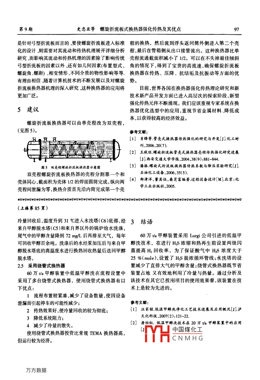 第28卷第9期石油化工應(yīng)用Vol 28 No 9200年12月PETROCHEMICAL INDUSTRY APPLICATIONDec.2009怖石化工藝與設(shè)備低溫甲醇洗技術(shù)在60萬噸/甲醇裝置中的應(yīng)用馮澎波(神華寧煤集團(tuán)煤炭化學(xué)工業(yè)分公司二甲醚項(xiàng)目籌建處,寧夏靈武75140擠要:介紹了神華寧煤集團(tuán)83萬如a二甲醚項(xiàng)目一期工程甲醇裝置配套的低溫甲醇洗工藝流程,分析了該工藝設(shè)計(jì)特點(diǎn),總結(jié)了該工藝在設(shè)計(jì)上的先進(jìn)性,并提出實(shí)施過程中存在和應(yīng)注意的問題。關(guān)鍵詞:低溫甲醇洗;凈化;HS;:CO2中圖分類號:TQ223.121文獻(xiàn)標(biāo)識碼:A文章編號:1673-5285(2009109008403神華寧煤集團(tuán)83萬血二甲醚項(xiàng)目一期T程以寧160萬ta甲醇裝置中低溫甲醇冼工藝東磁二礦、羊場灣礦媒為原料,由對置式多噴嘴氣化裝流程置制得原料氣,經(jīng)中溫部分變換,低溫甲醇洗工藝脫硫脫碳要求出工序的總硫≤0.1mgL、CO2≤3%,凈化來自CO耐硫變換工序的變換氣用鍋爐給水洗滌氣經(jīng)聯(lián)合壓縮機(jī)加壓進(jìn)人合成塔得到粗甲醇。為了給除氨后,在供氣冷卻器(EIA)中被來自甲醇洗滌塔下一工序提供合格的凈化氣,必須對合成氣中的CO2、(C)的低溫凈化氣冷卻到-20℃,為了防止變換氣中HsS、COS等酸性氣體進(jìn)行脫除。氣體凈化的指標(biāo)直接水分在低溫下冷卻結(jié)冰,在預(yù)冷前需噴入少量甲醇,然影響到甲醇的產(chǎn)量及合成觸媒的使用壽命,因此做好后經(jīng)變換氣/甲醇水分離器(D)分離出甲醇和水,變換氣體凈化十分重要。氣從甲醇洗滌塔(C1)底進(jìn)入,依次脫除HS+COS以脫除CO2為主要任務(wù)的酸性氣脫除方法有溶CO2。送下一工序變壓吸附(FSA)的凈化氣中CO2含量液物理吸收、溶液化學(xué)吸收、低溫蒸餾和吸附4大約為2%,HS+COS<0.1mg/L類。前兩種方法應(yīng)用最為普遍,溶液物理吸收法有低從甲醇貯槽(D5)來的貧甲醇在貧甲醇深冷器溫甲醇洗( Rectisol)法、聚乙二醇二甲醚(NHD)法、(E13)中被冷卻到-36℃,并在貧甲醇冷卻器(E8)中被碳酸丙烯酯法,主要用于壓力較高的場合,化學(xué)吸收來自HS濃縮塔(C2)的富冷甲醇進(jìn)一步冷卻到-50℃,方法有熱鉀堿法、N-甲基二乙醇胺(MDEA)法,主要從甲醇洗滌塔(C1)頂進(jìn)入,甲醇洗滌塔上段為CO2吸用于壓力相對較低的場合。溶液物理吸收法中以低收段,甲醇液自上而下與變換氣逆流接觸脫除氣體中溫甲醇洗法能耗最低,可以在脫除cO2的同時(shí)完成CO2。從甲醇洗滌塔下段和底部引出的富CO2和富精脫硫。低溫甲醇洗是由德國林德( Linde)公司和魯HS、COS甲醇液分別被冷卻減壓,進(jìn)入閃蒸分離器奇( Lurgi)公司研究開發(fā)的,使用冷甲醇作為酸性氣(D3)進(jìn)行減壓閃蒸閃蒸氣從閃蒸分離器I(D4)輸吸收液,利用甲醇在-60℃左右的低溫下對酸性氣出,經(jīng)循環(huán)氣壓縮機(jī)(K1)壓縮后再進(jìn)入系統(tǒng)。體的溶解度極大的物理特性,在同一塔內(nèi)分段選擇從閃蒸分離器底部出來的閃蒸液經(jīng)減壓后送往性的進(jìn)行脫硫和脫碳。少量的脫碳富液脫硫,不僅簡HS濃縮塔(C2)通過低壓N2降低氣相中CO2的分壓化了流程且容易得到高濃度的HS組分,并可用克上剖中國煤化工下部溶液中閃蒸出的勞斯法回收硫。HSCNMHG引出的回收冷量甲醇收稿日期:200909-22第9期馮澎波低溫甲醇洗技術(shù)在60萬噸/年甲醇裝置中的應(yīng)用進(jìn)入下部被來自氣提塔(C3)的含N2尾氣和來自管網(wǎng)器(E12)提供的熱量徹底再生,熱再生塔底部出來的的低壓氮?dú)鈿馓?塔底部經(jīng)加壓過濾后的粗甲醇回收甲醇水溶液一部分被送往甲醇貯槽(D5)被低溫甲醇冷量后送氣提塔(C3)被塔底氮?dú)鈿馓嵯囱b置循環(huán)使用;另一部分送入甲醇脫水塔(C5)進(jìn)行富含Hs、CoS的卬醇經(jīng)N氣提、加壓、回收冷量精餾熱源由甲醇/水分離塔再沸器(E14)提供,甲醇脫升溫至近80℃進(jìn)熱再生塔(C4)。熱冉生塔頂含HS水塔底出來的甲醇含量小于003%(wt)的廢水經(jīng)冷卻氣體在濃度沒有達(dá)到進(jìn)硫磺回收裝置要求的濃度前,后送污水處理系統(tǒng)通過循環(huán)管線繼續(xù)冋到硫化氫濃縮塔濃縮,濃度達(dá)到60萬咖a甲醇裝置中低溫甲醇洗工藝原則流程(見進(jìn)硫磺冋收裝置的要求后引出。甲醇被熱再生塔再沸圖1)。HS《體豐硫確C:甲洗滌塔C5:甲醇脫水塔C2:H:S濃縮塔C6:水洗塔3:氣提塔C7;洗滌塔c41熱再生塔圍1低溫甲醇洗工藝原則流程圖2工藝流程設(shè)置特點(diǎn)分析表1甲醇燕汽壓表溫度/℃-54544-253-16.260-5.0-212-3482l甲醇對CO2的吸收具有高選擇性合成氣凈化度高64.7甲醇屬于極性分子它對酸性氣體的溶解度大而甲汽050130671326753313267對H2、N2等非極性分子的溶解度小。壓力越高溫度越/kPa1013低,CO2和HS在甲醇中的溶解度越大,而H2、N2、CO出甲醇洗滌塔(Cl)氣相物流溫度為-43℃,出HS在甲醇中的溶解度隨著溫度的降低而降低。據(jù) Lurgi工濃縮塔(C2)氣相物流溫度為-59℃,由于甲醇在低溫藝包數(shù)據(jù),當(dāng)溫度從0降到-45℃時(shí),H2在甲醇中的下具有較低的蒸汽壓,故帶走的甲醇蒸汽很少。甲醇粘溶解降低30%,當(dāng)壓力一定時(shí),-50℃甲醇與0℃相比,度低故動(dòng)力消耗和運(yùn)轉(zhuǎn)費(fèi)用很低其對HS的溶解度提高8倍。60萬如甲醇裝置中低2.3提高去硫回收裝置尾氣中HS濃度溫甲醇洗工序在3.3MPa壓力下,用-50℃及-20℃進(jìn)低溫甲醇