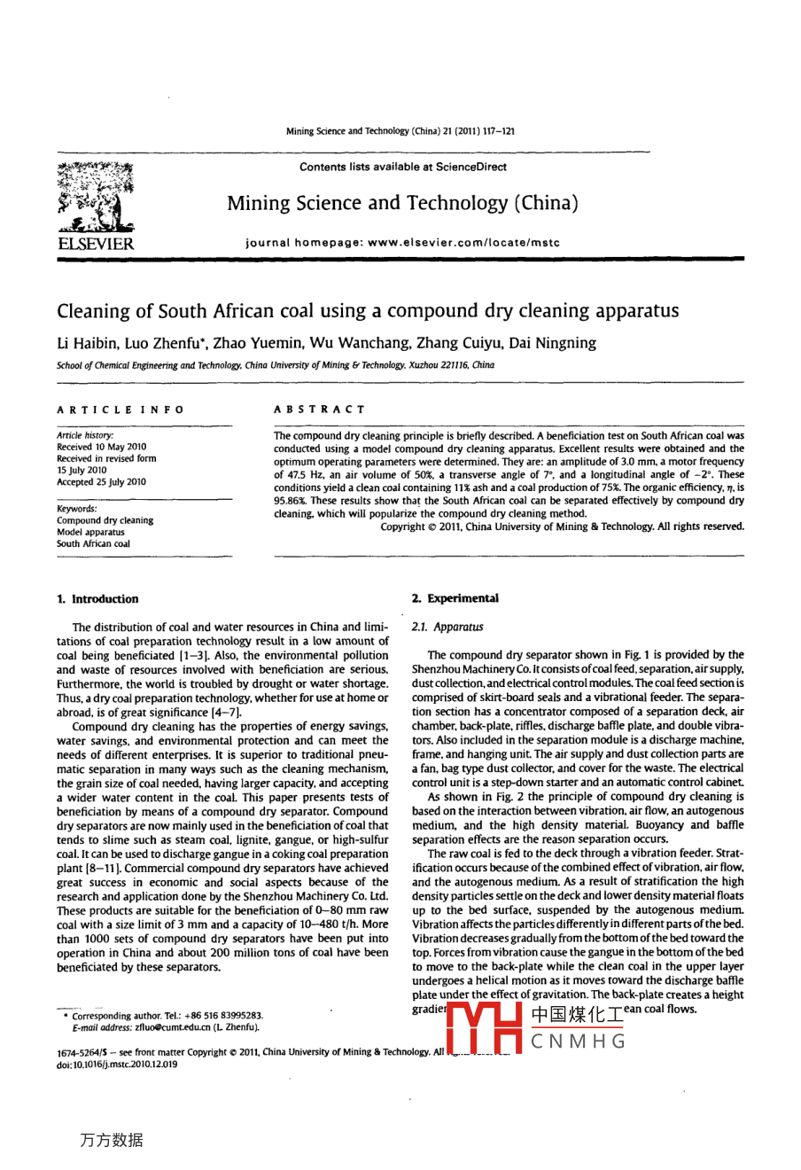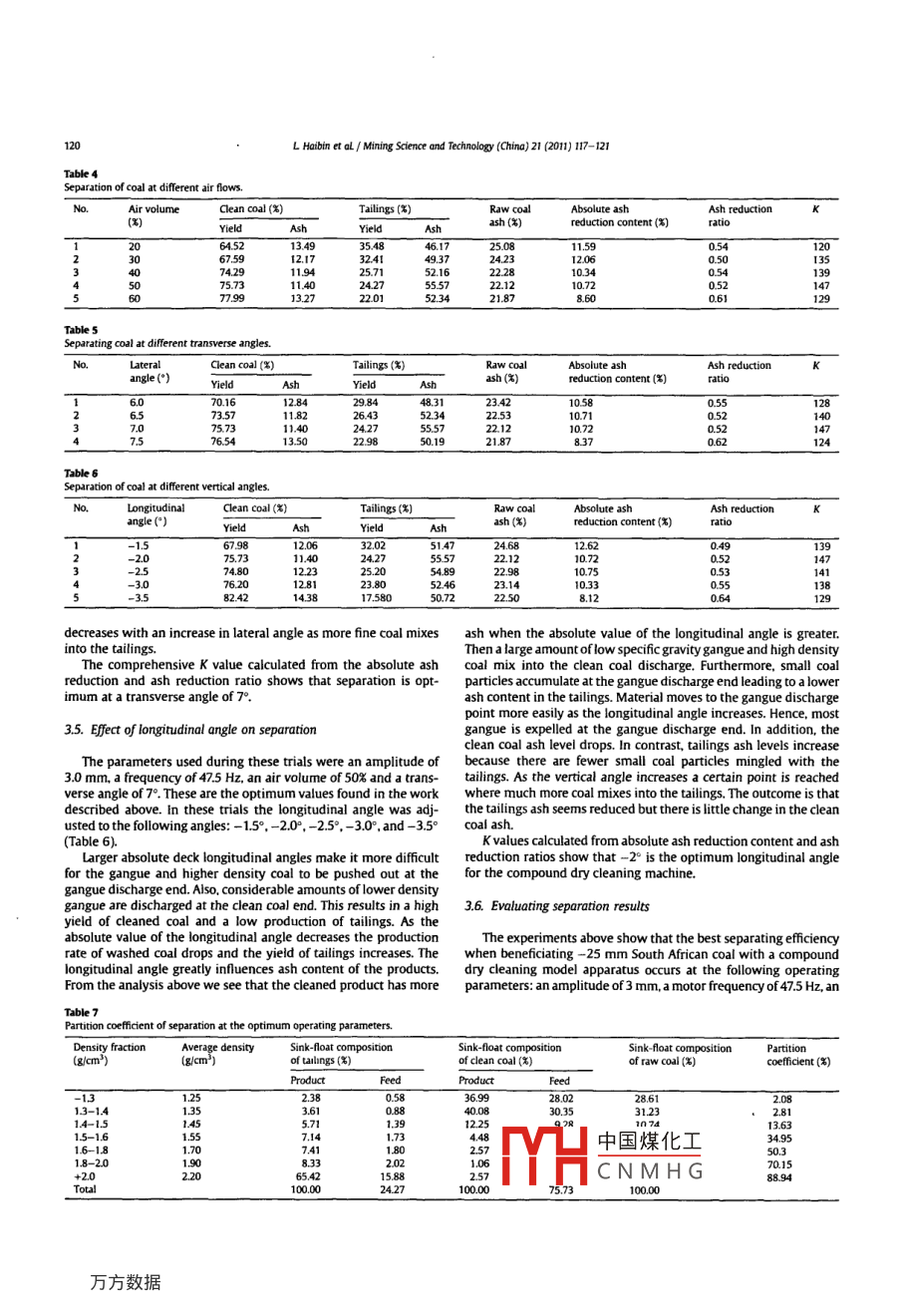 Mining Science and Technology( China)21(2011)117-121氵Mining Science and Technology( China)ELSEVIERjournalhomepagewww.elsevier.com/locate/msteCleaning of South African coal using a compound dry cleaning apparatusin, Wu Wanchang, Zhang Cai NingningSchool of Chemical Engineering and Technology, China Universiby of Mining 6 Technology. Xuzhou 221116, ChinaARTICLE INFOA BSTRACTThe compound dry cleaning principle is briefly described. a beneficiation test on South African coal waReceived 10 May 2010onducted using a model compound dry cleaning apparatus. Excellent results were obtained and theReceived in revised formptimum operating parameters were determined. They are: an amplitude of 3.0 mm, a motor frequenc15July2010Accepted 25 July 2010of 47.5 Hz, an air volume of 50%, a transverse angle of 7 and a longitudinal angle of -2'. Theseonditions yield a clean coal containing 11% ash and a coal production of 75%. The organic efficiency, n is5.86%. These results show that the South african coal can be separated effectively by compound dryKeywordscleaning. which will popularize the compound dry cleaning methodCopyright e 2011, China University of Mining Technology All rights reservedSouth African coal1. Introduction2. ExperimentalThe distribution of coal and water resources in China and limi- 2. 1. Apparatustions of coal preparation technology result in a low amount ofcoal being beneficiated [1-3]. Also, the environmental pollutionThe compound dry separator shown in Fig. 1 is provided by theand waste of resources involved with beneficiation are serious. Shenzhou Machinery Co. It consists of coal feed, separation, airsupply,urthermore, the world is troubled by drought or water shortage. dust collection, and electrical control modules. The coal feed section isThus, a dry coal preparation technology, whether for use at home or comprised of skirt-board seals and a vibrational feeder. The separaabroad, is of great significance[4-71.tion section has a concentrator composed of a separation deck, aimpound dry cleaning has the properties of energychamber, back-plate, riffles, discharge baffle plate, and double vibrawater savings, and environmental protection and can meet the tors. also included in the separation module is a discharge machine,needs of different enterprises. It is superior to traditional pneu- frame, and hanging unit. The air supply and dust collection parts arematic separation in many ways such as the cleaning mechanism, a fan, bag type dust collector, and cover for the waste. The electricalthe grain size of coal needed, having larger capacity, and accepting control unit is a step-down starter and an automatic control cabineta wider water content in the coal. this paper presents tests ofAs shown in Fig. 2 the principle of compound dry cleaning isbeneficiation by means of a compound dry separator Compound based on the interaction between vibration, air flow, an autogenoustends to slime such as steam coal, lignite, gangue, or high-sulfur separation effects are the reason separation occur cydry separators are now mainly used in the beneficiation of coal that medium, and the high density material. Buoyancy and bafflecoal. It can be used to discharge gangue in a coking coal preparation The raw coal is fed to the deck through a vibration feeder Stratplant[8-11]. Commercial compound dry separators have achieved ification occurs because of the combined effect of vibration, air flow,great success in economic and social aspects because of the and the autogenous medium. as a result of stratification the highThese products are suitable for the beneficiation of o orry Co Ltd. density particles settle on the deck and lower density material floatsresearch and application done by the shenzhou Machcoal with a size limit of 3 mm and a capacity of 10-480 t/h. More Vibration affects the particles differently in different parts ofmedium.than 1000 sets of compound dry separators have been put into Vibration decreases gradually from the bottom of the bed toward thoperation in China and about 200 million tons of coal have been top Forces from vibration cause the gangue in the bottom of the bedbeneficiated by these separators.to move to the back-plate while the clean coal in the upper layerundergoes a helical motion as it moves toward the discharge baffleplate under the effect of gravitation. The back-plate creates a heightCorresponding author. TeL: +86 516 839952中國煤化工en coal flowsE-mailaddress:fluo@cumt.edu.cn(LZhenCNMHG1674-5264/5-see front matter Copyright e 2011, China University of Mining Technology. Alldoi:101016小mstc201012019L Harbin et aL/ Mining Science and Technology( china)21(2011)117-121Results of a sink-nloat test on 0-25 mm South African coalfraction (%)(3) accumulation(5)accumulation( %)(g/cm)-131792551179255000015-161216-1.8130782440002524where y is the yield of clean coal: A the clean coal ash content: Aythe ash content of the raw coal; and AA is the ash reduction ratioIn this formula smaller ash reduction ratios imply reduced ash inFig 1 Model compound dry coal separator.the cleaned coal Product ash, product yield and the raw coal ashcontent are fully factored into the index, K. As a result, clean coalThe lower density coal on the bed surface is discharged as a lower ash content is lower and the yield of clean coal is higher if the indexash content cleaned product after passing over the discharge baffle K, increases. For a specific separator the value k is useful for eval-plate The gangue particles on the deck move toward the back -plate uating concentration effects under different separation conditions.under the action of vibration and the guiding riffe the gangue And it is a more simple and practical index compared to theparticles then move to the refuse-discharging section and become traditional separation indices probable error E, and uncertainty.the tailings. Other material continues to cycle within the machine.Repeated separations occur after each helical movement and so 3. Resul