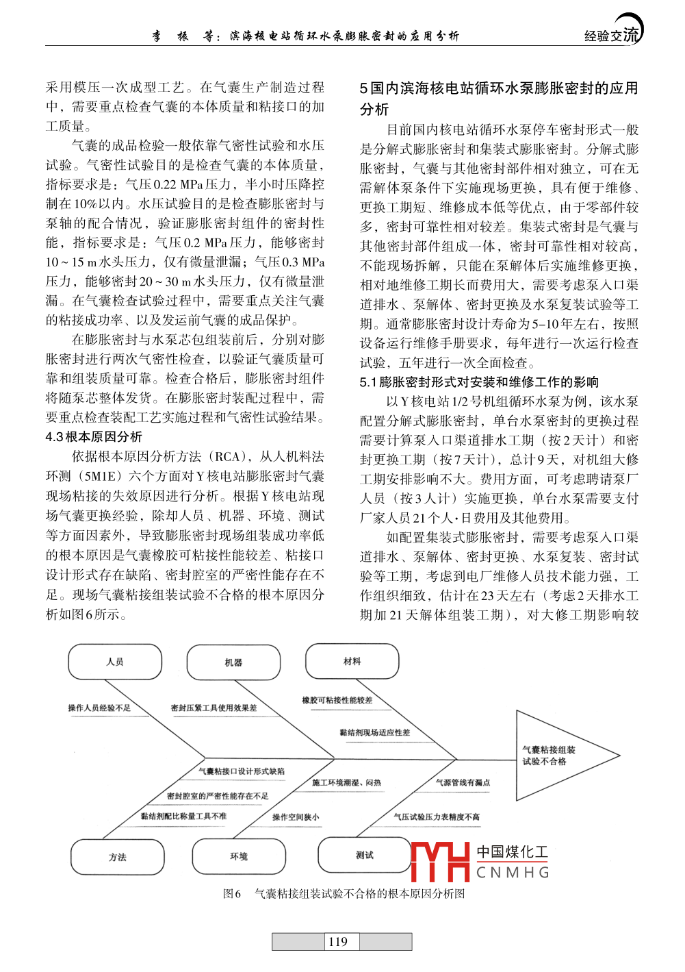 經(jīng)驗(yàn)交流機(jī)電工程技術(shù)2015年第44卷第04期DOI: 10. 3969 /j. issn. 1009- -9492. 2015. 04. 032濱海核電站循環(huán)水泵膨脹密封的應(yīng)用分析李振,易琳,張宇(中廣核工程有限公司,廣東深圳518124)摘要:從描述循環(huán)水泵膨脹密封氣囊技術(shù)改進(jìn)入手,分析了膨脹密封現(xiàn)場組裝成功率低的原因,討論了不同形式膨脹密封對循環(huán)水泵安裝和維修:工作的影響,提出了國內(nèi)部分核電站循環(huán)水泵膨脹密封的應(yīng)用建議。關(guān)鍵詞:核電站;循環(huán)水泵;膨脹密封;安裝;維修;應(yīng)用中圖分類號: TM623.4文獻(xiàn)標(biāo)識(shí)碼: A文章編號: 1009 - 9492(2015) 04- 0116-06Application & Analysis of the Inflatable Seal of the Circulating W aterPump in a Coastal Nuclear Power PlantLI Zhen,YI Lin, ZHANG Yu(China Guangdong Nuclear Power Engineering Co. Ltd, Shenzhen518124, China)Abstract: Based on the technical adaptation on the inflatable seal of circulating water pump, the reasons for the low success rate of theinflatable seal on site assembly has been described in the paper. The efects of diferent forms of the inflatable seal on the intallation andmaintenance work for the circulating water pump has also been analyzed and the application of the inflatable seal has been suggested insome domestic coastal nuclear power plants.Key words: nuclear power plant; circulating water pump; inflate seal; installation; maintenance; application1背景Y核電站1/2號機(jī)組循環(huán)水泵在安裝與調(diào)試期國內(nèi)濱海核電站循環(huán)水泵一般設(shè)置中空充氣間多次發(fā)生膨脹密封氣囊故障,后經(jīng)兩次技術(shù)改式膨脹密封,膨脹密封主要功能是水泵檢修期進(jìn)解決了問題。本文總結(jié)了循環(huán)水泵膨脹密封故間,在不必抽掉泵入口渠道海水的情況下,通過障處理過程和氣囊粘接工藝的技術(shù)改進(jìn),分析了投入壓縮空氣,使密封膨脹與泵軸緊密貼合將海不同形式膨脹密封對循環(huán)水泵安裝和維修工作的水隔絕,便于泵軸封等部件的維護(hù)檢修,減少循影響以及國內(nèi)部分核電站循環(huán)水泵膨脹密封的應(yīng)環(huán)水泵檢修工期與工作量。膨脹密封依據(jù)密封間用情況。隙尺寸、流體壓力、膨脹收縮率等進(jìn)行結(jié)構(gòu)設(shè)2膨脹密封氣囊的現(xiàn)場更換計(jì)"。根據(jù)膨脹密封氣囊截面形狀,可分為圓形、Y核電站1/2號機(jī)組循環(huán)水泵按照水泵、齒輪梯形、矩形、0形等。按設(shè)計(jì)有無粘接口,可分箱、電機(jī)、潤滑油站等形式發(fā)貨,水泵結(jié)構(gòu)如圖為粘接式和整圈式。根據(jù)氣囊與密封其他部件的1所示。膨脹密封氣囊由某橡膠院分包設(shè)計(jì)供組裝形式,可定義為分解式和集裝式。膨脹密封貨,膨脹密封組件與泵芯組裝后發(fā)運(yùn)。作為停車密封,在循環(huán)水泵設(shè)計(jì)選型時(shí)通常與主2012年3月下旬,1號機(jī)組循環(huán)水泵軸密封形式結(jié)合考慮。一般主軸密封選擇機(jī)械密(1CRFOO群Vr 1中國煤化工. 做膨脹密封氣密封的水泵,以配置集裝式膨脹密封為主,而選擇性試驗(yàn)時(shí)THCNMH(:決定現(xiàn)場實(shí)施密填料密封的水泵,以配置分解式膨脹密封為好。封拆卸和氣囊更換,到4月上司,現(xiàn)場做了兩次復(fù)收稿日期: 2014-11-11116李振等:濱海核電站循環(huán)水泵膨脹密封的應(yīng)用分析.經(jīng)驗(yàn)交流裝,由泵廠人員和橡膠院人員實(shí)施,但兩次試驗(yàn)都660 mm,截面形狀為“A”字形。最初氣囊陽、不合格。4月中旬橡膠院做技術(shù)改進(jìn),5月初按改陰端頭采用對接形式粘接(如圖2所示)。根據(jù)進(jìn)的粘接方法現(xiàn)場重新粘接試驗(yàn),發(fā)現(xiàn)下層氣囊合陽、陰端頭不同位置的受力情況以及對粘接強(qiáng)度格,而上層氣囊不合格,最后經(jīng)兩次修整后成功。的不同要求,選用兩種膠黏劑。A型膠黏劑為可賽新1480,用于圖2所示的交叉線區(qū)域; B型膠黏劑為雙組份膠黏劑,組分一是葛洲壩牌LDJ-281,組分二是聚異氰酸酯,組分- -與組分二按10: 1的重量比配制,用于圖2所示斜線區(qū)域。從粘接區(qū)域看,陽端頭外圍接觸面積大,粘接質(zhì)量容易保證,而其他接觸面積較小,特別是交叉線區(qū)域,由于粘接時(shí)難以施加外力,粘接力不強(qiáng),粘接質(zhì)量難以控制。1號機(jī)組循環(huán)水泵氣囊漏點(diǎn)多發(fā)生在此區(qū)域。另外,從膨脹密封組件結(jié)構(gòu)看(如圖3所示),其上、下層氣囊與隔環(huán)、支撐環(huán)、底座等組成氣腔,在隔環(huán)與支撐環(huán)之間,包括下層密封支撐環(huán)與密封底座之間為金屬面接觸,雖然氣囊可壓縮,但嚴(yán)密性能較難保證,成為氣密性的薄弱環(huán)節(jié)。橡膠院第一次粘接工藝改進(jìn)方式是: 在氣囊的陽端頭與陰端頭對接處的內(nèi)部粘接一塊膠皮;端頭粘接時(shí),陽端頭內(nèi)部放置--塊鹽芯作為支圖1循環(huán)水 泵結(jié)構(gòu)示意圖回顧1號機(jī)組循環(huán)水泵氣囊更換過程,從4月9日拆除密封開始,共經(jīng)歷5次復(fù)裝試驗(yàn),使用6根氣囊,歷時(shí)1個(gè)月。(a)陽端頭.(b)陰端頭2012年5月中旬,泵廠按照第一次改進(jìn)工藝圖2陽陰端 頭示意圖組裝2號機(jī)循環(huán)水泵膨脹密封,發(fā)現(xiàn)密封氣密性仍不合格,為此要求橡膠院做第二次改進(jìn)并在現(xiàn)場實(shí)施氣囊更換。在8月份,現(xiàn)場按新工藝裝配. 0型