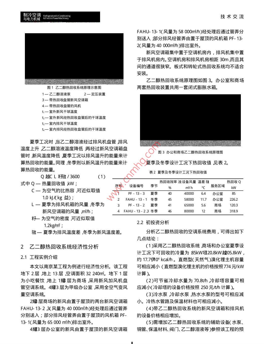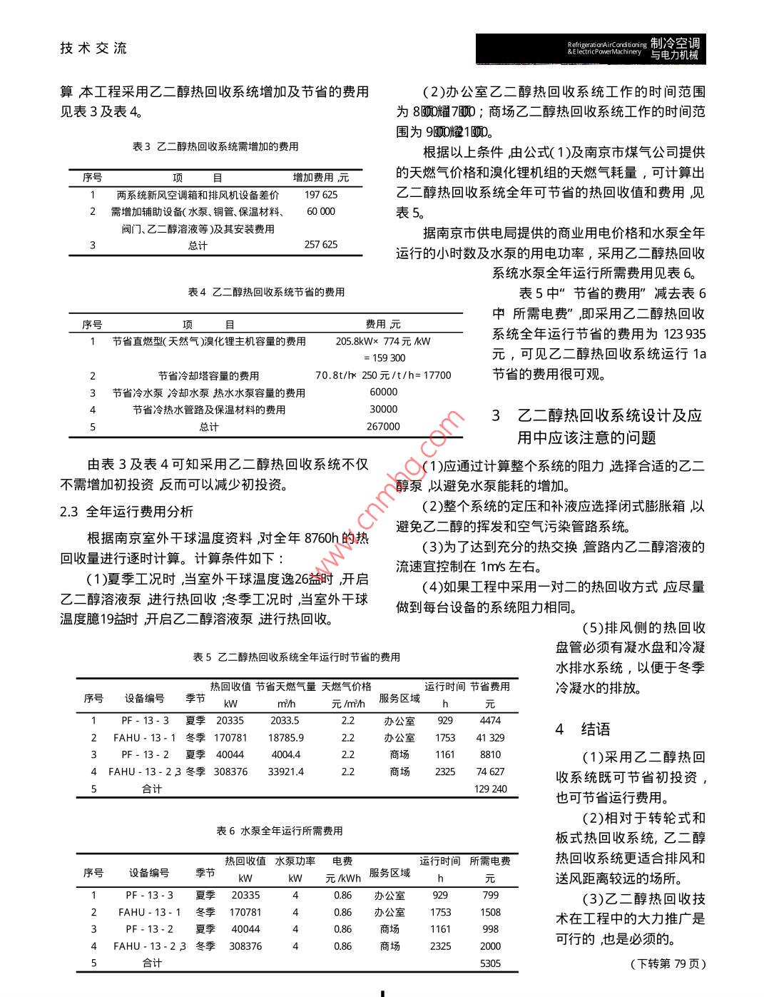 技術(shù)交流 tioring制冷空調(diào) &Elecnney與電力機械乙二醇熱回收系統(tǒng)節(jié)能初探黃益?zhèn)?,歐翔2,宮玖兵1(1.華東建筑設計研究院有限公司上海20000;2中國石化集團上海工程有限公司上海200120摘要:介紹了一種節(jié)能方式——乙二醇熱回收系統(tǒng)在空調(diào)系統(tǒng)中的應用,闡述了此系統(tǒng)的工作和節(jié)能原理并以某工程為例對此系統(tǒng)進行了節(jié)能和經(jīng)濟性分析經(jīng)分析后認為增設乙二醇熱回收系統(tǒng)不但可節(jié)省運行費用而且不需增加空調(diào)系統(tǒng)初投資在空調(diào)節(jié)能方面具有廣闊的應用前景。關鍵詞:乙二醇熱回收;運行費用;初投資中圖分類號:TU83文獻標識碼B文章編號:1006-8449(2006)03-0051-030引言目前我國的能源形勢相當嚴峻。我國已探明的保證無交叉污染具有安裝方便受空間限制小等優(yōu)點。煤炭儲量只占世界儲量的11豫原油占2.4豫天然氣1.2乙二醇熱回收系統(tǒng)工作原理僅占1.2豫而我國人口占世界總?cè)丝诘?0豫,且已成為僅次于美國的第二大能源消費國。隨著人民生活水乙二醇熱回收系統(tǒng)是以乙二醇溶液為媒介把排平的提高建筑能耗增長迅猛。我國的建筑能耗約占風中的能量轉(zhuǎn)移到新風中從而減少了處理新風所需全國總用能量的1/4空調(diào)能耗占建筑總能耗的60%耀的能量達到節(jié)能目的。在現(xiàn)代民用建筑中因空間緊7%因此降低建筑能耗尤其降低空調(diào)能耗是緩解張使得如板式熱回收裝置等的應用受到限制而乙二國家能源緊張形勢實現(xiàn)可持續(xù)發(fā)展的重要措施。醇熱回收系統(tǒng)可以使新風空調(diào)箱和排風機的安裝位置采用乙二醇熱回收系統(tǒng)是一種降低空調(diào)能耗、節(jié)不受限制以乙二醇溶液為媒介進行能量交換解決了約能源的好方法。民用建筑空間緊張和節(jié)能的矛盾。乙二醇熱回收系統(tǒng)工作原理如圖1所示。夏季工1乙二醇熱回收系統(tǒng)原理況時乙二醇溶液泵1開啟當乙二醇溶液流過帶熱回收盤管的排風機4時因排風溫度低于乙二醇溶液的1.1空調(diào)系統(tǒng)常用熱回收方式溫度使乙二醇溶液溫度降低,顯熱被乙二醇溶液吸當前空調(diào)系統(tǒng)常用的幾種熱回收方式比較,詳見收排風溫度升高后排出室外當?shù)蜏氐囊叶既芤毫鞅?經(jīng)新風空調(diào)箱3時因新風溫度高于乙二醇溶液的溫表1幾種熱回收方式比較度,乙二醇溶液溫度升高,項目板式轉(zhuǎn)輪乙二醇熱回收使新風溫度降低溫度升高回收效率最高可達70%最高可達85%最高可達45%后的乙二醇溶液再流過帶熱回收類型顯熱全熱顯熱熱回收盤管的排風機4如污染很少難以避免無交叉污染此循環(huán)乙二醇溶液把排風安裝不方便不方便方便其它體積大送排風必須集中在一起體積小送排風必須集中在一起送排風能夠完全分開中的冷量轉(zhuǎn)移到新風中。冬季工況時乙二醇溶液通過上述各種熱回收方式各有優(yōu)缺點設計時需針對與夏季工況相同的循環(huán)過不同的建筑物類型和送排風形式選用相應的熱回收方程把排風中的熱量轉(zhuǎn)移到新風中式。乙二醇熱回收空調(diào)系統(tǒng)雖然回收效率稍低,但能1.3乙二醇熱回收系統(tǒng)熱回收量計算制冷空調(diào)R與電力機械& ng技術(shù)交流Fahu-13-1(風量為58000m/h)經(jīng)處理后通過管弄分別送入部分排風經(jīng)管弄由置于屋頂?shù)娘L機箱PF-132(風量為40000m/h)排出室外。新風空調(diào)箱集中置于空調(diào)機房內(nèi),排風機集中置于排風機房內(nèi)??照{(diào)機房和排風機房相距30m而且其間的通道很狹窄。板式和轉(zhuǎn)輪式熱回收系統(tǒng)均不適合安裝。乙二醇熱回收系統(tǒng)原理圖如圖3辦公室和商場圖1乙二醇熱回收系統(tǒng)原理示意圖兩套熱回收裝置共用一套閉式膨脹水箱。1-乙二醇溶液泵2一定壓裝置3帶熱回收盤管新風空調(diào)箱4—帶熱回收盤管的風機t一室外新風干球溫度室外新風經(jīng)熱回收盤管后的干球溫度t一室內(nèi)排風干球溫度t一室內(nèi)排風經(jīng)熱回收盤管后的干球溫度夏季工況時當乙二醇溶液經(jīng)過排風機盤管排風溫度上升乙二醇溶液溫度降低再經(jīng)過新風空調(diào)箱盤圖3辦公和商場乙二醇熱回收系統(tǒng)原理圖管時新風溫度降低夏季工況以排風溫升的能量來計算熱回收的能量。同理冬季則以新風溫升的能量來計夏季及冬季設計工況下熱回收值見表2算熱回收的能量。表2夏季及冬季設計工況下熱回收值Q越C/3600(1)式中一熱量回收值kW;熱回收效率濁設備風量溫差駐熱回收Q序號設備編號季節(jié)C一為空氣的比熱容,可近似取值%m/h服務區(qū)域kW1P-13-3夏季40400064辦公室851.0kkg益)2FAHu-13-1冬季45580011.7辦公室226.2夏季為排風機箱的風量冬季為3PF-13-2夏季41650005.6商場120.3新風空調(diào)箱的風量mh;4FAHu-13-23冬季46000012商場3189籽為空氣的密度可近似取值2.2初投資分析1.2kg/m;駐一夏季為排風溫度差冬季為新風溫度差。分析乙二醇熱回收的空調(diào)系統(tǒng)費用,可得出如下幾點結(jié)論:2乙二醇熱回收系統(tǒng)經(jīng)濟性分析(1)采用乙二醇熱回收系統(tǒng)商場和辦公室夏季設計工況下可回收的冷量為85kW20.8kW越05.8kW,2.1工程實例介紹約17.7伊0 kcal。直燃型(天然氣)溴化鋰主機容量本文以南京某工程為例進行經(jīng)濟性分析。該工程可相應減小(直