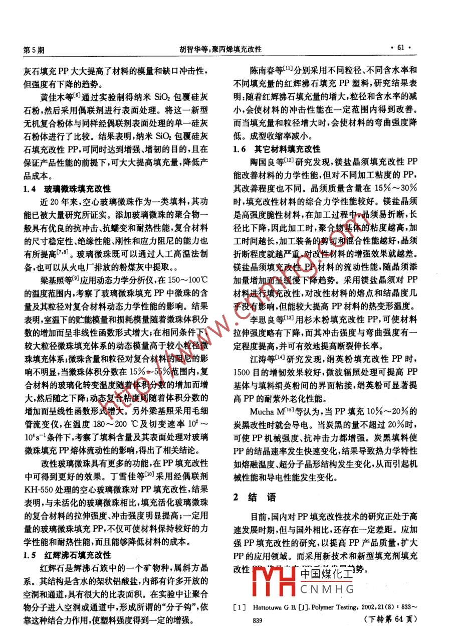 Vol 33 No 5化工新型材料第33卷第5期NEW CHEMICAL MATERIALS2005年5月聚丙烯填充改性胡智華1傅和青(1.茂名學(xué)院化工學(xué)院,茂名5250002.華南理工大學(xué)化工學(xué)院化工所,廣州510640)摘要論逑了采用滑石粉、碳酸鈣、硅灰石、玻璃微珠、紅輝沸石以及其它材料填充改性聚丙烯的研究。關(guān)鍵詞聚丙烯,填充,改性,進(jìn)展Filling and modifying of polypropyleneHu Zhihua Zou Guimei Fu Heqing?(1. Department of Chemiscal Engineering, Maoming College, Maoming 5250002. Research Institute of Chemical Engineering, South China University of Technology, Guangzhou 510640)Abstract The research on polypropylene,s filling and modifying by alum powder, calcium carbonate, wollas-tonite ore glass microballoon, stellerite and the other materials was summarized.Key words polypropylene, filling, modification, progress聚丙烯(PP)是當(dāng)今最具發(fā)展前途的熱塑性高強(qiáng)度,降低廢舊PP的成型收縮率分子材料之一。有關(guān)PP改性的方法很多,本文僅對(duì)1.2碳酸鈣填充改性PP的填充改性做一論述。碳酸鈣填充改性PP后,其剛性粘度及耐熱性1聚丙烯填充改性技術(shù)研究進(jìn)展得到提高,模塑產(chǎn)品韌性、模量得到提高,熱變形溫度小。 Zoltan D等3研究表明,碳酸鈣填充量在1.1滑石粉填充政性20%~40%時(shí)比較好,過低或過高均不能得到滿意滑石粉是一種廉價(jià)的填料?;厶畛銹P通效果。常分為兩類:類是填充量為30%~40%,對(duì)PP改目前超細(xì)重質(zhì)碳酸鈣粉表面改性是使一般增量性后可提高熱變形溫度和柔曲模量;另一類是填充填料轉(zhuǎn)變?yōu)楣δ芴盍系纳罴庸ぜ夹g(shù)之一。李珍等量為10%~20%,可提高PP的表面光潔度。分別采用了表面化學(xué)包覆法的干法和濕法兩種方法Hattotuwa G.B等研究滑石粉填充改性PP對(duì)超細(xì)重質(zhì)碳酸鈣進(jìn)行了改性。通過塑料性能對(duì)比發(fā)現(xiàn),可提高其彈性模量和抗沖擊力,減少收縮性。試驗(yàn),發(fā)現(xiàn)充填改性超細(xì)重質(zhì)碳酸鈣粉可使PP塑料Alonso M2等研究發(fā)現(xiàn),由于滑石粉的機(jī)械特性和的主要物理性能得到明顯改善平面結(jié)構(gòu)對(duì)PP的晶形排列有很大影響,稍微增加納米碳酸鈣對(duì)PP有顯著的增強(qiáng)增韌作用。添點(diǎn)滑石粉的量,就會(huì)改變PP的晶形狀態(tài),而PP的加超分散劑可提高納米碳酸鈣的分散效果使體系晶形改變是引起宏觀效應(yīng)的主要原因。在滑石粉中有較好的加工性能加入3%~5%的加工助劑,注塑壓力降低30%成1.3硅灰石填充改性膜溫度降低20~30℃。中國煤化工一定的活性,在填充用滑石粉填充PP,除了斷裂伸長稍有下降外THECNMH較高溫度下成核結(jié)它能大大提高廢舊PP塑料的抗彎強(qiáng)度和缺口沖擊晶平m程艾小,丌仰變窄,結(jié)晶度增加。硅作者簡介:胡智華男博士,副教授第5胡智華等:聚丙烯填充改性灰石填充PP大大提高了材料的模量和缺口沖擊性陳南春等分別采用不同粒徑、不同含水率和但強(qiáng)度有下降的趨勢。不同填充量的紅輝沸石填充PP塑料,研究結(jié)果表黃佳木等通過實(shí)驗(yàn)制得納米SO包覆硅灰明:隨著紅輝沸石填充量的增大粒徑和含水率的減石粉然后采用偶聯(lián)劑進(jìn)行表面處理。將這一新型小,會(huì)使材料的沖擊性能在一定范圍內(nèi)得到改善。無機(jī)復(fù)合粉體與同樣經(jīng)偶聯(lián)劑表面處理的單一硅灰而當(dāng)填充量和粒徑增大時(shí),會(huì)使材料的彎曲強(qiáng)度降石粉體進(jìn)行了比較。結(jié)果表明,納米SiO2包覆硅灰低。成型收縮率減小。石填充改性PP,可同時(shí)達(dá)到增強(qiáng)、增韌的目的,且在16其它材料填充改性保證產(chǎn)品性能的前提下可大大提高填充量降低產(chǎn)陶國良等2研究發(fā)現(xiàn),鎂鹽晶須填充改性PP品成本能改善材料的力學(xué)性能,但對(duì)不同加工粘度的PP1.4玻璃微珠填充改性其改善程度也不同。晶須質(zhì)量含量在15%~30%近20年來,空心玻璃微珠作為一類填料,其功時(shí),填充改性材料的綜合力學(xué)性能較好。鎂鹽晶須能已被大量研究所證實(shí)。添加玻璃微珠的聚合物是高強(qiáng)度脆性材料,在加工過程中,晶須易折斷,長般具有優(yōu)良的抗沖擊抗蠕變和耐熱性能,復(fù)合材料徑比下降因此加工時(shí),聚合物基體的粘度越高,加的尺寸穩(wěn)定性、絕緣性能剛性和應(yīng)力阻尼的能力也工時(shí)間越長,加工裝備的剪切和混合性能越好,晶須有所提髙。玻璃微珠既可以通過人工髙溫法制折斷程度就越嚴(yán)重,對(duì)改性材料的增強(qiáng)效果就越差備,也可以從火電廠排放的粉煤灰中提取鎂鹽晶須填充改性PP材料的流動(dòng)性能隨晶須添梁基照等應(yīng)用動(dòng)態(tài)力學(xué)分析儀,在150~100℃加量增加而呈緩慢下降趨勢。采用鎂鹽晶須對(duì)PP的溫度范圍內(nèi),考察了玻璃微珠填充PP中微珠的含材料進(jìn)行填充改性,對(duì)改性材料的熔點(diǎn)和結(jié)晶度幾量及其粒徑對(duì)復(fù)合材料動(dòng)態(tài)力學(xué)性能的影響。結(jié)果乎沒有影響但能較大提高PP材料的熱變形溫度。表明,室溫下的貯能模量和損耗模量隨著微珠體積分李思良等1用杉木粉填充改性PP,可使材料數(shù)的增加而呈非線性函數(shù)形式增大;在相同條件下,拉伸強(qiáng)度略有下降,而其沖擊強(qiáng)度與彎曲強(qiáng)度有較大粒徑微珠填充體系的動(dòng)態(t