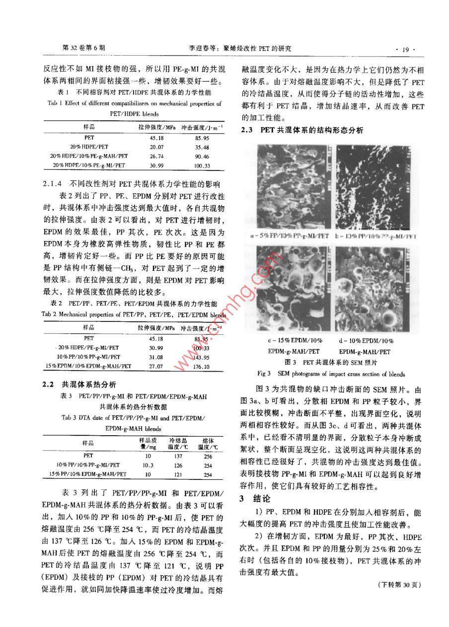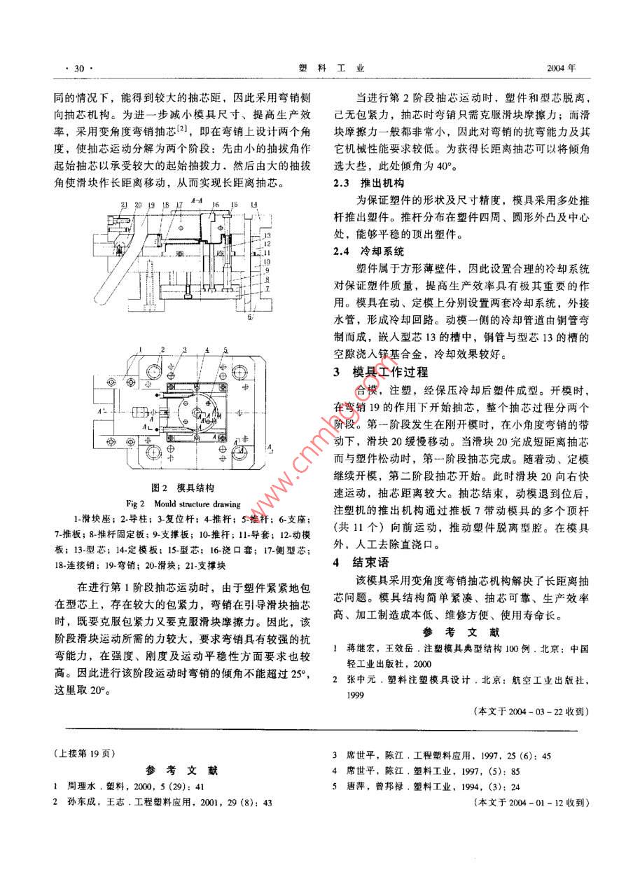 第32卷第6期李迎春等:聚烯烴改性PET的研究19 .反應(yīng)性不如MI接枝物的強(qiáng),所以用PE.g-MI的共混融溫度變化不大,是因?yàn)樵跓崃W(xué)上它們?nèi)匀粸椴幌囿w系兩相間的界面粘接強(qiáng)一些,增韌效果耍好一-些。容體系。由于對(duì)熔融溫度影響不大,但是降低了PET表1不同相容 劑對(duì)PET/ IDIPEP共混體系的力學(xué)性能的冷結(jié)晶溫度,從而使得分子鏈的活動(dòng)性增加,這些Tab 1 Elect of diferet compaibilizern on mechanical properties of都有利于PET結(jié)晶,增加結(jié)晶速率,從而改善PETPET/ HDPE blends的加工性能。樣品拉仲?gòu)?qiáng)度/MPa沖擊強(qiáng)度/m '2.3PET共混體系的結(jié)構(gòu)形態(tài)分析PF5.1820% HDPE/PET20.0735.4820% IDPE/ I0% PE-g MAH/PET26.7490.4620% HDPE/10% PE-g MI/PET30.99100.332.1.4不同改性劑對(duì)PET共混體系力學(xué)性能的影響表2列出了PP、PE、 EPDM 分別對(duì)PET進(jìn)行改性時(shí),共混體系中沖擊強(qiáng)度達(dá)到最大值時(shí),各自共混物的拉伸強(qiáng)度。由表2可以看出,對(duì)PET進(jìn)行增韌時(shí),EPDM的效果最佳,PP其次,PE次次。這是因?yàn)閍- 5%FP/10%PP.g-MIVPET b- 10% PP/10% Pp-MI/PFTEPDM本身為橡膠高彈性物質(zhì),韌性比PP和PE都高,增韌肯定好一些。而PP比PE要好的原因可能是PP結(jié)構(gòu)中有側(cè)鏈- CHs, 對(duì)PET起到了一定的增韌效果。而在拉伸強(qiáng)度方面,則是EPDM對(duì)PET影響最大,拉伸強(qiáng)度數(shù)值降低的比較多。表2 PET/PP. PET/PE、PET/EPDM共混體系的力學(xué)性能Tab 2 Mechanical propetie of PETPP, PET/PE, PEI/EPDM blends拉伸強(qiáng)度/MPa沖 擊強(qiáng)度/m-'PET45.1885.95c- 15% EPDM/10%d- 10% EPDM/ 10%. 20% HDPE/PE-g-MI/PET0.99EPDM-g- MAH/PETEPDM-g-MAH/PET10%PP/10% P-g-MI/PET31.08143.95 .圖3 PET共混體系的SEM照片15% EPDM/ 10% EPDM-g-MAH/PET7.07176.10Fig3 SEM photograms of impact cross section of blends2.2共混體 系熱分析圖3為共混物的缺口沖擊斷面的SEM照片。由表3 PETPPP-gMI 和PET/ EPDM/ EPDM-gMAH圖3a、b可看出,分散相EPDM和PP粒子較小,界共混體系的熱分析數(shù)據(jù)面比較模糊,沖擊斷面不平整,出現(xiàn)界面空化,說(shuō)明Tab 3 DTA datc of PET/PP/PP-g- MI and PET/EPDM/EPDM- g-MAH blends兩相相容性較好。而從圖3c、d可看出,兩種共混體樣晶質(zhì)冷結(jié)晶熔體系中,已經(jīng)看不清明顯的界面,分散粒子本身沖斷成量/mg__ 溫度/心溫度/心絮狀,整個(gè)斷面呈現(xiàn)空化,這說(shuō)明這兩種共混體系的10375610% PP/10% PP-g-MI/PET10.32654相容性已經(jīng)很好了,共混物的沖擊強(qiáng)度達(dá)到最佳值。15% PP/ 10% EPDM-g-MAH/PET表明接枝物PP-g-MI 和EPDM-g- MAH可以起到良好增表3列出了. PET/PP/PP-g-MI 和PET/EPDM/容作用,使它們具有較好的工藝相容性。EPDM.g-MAH共混體系的熱分析數(shù)據(jù)。由表3可以看3結(jié)論出,加人10%的PP和10%的PP-_g-MI后,使PET的1) PP、EPDM和HDPE在分別加人相容劑后,能熔融溫度由256C降至254C,而PET的冷結(jié)晶溫度大幅度的提高PET的沖擊強(qiáng)度且使加工性能改善。由137心降至126C。加入15%的EPDM和EPDM-g-.2)在增韌方面,EPDM為最好,PP其次,HDPEMAH后使PET的熔融溫度由256 C降至254 C,而次次。并且EPDM和PP的用量分別為25%和20%左PET的冷結(jié)晶溫度由137 C降至121 C,說(shuō)明PP右時(shí)(包括各自的10%接枝物),PET共混體系的沖(EPDM)及接枝的PP (EPDM) 對(duì)PET的冷結(jié)晶具有擊強(qiáng)度有最大值。(下轉(zhuǎn)第30頁(yè))促進(jìn)作用,就如同加快降溫速率使過(guò)冷度增加。而熔30●塑料工業(yè)2004年同的情況下,能得到較大的抽芯距,因此采用彎銷側(cè).當(dāng)進(jìn)行第2階段抽芯運(yùn)動(dòng)時(shí),塑件和型芯脫離.向抽芯機(jī)構(gòu)。為進(jìn)一步減小模具尺寸、提高生產(chǎn)效己無(wú)包緊力,抽芯時(shí)彎銷只需克服滑塊摩擦力;而滑率,采用變角度彎銷抽芯(2],即在彎銷上設(shè)計(jì)兩個(gè)角塊摩擦力 - .般都非常小,因此對(duì)彎銷的抗彎能力及其度,使抽芯運(yùn)動(dòng)分解為兩個(gè)階段:先由小的抽拔角作它機(jī)械性能要求較低。為獲得長(zhǎng)距離抽芯可以將傾角起始抽芯以承受較大的起始抽拔力.然后由大的抽拔選大些,此處傾角為40%。角使滑塊作長(zhǎng)距離移動(dòng),從而實(shí)現(xiàn)長(zhǎng)距離抽芯。2.3推出機(jī)構(gòu), A-4為保證塑件的形狀及尺寸精度,模具采用多處推桿推出塑件。推桿分布在塑件四周、圓形外凸及中心處,能夠平穩(wěn)的頂出塑件。JN用2.4 冷卻系統(tǒng)塑件屬于方形薄壁件,因此設(shè)置合理的冷卻系統(tǒng)對(duì)保證塑件質(zhì)量,提高生產(chǎn)效率具有極其重要的作用。模具在動(dòng)、定模.上分別設(shè)置兩套冷卻系統(tǒng),外接水管,形成冷卻回路。動(dòng)模-側(cè)的冷卻管道由銅管彎制而成,嵌人型芯13的槽中,銅管與型芯13的槽的空隙澆人鋅基合金,冷卻效果較好。書3模具工作過(guò)程合模,注塑,經(jīng)保壓冷卻后塑件成型。開模時(shí),4--. EB國(guó)就4 -*-++/在彎銷19的作用下開始抽芯,整個(gè)抽芯過(guò)程分兩個(gè)A階段。第一階段發(fā)生在剛開模時(shí),在小角度彎銷的帶柬_ @動(dòng)下,滑塊20緩慢移動(dòng)。當(dāng)滑塊20完成短距離抽芯D4而與塑件松動(dòng)時(shí),第一階段抽芯完成。隨著動(dòng)、定模繼續(xù)開模,第二階段抽芯開始。此時(shí)滑塊20向右快圖2模具結(jié)構(gòu)速運(yùn)動(dòng),抽芯距離較大。抽芯結(jié)束,動(dò