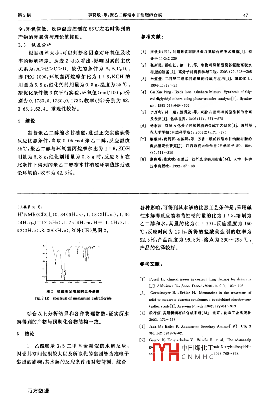 第35卷第2期精細化工中間體Vol, 35 No. 22005年4月FINE CHEMICAL INTERMEDIATESApril 2005聚乙二醇縮水甘油醚的合成李賀敏,金華,朱紅軍(南京工業(yè)大學(xué)理學(xué)院應(yīng)用化學(xué)系,江蘇南京210009)摘要:以聚乙二醇(PEG1000)、環(huán)氧氣丙烷和KOH為原料,四丁基澳化銨(Bu1NBr)為催化劑制得聚乙二醇縮水甘油醚。通過正交試驗研究了聚乙二醇縮水甘油醚制備過程中反應(yīng)溫度、原料配比、催化劑用量、KOH用量對產(chǎn)物收率及環(huán)氧值的影響。實驗結(jié)果表明當(dāng)取005 mol peg100,0.3mol環(huán)氧氣丙烷和5.8gKOH時,在0.8gBu1NBr催化作用下,于55℃反應(yīng)8h得到的產(chǎn)物具有較為理想的收率和環(huán)氧值。并用傅立葉紅外光譜及環(huán)氧值對產(chǎn)物進行了表征關(guān)鍵詞:聚乙二醇縮水甘油醚;合成;環(huán)氧值;正交實驗中圖分類號:TQ223.2文獻標(biāo)識碼:A文章編號:1009-9212(200502004503Synthesis of Polyethylene Glycol Bisglycidyl EtherLI HeJIN Hua, ZHU HeCollege of ScienceNanjing University of Technology, Nanjing 210009, China)Abstract: Polyethylene glycol bisglycidyl ether was synthesized by the reaction of polyethylene glycol(average mol weight 1000, PEG-1000)with epichlorohydrin and KOH, under the catalysis of tetrabutylam-monium bromide( Bu NBr). The conditions of the reaction, such as the temperature of reaction, reactiontime, the mol ratio of the raw materials and amount of catalyst were studied. The results showed the opti-mal yield and epoxy value could be obtained when 0. 05 molPEG-1000,0. 3 mol epichlorohydrin reactedwith 5. 8 g KOH for 8h, under 55C, 0.8g Bu, NBr. Its structure was characterized by IR and epoxy val-Key words: Polyethylene glycol bisglycidyl ether; synthesis; epoxy value; orthogonal experiment聚乙二醇1000(PEG1000(CA),環(huán)氧氯丙烷,1前言四丁基溴化銨,KOH,CH2Cl2均為分析純。傅立葉聚乙二醇縮水甘油醚是一種脂肪族雙環(huán)氧基樹紅外光譜儀,HH4數(shù)顯恒溫水浴鍋,循環(huán)水式多用脂,是一種良好的交聯(lián)劑。近年來,合成低分子真空泵,J1精密增力電動攪拌器。量、收率高的縮水甘油醚的較多,而合成高分子量,2.2實驗收率較髙,環(huán)氧值接近理論環(huán)氧值的聚乙二醇縮水首先將0.05mol分子量是1000的聚乙二醇甘油醚的較少1。為了得到收率高環(huán)氧值接近定量的環(huán)氧氯丙烷KOH、四丁基溴化銨和CH理論環(huán)氧值的聚乙二醇縮水甘油醚,筆者對聚乙二Cl2加入裝有電動攪拌、回流冷凝管和溫度計的250醇縮水甘油醚的合成工藝進行了研究,其中包括聚ml三口燒瓶中攪拌并在30min內(nèi)加熱升溫至所乙二醇與環(huán)氧氯丙烷的配比,KOH用量,催化劑用定的反應(yīng)溫度,在此溫度下繼續(xù)攪拌反應(yīng)8h,過濾量,反應(yīng)溫度等因素的影響,從而制備出粘合性、反除去生成的無機鹽,CH2Cl2層水洗三次,再用無水應(yīng)性及耐熱性良好的聚乙二醇縮水甘油醚硫酸鈉干燥后,常壓蒸餾除去溶劑CH2C2,得到產(chǎn)物聚乙二醇縮水甘油醚。采用傅立葉紅外光譜儀測2實驗部分定聚中國煤化工紅外光譜圖。滴定2.1化學(xué)試劑和儀器法測CNMHG·作者簡介:事賀敏(1978-)女,吉林吉林人,碩士研究生,主要從事有機合成和應(yīng)用化學(xué)方面的研究。E- mail: lihemin( eyou. com聯(lián)系人:未紅軍(1963)男,教授,E- mail; zhuji@ snout. edu. en萬意藜:z004-03-264精細化工中間體第35卷2.3產(chǎn)品檢測2.4正交實驗環(huán)氧氯丙烷與聚乙二醇在催化下可發(fā)生開環(huán)加實驗表明影響反應(yīng)的因素有反應(yīng)溫度、原料配成反應(yīng),生成的產(chǎn)物再在堿性條件下脫除氯化氫而比、催化劑用量、KOH用量。為尋找優(yōu)惠條件,在生成縮水甘油醚。反應(yīng)時間為8h條件下,以原料配比(PEG與環(huán)氧2.3.1環(huán)氧值的測定氯丙烷的摩爾比,A)、KOH用量(B)、催化劑用量聚乙二醇縮水甘油醚中主要官能團之一是環(huán)氧C)反應(yīng)溫度(D)這4個因素做4因素3水平正交官能團,其含量的多少對其性質(zhì)和用途具有很大的實驗。因素水平安排表見表1,正交實驗方案及數(shù)影響“。本采用文獻方法對所合成產(chǎn)品的環(huán)氧據(jù)處理見表2。值進行了測定,在優(yōu)惠反應(yīng)PEG-1000:環(huán)氧氯丙烷摩爾比為1:6KOH的用量為5.8g,催化劑的用表1正交實驗因素水平表量為0.8g,溫度為55℃條件下得到的產(chǎn)品環(huán)氧值Table 1 The factor and level of orthogonal experiment為0.1732mol/100g,為理論值(0.1799mol/100Ac(g)D(℃)g)的96.3%。紅外光譜中1278cm為直鏈醚中COC的伸縮振動帶,1241cm,841cm為環(huán)醚中C5.80.8OC的對稱和反對稱伸縮振動,在IR譜中的:3200-3600cm‘的弱吸收峰說明合成的聚乙二醇縮注:PEG在實驗過程中始終取0.05mol水甘油醚中仍有少量的OH未被徹底環(huán)氧丙基化與環(huán)氧值測定結(jié)果一致。表2L3正交實驗表Table 2 Result of orthogonal experiment環(huán)氧值收率B.Ccccccccc46.3D0.15180.11940.17200.1687DI57.20.4360.380.43480.42170.43210.39260.50800.38450,2080.05200.04310.0375理論量(5.6g)略高。同時KOH用量過大不利于3結(jié)果與討論產(chǎn)物的處理,尤其是在水洗C2H2Cl2層時容易發(fā)生3.1投料配比影響乳化現(xiàn)象。由表2可知,投料配比對環(huán)氧值的影響比較大。3.3催化劑用量的影響環(huán)氧氯內(nèi)烷過量有利于提高產(chǎn)物的環(huán)氧值。當(dāng)兩者由表2可知隨著催化劑的用量的增加,反應(yīng)產(chǎn)的物質(zhì)的量比僅是理論摩爾比1:2時,產(chǎn)品的環