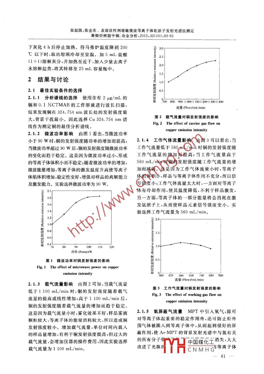 冶金分析,2012,32(10):6063Metallurgical Analysis, 2012, 32(10): 60-63文章編號(hào):1000-7571(2012)10-0060-04表面活性劑増敏微波等離子體炬原子發(fā)射光譜法測(cè)定聚烯烴樹脂中銅張起凱,焦金慶遼寧石油化工大學(xué)石油化工學(xué)院,遼寧撫順113001摘要:研究了在表面活性劑增敏作用下微波等離子體炬原子發(fā)射光譜法( MPT-AES)測(cè)定聚烯烴樹脂中銅的新方法。對(duì)銅測(cè)定的儀器工作條件、酸效應(yīng)及共存元素的影響進(jìn)行了詳細(xì)考察。實(shí)驗(yàn)結(jié)果表明,陽離子表面活性劑( CTMAB)對(duì)銅的測(cè)定有明顯的增敏效果,可使銅的檢出限由7.6ng/mL下降為3,lng/mL,釩、鈉、錳、鐵、鈦等元素的允許量由1倍提高到5倍以上。采用灰化法處理聚烯烴樣品,通過工作曲線法測(cè)定聚乙烯和聚丙烯中銅的相對(duì)標(biāo)準(zhǔn)偏差分別為3.0%和1.9%,加標(biāo)回收率分別為98%-103%和99%~102%關(guān)鍵詞:微波等離子體炬;原子發(fā)射光譜法;聚烯烴樹脂;銅;表面活性劑中圖分類號(hào):0657.31文獻(xiàn)標(biāo)識(shí)碼:A聚烯烴是烯烴均聚物和共聚物的總稱,包括510型MPT光譜儀(長春吉大·小天鵝儀器聚乙烯、聚丙烯、聚丁烯以及其他烯烴類聚合物,有限公司)。通常所說的聚烯烴主要指聚乙烯和聚丙烯。聚烯銅標(biāo)準(zhǔn)儲(chǔ)備液:100pg/mL,準(zhǔn)確稱取烴是通訊電線和電力電纜的優(yōu)良絕緣材料,對(duì)金0.1965 g CusO4·5H2O于燒杯中,使用去離子屬元素含量有嚴(yán)格要求,其中銅對(duì)聚烯烴具有催水溶解,加入1mL的濃硫酸酸化,轉(zhuǎn)移至500化氧化作用,能加速聚烯烴老化,降低其使用壽mL容量瓶中,用去離子水定容;十六烷基三甲基命1。聚烯烴樹脂中銅的測(cè)定常采用分光光度溴化銨( CTMAB)溶液:0.01g/mL法2和火焰原子吸收光譜法34。其中分光光度所有試劑均為分析純,實(shí)驗(yàn)用水為一次去離法選擇性差,需用萃取方法分離干擾離子,操作繁子水瑣;火焰原子吸收光譜法測(cè)銅的選擇性好,但銅測(cè)1.2實(shí)驗(yàn)方法定的靈敏度不高。微波等離子體炬原子發(fā)射光譜首先開啟恒溫循環(huán)冷凝水裝置,設(shè)置冷卻溫法( MPT-AESY是以微波等離子體炬(MPT)為激度為8.0℃。然后開啟510型MPT光譜儀,運(yùn)發(fā)光源,氬氣為等離子體工作氣體的一種新的原行MPT光譜儀工作軟件,設(shè)置儀器的系統(tǒng)參數(shù),子發(fā)射光譜分析技術(shù),具有分析速度快樣品用預(yù)熱儀器。20min后,通入氬氣,當(dāng)載氣流量和量少、靈敏度高、操作簡(jiǎn)單等特點(diǎn),已應(yīng)用于油工作氣流量達(dá)到穩(wěn)定后點(diǎn)燃MPT,在選定的波長品7和催化劑中銅含量的測(cè)定。本實(shí)驗(yàn)在下對(duì)銅進(jìn)行分析MPT-AES測(cè)銅的基礎(chǔ)上,研究表面離子活性劑1.3樣品處理對(duì)銅的增敏作用,使銅的檢出限和選擇性均得到準(zhǔn)確稱取一定量的聚烯烴樹脂于瓷坩堝中,改善,并應(yīng)用于聚烯烴樹脂中銅的測(cè)定將坩堝放在電爐上,低溫加熱至試樣熔化。當(dāng)出現(xiàn)白色氣體時(shí)將其點(diǎn)燃,同時(shí)降低爐溫,使其自1實(shí)驗(yàn)部分燃。當(dāng)火焰快熄滅時(shí)再升高電爐溫度,繼續(xù)加熱1.1主要儀器與試劑至無氣體產(chǎn)生。將坩堝移入馬弗爐中,在500℃收稿日期:2012-02-09中國煤化工作者簡(jiǎn)介:張起凱(1967—),男,碩士;高級(jí)實(shí)驗(yàn)師,碩土生導(dǎo)師,從事分析G163.comCNMHG張起凱焦金慶.表面活性劑增敏微波等離子體炬原子發(fā)射光譜法測(cè)定聚烯烴樹脂中銅.冶金分析,2012,32(10):6063下灰化4h后停止加熱。待馬弗爐溫度降到200℃以下時(shí),取出坩堝冷卻至室溫。加5mL鹽酸(1+1)溶解灰分,并加熱至近干,加入少量去離子水溶解鹽類,將其轉(zhuǎn)移至25mL容量瓶中。2結(jié)果與討論2.1最佳實(shí)驗(yàn)條件的選擇2.1.1分析譜線的選擇使用含有2g/mL的X)800900I00l100120013001400銅和0.1% CTMAB的工作溶液進(jìn)行波長掃描流量(Fow/mL/min)結(jié)果發(fā)現(xiàn)銅在324.754nm波長處的發(fā)射強(qiáng)度最大,背景干擾最小。因此選擇Cu324.754nm譜圖2載氣流量對(duì)銅發(fā)射強(qiáng)度的影響線作為測(cè)定銅的最佳分析譜線Fig. 2 The effect of carrier gas flow oncopper emission intensity2.1.2微波功率影響由圖1看出,當(dāng)微波功率小于90W時(shí),銅的發(fā)射強(qiáng)度隨功率的增加而提高;2.1.4工作氣體流量影響由圖3可以看出,當(dāng)當(dāng)微波功率超過90W后銅的發(fā)射強(qiáng)度隨微波功率工作氣流量低于560mL/min時(shí)銅的發(fā)射強(qiáng)度隨的變化而趨于穩(wěn)定。這是因?yàn)槲⒉üβ蔬^小,形成工作氣流量的增加而提高;當(dāng)工作氣流量高于的等離子體體積小而不穩(wěn)定;隨著微波功率的增加,560mL/min時(shí)銅的發(fā)射強(qiáng)度隨工作氣流量的增微波能量增加,等離子體的激發(fā)溫度升高使等離子加而減弱。這是因?yàn)楣ぷ鳉怏w流量小時(shí),等離子體焰體積增加穩(wěn)定性變好增強(qiáng)對(duì)樣品的離解能力體的體積小,樣品與等離子體作用不充分,所以信及激發(fā)能力。實(shí)驗(yàn)選擇微波功率為90W。號(hào)強(qiáng)度小;工作氣體流量太大時(shí),一方面對(duì)等離子體有冷卻作用,使其溫度降低,不利于樣品激發(fā),另一方面,等離子體的一部分能量將會(huì)消耗在激5829色毫在發(fā)氬原子上,從而使樣品元素信號(h