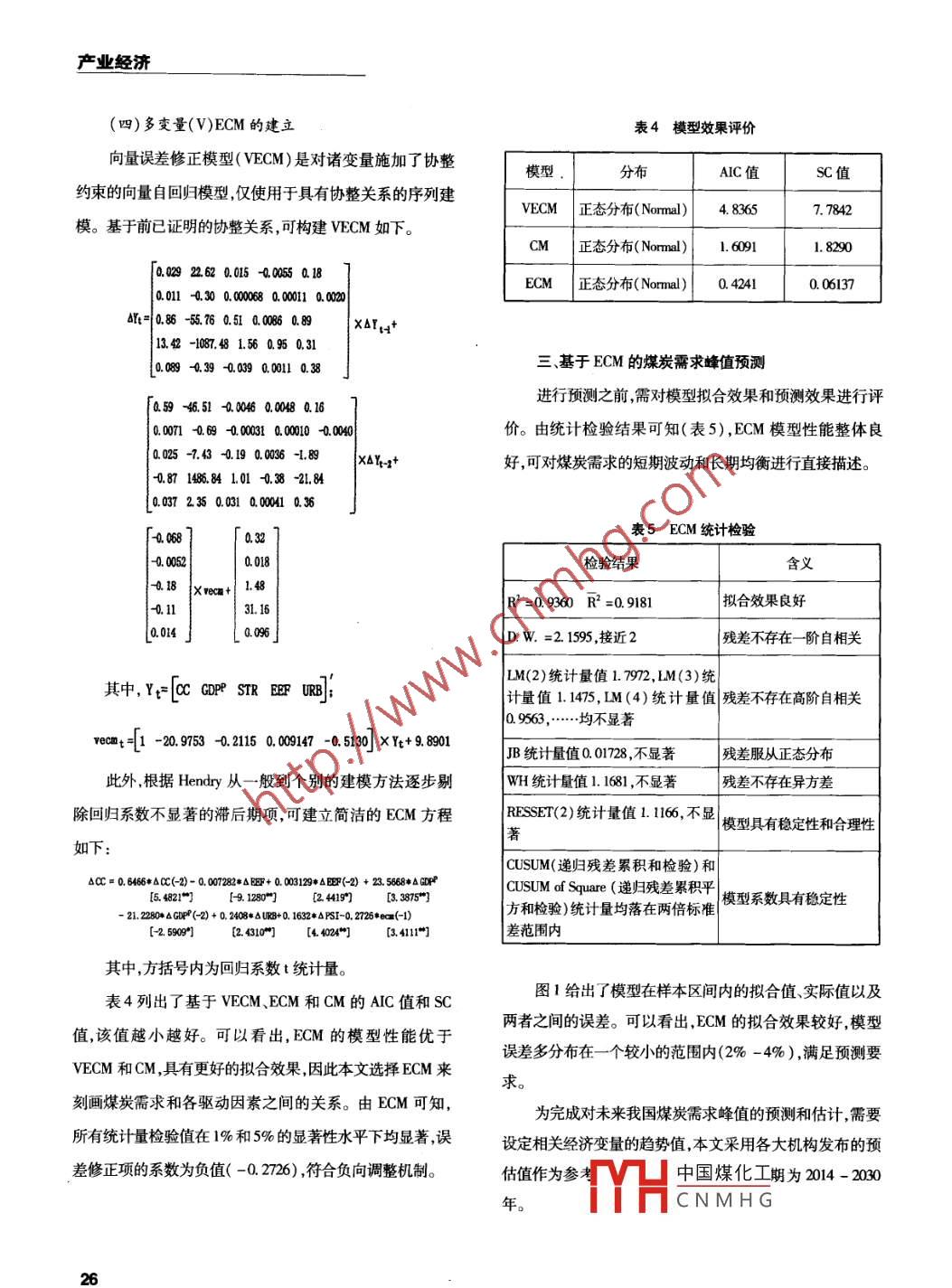 2015年第2期《發(fā)展研究》我國(guó)煤炭需求峰值預(yù)測(cè)及應(yīng)對(duì)●李維明[內(nèi)容提要]在當(dāng)前資源環(huán)境形勢(shì)日 益嚴(yán)峻的背景下,預(yù)測(cè)我國(guó)煤炭需求峰值提前做好產(chǎn)能規(guī)劃與部署,對(duì)于科學(xué)推動(dòng)煤炭消費(fèi)總量控制,實(shí)現(xiàn)煤炭產(chǎn)業(yè)健康、穩(wěn)定和可持續(xù)發(fā)展意義重大。本文基于計(jì)量經(jīng)濟(jì)學(xué)理論,針對(duì)1978- 2013 年的樣本數(shù)據(jù),構(gòu)建了基于煤炭需求的多因素協(xié)整模型(CM)、誤差修正模型(ECM)和向量誤差修正模型( VECM)。比較發(fā)現(xiàn),ECM的模型性能和擬合效果更佳,故基于ECM對(duì)未來(lái)我國(guó)煤炭的需求峰值進(jìn)行了預(yù)測(cè)和分析。結(jié)果表明,我國(guó)煤炭需求峰值預(yù)計(jì)出現(xiàn)在2020年,峰值水平為45億噸;2020年前,煤炭需求量年均增幅3.9% ,2020年后開(kāi)始出現(xiàn)下降,年均降幅0.76% ,到2030年降至42億噸。面對(duì)即將到來(lái)的煤炭峰值,政府管理部門(mén)應(yīng)及早謀劃、加強(qiáng)應(yīng)對(duì),切實(shí)推動(dòng)煤炭產(chǎn)業(yè)轉(zhuǎn)型升級(jí)和可持續(xù)發(fā)展。[關(guān)鍵詞]煤炭需求 峰值應(yīng)對(duì)中圖分類(lèi)號(hào):F407.21文獻(xiàn)標(biāo)識(shí)碼:A文章編號(hào):1003 -0670(2015)03 -0023 -6近年來(lái),煤炭消費(fèi)的過(guò)快增長(zhǎng)及其低效、不清潔利用煤炭需求及峰值預(yù)測(cè)是一項(xiàng)涉及經(jīng)濟(jì)-能源-環(huán)境使得我國(guó)資源、環(huán)境、經(jīng)濟(jì)和社會(huì)可持續(xù)發(fā)展問(wèn)題日益突的復(fù)雜系統(tǒng)工程。研究方法大體分為兩類(lèi):直接預(yù)測(cè)法和出。實(shí)施煤炭總量控制,倒逼能源結(jié)構(gòu)調(diào)整和煤炭清潔高間接預(yù)測(cè)法。直接預(yù)測(cè)法(也稱(chēng)部門(mén)分析法)指的是通過(guò)效利用,已成為我國(guó)推進(jìn)生態(tài)文明建設(shè)和綠色發(fā)展的必然直接估計(jì)各主要耗煤行業(yè)的煤炭需求量,匯總形成對(duì)煤炭要求。事實(shí)上,我國(guó)政府已開(kāi)始高度重視能源結(jié)構(gòu)調(diào)整,需求總量的估計(jì)(郭云濤,2004;曾琳,2014)。而間接預(yù)測(cè)特別是控制煤炭消費(fèi)總量和降低煤炭在能源消費(fèi)中的比法則是指通過(guò)估計(jì)煤炭需求與其驅(qū)動(dòng)因素之間的內(nèi)在關(guān)重。《煤炭工業(yè)發(fā)展“十二五”規(guī)劃》(發(fā)改能源[2012]640系來(lái)構(gòu)建模型,從而為煤炭需求預(yù)測(cè)提供依據(jù)和參考,模號(hào))提出,2015年我國(guó)煤炭產(chǎn)量和消費(fèi)量都要控制在39億型主要涉及:EG誤差修正模型(Chan and lee,1979)、BP神噸。2013 年9月國(guó)務(wù)院印發(fā)的《大氣污染防治行動(dòng)計(jì)劃》經(jīng)網(wǎng)絡(luò)模型(寧云才,2003)、向量自回歸模型(林伯強(qiáng)等,提出,到2017年,煤炭占-次能源消費(fèi)比重降低到65%以2007)、面板數(shù)據(jù)模型( Cattaneo ,2010)、灰色滾動(dòng)機(jī)制模型下。國(guó)家能源局則提出2015年就要實(shí)現(xiàn)這-目標(biāo)。2014( Kumar and Jain ,2010)等??v觀現(xiàn)有文獻(xiàn)不難發(fā)現(xiàn),已有年6月13日召開(kāi)的中央財(cái)經(jīng)領(lǐng)導(dǎo)小組第六次會(huì)議上,習(xí)近成果多是煤炭景氣時(shí)期所開(kāi)展的研究,研究目的主要是應(yīng)平同志更是提出要大力推動(dòng)能源消費(fèi)革命、抑制不合理能對(duì)煤炭供不應(yīng)求的局面,很少涉及峰值測(cè)度問(wèn)題。而專(zhuān)門(mén)源消費(fèi)等主要任務(wù)。這意味著,消費(fèi)側(cè)敞開(kāi)口子供應(yīng)的模針對(duì)煤炭經(jīng)濟(jì)下行以來(lái)所開(kāi)展的峰值預(yù)測(cè)研究,目前國(guó)內(nèi)式將終結(jié),煤炭消費(fèi)將受到新的更大限制。在這一新形勢(shì)外成果還幾乎沒(méi)有。本文借助計(jì)量經(jīng)濟(jì)學(xué)理論和方法,從下,對(duì)煤炭需求及其峰值水平和出現(xiàn)時(shí)間的準(zhǔn)確預(yù)測(cè),將分析煤炭需中國(guó)煤化工圣濟(jì)發(fā)展水平作為成為科學(xué)制定中長(zhǎng)期煤炭總量控制目標(biāo)和策略的關(guān)鍵。主要解釋變MYHC N M H G源效率作為重要變23.產(chǎn)業(yè)經(jīng)濟(jì)量納人模型,在深人探尋煤炭需求與這些驅(qū)動(dòng)因素之間函能耗和煤炭消費(fèi)強(qiáng)度。數(shù)關(guān)系基礎(chǔ)上,對(duì)未來(lái)煤炭需求發(fā)展趨勢(shì)和峰值做出估(四)產(chǎn)業(yè)結(jié)構(gòu)計(jì),進(jìn)而為制定煤炭總量控制政策和我國(guó)能源發(fā)展規(guī)劃提國(guó)民經(jīng)濟(jì)三次產(chǎn)業(yè)之間的能耗差異很大,相比第一、供決策參考。三產(chǎn)業(yè),第二產(chǎn)業(yè)的能耗水平要高出很多。尤其對(duì)能源結(jié)-、煤炭需求的主要影響因素構(gòu)以煤為主的我國(guó)來(lái)說(shuō),工業(yè)化城市化的快速推進(jìn)以及(一)煤炭?jī)r(jià)格基礎(chǔ)設(shè)施建設(shè)規(guī)模的不斷擴(kuò)大,對(duì)煤炭這一基礎(chǔ)能源形成按照一般經(jīng)濟(jì)學(xué)理論,價(jià)格是決定需求的主要因素。巨大的直接和間接需求。因此,產(chǎn)業(yè)結(jié)構(gòu)調(diào)整尤其是二產(chǎn)1993年之前,我國(guó)煤炭?jī)r(jià)格受到嚴(yán)格管制,