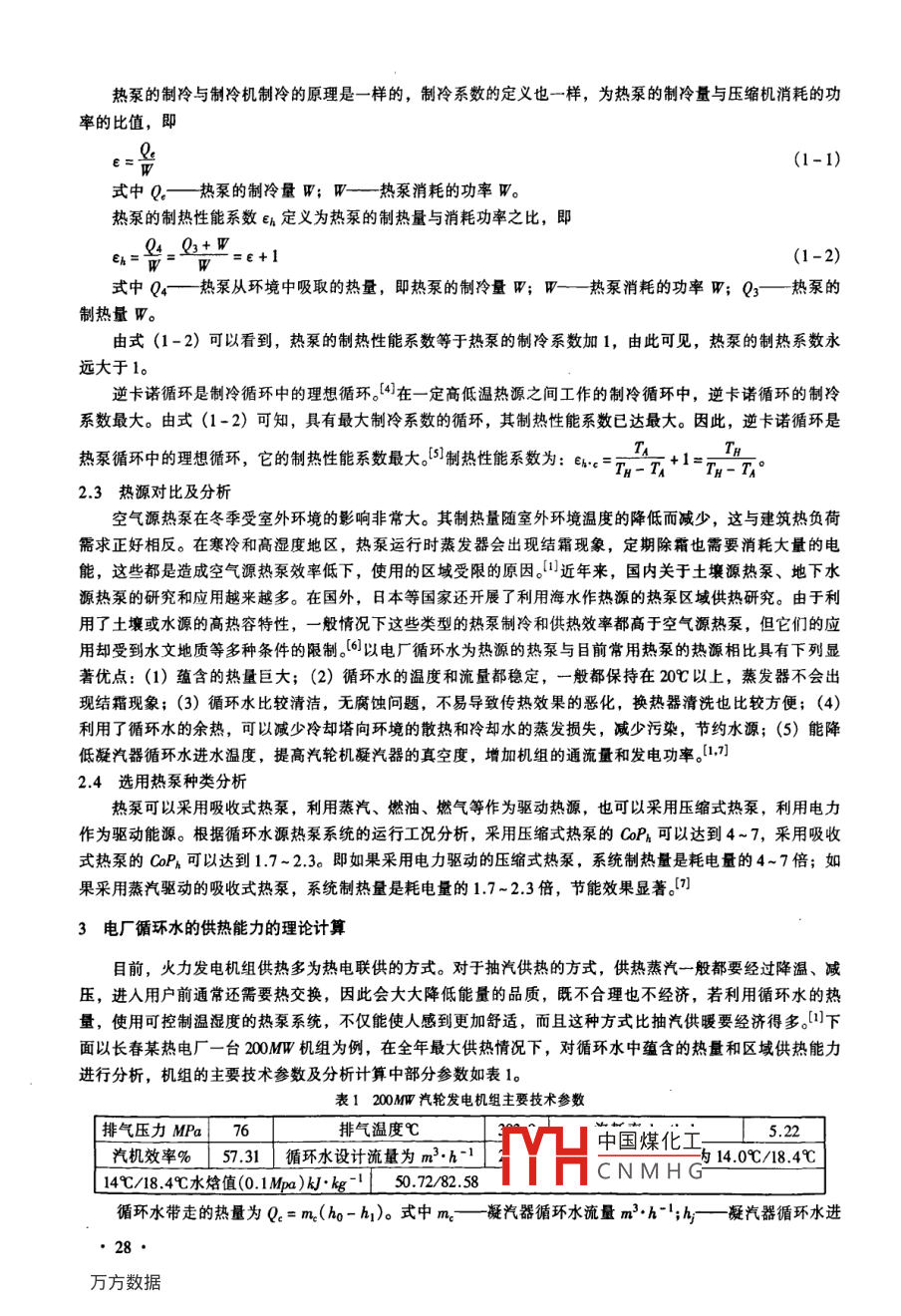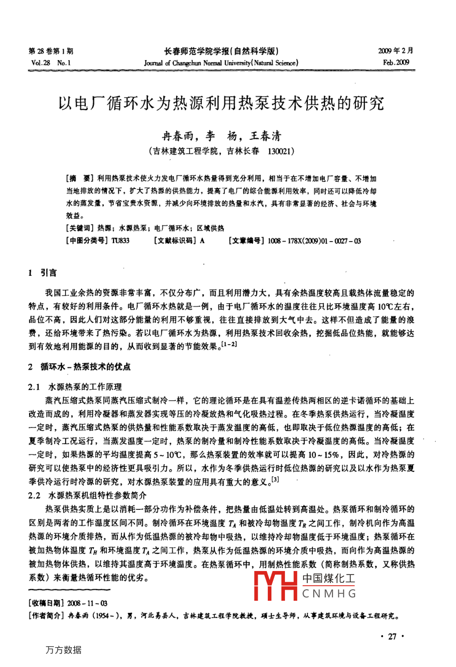 第28卷第1期長(zhǎng)春師范學(xué)院學(xué)報(bào)(自然科學(xué)版)2009年2月Vol 28 No. 1Joumal of Changchun Normal University( Natural Science)Feb. 2009以電廠循環(huán)水為熱源利用熱泵技術(shù)供熱的研究冉春雨,李楊,王春清(吉林建筑工程學(xué)院,吉林長(zhǎng)春130021)[摘要]利用熱泵技術(shù)使火力發(fā)電廠循環(huán)水熱量得到充分利用,相當(dāng)于在不增加電廠容量、不增加當(dāng)?shù)嘏欧诺那闆r下,擴(kuò)大了熱源的供熱能力,提高了電廠的綜合能源利用效率,同時(shí)還可以降低冷卻水的蒸發(fā)量,節(jié)省寶貴水資源,并減少向環(huán)境排放的熱量和水汽,具有非常顯著的經(jīng)濟(jì)、社會(huì)與環(huán)境效益。[關(guān)鍵詞]熱源;水源熱泵;電廠循環(huán)水;區(qū)域供熱中圍分類號(hào)]T833文獻(xiàn)標(biāo)識(shí)碼]A[文章編號(hào)]100-178X(2901-027-031引言我國工業(yè)余熱的資源非常豐富,不僅分布廣,而且利用潛力大,具有余熱溫度較高且載熱體流量穩(wěn)定的特點(diǎn),有較好的利用條件。電廠循環(huán)水熱就是一例,由于電廠循環(huán)水的溫度往往只比環(huán)境溫度高10℃左右,品位不高,因此人們對(duì)這部分能量的利用不夠重視,往往直接排放到大氣中去。這樣不但造成了能量的浪到有效地利用能源的目的,從而收到顯著的節(jié)能效果。-熱泵技術(shù)回收余熱,挖掘低品位熱能,就能夠達(dá)費(fèi),還給環(huán)境帶來了熱污染。若以電廠循環(huán)水為熱源,利用2循環(huán)水-熱泵技術(shù)的優(yōu)點(diǎn)21水源熱泵的工作原理蒸汽壓縮式熱泵同蒸汽壓縮式制冷一樣,它的理論循環(huán)是在具有溫差傳熱兩相區(qū)的逆卡諾循環(huán)的基礎(chǔ)上改造而成的,利用冷凝器和蒸發(fā)器實(shí)現(xiàn)等壓的冷凝放熱和氣化吸熱過程。在冬季熱泵供熱運(yùn)行,當(dāng)冷凝溫度定時(shí),蒸汽壓縮式熱泵的供熱量和性能系數(shù)取決于蒸發(fā)溫度的高低,也即取決于低位熱源溫度的高低;在夏季制冷工況運(yùn)行,當(dāng)蒸發(fā)溫度一定時(shí),熱泵的制冷量和制冷性能系數(shù)取決于冷凝溫度的高低。當(dāng)冷凝溫度一定時(shí),如果熱源的平均溫度提高5~10℃,那么熱泵裝置的效率就可以提高10~15%,因此,對(duì)冷熱源的研究可以使熱泵中的經(jīng)濟(jì)性更具吸引力。所以,水作為冬季供熱運(yùn)行時(shí)低位熱源的研究以及以水作為熱泵夏季供冷運(yùn)行時(shí)冷源的研究,對(duì)水源熱泵裝置的應(yīng)用具有重大的意義。22水源熱泵機(jī)組特性參數(shù)簡(jiǎn)介熱泵供熱實(shí)質(zhì)上是以消耗一部分功作為補(bǔ)償條件,把熱量由低溫處轉(zhuǎn)到高溫處。熱泵循環(huán)和制冷循環(huán)的區(qū)別是兩者的工作溫度區(qū)間不同。制冷循環(huán)在環(huán)境溫度T/和被冷卻物溫度T之間工作,制冷機(jī)向作為高溫?zé)嵩吹沫h(huán)境介質(zhì)排熱,而從作為低溫?zé)嵩吹谋焕鋮s物中吸熱,以維持冷卻物溫度低于環(huán)境溫度;熱泵循環(huán)在被加熱物體溫度TH和環(huán)境溫度TA之間工作,熱泵從作為低溫?zé)嵩吹沫h(huán)境介質(zhì)中吸熱,而向作為高溫?zé)嵩吹谋患訜嵛矬w供熱,以維持其溫度高于環(huán)境溫度。在熱泵循環(huán)中,用制熱性能系數(shù)(簡(jiǎn)稱制熱系數(shù),又稱供熱系數(shù))來衡量熱循環(huán)性能的優(yōu)劣。中國煤化工CNMHG[收稿日期]20-11-03[作者簡(jiǎn)介]冉春雨(1954-),男,河北易縣人,吉林建筑工程學(xué)院教授,項(xiàng)士生導(dǎo)師,從事建筑環(huán)境與設(shè)備工程研究。熱泵的制冷與制冷機(jī)制冷的原理是一樣的,制冷系數(shù)的定義也一樣,為熱泵的制冷量與壓編機(jī)消耗的功率的比值,即Q式中Q—熱泵的制冷量W;W—熱泵消耗的功率W。熱泵的制熱性能系數(shù)Eh定義為熱泵的制熱量與消耗功率之比,即Q43式中Q4——熱泵從環(huán)境中吸取的熱量,即熱泵的制冷量W;W—熱泵消耗的功率W;Q3——熱泵的制熱量W。由式(1-2)可以看到,熱泵的制熱性能系數(shù)等于熱泵的制冷系數(shù)加1,由此可見,熱泵的制熱系數(shù)永遠(yuǎn)大于1。逆卡諾循環(huán)是制冷循環(huán)中的理想循環(huán)。4在一定高低溫?zé)嵩粗g工作的制冷循環(huán)中,逆卡諾循環(huán)的制冷系數(shù)最大。由式(1-2)可知,具有最大制冷系數(shù)的循環(huán),其制熱性能系數(shù)已達(dá)最大。因此,逆卡諾循環(huán)是TTH熱泵循環(huán)中的理想循環(huán),它的制熱性能系數(shù)最大。制熱性能系數(shù)為:esc=Tn- TA TH-7°23熱源對(duì)比及分析空氣源熱泵在冬季受室外環(huán)境的影響非常大。其制熱量隨室外環(huán)境溫度的降低而減少,這與建筑熱負(fù)荷需求正好相反。在寒冷和高濕度地區(qū),熱泵運(yùn)行時(shí)蒸發(fā)器會(huì)出現(xiàn)結(jié)霜現(xiàn)象,定期除霜也需要消耗大量的電能,這些都是造成空氣源熱泵效率低下,使用的區(qū)域受限的原因。近年來,國內(nèi)關(guān)于土壤源熱泵、地下水源熱泵的研究和應(yīng)用越來越多。在國外,日本等國家還開展了利用海水作熱源的熱泵區(qū)域供熱研究。由于利用了土壤或水源的高熱容特性,一般情況下這些類型的熱泵制冷和供熱效率都高于空氣源熱泵,但它們的應(yīng)用卻受到水文地質(zhì)等多種條件的限制。6以電廠循環(huán)水為熱源的熱泵與目前常用熱泵的熱源