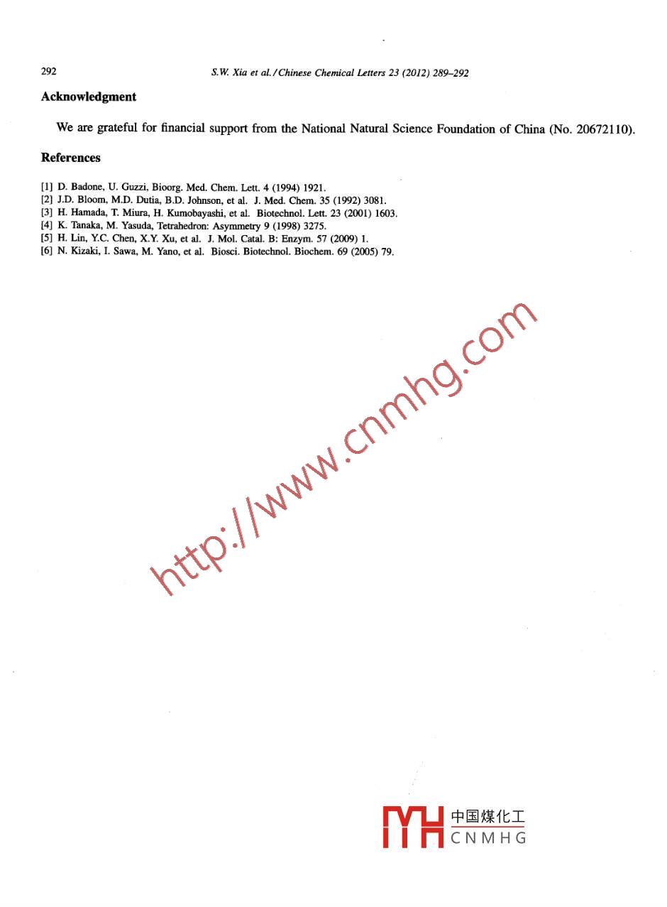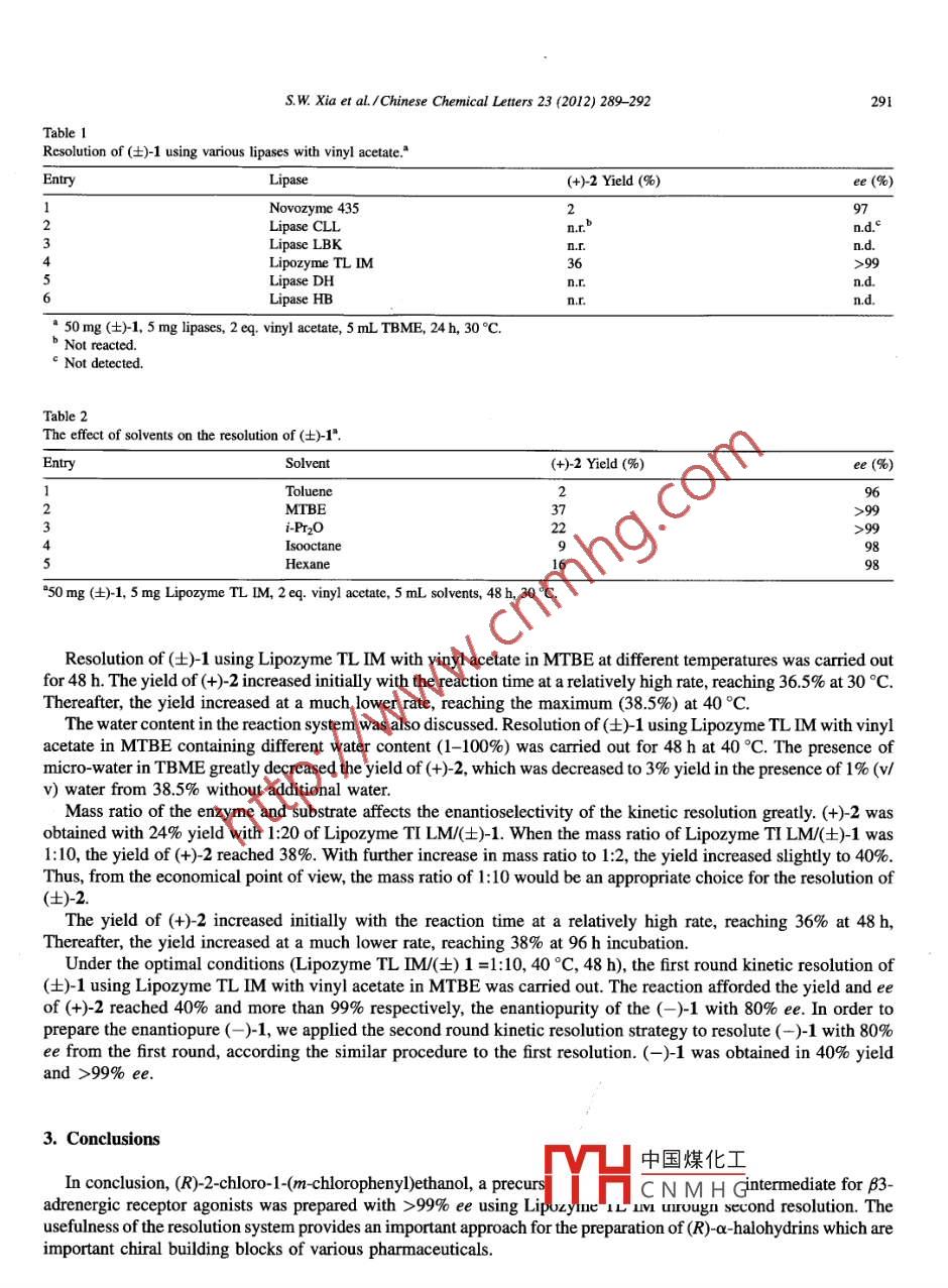 Availableonlineatwww.sciencedirect.comCHINESESciVerse scienceDirectCHEMICALLETTERSELSEVIERChinese Chemical Letters 23(2012)289-292www.elseviercomocate/ccletPreparation of (R)-2-chloro-1-(m-chlorophenyl)ethanol byLipozyme tL IM-catalyzed second resolutionShi Wen Xia * Hui Lin, Yong Zheng ChenCollege of Bio-information, Chongqing University of Posts and Telecommunications, Chongqing 400065, chinab Chengdu Institute of Biology, Chinese Academy of Sciences, Chengdu 610041, ChinaDepartment of Pharmacy, Zunyi Medical College, Zunyi 563003, ChinaReceived 9 October 2011Available online 28 January 2012Abstract(R)-2-Chloro-1-(m-chlorophenyl)ethanol, a precursor of (r)-3-chlorostyrene oxide which is the key chiral intermediate for thepreparation of several B3-adrenergic receptor agonists was prepared in 40% yield and 99%ee by the Lipozyme TL IM-catalyzedsecond resolution of the corresponding racemate in the presence of vinyl acetatC 2012 Shi Wen Xia. Published by elsevier B V. on behalf of Chinese Chemical Society. All rights reserved.Keywords:(R)-2-Chloro-1-(m-chlorophenyl)ethanol; LipozymeTL IM; Enzymatic transesterification; Vinyl acetate; Second resolution(R)-2-Chloro-l-(m-chlorophenyl)ethanol (-)-1 is a precursor of ( r)-3-chlorostyrene oxide which is the key chiralintermediate for the preparation of several B3-adrenergic receptor agonists that show antiobesity, antidiabetic andantidepression activities [1, 2](Scheme 1). To date, several chemical and biological methods for the preparation of(-)-I in enantiomerically pure or enriched form have been reported. Chemical reduction suffers from the problem of usingexpensive chiral catalysts and lower enantioselectivity. Asymmetric reduction of 2-chloro-1-(m-chloro-phenyl)ethanone using an oxazaborolidine-based catalyst gave ()-l in 87% yield and 86% ee [2]. The microbical synthesis of()-l was achieved by reduction of the corresponding ketone using an acetone powder of Geotrichum candidum in94% yield and 98%ee [3], or using the cell-free extract of Rhodotorula glutinis var. dairenensis Ifo 415 in 75% yieldand more than 99%ee [4] or using whole cells of Saccharomyces cerevisiae CGMCC 2. 396 in 90% yield and morethan 99%ee[5]. The enantiopure()-1 could be obtained from the bioreduction of the corresponding a-chloroketonewhile the low productivity of the bioreduction is still a challenge. The kinetic resolution of (=)-l is still an attractivemethod for the preparation of (-)-1 in case of the (+)-1 could be racemized efficiently. a practical synthesis of (R)-3-chlorostyrene oxide starting from 3-chloroethylbenzene was proposed in which(R)-2-bromo-(m-chlorophenyl)ethanol was obtained in more than 99% ee by the treatment of the corresponding racemate with lipase QLin the presence ofpropionic anhydride, the propionate was racemized in 92% yield by acid-catalyzed racemization [6]凵中國(guó)煤化工E-mailaddress:xiasw@cqupt.edu.cn(Sw.XiaCNMHG1001-8417/S-see front matter 2012 Shi Wen Xia. Published by Elsevier B V. on behalf of Chinese Chemical Society. All rights reserveddoi:101016 cclet201201008S.w. Xia et al. /Chinese Chemical Letters 23(2012)289-292、 C Lipozyme TL INCVA. TBMEA(-)-1Scheme 1. The resolution of racemic 1 by Lipozyme TL IMIn the present study, a novel and practical preparation of (-)-1 was achieved starting from(+)-1 in 40% yield and99% ee by commercially available Lipozyme TL IM in the presence of vinyl acetate based on the second resolutionstrategy(Scheme 1).1. ExperimentalRacemic 2-chloro-1-(m-chlorophenyl)ethanol was prepared from the reduction of 2-chloro-1-(3-chlorophenyl)-ethanone by NaBH4 Novozyme 435 and Lipozyme TL IM were a gift from Novo-Nordisk Co. Lipase CLL, LBK, HNand Dh were purchased from the domestic plants. All other chemicals used in this study were from commercial9o To a 500 mL Erlenmeyer shaking-flask were added 16g(0.084 mol)(+)-1, 1.6g Lipozyme TL IM, 14.6garces without further purification(0. 168 mol) vinyl acetate and 400 mL MTBE. The mixture was shaken for 48 h at 40C. After the reaction wascompleted, the enzyme was removed by filtration, and the filtrate was concentrated under certain vacuum. The residuewas subjected on silica gel chromatography with n-hexane: ethyl acetate(20: 1 )to give(-)-1: yellow oil, 9.4 g, 80%eeand(+)2: yellow solid,7.8g,99%ce.HNMR(300MHz,CDCl):81.18(,3H,J=7.5Hz),2342.54(m,2H,357(dd, IH, J=5.1 Hz and 10.8 Hz), 3.62(dd, 1H, J=7.5 Hz and 10.8 Hz), 5.94(dd, IH,J=5.1 Hz and 7. 5 Hz)7.22-7.31(m,1H,7.32(m,3H)To a 250 mL Erlenmeyer shaking-flask were added 9.4 g(-)-1(80% ee)obtained above, 0.8 g Lipozyme TL IM,7.4 g(0.084 mol) vinyl acetate and 200 mL TBME. The mixture was shaken for 12 h at 40C. After the reaction wascompleted, the enzyme was removed by filtration, and the filtrate was concentrated under reduced pressure.Theresidue was subjected on silica gel chromatography with n-hexane: ethyl acetate(20: 1)to give(-)-1: yellow oil, 7.648% yield, >99%ee. [alD4-3133(c09972, CHCl3)(lit. [6][a]D-33. 62(c 1.0, CH3OH). HNMR (300 MHzCDCl3):82.70(s,1H),3.61(d,1H,J=11.3 Hz and8.6Hz),3.74(d,1H,J=11.3 Hz and3.5Hz),4.90(d,1H,y1H NMR spectra were recorded on a Brucker-300(300/75 MHz) spectrometer in CDCl3. Gas chromatographic86 Hz and3.5Hz),7.247.32(m,3H),7.40(s,1Hanalyses were performed using a Fuli GC9790 with a chiral column( CP-Chirasil-DEX CB, Varian, USA)and usingflame ionization detector, nitrogen was used as the carrier gas at 1.5 mL/min, split ratio was 1: 50(v/v), the injector andthe detector temperatures were both set at 250C, the column temperature was programmed as being kept at80'Cfor3 min and then upgraded to 220C at a rate of 3C/min2. Results and discussionWe first examined the kinetic resolution of (+)-1 using different lipases with vinyl acetate at 30C and the resultsare illustrated in Table 1. Among the lipases examined, Lipozyme TL IM was effective for the resolution of (+)-1and(+)-2 was obtained in more than 99%ee, but(R)-1 remained moderate enantiomeric purity (56% eeThe enantiom