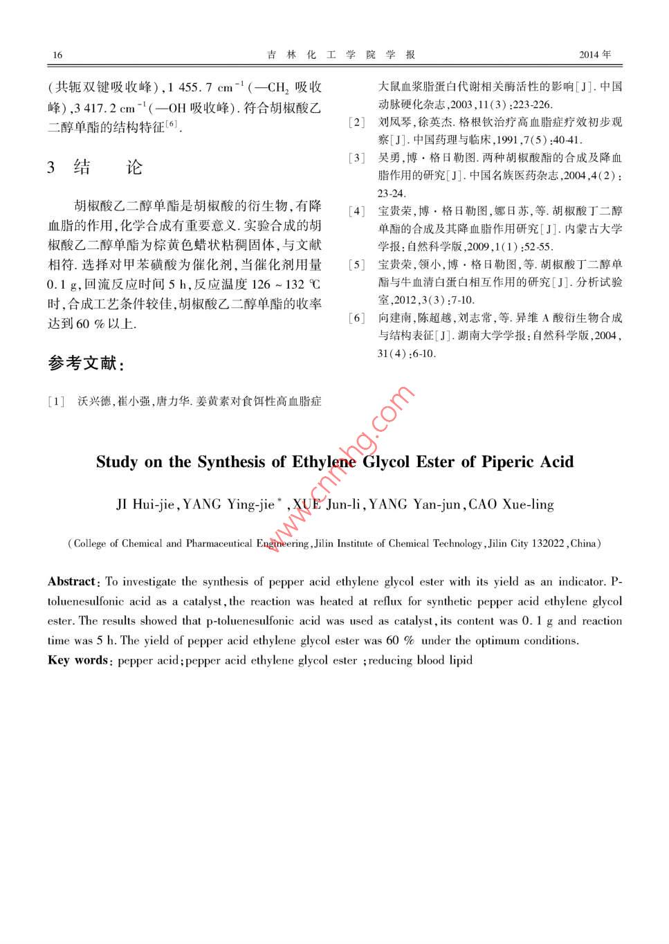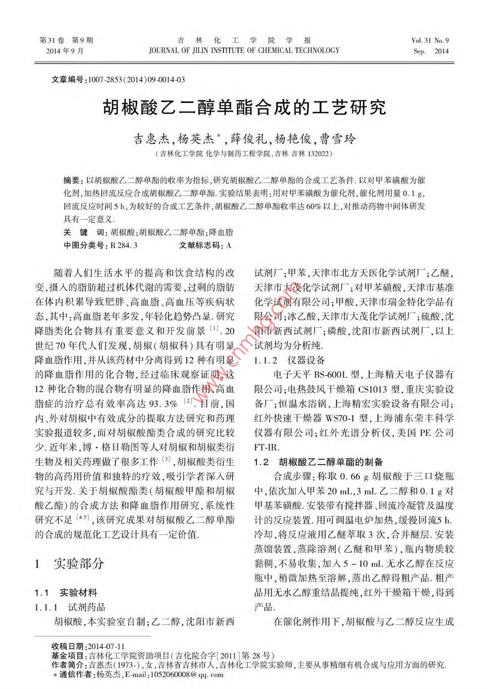 第31卷第9期吉林化工學(xué)院學(xué)報(bào)ol, 31 No 92014年9月JOURNAL OF JILIN INSTITUTE OF CHEMICAL TECHNOLOGYSep.2014文章編號:1007-2853(2014)09001403胡椒酸乙二醇單酯合成的工藝研究吉惠杰,楊英杰,薛俊禮,楊艷俊,曹雪玲(吉林化工學(xué)院化學(xué)與制藥工程學(xué)院,吉林吉林132022)摘要:以胡椒酸乙二醇單酯的收率為指標(biāo),研究胡椒酸乙二醇單酯的合成工藝條件.以對甲苯磺酸為催化劑,加熱回流反應(yīng)合成胡椒酸乙二醇單酯實(shí)驗(yàn)結(jié)果表明:用對甲苯磺酸為催化劑,催化劑用量0.1g,回流反應(yīng)時(shí)間5h,為較好的合成工藝條件,胡椒酸乙二醇單酯收率達(dá)60%以上,對推動(dòng)藥物中間體研發(fā)具有一定意義關(guān)鍵詞:胡椒酸;胡椒酸乙二醇單酯;降血脂中圖分類號:R284.3文獻(xiàn)標(biāo)志碼:A隨著人們生活水平的提高和飲食結(jié)構(gòu)的改試劑廠;甲苯,天津市北方天醫(yī)化學(xué)試劑廠;乙醚,變,攝入的脂肪超過機(jī)體代謝的需要,過剩的脂肪天津市大茂化學(xué)試劑廠;對甲苯磺酸,天津市基準(zhǔn)在體內(nèi)積累導(dǎo)致肥胖、高血脂、高血壓等疾病狀化學(xué)試劑有限公司;甲酸,天津市瑞金特化學(xué)品有態(tài),其中:高血脂老年多發(fā),年輕化趨勢凸顯.研究限公司;冰乙酸,天津市大茂化學(xué)試劑廠;硫酸,沈降脂類化合物具有重要意義和開發(fā)前景1.20陽市新西試劑廠;磷酸,沈陽市新西試劑廠,以上世紀(jì)70年代人們發(fā)現(xiàn),胡椒(胡椒科)具有明顯試劑均為分析純.降血脂作用,并從該藥材中分離得到12種有明顯1.1.2儀器設(shè)備的降血脂作用的化合物,經(jīng)過臨床觀察證明,這電子天平BS600L型,上海精天電子儀器有12種化合物的混合物有明顯的降血脂作用,高血限公司;電熱鼓風(fēng)干燥箱CS1013型,重慶實(shí)驗(yàn)設(shè)脂癥的治療總有效率高達(dá)93.3%21.目前,國備廠;恒溫水浴鍋,上海精宏實(shí)驗(yàn)設(shè)備有限公司;內(nèi)、外對胡椒中有效成分的提取方法研究和藥理紅外快速干燥器WS70-1型,上海浦東榮豐科學(xué)實(shí)驗(yàn)報(bào)道較多,而對胡椒酸酯類合成的研究比較儀器有限公司;紅外光譜分析儀,美國PE公司少.近年來,博·格日勒圖等人對胡椒和胡椒類衍FT-IR.生物及相關(guān)藥理做了很多工作(3,胡椒酸類衍生1.2胡椒酸乙二醇單酯的制備物的高藥用價(jià)值和獨(dú)特的療效,吸引學(xué)者深入研合成步驟:稱取0.66g胡椒酸于三口燒瓶究與開發(fā).關(guān)于胡椒酸酯類(胡椒酸甲酯和胡椒中,依次加入甲苯20mL,3mL乙二醇和0.1g對酸乙酯)的合成方法和降血脂作用研究,系統(tǒng)性甲基苯磺酸.安裝帶有攪拌器、回流冷凝管及溫度研究不足4s,該研究成果對胡椒酸乙二醇單酯計(jì)的反應(yīng)裝置.用可調(diào)溫電爐加熱,緩慢回流5h.的合成的規(guī)范化工藝設(shè)計(jì)具有一定價(jià)值冷卻,將反應(yīng)液用乙醚萃取3次,合并醚層.安裝蒸餾裝置,蒸除溶劑(乙醚和甲苯),瓶內(nèi)物質(zhì)較1實(shí)驗(yàn)部分黏稠,不易收集,加入5~10mL無水乙醇在反應(yīng)瓶中,稍微加熱至溶解,蒸出乙醇得粗產(chǎn)品.粗產(chǎn)1.1實(shí)驗(yàn)材料品用無水乙醇重結(jié)晶提純,紅外干燥箱干燥,得到1.1.1試劑藥品產(chǎn)品胡椒酸,本實(shí)驗(yàn)室自制;乙二醇,沈陽市新西在催化劑作用下,胡椒酸與乙二醇反應(yīng)生成收稿日期:201407-11基金項(xiàng)目:吉林化工學(xué)院資助項(xiàng)目(吉化院合字[201]第28號)作者簡介:吉惠杰(1973-),女,吉林省吉林市人,吉林化工學(xué)院實(shí)驗(yàn)師,主要從事精細(xì)有機(jī)合成與應(yīng)用方面的研究*通信作者:楊英杰,E-mail:1052060008@qcom第9期吉惠杰,等:胡椒酸乙二醇單酯合成的工藝研究酯.乙二醇在羧酸少的時(shí)候只有一個(gè)羥基參與反反應(yīng)的方程式如下:應(yīng),所以采用乙二醇大量過量的方法,得到單酯CHAICHI,