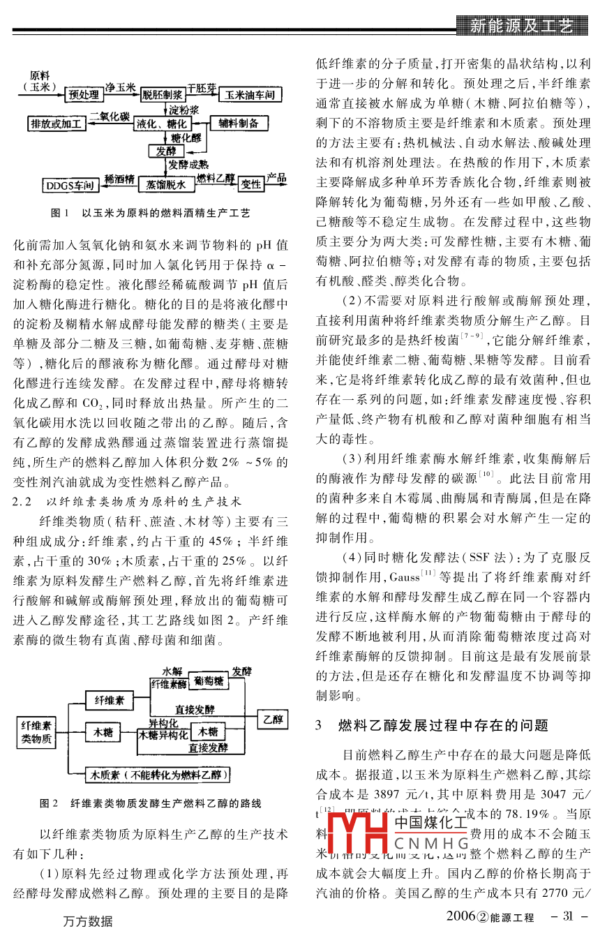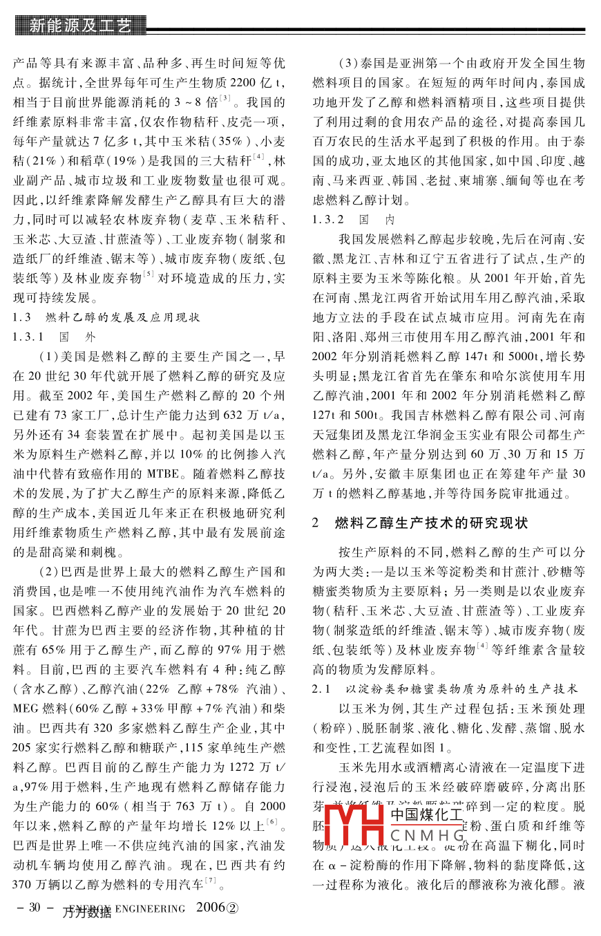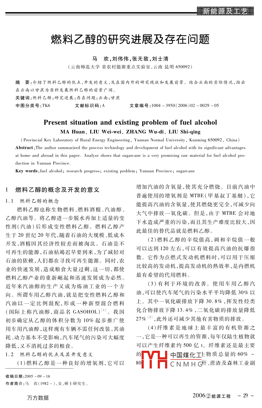 新能源及工藝燃料乙醇的研究進(jìn)展及存在問題馬歡,劉偉偉,張無敵,劉士清(云南師范大學(xué)省農(nóng)村能源重點(diǎn)實驗室,云南昆明650092)摘要:介紹了燃料乙醇的優(yōu)點(diǎn),開發(fā)的意義,及在國內(nèi)外的研究現(xiàn)狀和發(fā)展前景。結(jié)合云南的實際情況,指出在云南以甘蔗為原料發(fā)展燃料乙醇的前景廣闊。關(guān)鍵詞:燃料乙醇;研究進(jìn)展;存在問題;云南;甘蔗中圖分類號:TK6文獻(xiàn)標(biāo)識碼:A文章編號:1004-3950(2006)02-0029-05Present situation and existing problem of fuel alcoholMA Huan, LIu wei-wei, ZHANG Wu-di, liu Shi-qirProvincial Key Laboratory of Rural Energy Engineering, Yunnan Normal University, Kunming 650092, China)Abstract The author summarized the process technology and development of fuel alcohol with its significant advantagesat home and abroad in this paper. Analyse shows that sugarcane is a very promising raw material for fuel alcohol prduction in Yn provinceKey words: fuel alcohol; research progress; existing problem; Yunnan Province; sugarcane1燃料乙醇的概念及開發(fā)的意義增加汽油的含氧量,使其充分燃燒。目前汽油中普遍使用的增氧劑是MTBE(甲基叔丁基醚),它1.Ⅰ燃料乙醇的概念能提高汽油的含氧量,使其燃燒更完全,可減少向燃料乙醇也稱生物燃料、燃料酒精、汽油醇乙醇汽油等。將乙醇進(jìn)一步脫水再加上適量的交大氣中排放一氧化碳。但是,由于MTBE會對地性劑(汽油)后形成變性燃料乙醇。燃料乙醇產(chǎn)下水造成嚴(yán)重的污染,而且其生產(chǎn)難度比較大,因生于20世紀(jì)20年代,隨著石油的大規(guī)模、低成本此最佳的替代品就是燃料乙醇。開發(fā),酒精因其經(jīng)濟(jì)性較差而被淘汰。石油是不(2)燃料乙醇的辛烷值高,調(diào)和辛烷值一般可再生的能源,石油枯竭遲早要到來,為了減輕對可以達(dá)到120左右,可以有效提高汽油的抗爆指石油的依賴,人們都在尋找可再生能源。同時,農(nóng)數(shù)。它作為點(diǎn)燃式發(fā)動機(jī)燃料時,可以用于壓縮業(yè)的快速發(fā)展,造成糧食大量過剩,這一切,都使比較高的發(fā)動機(jī),提高發(fā)動機(jī)的熱效率,是內(nèi)燃機(jī)燃料乙醇產(chǎn)業(yè)的重新崛起和迅速發(fā)展成為必然。最有希望的代用燃料。近年來汽油醇的生產(chǎn)又成為煉油工業(yè)的一個方(3)有利于環(huán)境的改善。使用車用乙醇汽向。所謂車用乙醇汽油,就是把變性燃料乙醇和油,可以使汽車尾氣的污染水平平均降低30%以汽油以一定比例混配,形成一種新型混合燃料上。其中一氧化碳排放下降30.8%,揮發(fā)性烴類(國際上稱汽油醇,商品名 GASOHOI)。我國化合物排放下降13.4%,二氧化碳的排放量降低初步確定從乙醇的體積分?jǐn)?shù)為10%起步推廣使27%2,此外還可減少其他有害物質(zhì)的排放。用車用汽油醇,這樣現(xiàn)有車輛不需任何改裝,其油(4)纖維素是地球上最豐富的有機(jī)資源之耗、動力基本不受影響,汽車尾氣的污染可大幅度它是一種可以再生的資源,每年僅陸生植物就降低,又不消耗過多的糧食??梢援a(chǎn)生纖維素約500億t。纖維素還是最主要1.2燃料乙醇的優(yōu)點(diǎn)及其開發(fā)意(1)燃料乙醇是一種良好的增氧劑,它可以80oH中國煤化工物質(zhì)總量的60%CNMHG稈、蔗渣及森林工業(yè)副收稿日期:2005-09-16作者簡介:馬歡(1982-),女,碩土研究生。2006②能源工程「新能源及掃藝產(chǎn)品等具有來源豐富、品種多、再生時間短等優(yōu)(3)泰國是亞洲第一個由政府開發(fā)全國生物點(diǎn)。據(jù)統(tǒng)計,全世界每年可生產(chǎn)生物質(zhì)200億t,燃料項目的國家。在短短的兩年時間內(nèi),泰國成相當(dāng)于目前世界能源消耗的3~8倍③。我國的功地開發(fā)了乙醇和燃料酒精項目,這些項目提供纖維素原料非常豐富,僅農(nóng)作物秸稈、皮殼一項,了利用過剩的食用農(nóng)產(chǎn)品的途徑,對提高泰國幾每年產(chǎn)量就達(dá)7億多t,其中玉米秸(35%)、小麥百萬農(nóng)民的生活水平起到了積極的作用。由于泰秸(21%)和稻草(19%)是我國的三大秸稈,林國的成功,亞太地區(qū)的其他國家,如中國、印度、越業(yè)副產(chǎn)品、城市垃圾和工業(yè)廢物數(shù)量也很可觀。南、馬來西亞、韓國、老撾、柬埔寨、緬甸等也在考因此,以纖維素降解發(fā)酵生產(chǎn)乙醇具有巨大的潛慮燃料乙醇計劃。力,同時可以減輕農(nóng)林廢棄物(麥草、玉米秸稈、1.3.2國內(nèi)玉米芯、大豆渣、甘蔗渣等)、工業(yè)廢棄物(制漿和我國發(fā)展燃料乙醇起步較晚,先后在河南、安造紙廠的纖維渣、鋸末等)、城市廢棄物(廢紙、包徽、黑龍江、吉林和遼寧五省進(jìn)行了試點(diǎn),生產(chǎn)的裝紙等)及林業(yè)廢棄物3對環(huán)境造成的壓力,實原料主要為玉米等陳化糧。從2001年開始,首先現(xiàn)可持續(xù)發(fā)展。在河南、黑龍江兩省開始試用車用乙醇汽油,采取1.3燃料乙醇的發(fā)展及應(yīng)用現(xiàn)狀地方立法的手段在試點(diǎn)城市應(yīng)用。河南先在南陽、洛陽、鄭州三市使用車用乙醇汽油,2001年(1)美國是燃料乙醇的主要生產(chǎn)國之一,早202年分別消耗燃料乙醇147t和5000t,增長勢在20世紀(jì)30年代就開展了燃料乙醇的研究及應(yīng)頭明顯;黑龍江省首先在肇東和哈爾濱使用車用用。截至2002年,美國生產(chǎn)燃料乙醇的20個州乙醇汽油,2001年和2002年分別消耗燃料乙醇已建有7