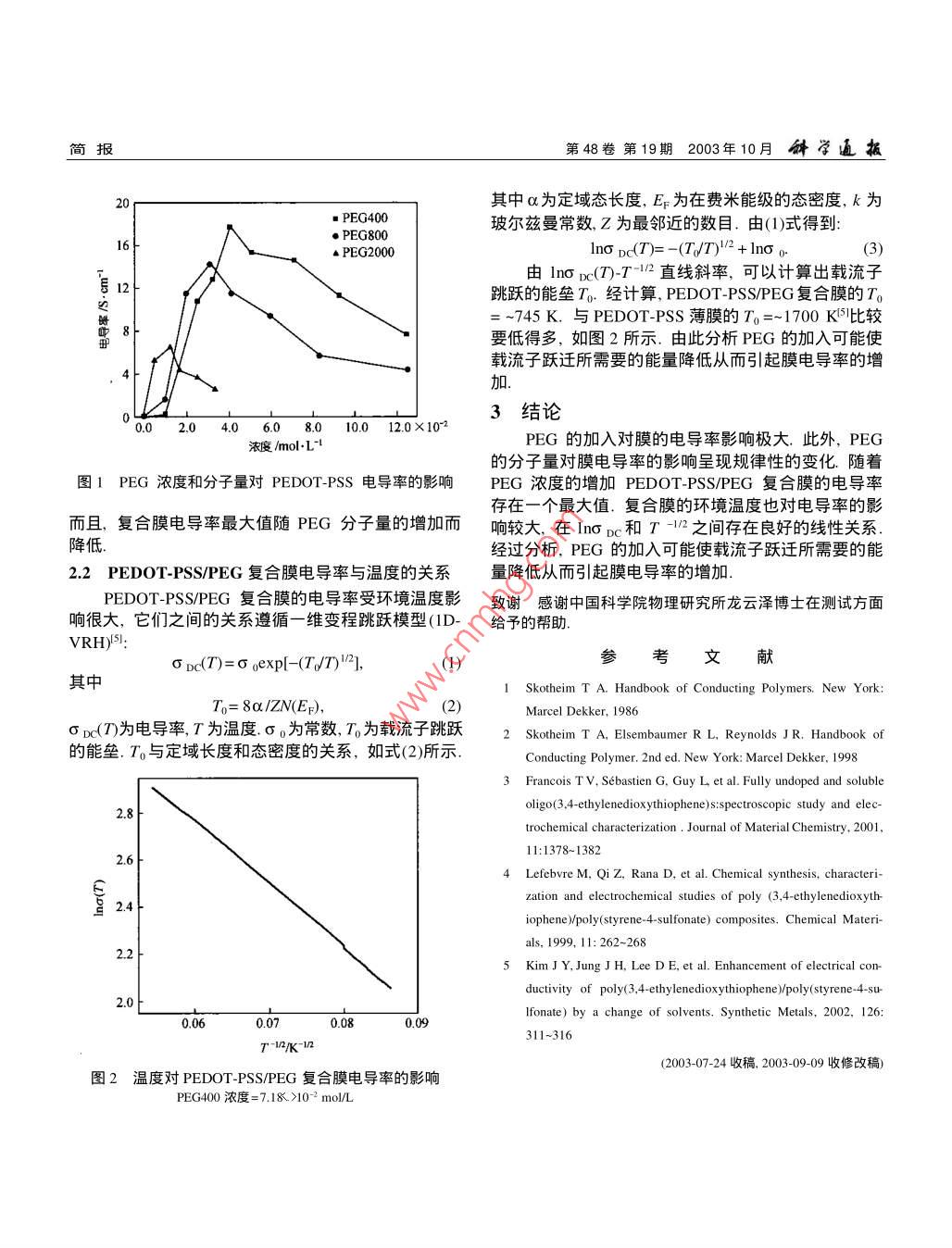 匝扳第48卷第19期2008年10月簡報聚乙二醇對 PEDOT-PS導電性能的影響王鐵軍齊英群徐景坤胡秀杰陳萍(中國科學院理化技術研究所,北京100101.*聯(lián)系人,Emai:chenla@mail.ipc.ac.cn)摘要通過共混法將不同濃度的聚乙二醇(PEG)加入聚二氧乙基噻吩麇聚對苯乙烯磺酸( PEDOT-PSS)中制備了 PEDOT-PSS/PEG復合膜.采用四探針法測量復合膜的電導率.實驗結(jié)果表明聚乙二醇的加入明顯影響 PEDOT-PSS的電導率.隨著聚乙二醇濃度的增加,復合膜的電導率迅速增加至最大值,然后緩慢下降.而且,聚乙二醇分子量和環(huán)境溫度對復合膜的電導率也影響很大.在lnσc和T-之間存在一個良好的線性關系關鍵詞 PEDOT-PSS PEG電導率復合膜四探針法導電高分子自發(fā)現(xiàn)以來由于其廣泛的應用前景,2結(jié)果和討論已經(jīng)引起了人們的高度關注2·其中聚二氧乙基噻吩2.1PECG的濃度和分子量對 PEDOT-PSS I電導率的( PEDOT)的摻雜態(tài)具有電導率高在空氣中結(jié)構和電影響導率高度穩(wěn)定等卓越性能,因而成為導電高分子新的在 PEDOT-PSS水溶液中分別加入不同濃度的分研究熱點.本征態(tài)的 PEDOT導電性很差而且不熔不子量為40,800,2000的聚乙二醇簡稱PEG后涂布溶,聚(對苯乙烯磺酸)根陰離子(PSS)摻雜的 PEDOT成膜.膜干燥后采用四探針法測其電導率.圖1所可以分散溶解在水溶液中,涂布成膜后在空氣中非常表示的是上述各種復合膜的電導率隨加入的不同分子穩(wěn)定,同時具有高電導率,水溶液可以進一步加工處量的PEG的濃度變化曲線,其中未加PEG的PE理4,因而大大地促進了 PEDOT的應用.以 PEDOT-DOT-PSS薄膜的電導率為0.1S/cm,而在加入PSS為對象,研究影響其電導率的因素不僅有利于提PEG400后膜電導率隨濃度的增加有很大的變化并高 PEDOT材料的性能促進材料的應用,同時有利且電導率與濃度之間存在如下關系:當PEG400濃度于研究導電聚合物導電機理中的一些基本問題及其影從0增加至1×102molL時,電導率從01S/m緩響因素本文通過共混法制備了 PEDOT-PSS和聚乙慢增加至024s/m.當濃度從1102mon增加至醇(PEG)復合膜,并利用四探針法測試了 PEdOT-406×10-2mol時,電導率急劇增加并在濃度為4.06PSS/PEG復合膜的導電性能.有關這方面的研究尚未10-2mol/L時達到最大值177S/cm,提高了兩個數(shù)量級.此后隨著濃度的增加電導率逐漸降低.加入見報道PEG800時,濃度從0增加至1.×10-2mol,電導率1實驗變化較大,從0.1s/cm增加至1.7S/cm.此后電導率(.i)試劑和儀器. PEDT-PSS水溶液(商品名急劇增加,并在濃度為3.13.×10-2moL時電導率達Baytron P, Bayer AG公司,聚乙二醇40,.800.200最大值142scm,也提高了兩個數(shù)量級然后隨著濃(分析純,Merk- Schuchard). Advantest r6142pro-度的增加電導率也逐漸降低.加入PEG2000時電導grammable do電位/電流發(fā)生器和 Keithley196型萬率在PEG濃度為0-1.25.×102mol/L范圍內(nèi)急劇增用表.測厚儀(上海第二光學儀器廠)加至最大值6.5S/cm,提高了一個數(shù)量級.此后隨著i)復合膜的制備.將不同量和不同分子量的濃度的增加電導率迅速降低.由于PEG2000分子量聚乙二醇與 PEDT-PSS水洛液混合溶解后攪拌24h,大,當濃度增加至3.33×102m時得不到良好的涂布在經(jīng)過清潔處理的玻璃基板上,70·℃下干燥24h薄膜.此外,分子量對電導率的影響也是顯而易見的后成膜,厚度為30~50μmi)電導率的測量.采用四探針法測量膜的電在較低濃度時,PEG分子量越大,電導率越高;而在導率.并在變溫條件下對復合膜的電導率進行測量較高濃度時,PEG分子量越大,電導率越低.另外,隨著PEG分子量的增加,電導率曲線峰值左移報第48卷第19期2003年10月斛邊扳其中α為定域態(tài)長度,EF為在費米能級的態(tài)密度,k為玻爾茲曼常數(shù),Z為最鄰近的數(shù)目.由(1)式得到●PEG800▲PEG2000Ino pd(T)=-(T/T)+Ing o5≌由 Ino()-T-2直線斜率,可以計算出載流子跳躍的能壘T0經(jīng)計算, PEDOT-PSS/PEG復合膜的T0745K.與 PEDOT-PSS薄膜的T=~1700K5比較要低得多,如圖2所示.由此分析PEG的加入可能使載流子躍遷所需要的能量降低從而引起膜電導率的增加.3結(jié)論0.02.0406.08.0100120×10液度/moLPEG的加入對膜的電導率影響極大.此外,PEG的分子量對膜電導率的影響呈現(xiàn)規(guī)律性的變化隨著圖1PEG濃度和分子量對 PEDOT-PSS電導率的影響PEG濃度的增加 PEDOT-PSS/PEG復合膜的電導率存在一個最大值.復合膜的環(huán)境溫度也對電導率的影而且,復合膜電導率最大值隨PEG分子量的增加而響較大,在1np和T12之間存在良好的線性關系降低.經(jīng)過分析,PEG的加入可能使載流子躍遷所需要的能2,2 PEDOT- PSS/PEG復合膜電導率與溫度的關系量降低從而引起膜電導率的增加PEDOT- PSS/PEG復合膜的電導率受環(huán)境溫度影致謝感謝中國科學院物理研究所龍云澤博士在測試方面響很大,它們之間的關系遵循一維變程跳躍模型(ID-給予的幫助o dd(r)=g gexp[-(TT) 1,(1)參考文獻其中I Skotheim T A. Handbook of Conducting Polymers. New York:TO=8O/ZN()Marcel Dekker. 1986σⅸ(T為電導率,T為溫度.σ為常數(shù),T為載流子跳躍2 Skotheim T A, Elsembaumer R L, Reynolds JR. Handbook of的能壘.T0與定域長度和態(tài)密度的關系,如式(2)所示Conducting Polymer. 2nd ed. New York: Marcel Dekker, 19983 Francois T V, Sebastien G. Guy L et al. Fully undoped and solubleJournal of Material Chemistry, 20012.611:137813824 Lefebvre M. Qi Z, Rana D, et al. Chemical synthesis, characteri2.4ohene )/poly(styrene-4-sulfonate) composites, Chemical Materials,1999,11:262-2685 Kim JY, Jung j H. Lee d E et