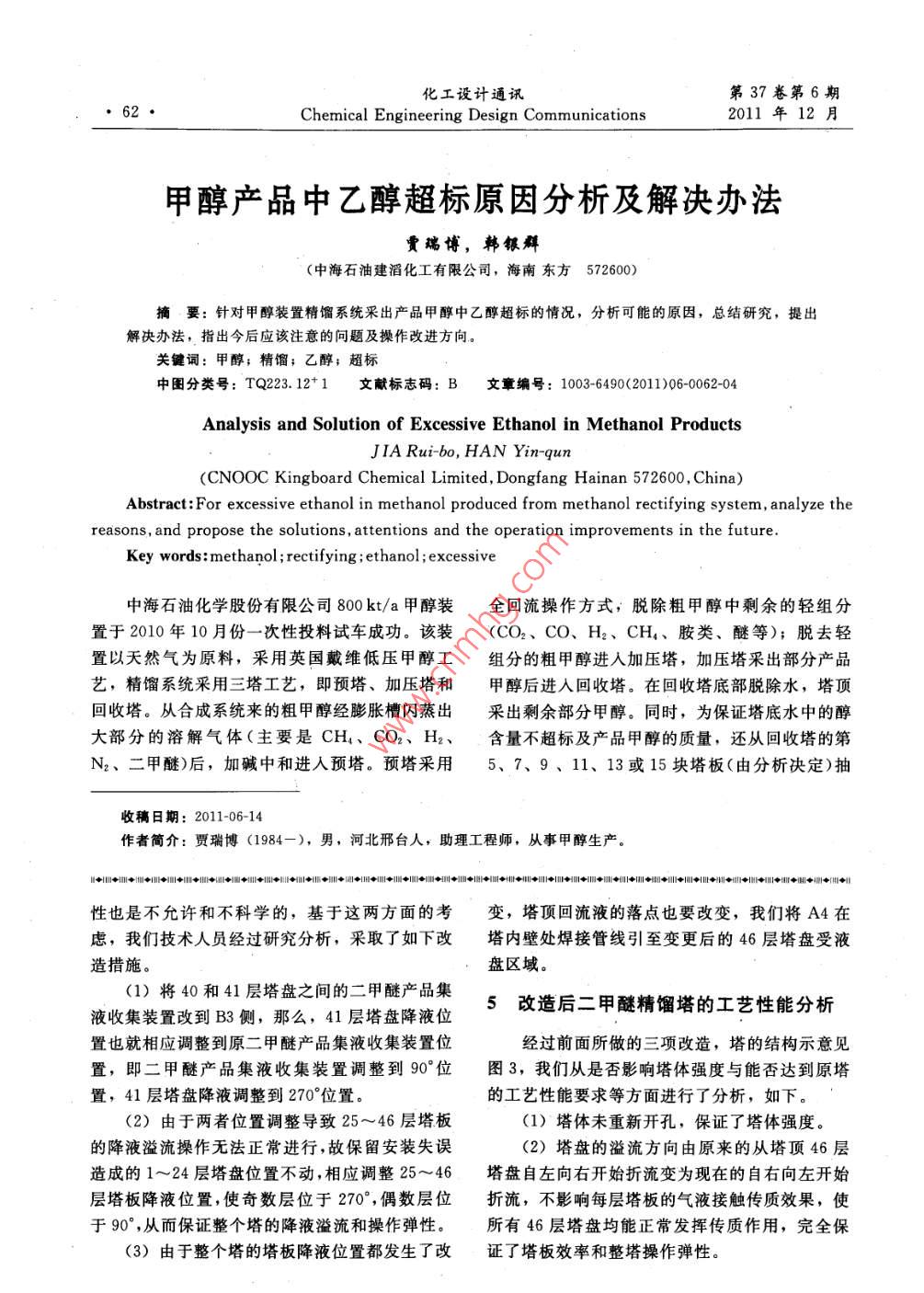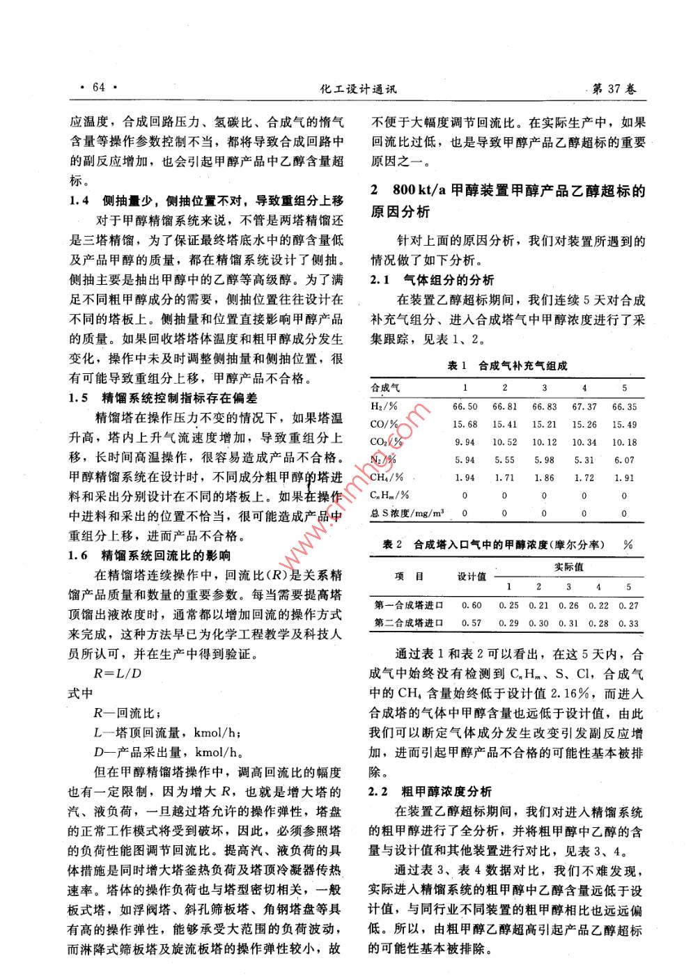 化工設(shè)計通訊第37卷第6期·62·Chemical Engineering Design Communications2011年12月甲醇產(chǎn)品中乙醇超標原因分析及解決辦法賈瑞博,韓銀群(中海石油建滔化工有限公司,海南東方572600)摘要:針對甲醇裝置精餾系統(tǒng)采出產(chǎn)品甲醇中乙醇超標的情況,分析可能的原因,總結(jié)研究,提出解決辦法,指出今后應(yīng)該注意的問題及操作改進方向關(guān)鍵詞:甲醇;精餾;乙醇;超標中圖分類號:TQ223.12+1文獻標志碼:B文章編號:1003-6490(2011)06-006204Analysis and Solution of Excessive Ethanol in Methanol ProductsJ IA Rui-bo, HAN Yin-qunCNOOC Kingboard Chemical Limited, Dongfang Hainan 572600, China)Abstract: For excessive ethanol in methanol produced from methanol rectifying system, analyze thereasons, and propose the solutions, attentions and the operation improvements in the futureKey words: methanol; rectifying; ethanol; excessive中海石油化學(xué)股份有限公司800kt/a甲醇裝全回流操作方式,脫除粗甲醇中剩余的輕組分置于2010年10月份一次性投料試車成功。該裝(CO2、CO、H2、CH4、胺類、醚等);脫去輕置以天然氣為原料,采用英國戴維低壓甲醇工組分的粗甲醇進入加壓塔,加壓塔采出部分產(chǎn)品藝,精餾系統(tǒng)采用三塔工藝,即預(yù)塔、加壓塔和甲醇后進入回收塔。在回收塔底部脫除水,塔頂回收塔。從合成系統(tǒng)來的粗甲醇經(jīng)膨脹槽閃蒸出采出剩余部分甲醇。同時,為保證塔底水中的醇大部分的溶解氣體(主要是CH4、CO、H2、含量不超標及產(chǎn)品甲醇的質(zhì)量,還從回收塔的第N2、二甲醚)后,加堿中和進人預(yù)塔。預(yù)塔釆用5、7、9、11、13或15塊塔板(由分析決定)抽收稿日期:2011-06-14作者簡介:賈瑞博(1984-),男,河北邢臺人,助理工程師,從事甲醇生產(chǎn)。目命指命◆出◆◆圖◆◆舊◆◆寺◆舊◆◆◆◆◆寺舊寺◆◆◆舊寺命田◆專◆◆們命舊團◆◆◆◆性也是不允許和不科學(xué)的,基于這兩方面的考變,塔頂回流液的落點也要改變,我們將A4在慮,我們技術(shù)人員經(jīng)過研究分析,采取了如下改塔內(nèi)壁處焊接管線引至變更后的46層塔盤受液造措施。盤區(qū)域。(1)將40和41層塔盤之間的二甲醚產(chǎn)品集5改造后二甲醚精餾塔的工藝性能分析液收集裝置改到B3側(cè),那么,41層塔盤降液位置也就相應(yīng)調(diào)整到原二甲醚產(chǎn)品集液收集裝置位經(jīng)過前面所做的三項改造,塔的結(jié)構(gòu)示意見置,即二甲醚產(chǎn)品集液收集裝置調(diào)整到90°位圖3,我們從是否影響塔體強度與能否達到原塔置,41層塔盤降液調(diào)整到270°位置。的工藝性能要求等方面進行了分析,如下(2)由于兩者位置調(diào)整導(dǎo)致25~46層塔板(1)塔體未重新開孔,保證了塔體強度。的降液溢流操作無法正常進行,故保留安裝失誤(2)塔盤的溢流方向由原來的從塔頂46層造成的1~24層塔盤位置不動,相應(yīng)調(diào)整25~46塔盤自左向右開始折流變?yōu)楝F(xiàn)在的自右向左開始層塔板降液位置,使奇數(shù)層位于270°,偶數(shù)層位折流,不影響每層塔板的氣液接觸傳質(zhì)效果,使于90°,從而保證整個塔的降液溢流和操作彈性。所有46層塔盤均能正常發(fā)揮傳質(zhì)作用,完全保(3)由于整個塔的塔板降液位置都發(fā)生了改證了塔板效率和整塔操作彈性第6期賈瑞博等:甲醇產(chǎn)品中乙醇超標原因分析及解決辦法63·出部分高級醇送往飽和塔(見圖1)。該甲醇裝置出。經(jīng)工藝人員認真分析,尋找原因,對癥下投產(chǎn)后,甲醇產(chǎn)品一直存在乙醇超標的現(xiàn)象,最藥,終于找出了問題癥結(jié)所在,通過調(diào)整相關(guān)參高時乙醇達到0.01%,無法達到美國AA級要數(shù),解決了甲醇產(chǎn)品中乙醇超標問題。求(小于0.001%),加壓塔的甲醇產(chǎn)品尤為突廢氣P精甲醇495436A/B31A/Btid. b6ID332度氣昱塔區(qū)43粗甲醇E134E14FV40A恩圖1精餾系統(tǒng)流程簡圖1影響因素(低溫出樸低氫還原、還原后低負荷運行一段時間)、三穩(wěn)(提氫穩(wěn)、提溫穩(wěn)、出水穩(wěn))、三不實際生產(chǎn)中,可能引起甲醇產(chǎn)品中乙醇超標(提氫與提溫不同時進行、水分不帶入塔內(nèi)、高的原因有很多,主要有以下幾種情況溫出水時間不能太長)的原則;④甲醇合成反應(yīng)1.1合成氣組分發(fā)生變化的控制參數(shù)嚴重偏離指標;⑤頻繁的開停車;根據(jù)理論計算,合成甲醇所需的補充氣中⑥催化劑老化。以上任何一種情況發(fā)生,都會H2/CO=2.0~3.0,就可以滿足要求,但有些嚴重影響催化劑的性能,導(dǎo)致合成催化劑活性和文獻指出,粗甲醇中的副產(chǎn)物主要是因為合成氣,選擇性下降,進而使副反應(yīng)增加,粗甲醇中高級中惰性組分含量高及其他雜質(zhì)造成的,包括N2、醇雜質(zhì)含量增加,給后序的粗甲醇精餾加工帶來Ar、CH4、CnHn、H2O、CH3CH2OH等。如困難,甲醇產(chǎn)品中乙醇超標的幾率也大大提高。果合成氣中的CH4含量高,CnH灬含量也高,1.3甲醇合成反應(yīng)的操作參數(shù)變化烯烴水化后就變成醇,粗甲醇中的乙醇主要是由甲醇合成系統(tǒng)的操作,直接關(guān)系到甲醇的產(chǎn)合成氣中的碳氫化合物C2不飽和烴生成的。所量與質(zhì)量。以,天然氣組成和轉(zhuǎn)化催化劑的性能直接影響到甲醇合成反應(yīng):合成氣中的CH4含量,進而影響合成反應(yīng)中的CO+2H2-CH3 OH+102.5 kJ/mol副反應(yīng),最終影響粗甲醇中的乙醇含量。同時,CO2 +3H2-CH3OH+H2O如