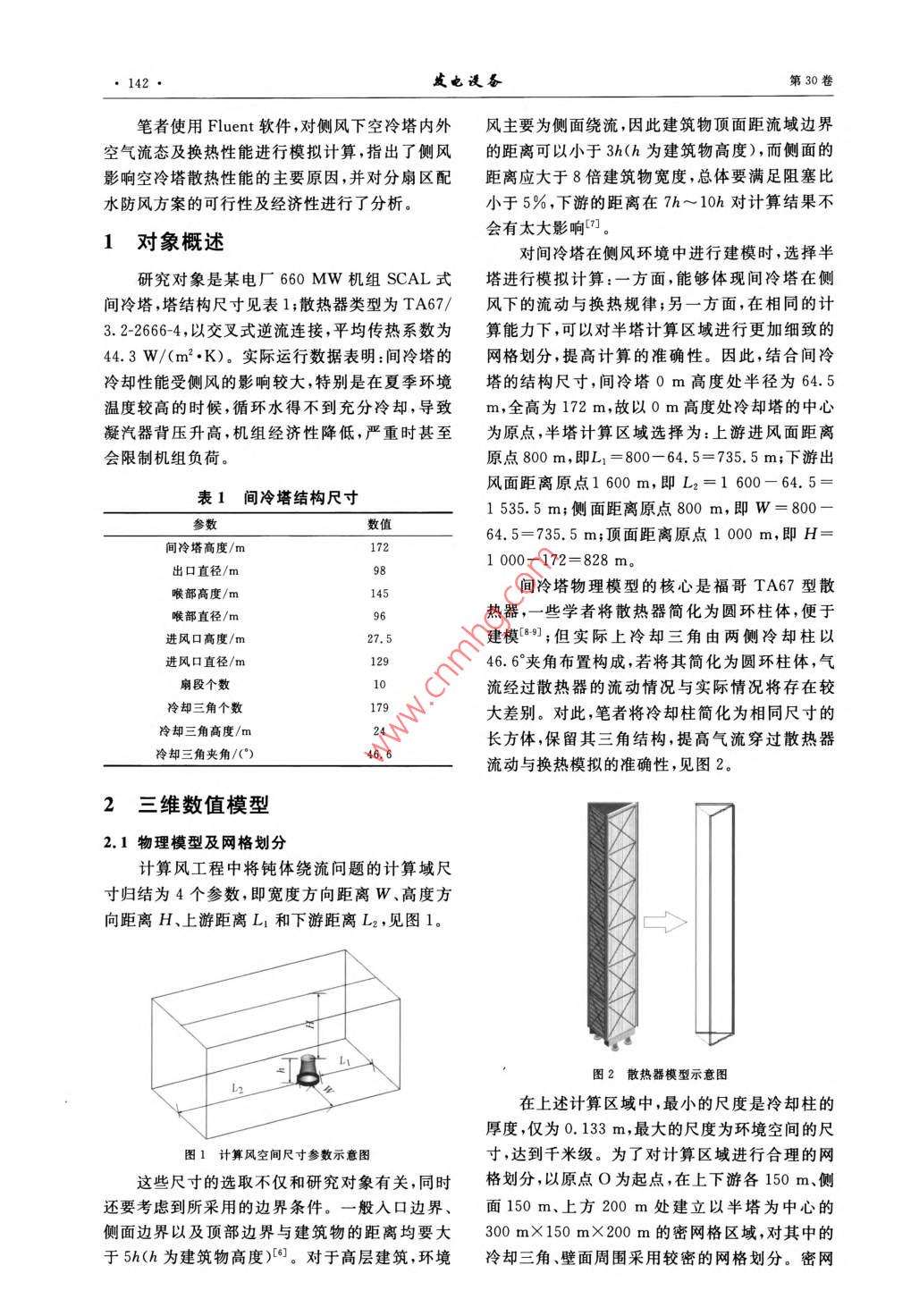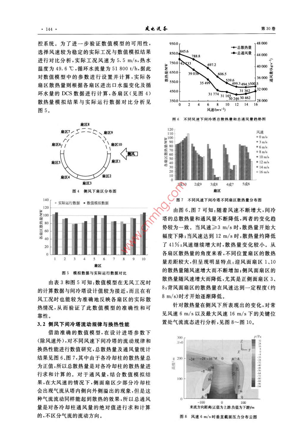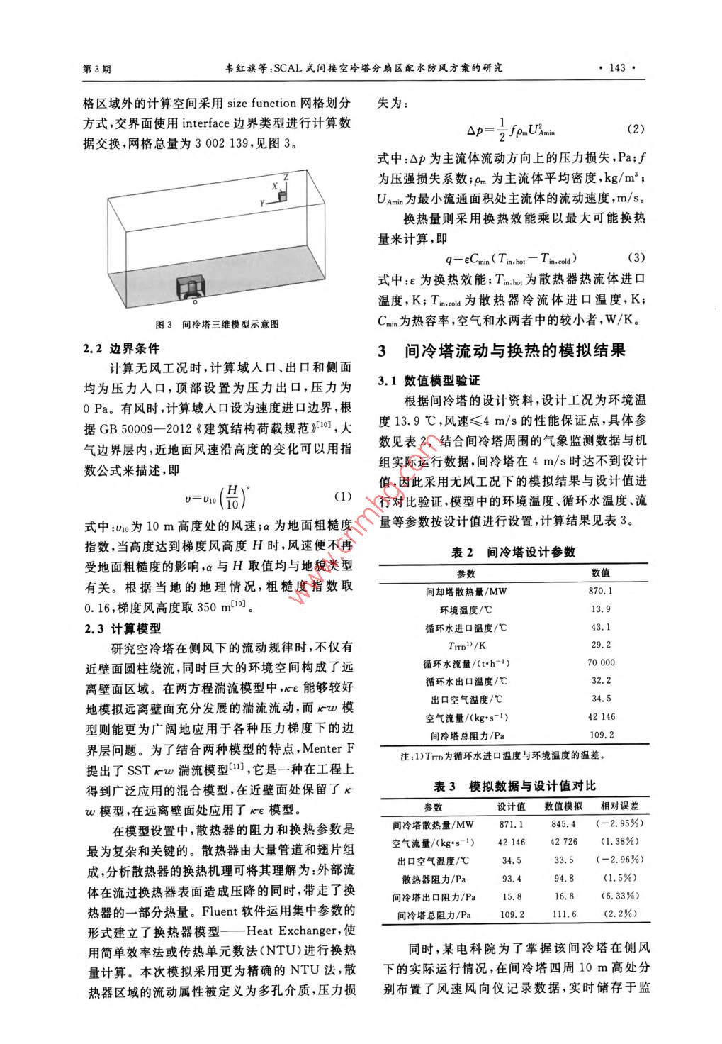 第30卷第3期發(fā)也設岙2016年5月POWER EQUIPMENTMay.2016研究與分析SCAL式間接空冷塔分扇區(qū)配水防風方案的研究韋紅旗,盛波',耿彪,伍小林(1.東南大學能源與環(huán)境學院,南京21096;2.寧夏京能寧東發(fā)電有限公司,寧夏靈武750040)摘要:借助三維數(shù)值模型,對環(huán)境側風下間冷塔的流動規(guī)律與換熱性能進行研究。結果表明:在進塔其他參數(shù)不變的情況下,間冷塔總散熱量隨風速增大而不斷降低,是由于氣流圓柱繞流導致側風面扇區(qū)的散熱量大大減少,迎風面扇區(qū)散熱量雖有所提高,但不足以彌補其他扇區(qū)的散熱量損失。根據(jù)各扇區(qū)散熱量分布特點提出一種新型防風方案,即按散熱量比例對不同扇區(qū)進行分區(qū)配水,對通風量進行合理利用,在一定程度上減輕了側風對間冷塔散熱的影響關鍵詞:側風;間冷塔;流動;散熱;扇區(qū);數(shù)值模擬中圖分類號:TK284.8文獻標志碼:A文章編號:1671-086X(2016)03-0141-07Research on the effect of Water Distribution by Sectorsof SCAL Indirect Air-cooling TowersWei Hongqi, Sheng Bo, Geng Biao, Wu Xiaolin(1. School of Energy and Environment, Southeast University, Nanjing 210096, China; 2. NingxiaJingneng Ningdong Power Generation Co, Ltd. Lingwu 750040, Ningxia Hui Autonomous Region, China)Abstract: The flow and heat-transfer performance of an indirect air-cooling tower were studied undercrosswind conditions using three-dimensional numerical model. Results indicate that under the conditions thatall other inlet parameters keep constant, the total heat dissipating capacity decreases as the crosswind speedgrows, due to the great reduction of heat dissipating capacity in lateral sectors because of the flow aroundcircular cylinder, and that the increase of heat dissipating capacity in windward sectors is not high enough tocompensate the dissipating loss in other sectors. According to the characteristics of heat distribution inscheme is proposed for wind protection, i.e. the circulating water is distributed on thebasis of the ratio of heat release in corresponding sectors, which, to some extent, can alleviate the impacts ofcrosswinds on heat dissipation of the indirect air-cooling tower through reasonable ventilationKeywords: crosswind; indirect air-cooling tower; flow: heat dissipation; sector; numerical simulation隨著水資源的日益匱乏,傳統(tǒng)的火電水冷方影響程度比直冷系統(tǒng)小口。式因耗水量大、對環(huán)境造成一定的負面影響而面空冷塔與濕冷塔不同,空冷塔是利用空氣通臨著嚴峻的挑戰(zhàn)??绽浼夹g主要分為直接空冷過表面式換熱器受熱產(chǎn)生的自然浮力運動帶走(直冷)和間接空冷(間冷):直冷是指汽輪機乏汽熱量的,這使得空冷塔冷卻效率明顯受到環(huán)境條與環(huán)境空氣直接進行熱交換,間冷是指汽輪機乏件的影響,尤其是側風。近年來,學者們對空冷汽通過循環(huán)冷卻水與環(huán)境空氣進行間接熱交換。塔的研究不斷深人,側風對空冷塔流動與換熱的按照散熱器布置形式及凝汽器類型的不同,間冷影響以及防風措施的探索日益受到人們的重視。系統(tǒng)又可分為海勒式、哈蒙式及SCAL式。對于在國內,研究人員先后對空冷塔在側風下的換熱臺600MW機組,間冷系統(tǒng)的年運行費用比直性能做了大量的實驗與模擬研究,總體結果表明冷系統(tǒng)節(jié)約近700萬元,而且機組背壓受側風的側風對空冷塔的冷卻效果是不利的23。收稿日期:2015-08-04作者簡介:韋紅旗(1966-),男,副教授,從事火力發(fā)電機組性能優(yōu)化設備改造相關試驗研究及教學工作E-mail:weihongqivipsina.com142·威也謾畚第30卷筆者使用 Fluent軟件,對側風下空冷塔內外風主要為側面繞流因此建筑物頂面距流域邊界空氣流態(tài)及換熱性能進行模擬計算,指出了側風的距離可以小于3h(h為建筑物高度),而側面的影響空冷塔散熱性能的主要原因,并對分扇區(qū)配距離應大于8倍建筑物寬度,總體要滿足阻塞比水防風方案的可行性及經(jīng)濟性進行了分析小于5%下游的距離在7h~10h對計算結果不對象概述會有太大影響{7。對間冷塔在側風環(huán)境中進行建模時,選擇半研究對象是某電廠660MW機組SCAL式塔進行模擬計算:一方面,能夠體現(xiàn)間冷塔在側間冷塔,塔結構尺寸見表1;散熱器類型為TA67/風下的流動與換熱規(guī)律;另一方面,在相同的計3.2-2664,以交叉式逆流連接,平均傳熱系數(shù)為算能力下,可以對半塔計算區(qū)域進行更加細致的44.3W/(m2·K)。實際運行數(shù)據(jù)表明:間冷塔的網(wǎng)格劃分,提高計算的準確性。因此,結合間冷冷卻性能受側風的影響較大,特別是在夏季環(huán)境塔的結構尺寸,間冷塔0m高度處半徑為64.5溫度較高的時候,循環(huán)水得不到充分冷卻,導致m,全高為172m,故以0m高度處冷卻塔的中心凝汽器背壓升高,機組經(jīng)濟性降低,嚴重時甚至為原點,半塔計算區(qū)域選擇為:上游進風面距離會限制機組負荷。原點800m,即L1=800-64.5=735.5m;下游出表1間冷塔結構尺寸風面距離原點1600m,即L2=1600-64.5=1535.5m;側面距離原點800m,即W=800參數(shù)數(shù)值64.5=735.5m;頂面距離原點1000m,即H=間冷塔高度/m1721000-172=828m。出口直徑/m喉部高度/m間冷塔物理模型的核心是福哥TA67型散喉部直徑/m熱器,一些學者將散熱器簡化為圓環(huán)柱體,便于進風口高度/建模8;但實際上冷卻三角由兩側冷卻柱以進風口直徑/m12946.6°夾角布置構成,若將其簡化為圓環(huán)柱體,氣扇段個數(shù)流經(jīng)過散熱器的流動情況與實際情況將存在較