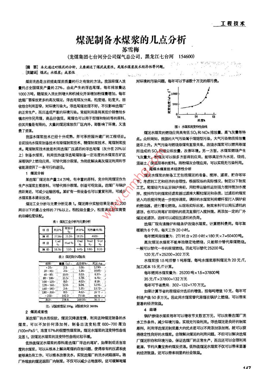 工程技術(shù)煤泥制備水煤漿的幾點(diǎn)分析蘇雪梅(龍煤集團(tuán)七臺(tái)河分公司煤氣總公司,黑龍江七臺(tái)河154600)曠要本文通過對(duì)泥的分析,主要闡迷了煤泥成漿性,尾煤水煤漿技術(shù)經(jīng)濟(jì)性等問題。關(guān)鍵詞]煤泥;水煤漿;成漿性煤炭洗選是當(dāng)前提高煤炭質(zhì)量的行之有效的方法。我國原煤入洗對(duì)環(huán)境的污染問題,每年可以節(jié)省數(shù)十萬元的邦污費(fèi)。量約占全國煤炭產(chǎn)量的22%,由此產(chǎn)生的浮選尾煤,每年排放量達(dá)1000萬噸,隨煤炭入洗比例增大和機(jī)械化開采增加粉煤量增加,每年選煤廠要排放更多的高灰煤泥,浮選尾煤灰分高,粒度細(xì),粘度大,回收綜合利用面窄,對(duì)環(huán)境污染大。浮選尾煤處理不好,不僅影響選煤廠的正常生產(chǎn),而且造成嚴(yán)重的環(huán)境污染。常規(guī)利用是將其低價(jià)銷售給鄉(xiāng)鎮(zhèn)農(nóng)村作民用煤,商品價(jià)值低,尾煤也可以用于型煤和制磚等的原料,樂但其用量是有限的,大量的煤泥堆放在廠區(qū)內(nèi)外,即影響了環(huán)境,又浪圖1水煤漿流變特性曲線費(fèi)了資源。煤泥尼水煤獎(jiǎng)的燃燒應(yīng)用具有低SO2和NOx排放量,高飛灰量等特我國水媒漿技術(shù)已經(jīng)十分成熟,并可承擔(dān)國外建廠的工程項(xiàng)目。點(diǎn)。眾所周知,我國的大氣污染屬于煤煙型污染,大氣污染物質(zhì)排放量目前國內(nèi)水媒漿制備技術(shù)有原媒制漿技術(shù)、精煤制漿技術(shù)、尾制聚技逐年上升。大氣污染與燃燒原煤有直接關(guān)系,改燒水煤漿可以燃用原煤術(shù)。尾煤制漿技術(shù)就是利用選煤廠壓后的浮選尾煤(灰分在20%以所造成的SO2和煙塵排放量,改善環(huán)境。另一方面,水煤漿燃燒產(chǎn)生上)制備水煤漿,利用低熱值浮選尾煤制備一定濃度的水煤漿在礦區(qū)飛灰量大,粉煤灰可以很多方面得到應(yīng)用,能夠滿足作為水泥、燒磚、采暖鍋爐上燃燒應(yīng)用,可替代部分原煤,為徹底解決高灰燦泥利用和節(jié)混凝土、保溫層等的配料。將粉煤灰合理應(yīng)用,可以實(shí)現(xiàn)無污染利用省能源提供了一條可行的途徑。3尾煤水煤漿技術(shù)經(jīng)濟(jì)性分析1煤泥分析煤泥水煤漿的制備工藝包括煤泥的準(zhǔn)備、攪拌、濾漿、貯存等環(huán)某選媒煤泥年產(chǎn)量24萬噸,有豐富的原料充分利用煤泥作為節(jié)??紤]到工藝和經(jīng)濟(jì)的合理性,根據(jù)現(xiàn)場的實(shí)際情況,制定以下制漿生產(chǎn)水煤媒漿主要原料,可替代部分原煤,創(chuàng)造可觀效益。選煤廠與鍋爐工藝。尾燦經(jīng)汽車運(yùn)至鍋妒房前,用膠帶運(yùn)輸機(jī)運(yùn)到強(qiáng)力攪拌筒加水?dāng)嚪烤嚯x近,可減少運(yùn)輸困難。某礦有一些設(shè)備也可以重復(fù)利用,可減少拌,攪拌均勻的煤漿經(jīng)濾漿器過漶掉大顥粒煤泥和雜質(zhì),過濾后的煤漿水煤漿基本建設(shè)投資進(jìn)入均質(zhì)攪拌筒進(jìn)一步攪拌調(diào)漿,調(diào)好的水煤漿利用螺桿泵打入鍋爐前煤泥工業(yè)分析與元素分析見表1。煤泥篩分實(shí)驗(yàn)結(jié)果見表2,200的燃燒器,進(jìn)行霧化燃燒。從現(xiàn)場實(shí)際出發(fā),制漿來料可以用壓濾機(jī)的網(wǎng)目以下的量占全樣的71%以上,粗粒級(jí)含量少,粒度滿足制漿需要濾餅,也可以用尾礦濃縮機(jī)的底流直接打入攪拌筒,再添加一定的廠外的雙蜂粒度級(jí)配。燦泥尼或?yàn)V餅,這樣可以減輕壓濾機(jī)的負(fù)荷表1煤工業(yè)分析與元素分析選煤廠現(xiàn)有沸膦爐和鏈條爐改燒水煤漿,計(jì)算燃料費(fèi)用。每年取日歡分【為水分然通專房暖期為6個(gè)月,每天工作20小時(shí)。35615689每年燃用原煤量為:2T時(shí)臺(tái)×20小時(shí)×180天×7=50400噸高灰煤泥水煤漿不能單獨(dú)穩(wěn)定地燃燒,只能部分替代原煤燃燒。捆際[5876352.[642_80[032一般可以替代一半的原煤燃燒。因此可以替代25200噸。表2煤泥分試驗(yàn)表120元/×25200=302萬元水煤漿按15噸頂替1噸原煤,每噸水煤漿原料煤泥為20元丌1290加工成本15元計(jì)算03.!63每年燃用水煤漿量為:25200噸×15=37800噸35元/×37800=132萬元每年可節(jié)省費(fèi)用:302-132=170萬元。180-200如果計(jì)算節(jié)省的原煤經(jīng)分選后的增值,按每噸增值10元,每年可創(chuàng)選產(chǎn)值50多萬元。因此用水煤漿替代原煤在鍋爐上燃燒,可以帶來注:驗(yàn)前量200g謠前粉分389顯著的經(jīng)濟(jì)效益。某選煤廠的水質(zhì)極軟,煤浞沉降速度慢,利用這種煤泥制備的水鍋爐摻燒水煤漿每年可以增收節(jié)支數(shù)百萬元,可以改善選煤廠洗煤漿,可以不加任何添加劑,制備出流變粘度600-700厘泊水工作條件,減少環(huán)境污染,實(shí)現(xiàn)無污染利用。浮選燦泥是良好的制漿/ Om PaS'、濃度57%的假塑性煤漿體。煤泥水煤漿的流變特性曲線原料,利用浮選煤尼制漿嚴(yán)大的優(yōu)點(diǎn)是可以不用添加添加劑,得穩(wěn)定性良好的水煤漿。合理解決煤泥的利用問題,不但可以第次發(fā)見圖1。該燦泥水煤漿的流變特性曲線比較平緩。低熱值煤泥水煤漿的原料是選煤廠浮選的尾礦,如果制成適當(dāng)濃煤泥積存和環(huán)境污染,保證選煤廠的正常生產(chǎn),而且還可以合理利用度的水煤漿,可以從根本上解決尾煤的存放問題,使得原有的壓鴻系統(tǒng)能源